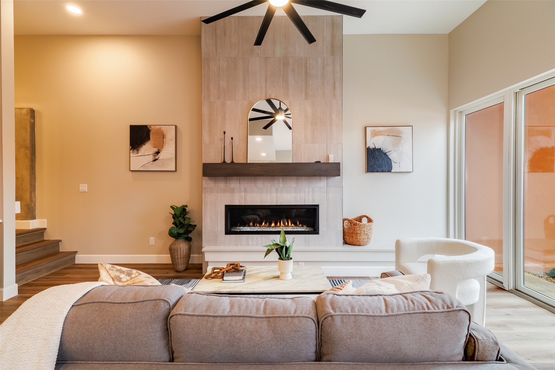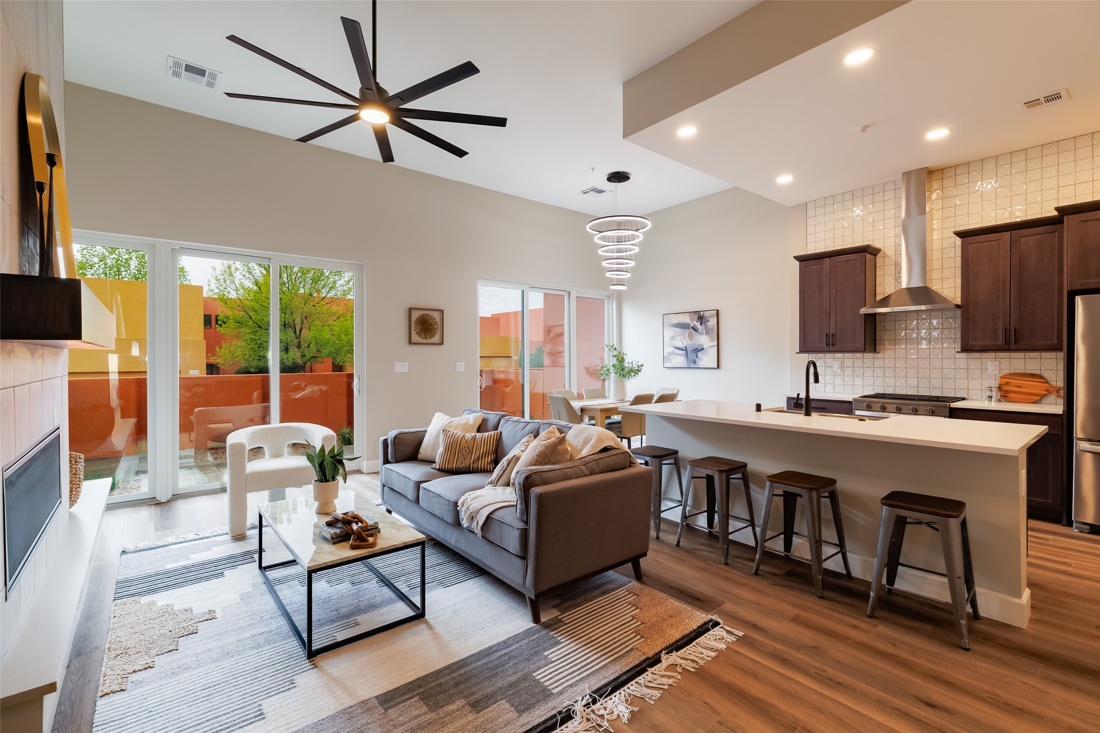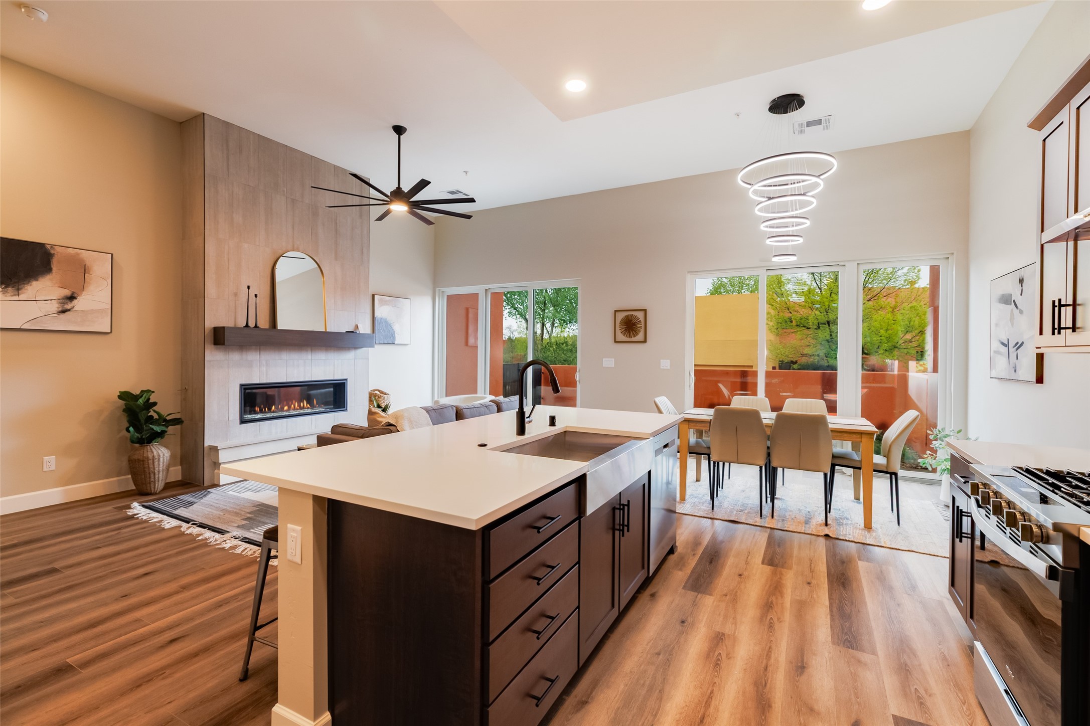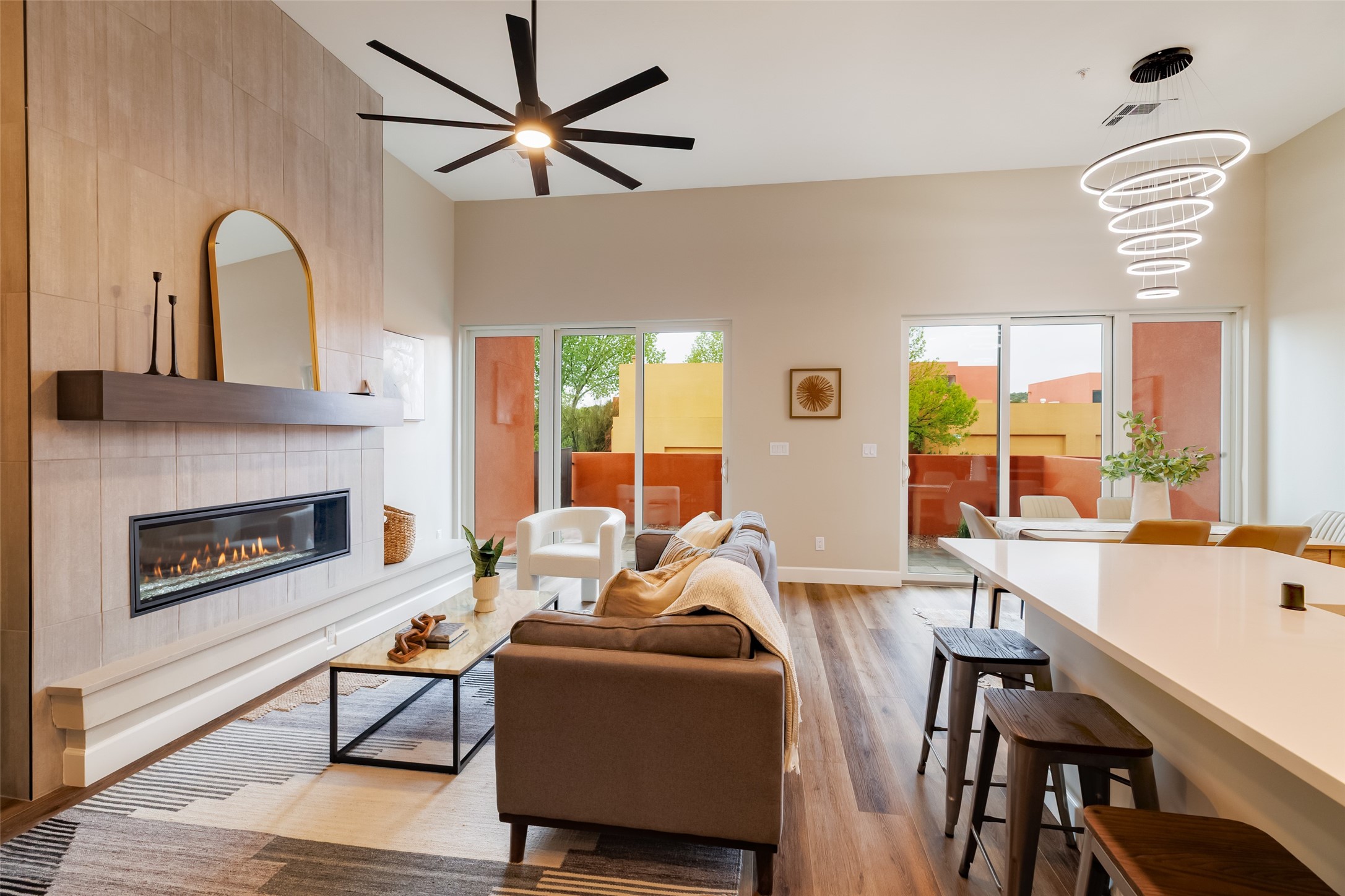 Welcome to Zocalo, Santa Fe -- This exceptional end unit is a gem within the community, combining luxury and practicality. Step into the spacious great room, featuring MODERN GRAY TONES and beautiful SPC luxury vinyl flooring. The space is enhanced by a sleek beverage bar and a contemporary fireplace, perfect for entertaining or relaxing evenings. The kitchen and bathrooms are adorned with white and grey quartz countertops, adding elegance and brightness. In the primary suite, enjoy a second fireplace, creating a luxurious retreat for restful nights. Outside, the upgraded landscaping complements the stunning Santa Fe climate, offering a peaceful setting for outdoor enjoyment.