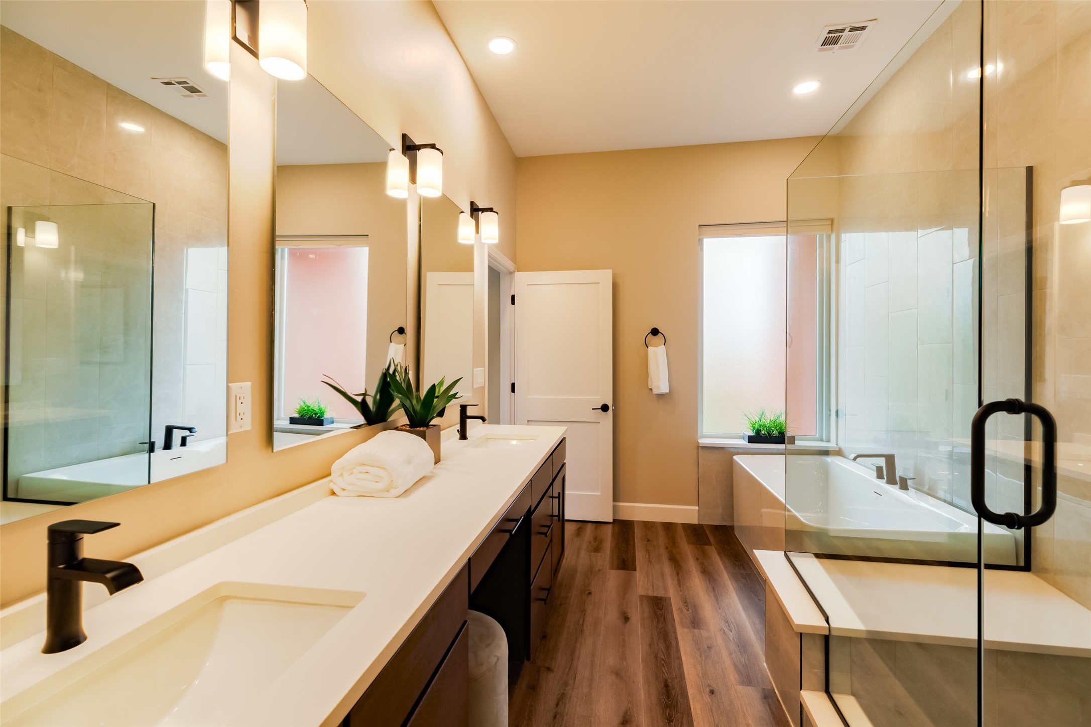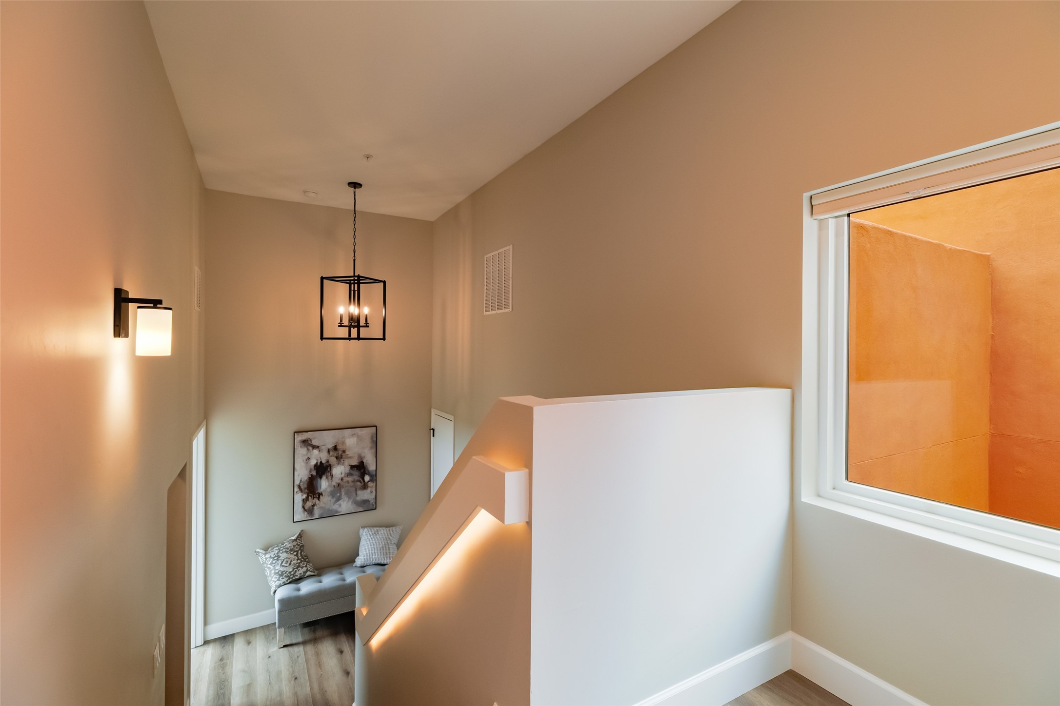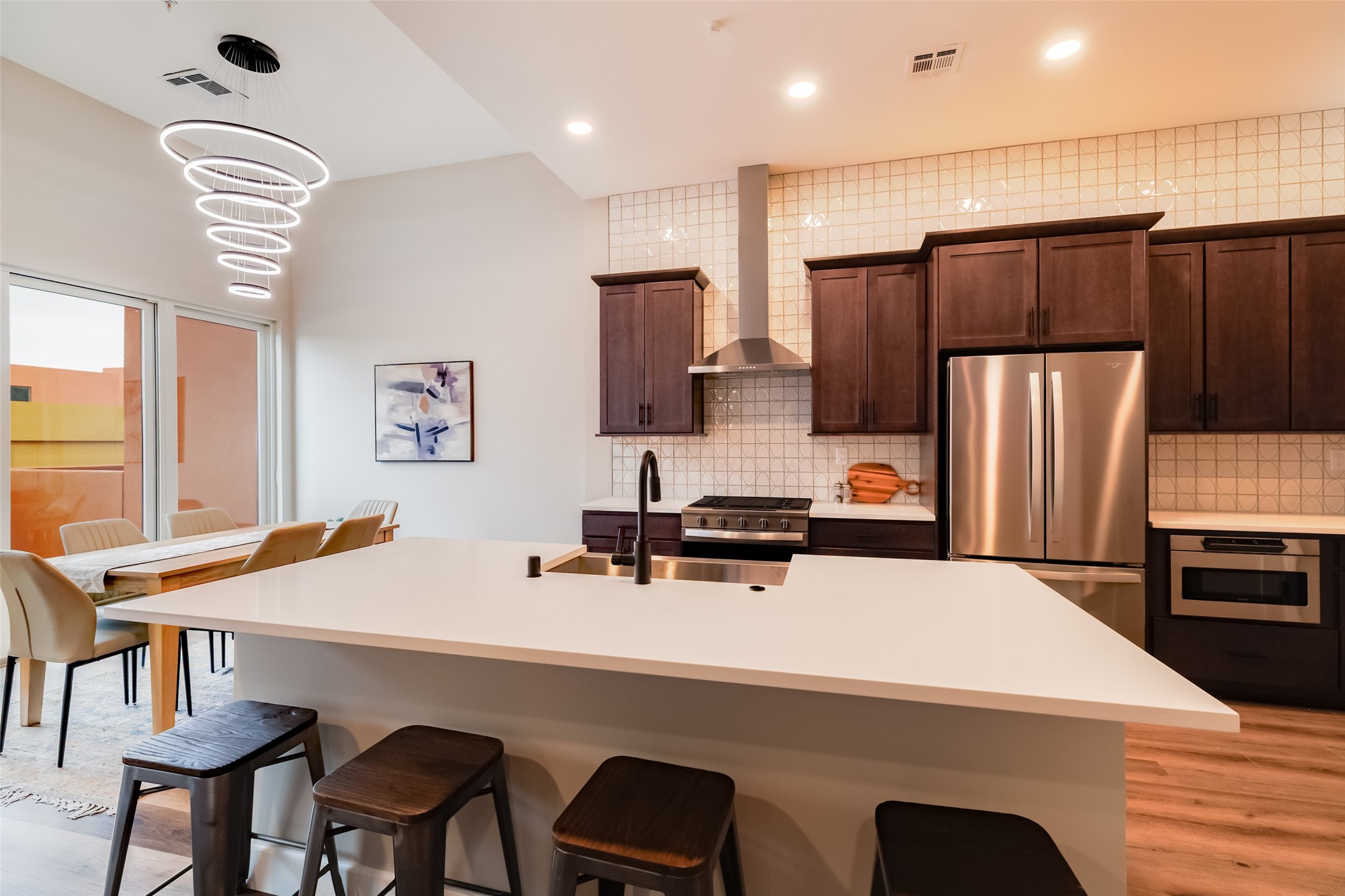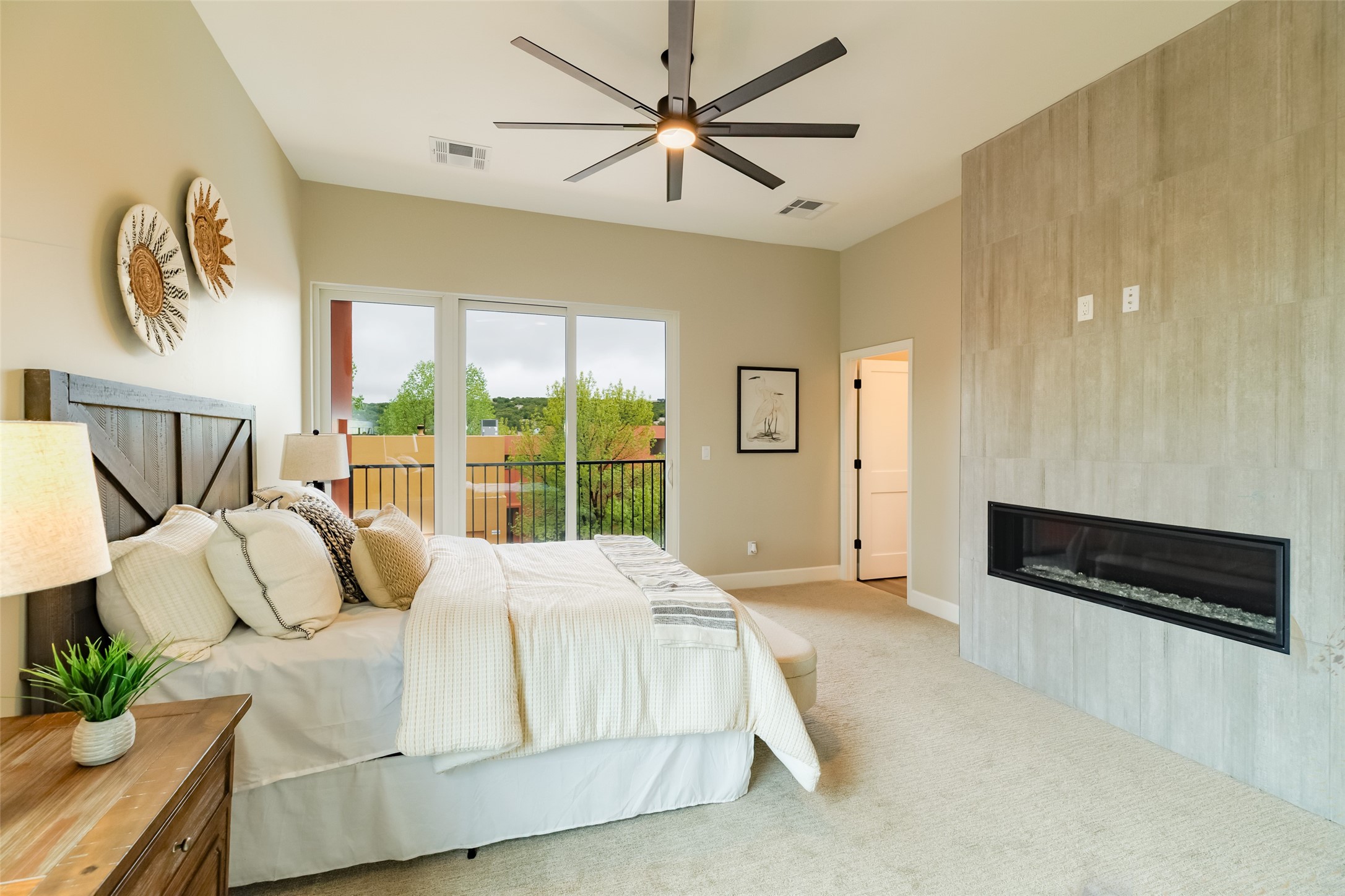 Welcome to Zocalo, Santa Fe -- This exceptional end unit is a gem within the community, combining luxury and practicality. Step into the spacious great room, featuring MODERN GRAY TONES and beautiful SPC luxury vinyl flooring. The space is enhanced by a sleek beverage bar and a contemporary fireplace, perfect for entertaining or relaxing evenings. The kitchen and bathrooms are adorned with white and grey quartz countertops, adding elegance and brightness. In the primary suite, enjoy a second fireplace, creating a luxurious retreat for restful nights. Outside, the upgraded landscaping complements the stunning Santa Fe climate, offering a peaceful setting for outdoor enjoyment.