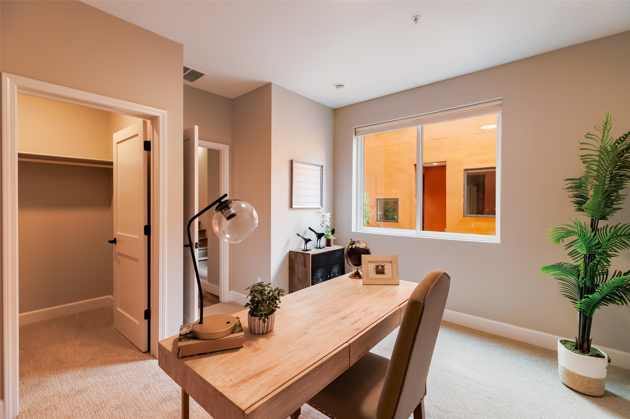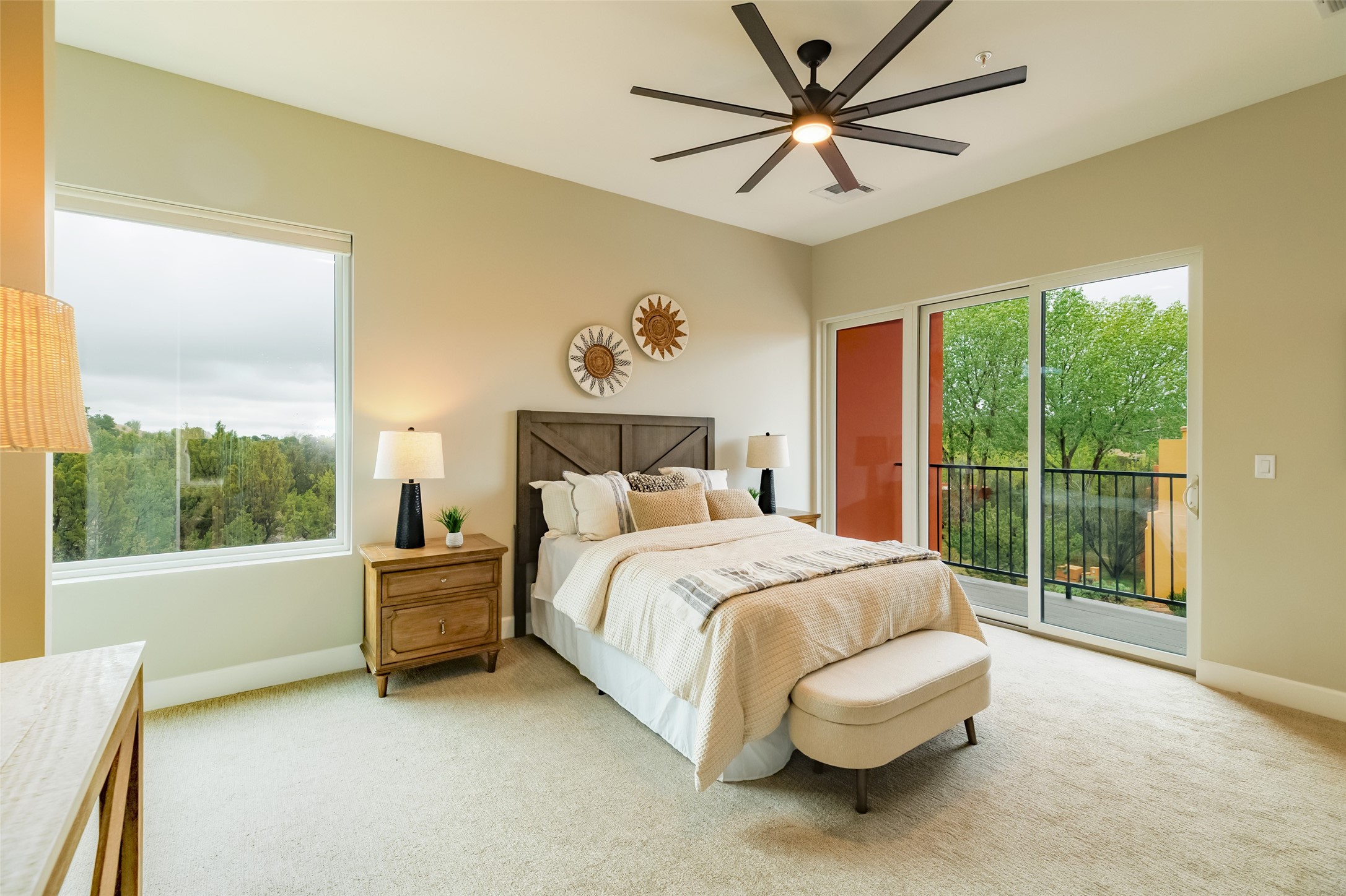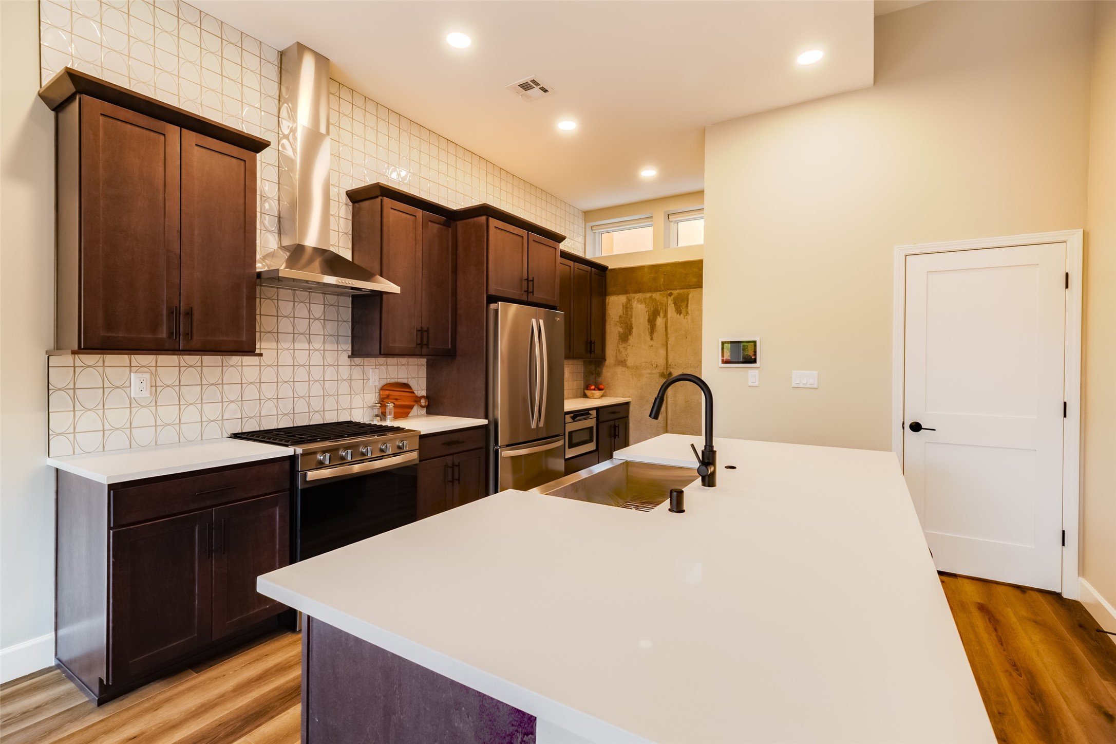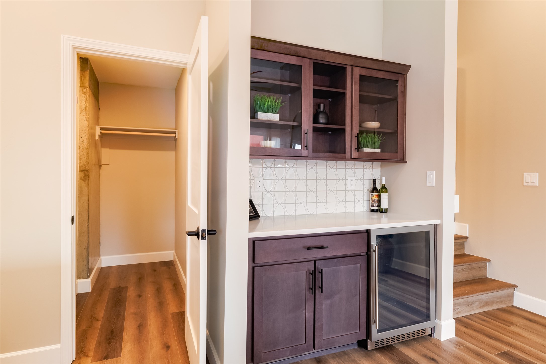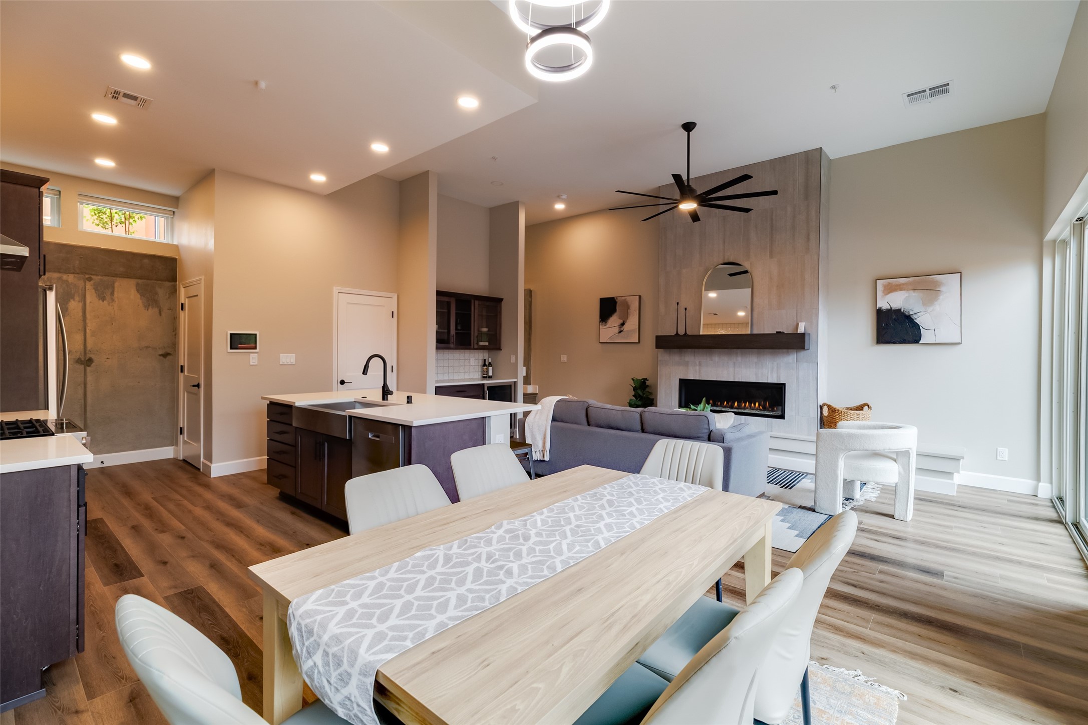 Welcome to Zocalo, Santa Fe -- This exceptional end unit is a gem within the community, combining luxury and practicality. Step into the spacious great room, featuring MODERN GRAY TONES and beautiful SPC luxury vinyl flooring. The space is enhanced by a sleek beverage bar and a contemporary fireplace, perfect for entertaining or relaxing evenings. The kitchen and bathrooms are adorned with white and grey quartz countertops, adding elegance and brightness. In the primary suite, enjoy a second fireplace, creating a luxurious retreat for restful nights. Outside, the upgraded landscaping complements the stunning Santa Fe climate, offering a peaceful setting for outdoor enjoyment.