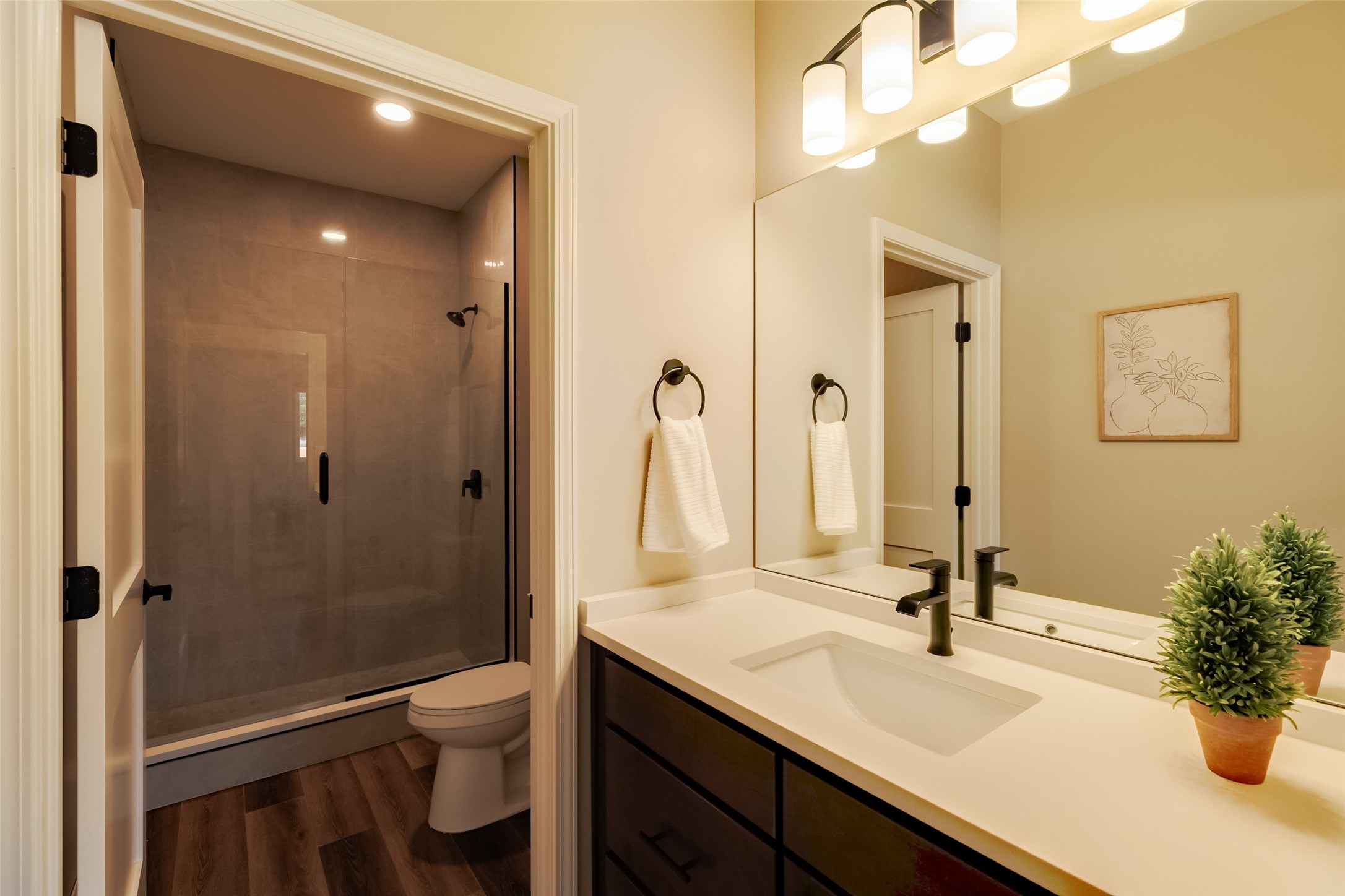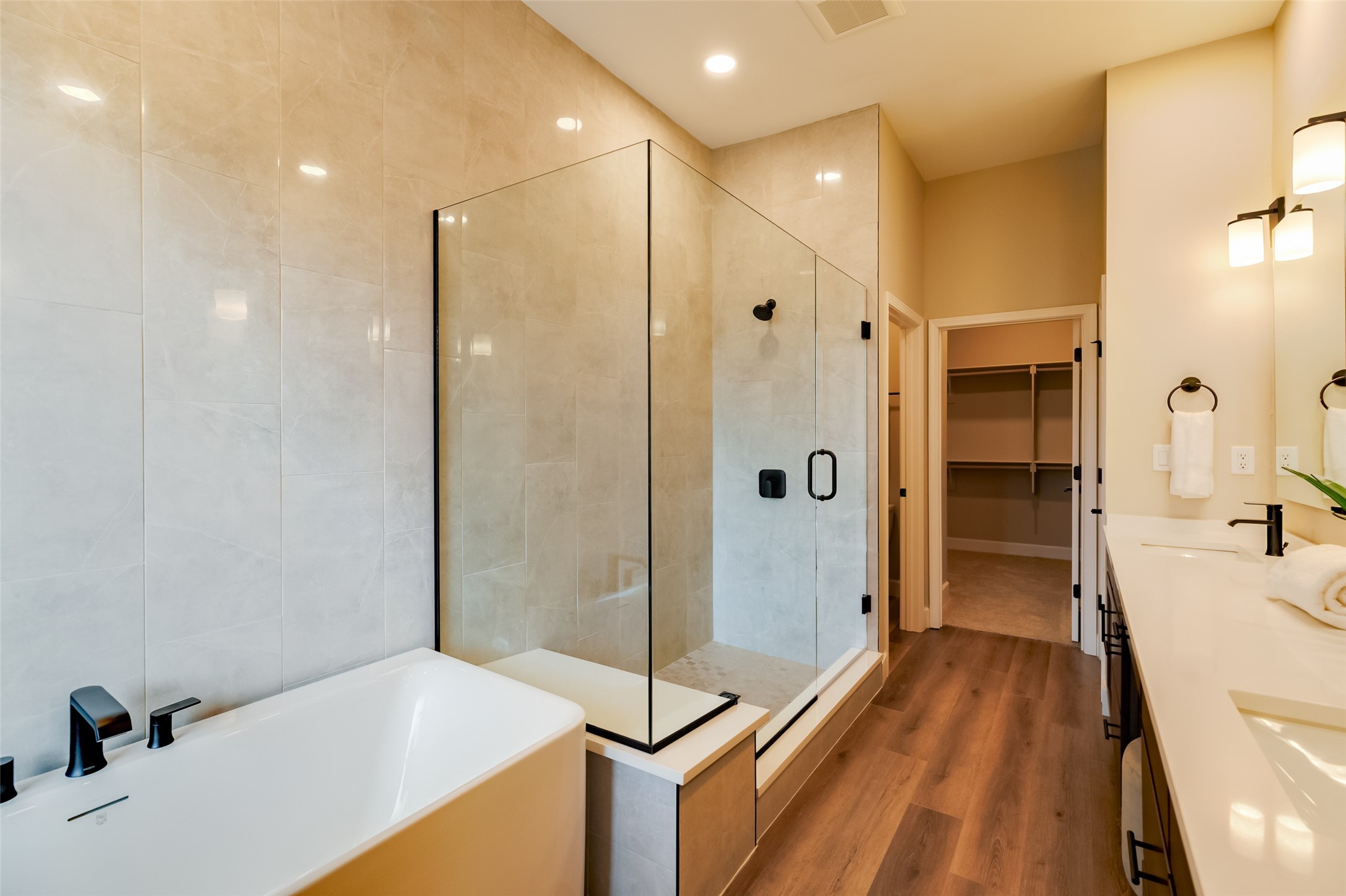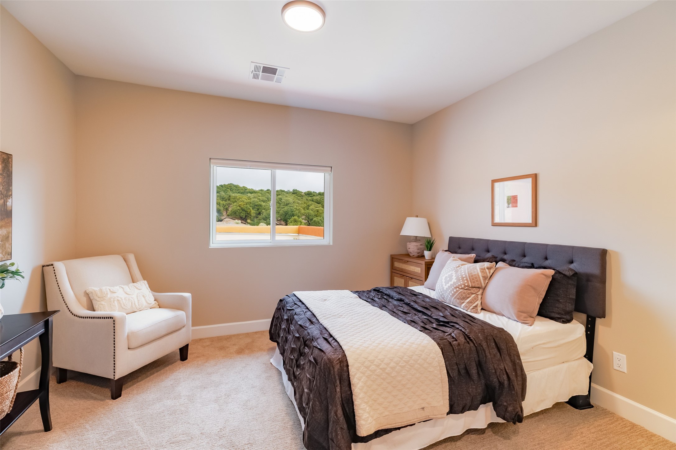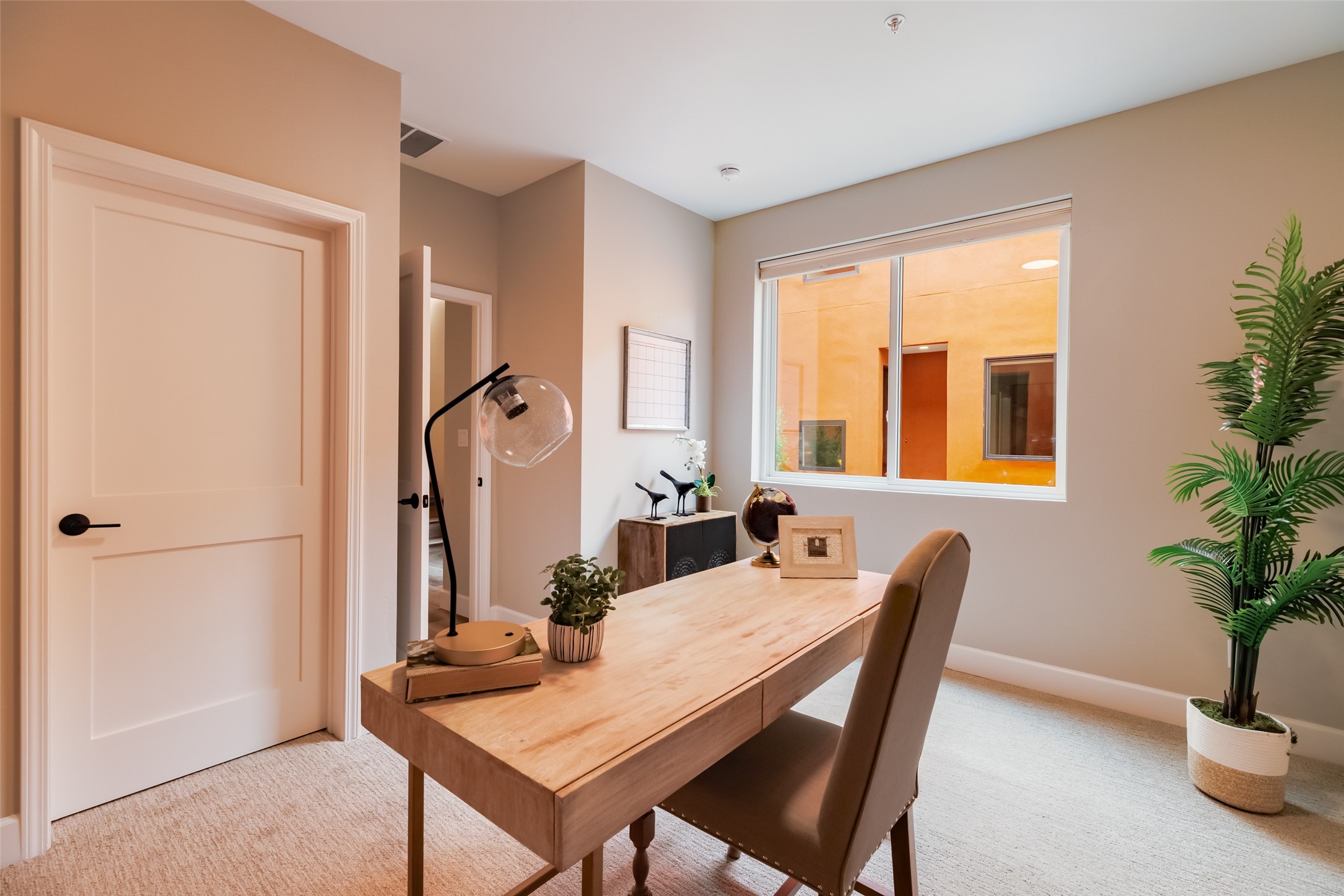 Welcome to Zocalo, Santa Fe -- This exceptional end unit is a gem within the community, combining luxury and practicality. Step into the spacious great room, featuring MODERN GRAY TONES and beautiful SPC luxury vinyl flooring. The space is enhanced by a sleek beverage bar and a contemporary fireplace, perfect for entertaining or relaxing evenings. The kitchen and bathrooms are adorned with white and grey quartz countertops, adding elegance and brightness. In the primary suite, enjoy a second fireplace, creating a luxurious retreat for restful nights. Outside, the upgraded landscaping complements the stunning Santa Fe climate, offering a peaceful setting for outdoor enjoyment.