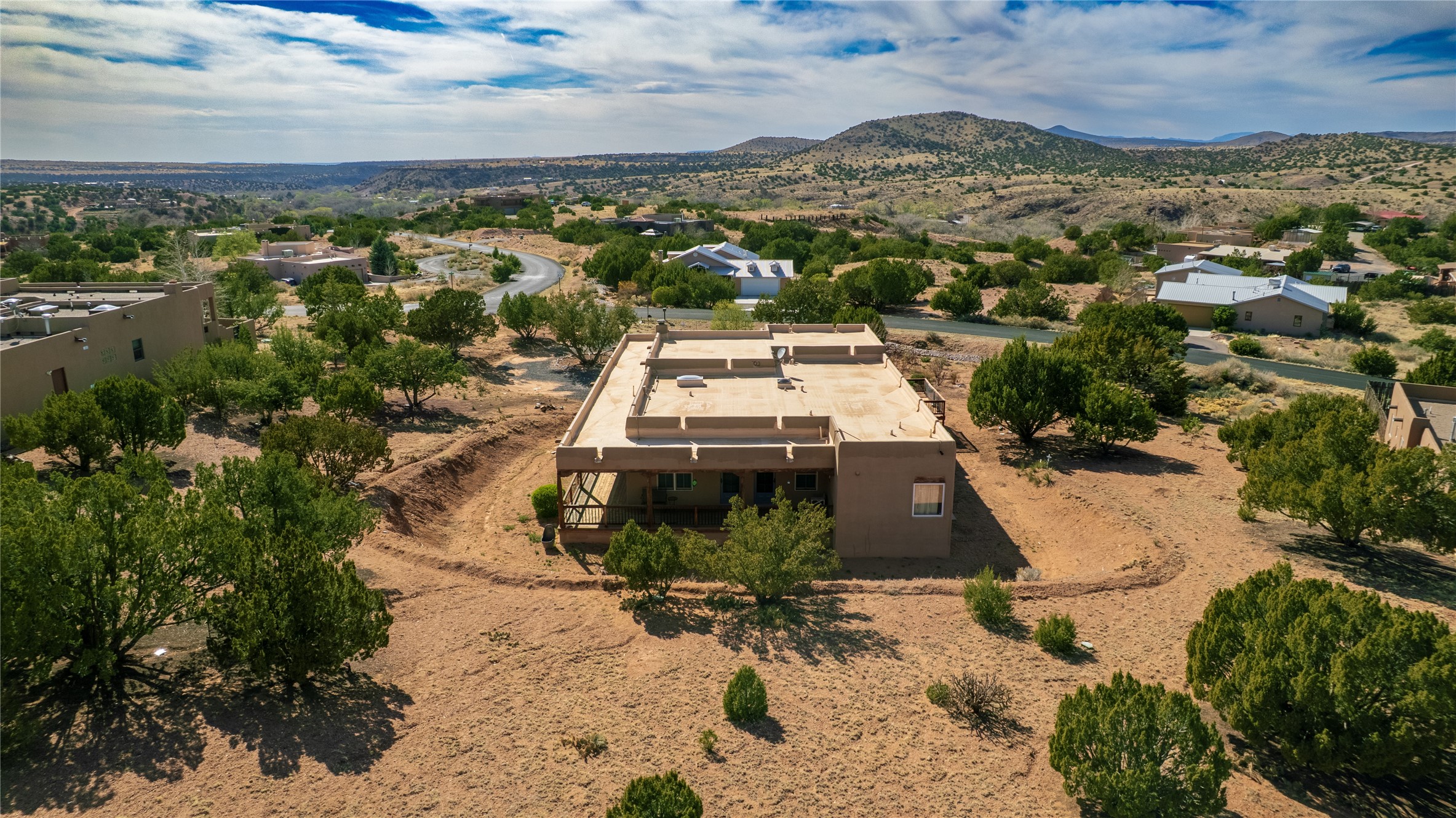Experience Southwestern charm, stunning landscapes, and unmatched tranquility nestled in the sought-after Las Lagunitas community. This thoughtfully designed 4-bedroom, 2.5-bath custom home sits on 1.26 acres of beautifully landscaped property, featuring vibrant roses, lilacs, butterfly bushes, and mature trees that bloom until the first frost. Step inside to an open-concept layout filled with warmth and character, from natural wood vigas throughout to custom barrel ceilings in the chef's kitchen which features rich custom cabinetry, double ovens, a pantry, and beautiful built-in nichos. The spacious master suite boasts a luxurious soaking tub with peaceful mountain views, a massive walk-in closet, and direct access to the expansive wrap around patio.Three additional bedrooms, including a versatile 4th bedroom/den provide flexibility and function with abundant storage including a generously sized garage with full shelving and a circular driveway for ample parking. Outdoors, choose between the open-air deck or the covered patio, offering panoramic views of mesas, mountains, hills, and those unforgettable Santa Fe sunsets painted in turquoise, pink, and gold. Nature lovers will adore the visits from hummingbirds, roadrunners, robins, and playful rabbits. Las Lagunitas offers quiet, secure living with gated entry, natural walking trails, a picturesque gazebo & pond, and a true sense of community. Homes are thoughtfully spaced for privacy while maintaining a welcoming neighborhood feel. Location Perks: Commuters will love the easy access to I-25 and the Frontage Road, making travel to Los Alamos National Laboratory, downtown Santa Fe, and Albuquerque fast and efficient--ideal for lab employees or anyone seeking peace without sacrificing proximity.