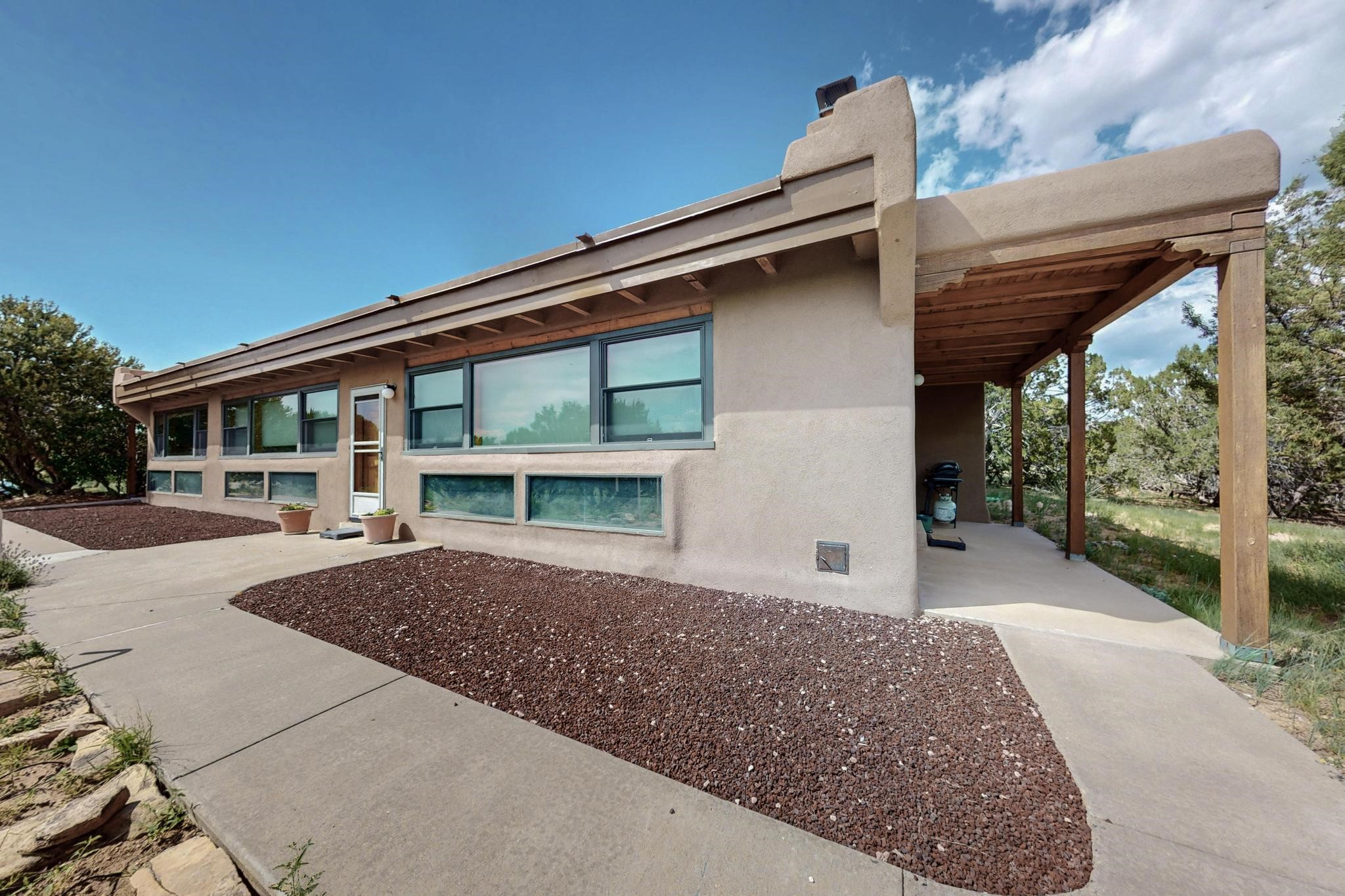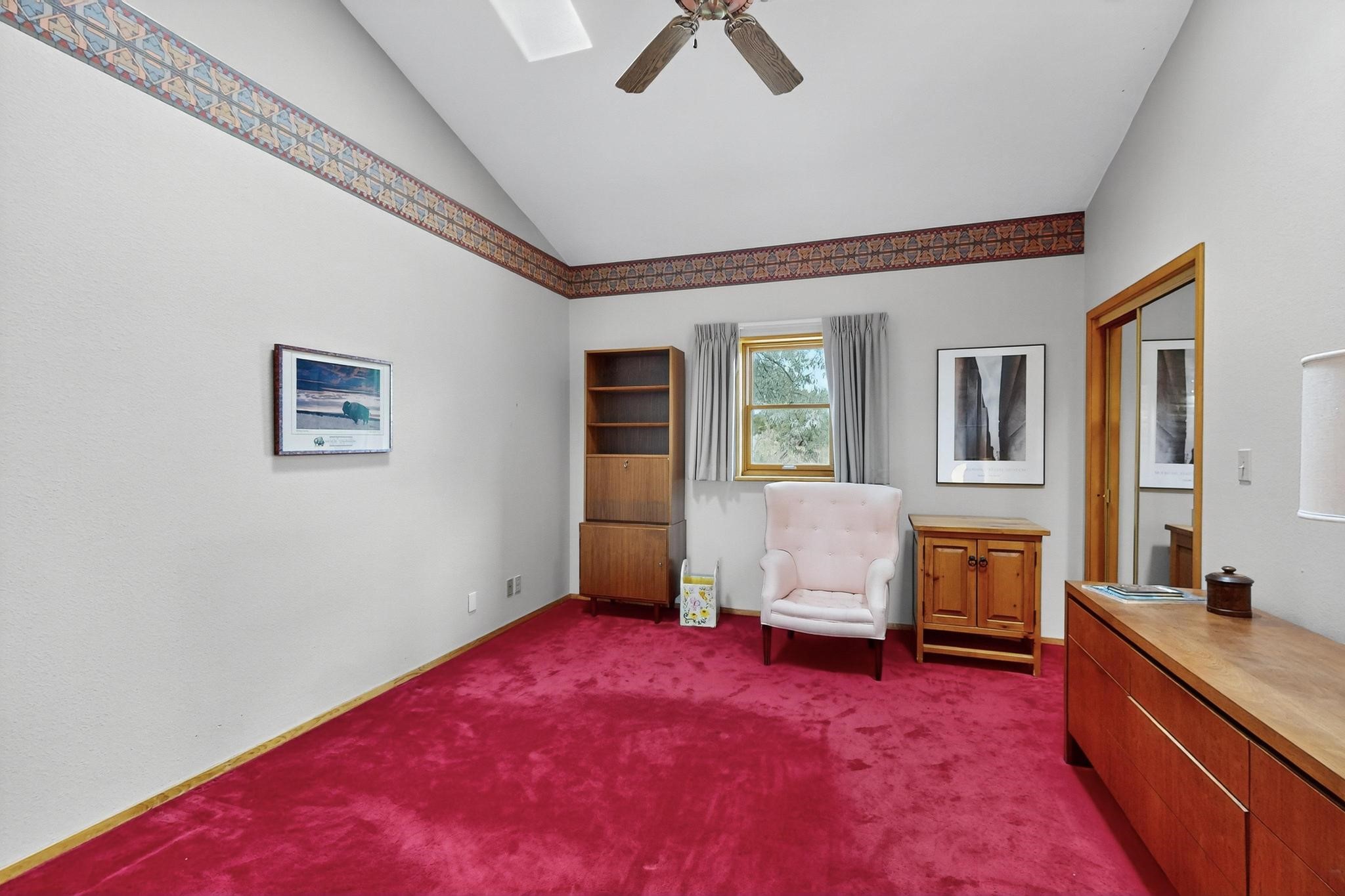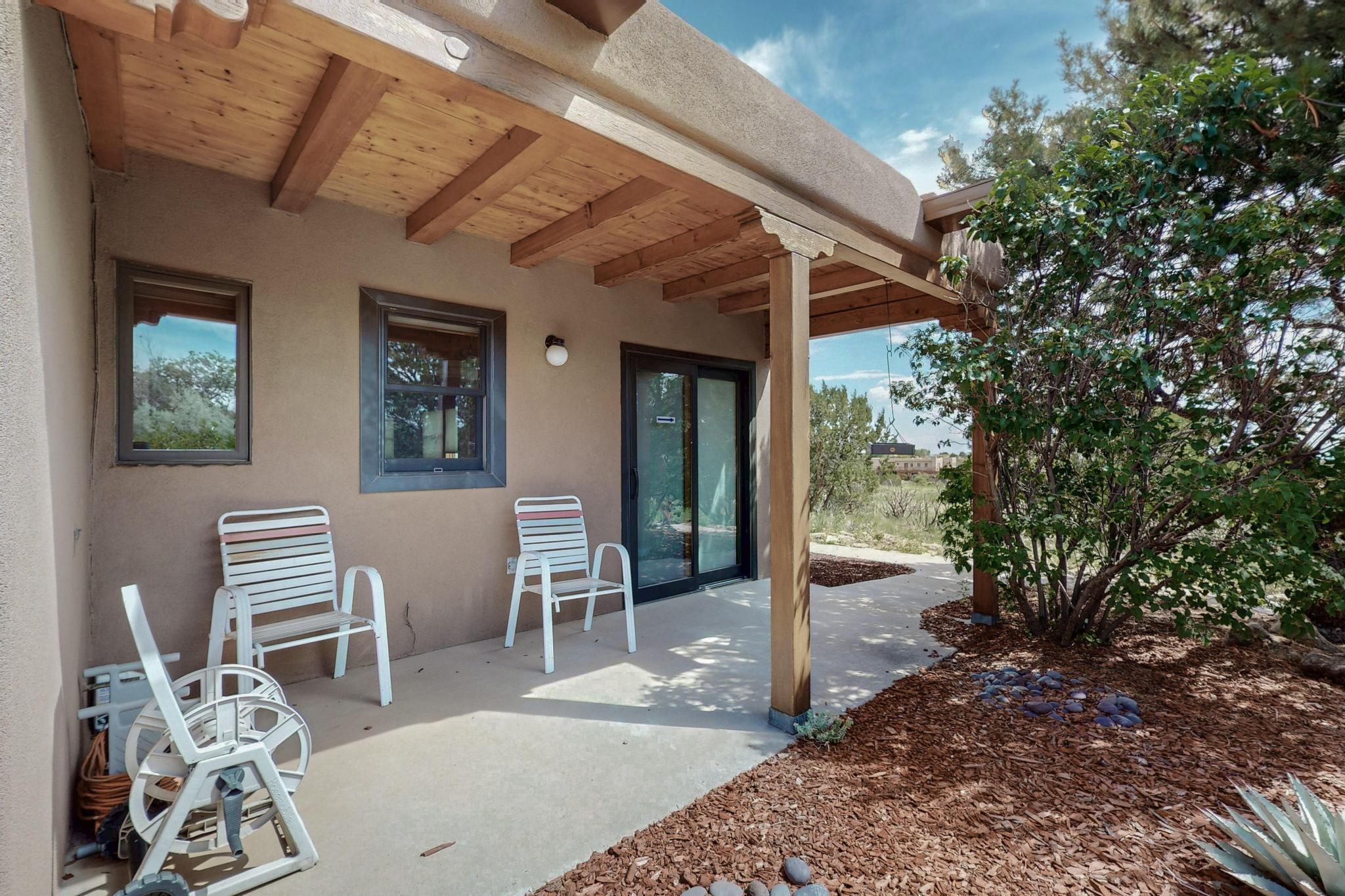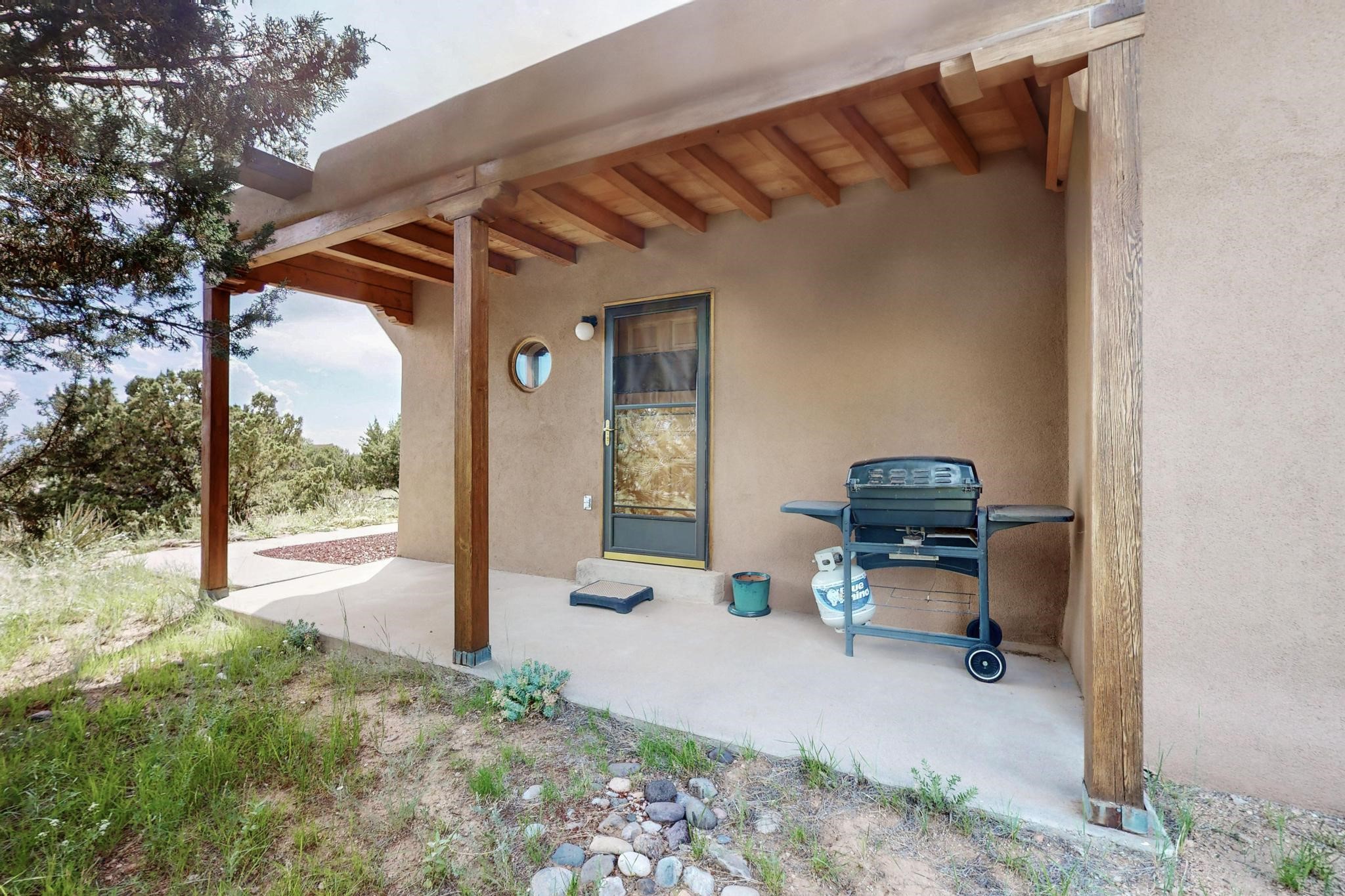 Priced to Sell! First time on the market, grand one owner home custom built by Sierra Homes bordering a large greenbelt, on a cul de sac close to the Eldorado community center and amenities. The passive solar open great room combines kitchen, dining and living room with Kiva fireplace and a mini split. Separate guest bedroom with bathroom off the living room, plus another guest bedroom and full bath, plus an office/library with walk in closet/storage room with extra access from the garage.. A spacious owners suite with large bathroom and mini split for comfortable living. There is an oversized 600sf finished 2 car garage with plenty of storage space and plenty of guest parking. All this close to Eldorado amenities, local shopping, schools, parks, trails, library and senior center, and only minutes into Santa Fe