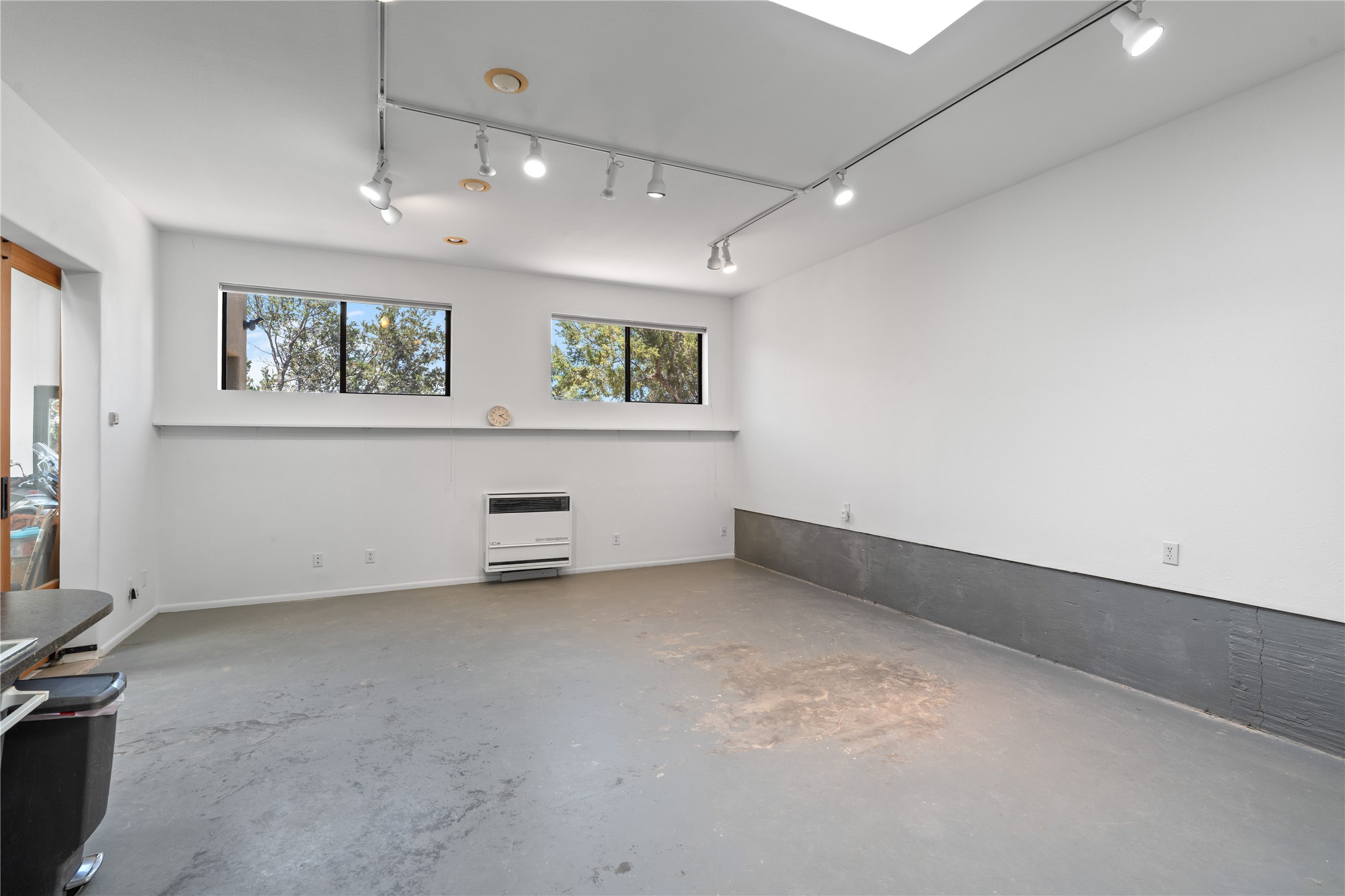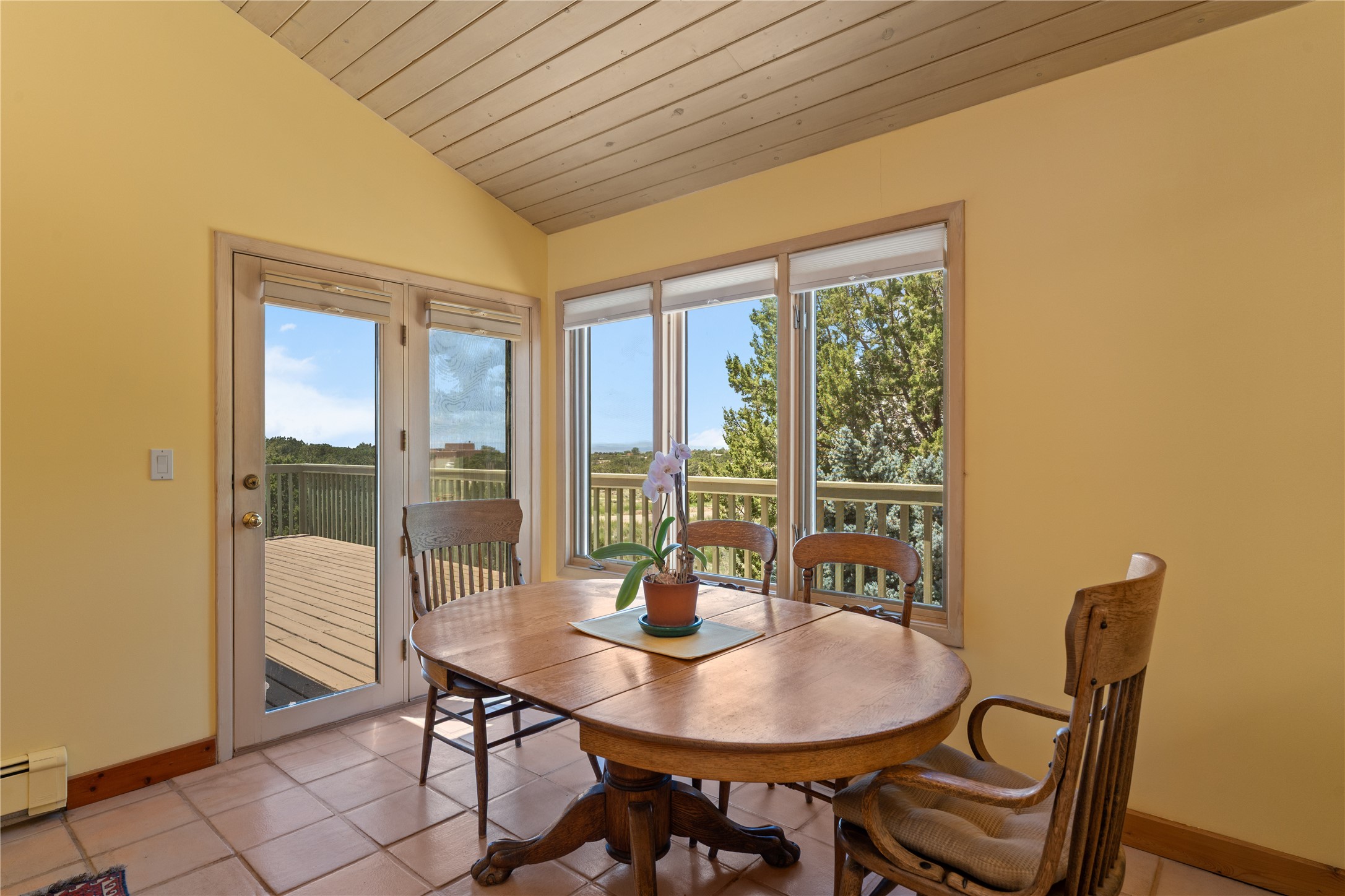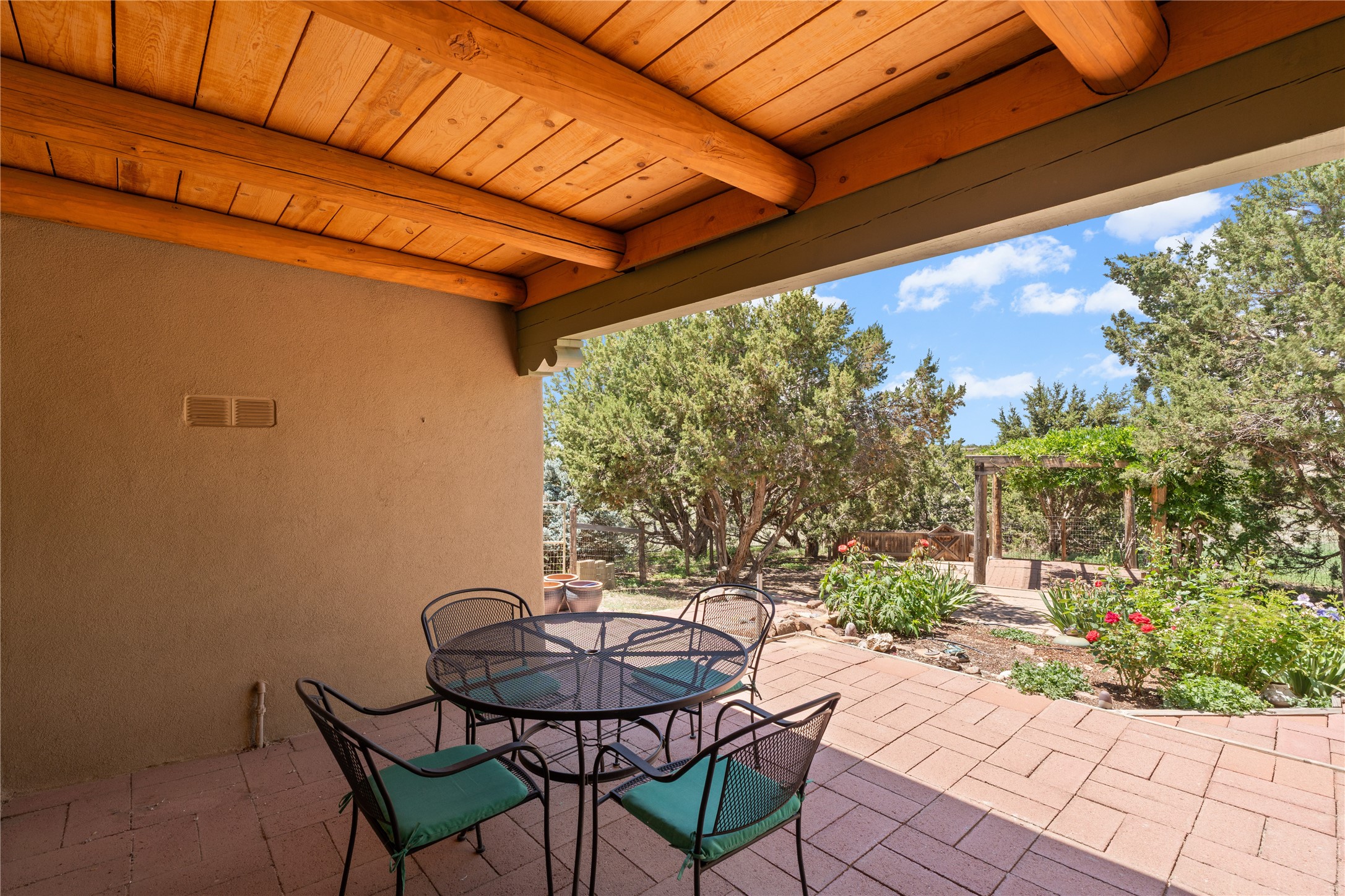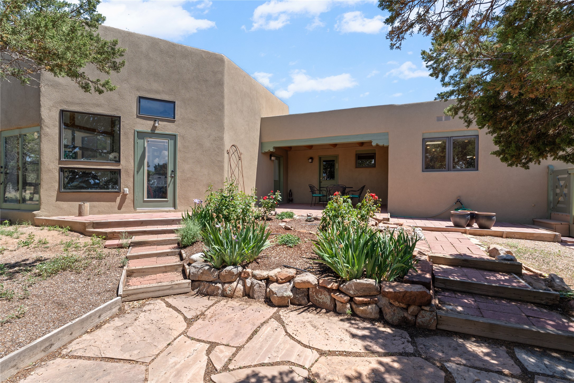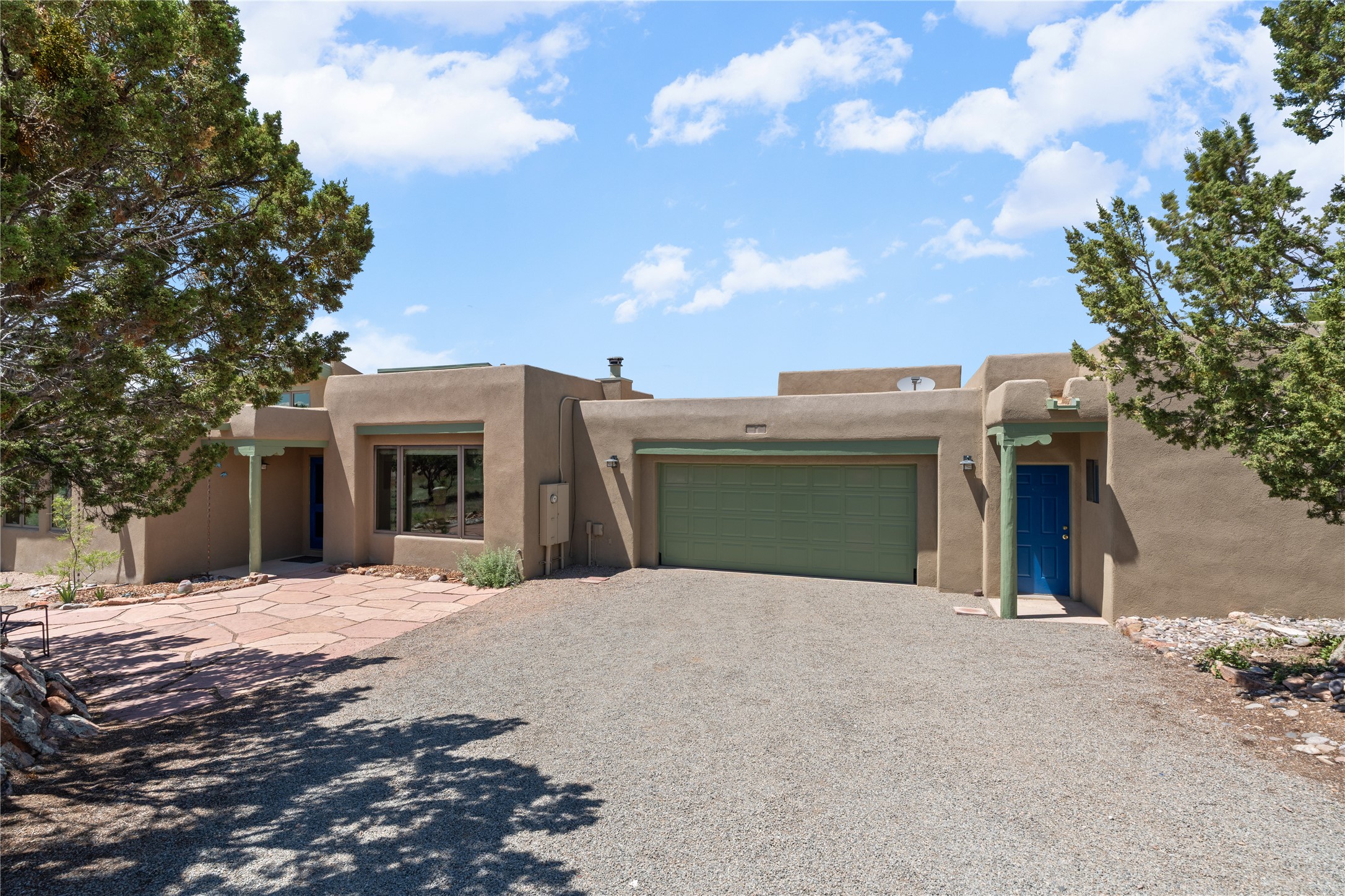 This charming 1,701 square foot, single-level Eldorado home with three bedrooms and two bathrooms blends southwestern character with privacy and artistic potential. A light and bright 1,095 sq. ft. professional artist studio, workshop provides ample space for artistic pursuits. The studio space boasts high ceilings, a bath, concrete floor, and clerestory windows. With its separate entrance and driveway, it could easily be converted into an additional living area. This beautiful home offers abundant natural light, clerestory windows, tile and newly refinished natural wood flooring, vigas, a cozy wood-burning fireplace and beautifully crafted wooden doors throughout. The primary bedroom, with ensuite bathroom, opens to an expansive deck with mountain views. The spacious kitchen has new stainless-steel appliances plus generous counter space and ample storage. The primary bedroom, dining room and kitchen all offer Jemez Mountain views. The art studio or workshop has a second driveway, is outfitted with high ceilings, two sinks, a half bathroom, refrigerator, 300 AMP power, insulated glass garage door and generous storage. The deck, studio and garage are freshly painted. Nestled on 1.61 acres bordering the greenbelt in the sought-after Eldorado community, amenities include the community center, tennis/pickleball courts, swimming pool, dog park and an expansive trail system for hiking, biking and horseback riding. Updates include newly refinished wood flooring (2025), fresh paint and a full exterior stucco refresh (2022), refurbished double-paned insulated windows (2016), new water heater (2017), new metal roof, skylights and gutters (2021), roof maintenance (2021), new flagstone patio in front entrance (2022) and new double cellular insulated shades (2025). Approved ILR with lot corners flagged (July 2025) and septic serviced and inspection completed (July 2025).