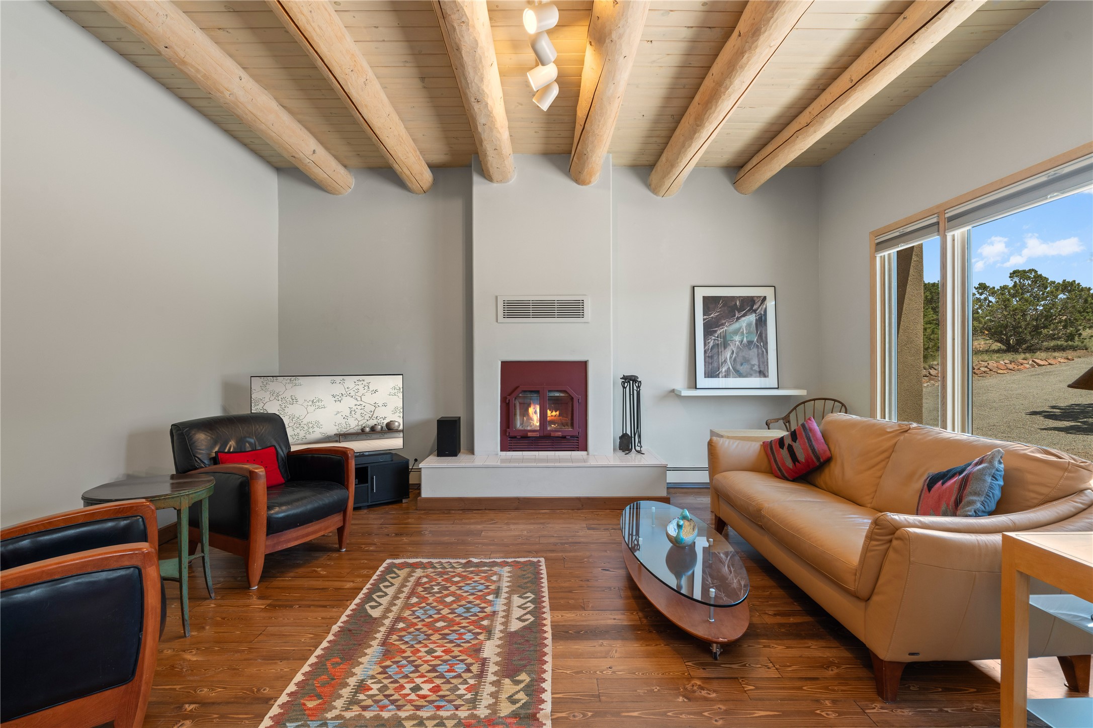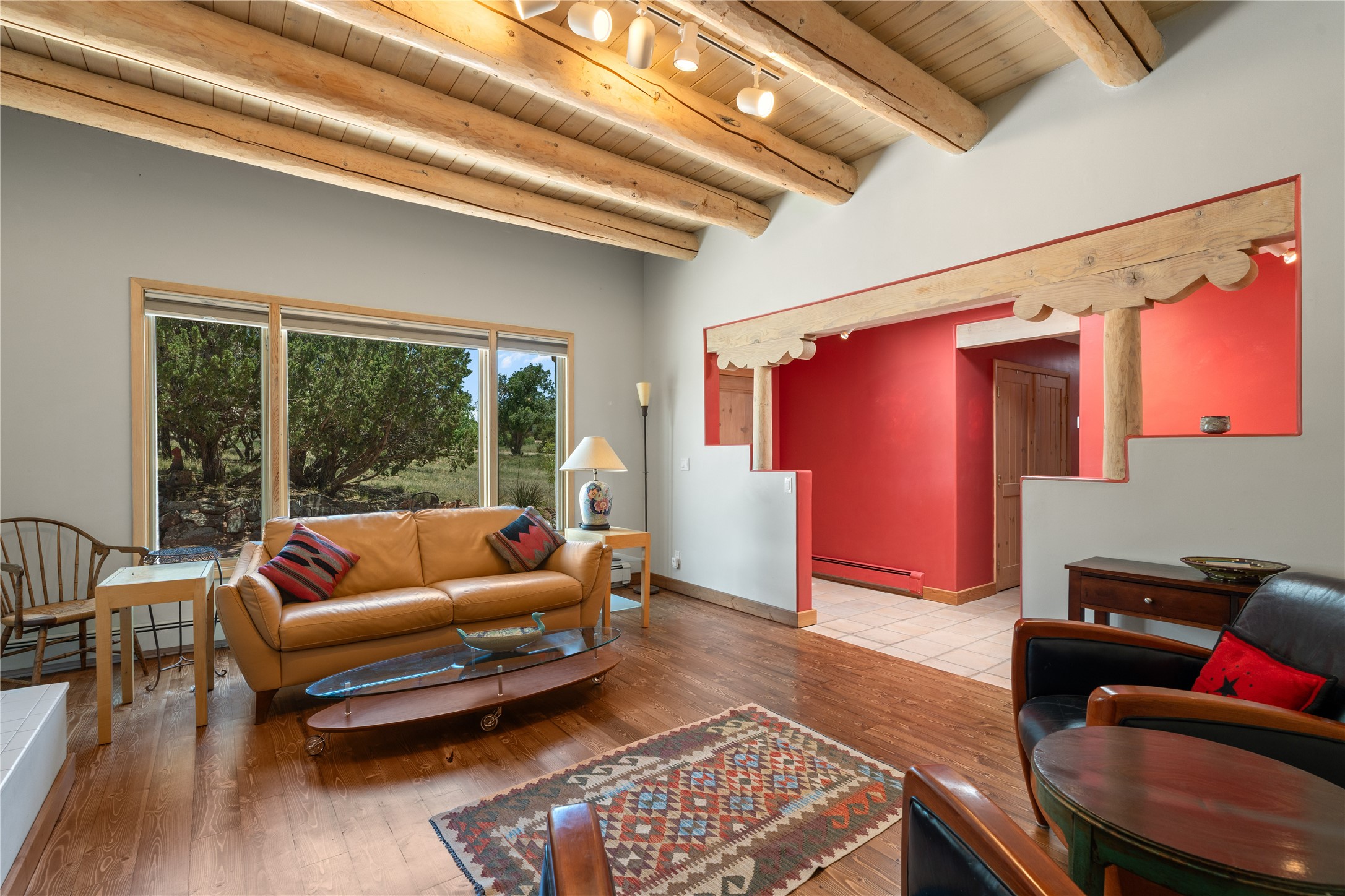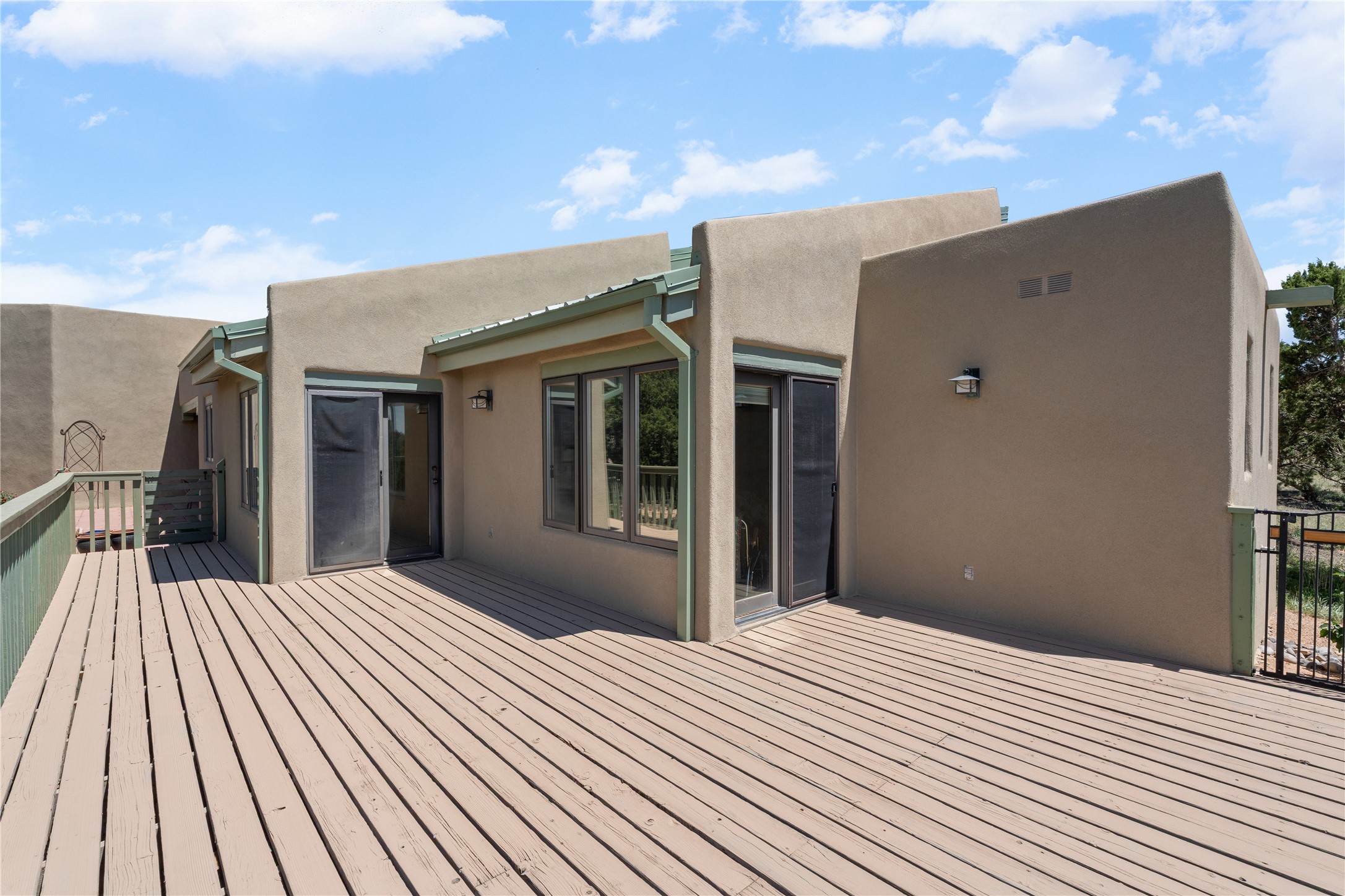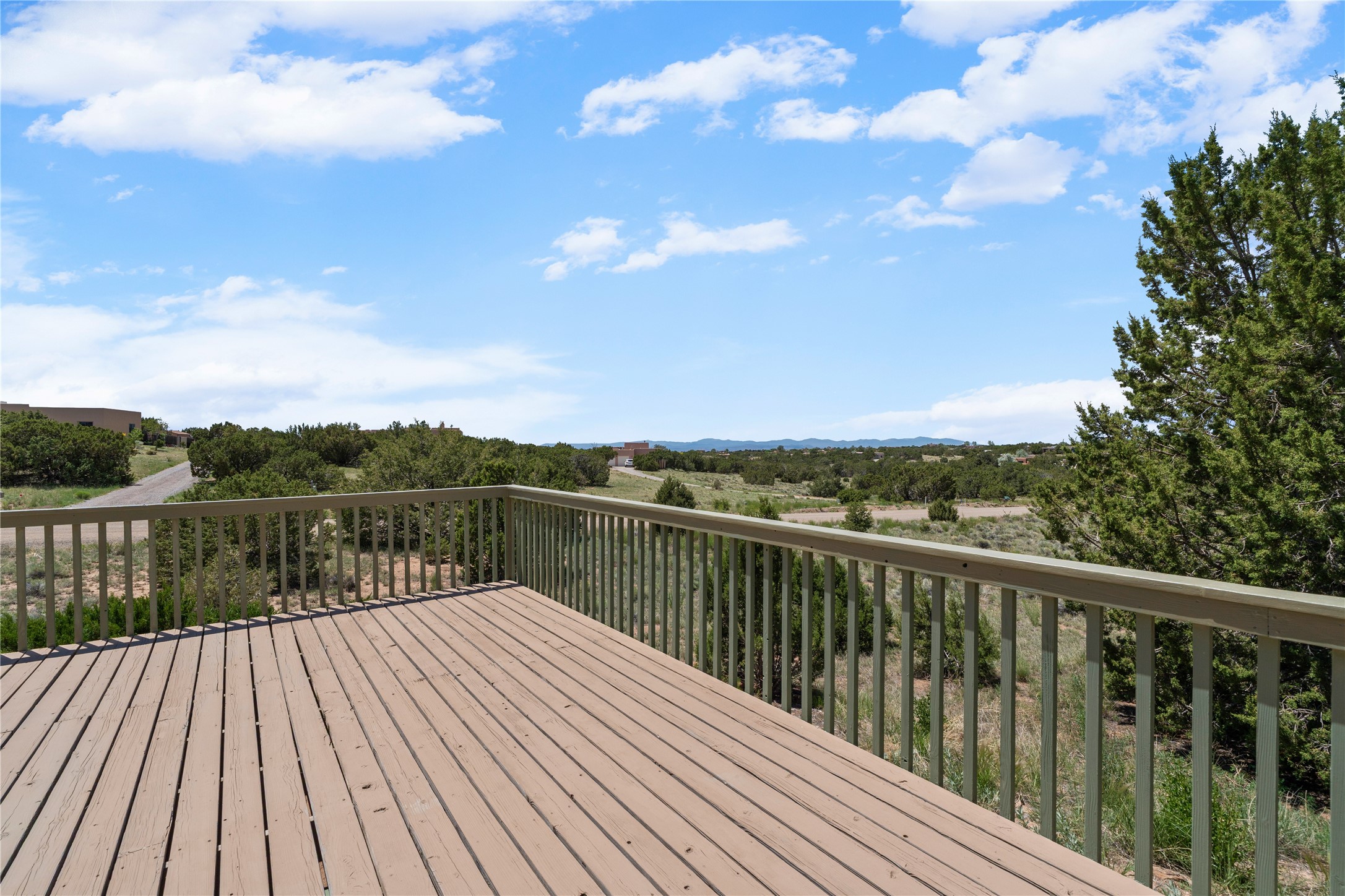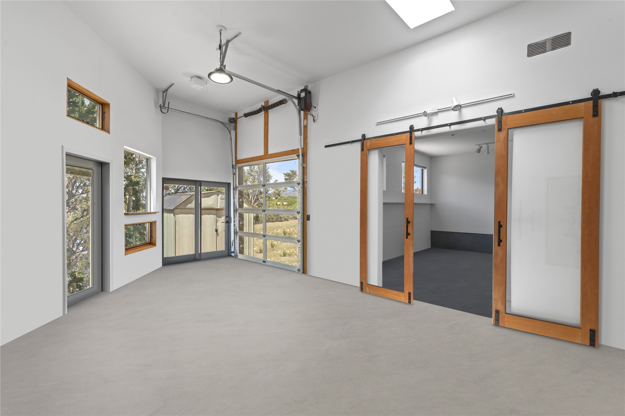 This charming 1,701 square foot, single-level Eldorado home with three bedrooms and two bathrooms blends southwestern character with privacy and artistic potential. A light and bright 1,095 sq. ft. professional artist studio, workshop provides ample space for artistic pursuits. The studio space boasts high ceilings, a bath, concrete floor, and clerestory windows. With its separate entrance and driveway, it could easily be converted into an additional living area. This beautiful home offers abundant natural light, clerestory windows, tile and newly refinished natural wood flooring, vigas, a cozy wood-burning fireplace and beautifully crafted wooden doors throughout. The primary bedroom, with ensuite bathroom, opens to an expansive deck with mountain views. The spacious kitchen has new stainless-steel appliances plus generous counter space and ample storage. The primary bedroom, dining room and kitchen all offer Jemez Mountain views. The art studio or workshop has a second driveway, is outfitted with high ceilings, two sinks, a half bathroom, refrigerator, 300 AMP power, insulated glass garage door and generous storage. The deck, studio and garage are freshly painted. Nestled on 1.61 acres bordering the greenbelt in the sought-after Eldorado community, amenities include the community center, tennis/pickleball courts, swimming pool, dog park and an expansive trail system for hiking, biking and horseback riding. Updates include newly refinished wood flooring (2025), fresh paint and a full exterior stucco refresh (2022), refurbished double-paned insulated windows (2016), new water heater (2017), new metal roof, skylights and gutters (2021), roof maintenance (2021), new flagstone patio in front entrance (2022) and new double cellular insulated shades (2025). Approved ILR with lot corners flagged (July 2025) and septic serviced and inspection completed (July 2025).