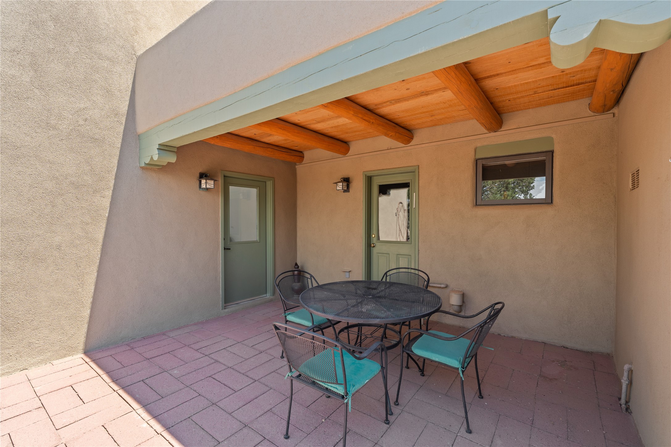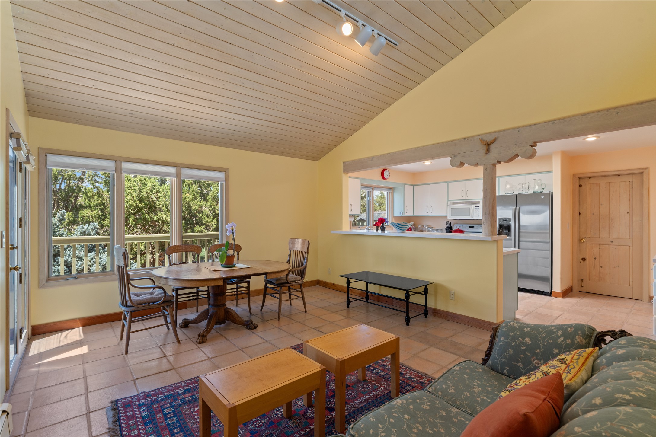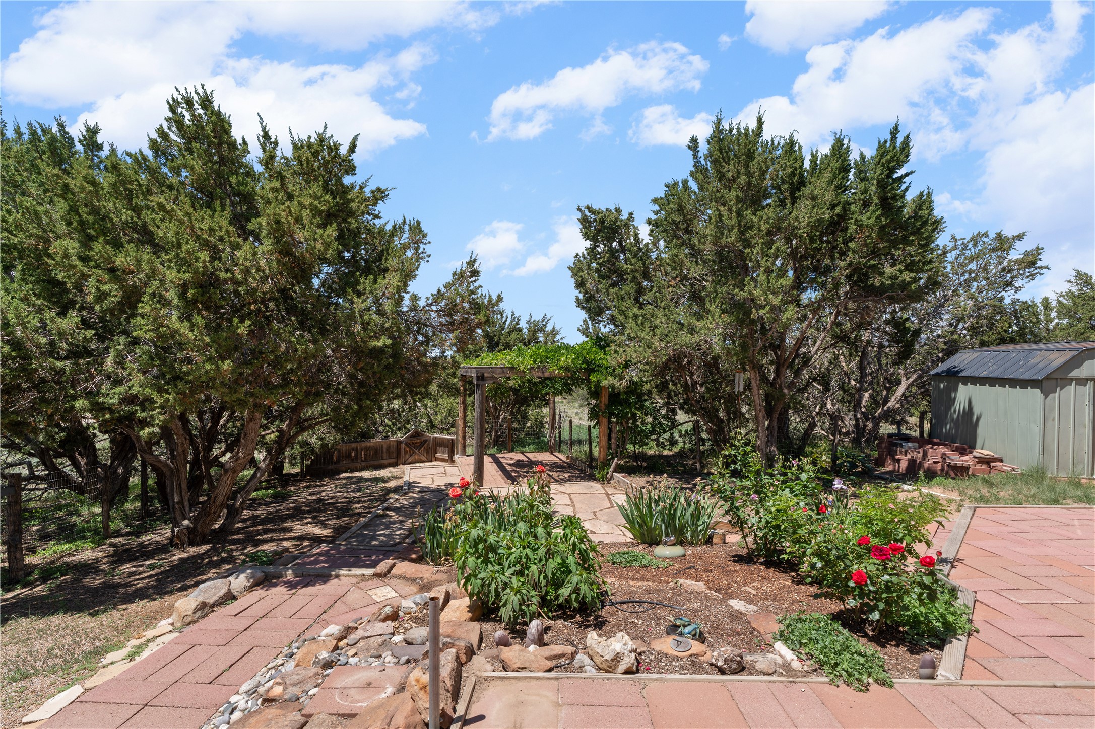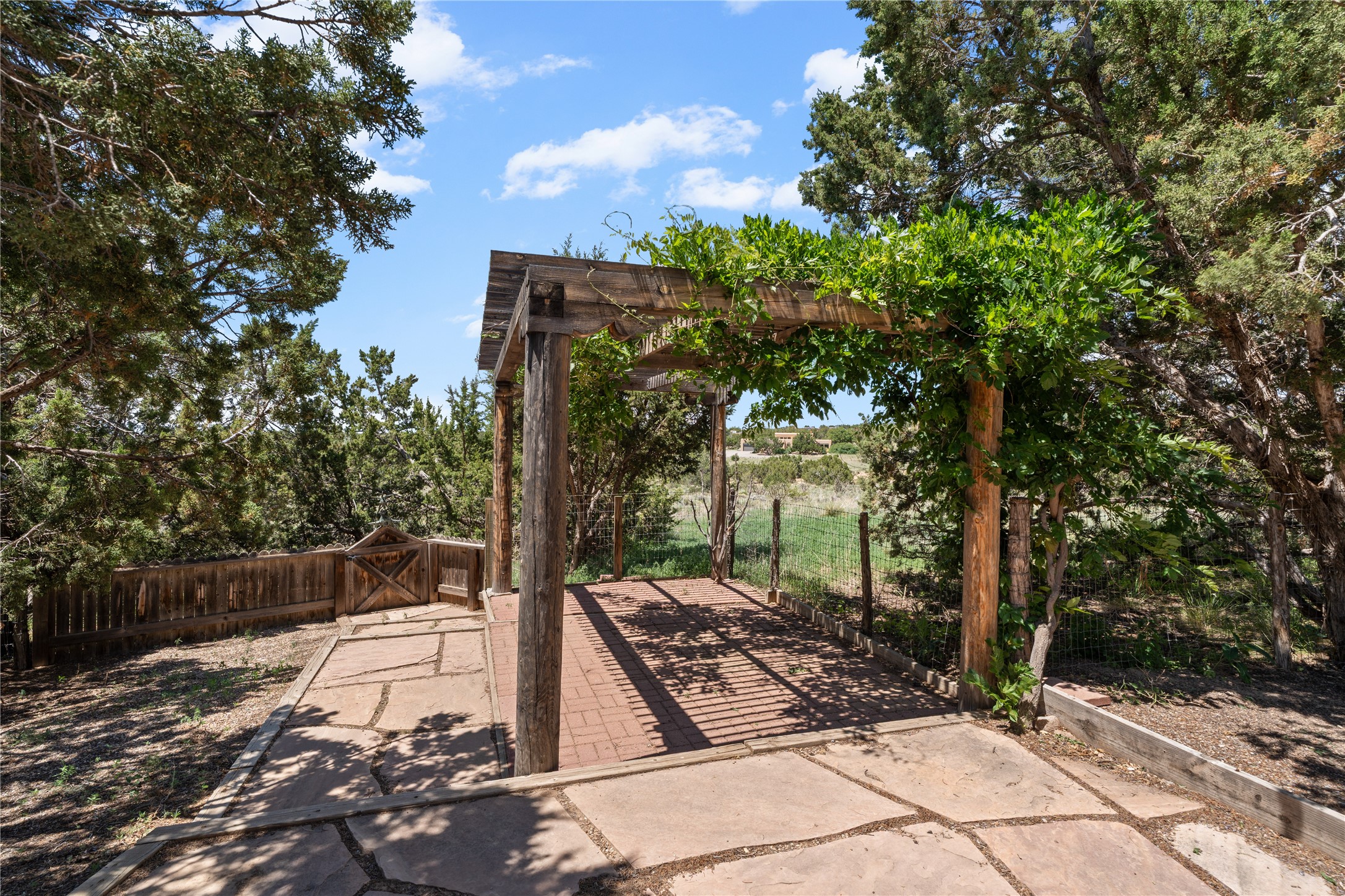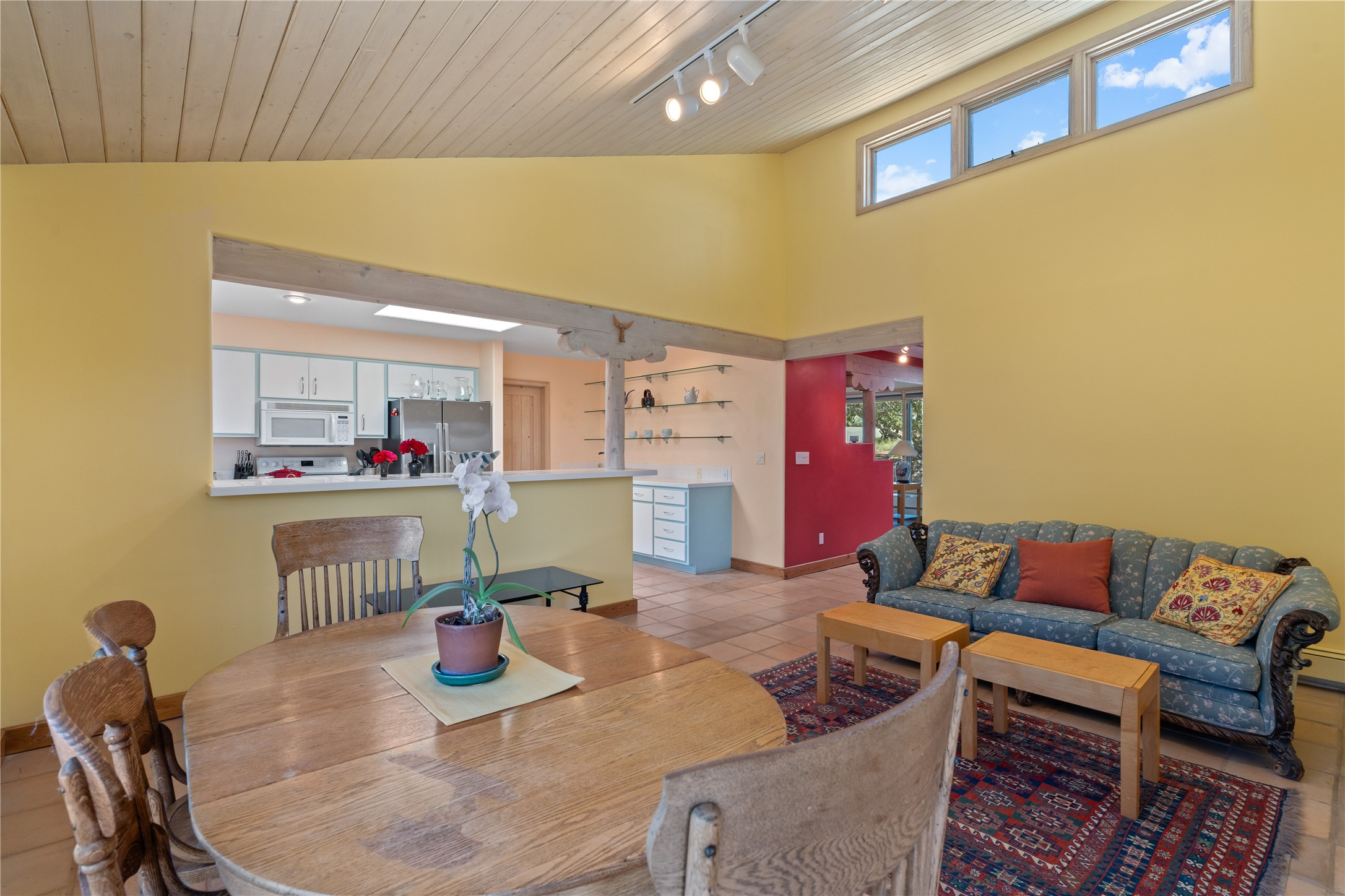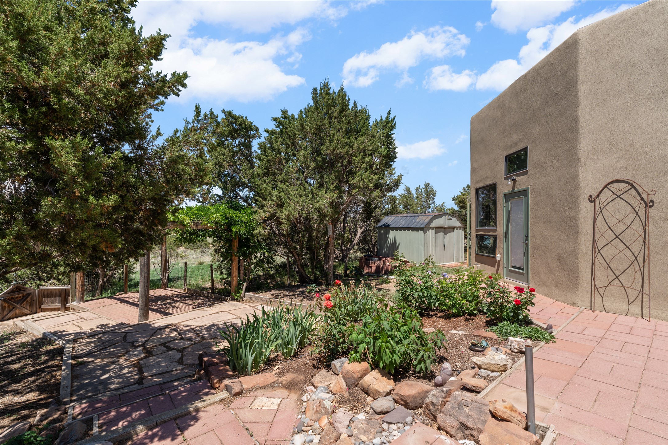 This charming 1,701 square foot, single-level Eldorado home with three bedrooms and two bathrooms blends southwestern character with privacy and artistic potential. A light and bright 1,095 sq. ft. professional artist studio, workshop provides ample space for artistic pursuits. The studio space boasts high ceilings, a bath, concrete floor, and clerestory windows. With its separate entrance and driveway, it could easily be converted into an additional living area. This beautiful home offers abundant natural light, clerestory windows, tile and newly refinished natural wood flooring, vigas, a cozy wood-burning fireplace and beautifully crafted wooden doors throughout. The primary bedroom, with ensuite bathroom, opens to an expansive deck with mountain views. The spacious kitchen has new stainless-steel appliances plus generous counter space and ample storage. The primary bedroom, dining room and kitchen all offer Jemez Mountain views. The art studio or workshop has a second driveway, is outfitted with high ceilings, two sinks, a half bathroom, refrigerator, 300 AMP power, insulated glass garage door and generous storage. The deck, studio and garage are freshly painted. Nestled on 1.61 acres bordering the greenbelt in the sought-after Eldorado community, amenities include the community center, tennis/pickleball courts, swimming pool, dog park and an expansive trail system for hiking, biking and horseback riding. Updates include newly refinished wood flooring (2025), fresh paint and a full exterior stucco refresh (2022), refurbished double-paned insulated windows (2016), new water heater (2017), new metal roof, skylights and gutters (2021), roof maintenance (2021), new flagstone patio in front entrance (2022) and new double cellular insulated shades (2025). Approved ILR with lot corners flagged (July 2025) and septic serviced and inspection completed (July 2025).