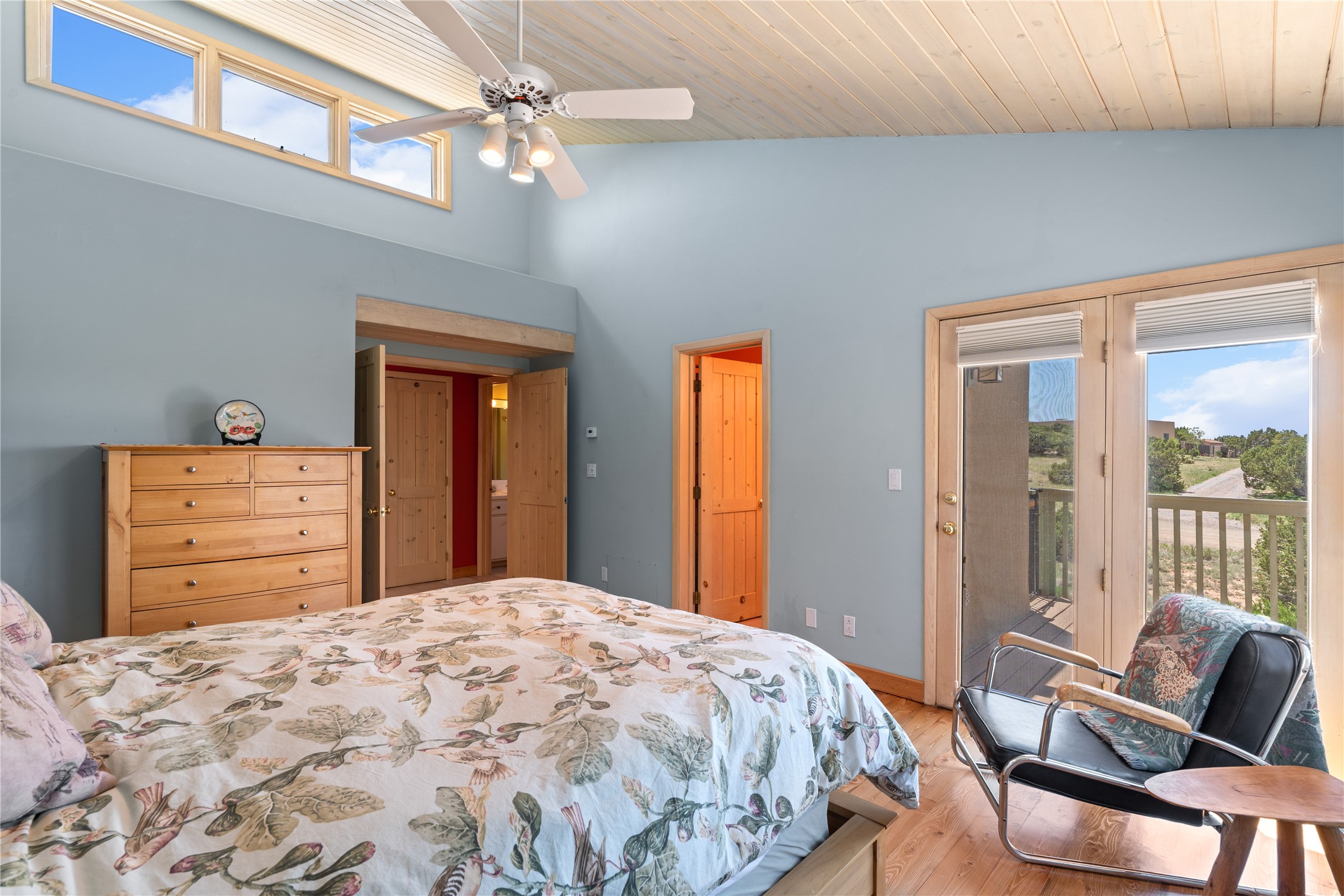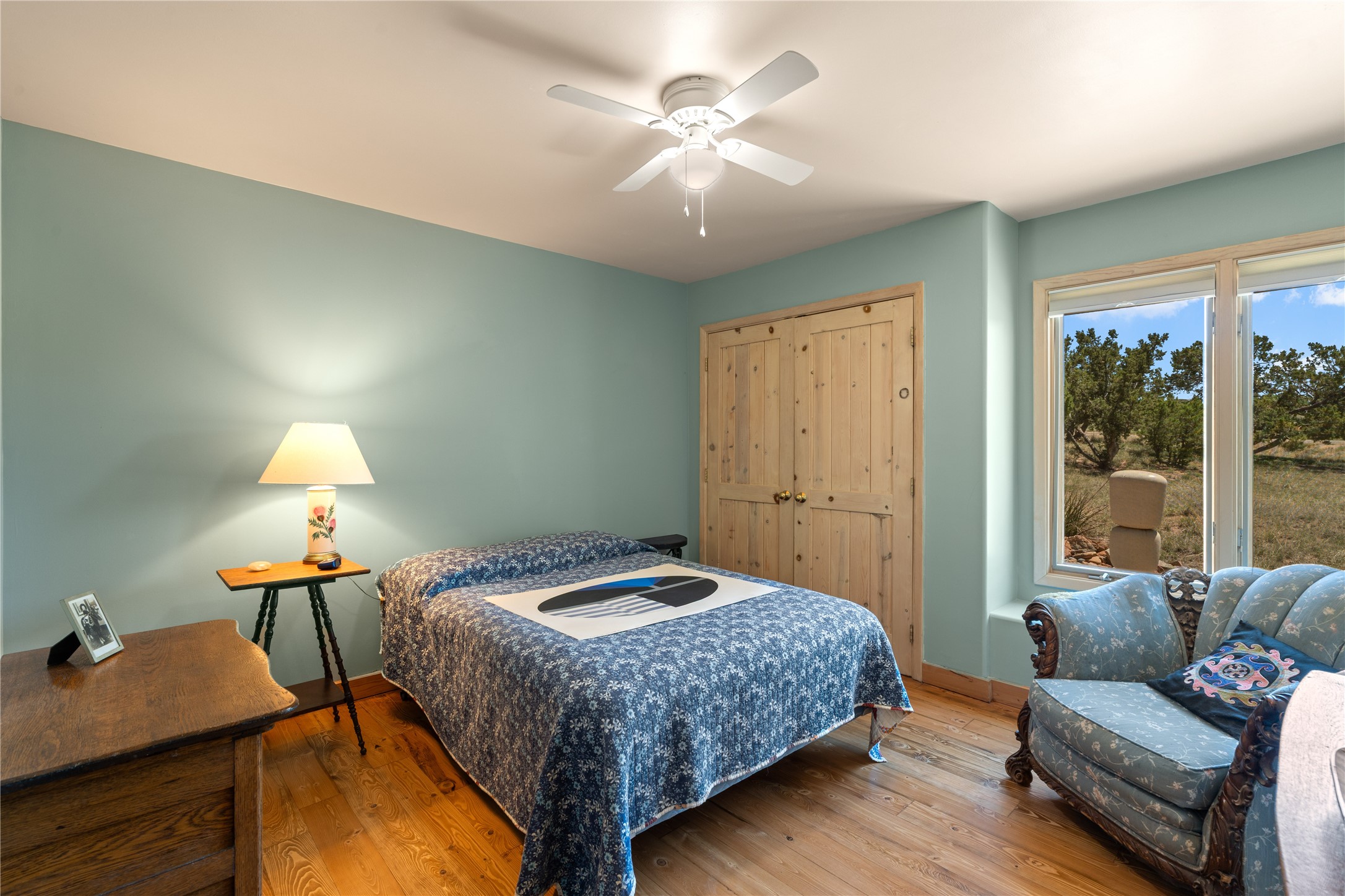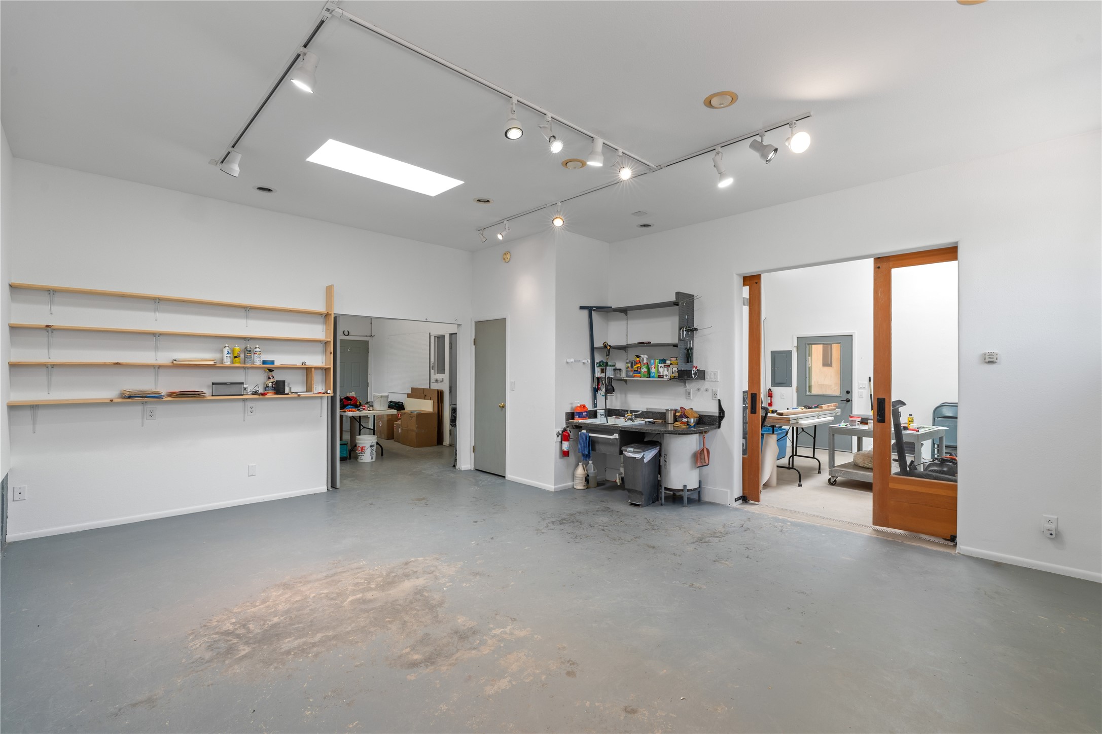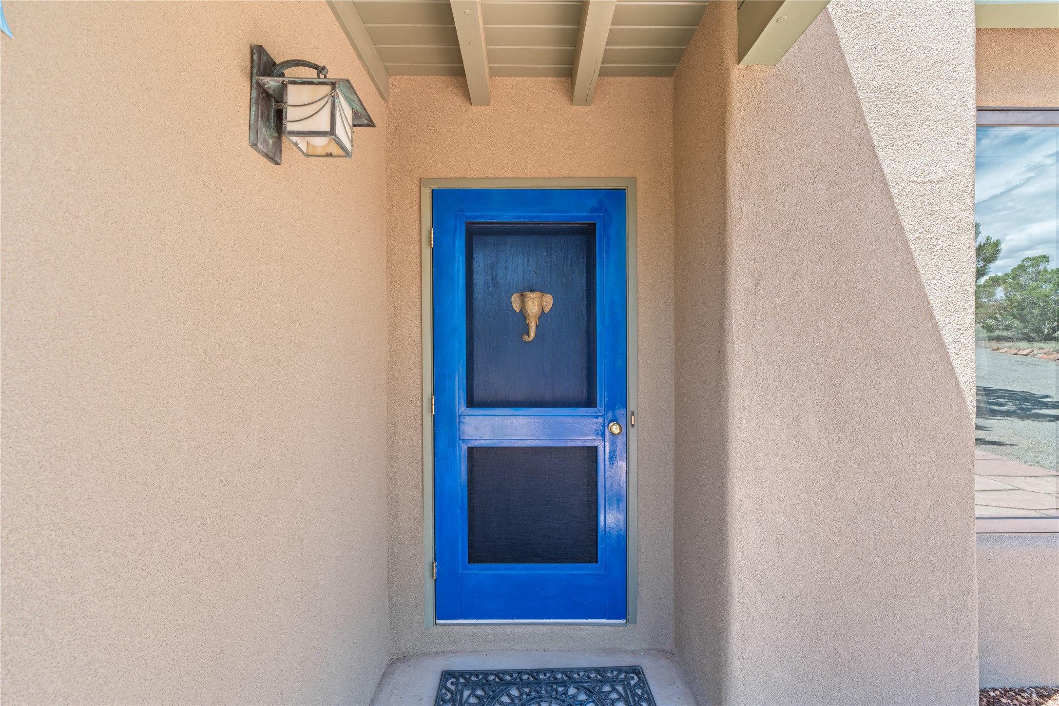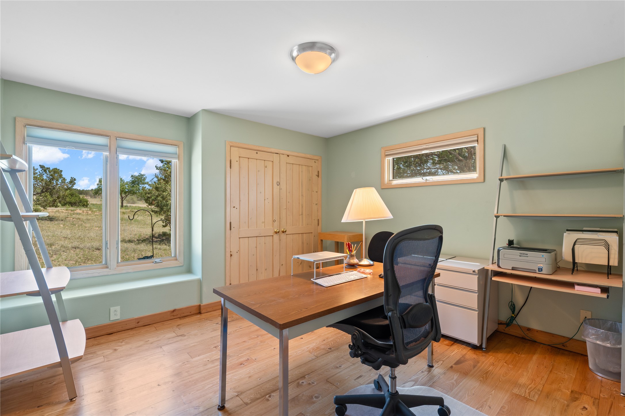 This charming 1,701 square foot, single-level Eldorado home with three bedrooms and two bathrooms blends southwestern character with privacy and artistic potential. A light and bright 1,095 sq. ft. professional artist studio, workshop provides ample space for artistic pursuits. The studio space boasts high ceilings, a bath, concrete floor, and clerestory windows. With its separate entrance and driveway, it could easily be converted into an additional living area. This beautiful home offers abundant natural light, clerestory windows, tile and newly refinished natural wood flooring, vigas, a cozy wood-burning fireplace and beautifully crafted wooden doors throughout. The primary bedroom, with ensuite bathroom, opens to an expansive deck with mountain views. The spacious kitchen has new stainless-steel appliances plus generous counter space and ample storage. The primary bedroom, dining room and kitchen all offer Jemez Mountain views. The art studio or workshop has a second driveway, is outfitted with high ceilings, two sinks, a half bathroom, refrigerator, 300 AMP power, insulated glass garage door and generous storage. The deck, studio and garage are freshly painted. Nestled on 1.61 acres bordering the greenbelt in the sought-after Eldorado community, amenities include the community center, tennis/pickleball courts, swimming pool, dog park and an expansive trail system for hiking, biking and horseback riding. Updates include newly refinished wood flooring (2025), fresh paint and a full exterior stucco refresh (2022), refurbished double-paned insulated windows (2016), new water heater (2017), new metal roof, skylights and gutters (2021), roof maintenance (2021), new flagstone patio in front entrance (2022) and new double cellular insulated shades (2025). Approved ILR with lot corners flagged (July 2025) and septic serviced and inspection completed (July 2025).