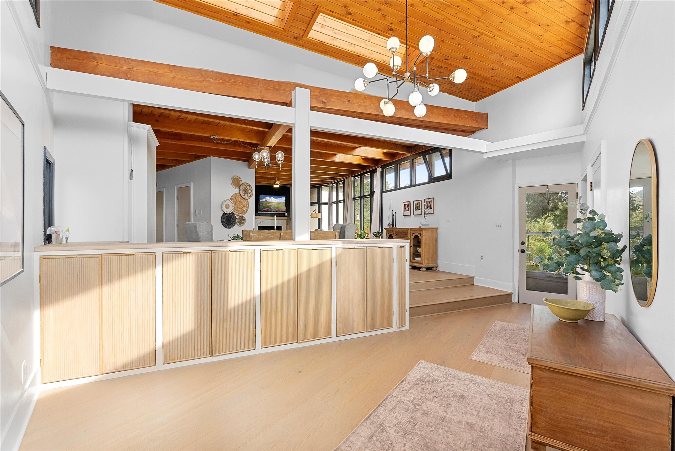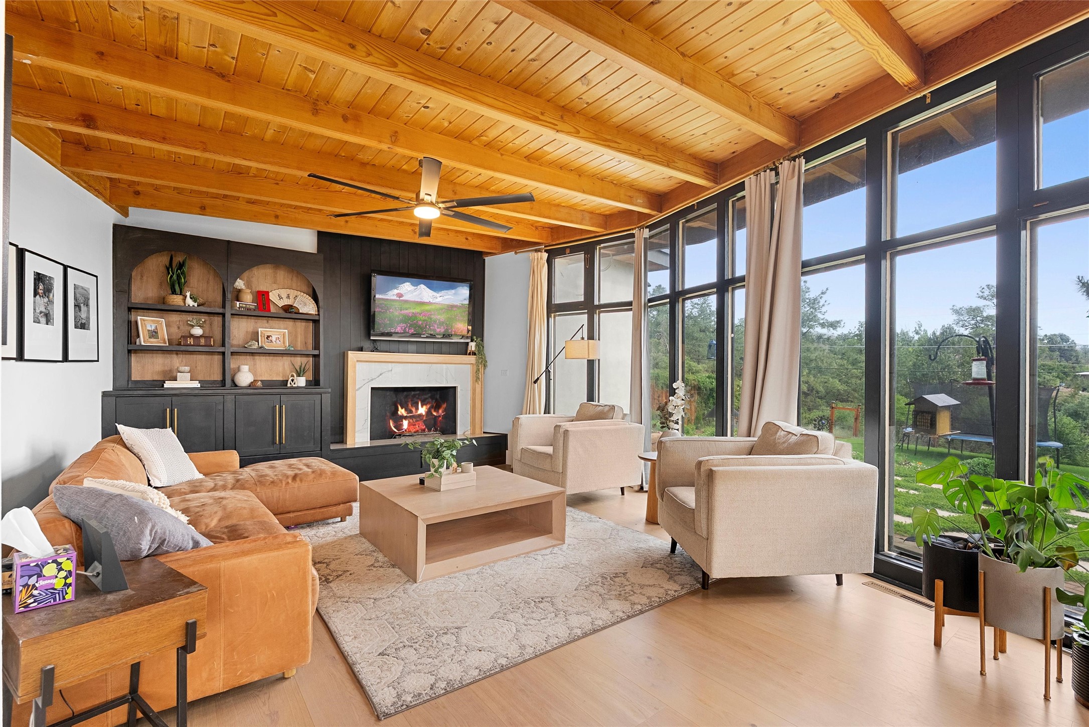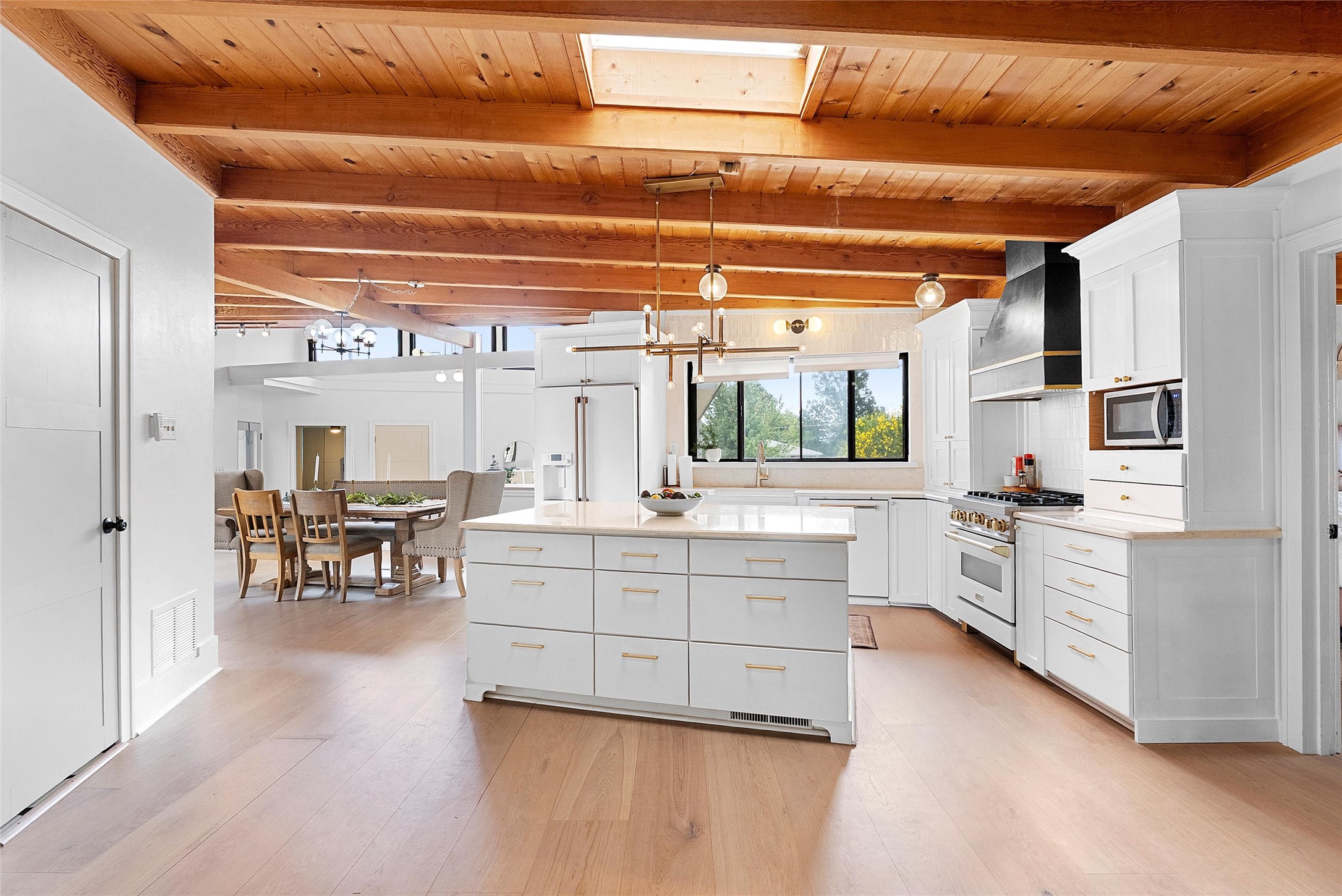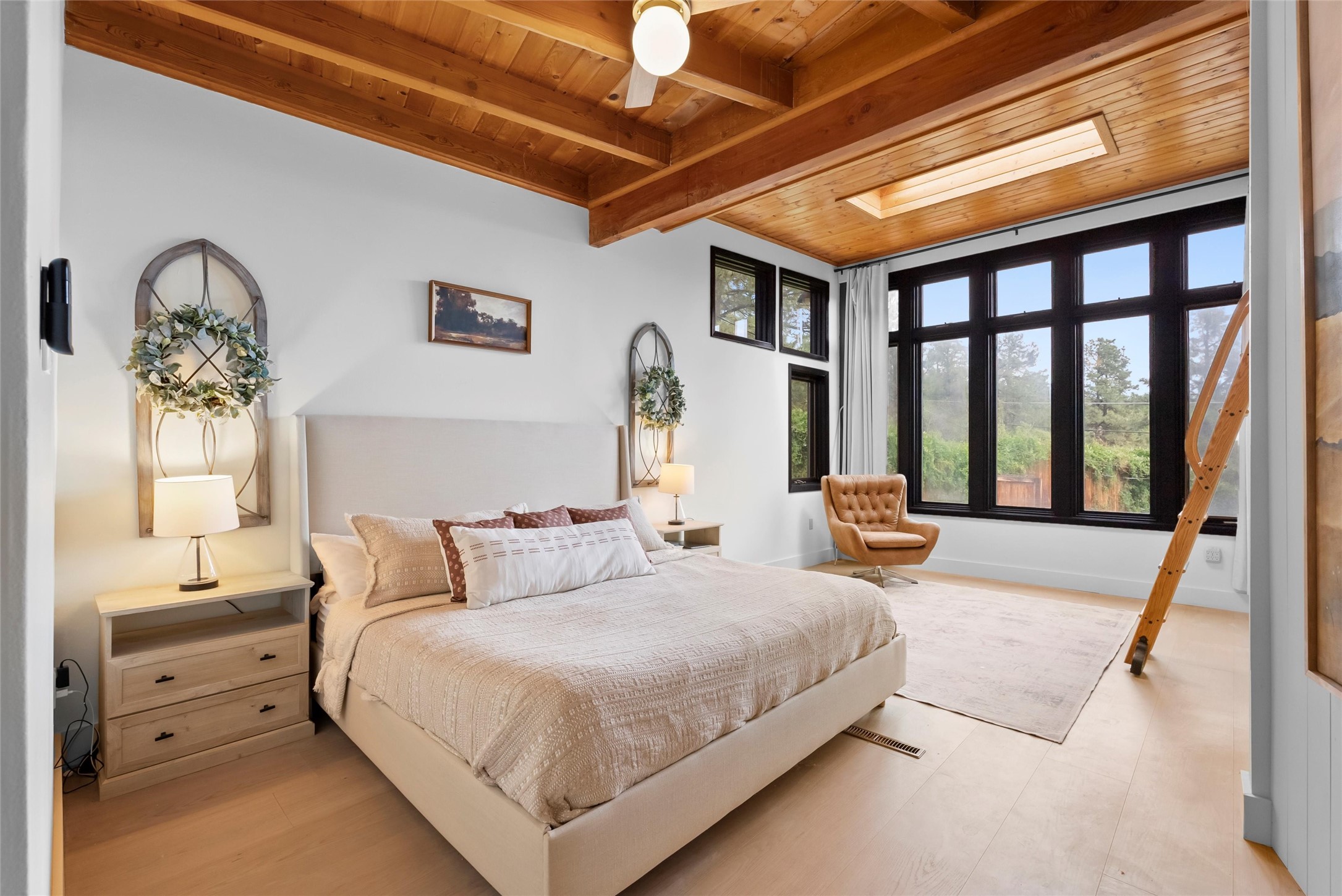 This stunning mid-century modern home on Barranca Mesa blends timeless architecture with thoughtful, high-quality updates. From the moment you step inside, floor-to-ceiling windows draw you in with natural light and stunning views, perfectly framing the beautifully renovated fireplace mantle at the heart of the open living space. High wood ceilings add warmth and dimension, making the space feel inviting and effortlessly cool.New flooring runs throughout the home, tying each room together with a clean, modern touch. The kitchen features newer appliances and a functional layout that complements the home's classic aesthetic. Central A/C keeps things comfortable year-round.The bedrooms are well-sized and versatile, with the fourth featuring a built-in Murphy bed, ideal for guests, a home office, or a flex space. The primary suite is a standout with a beautifully remodeled, spa-like bathroom and a convenient loft-style storage area accessible by ladder -- a clever and practical use of space.Step outside to a beautifully landscaped backyard, complete with a brand-new fence and a hot tub for relaxing under the stars. The walk-in basement, accessible from the exterior, offers ample storage for gear, tools, or hobbies. A circular driveway and a long, straight drive keep the home set back from the road, enhancing privacy and curb appeal.With its iconic design, smart updates, and seamless indoor-outdoor flow, this Barranca Mesa home is the perfect blend of character, comfort, and mid-century charm.