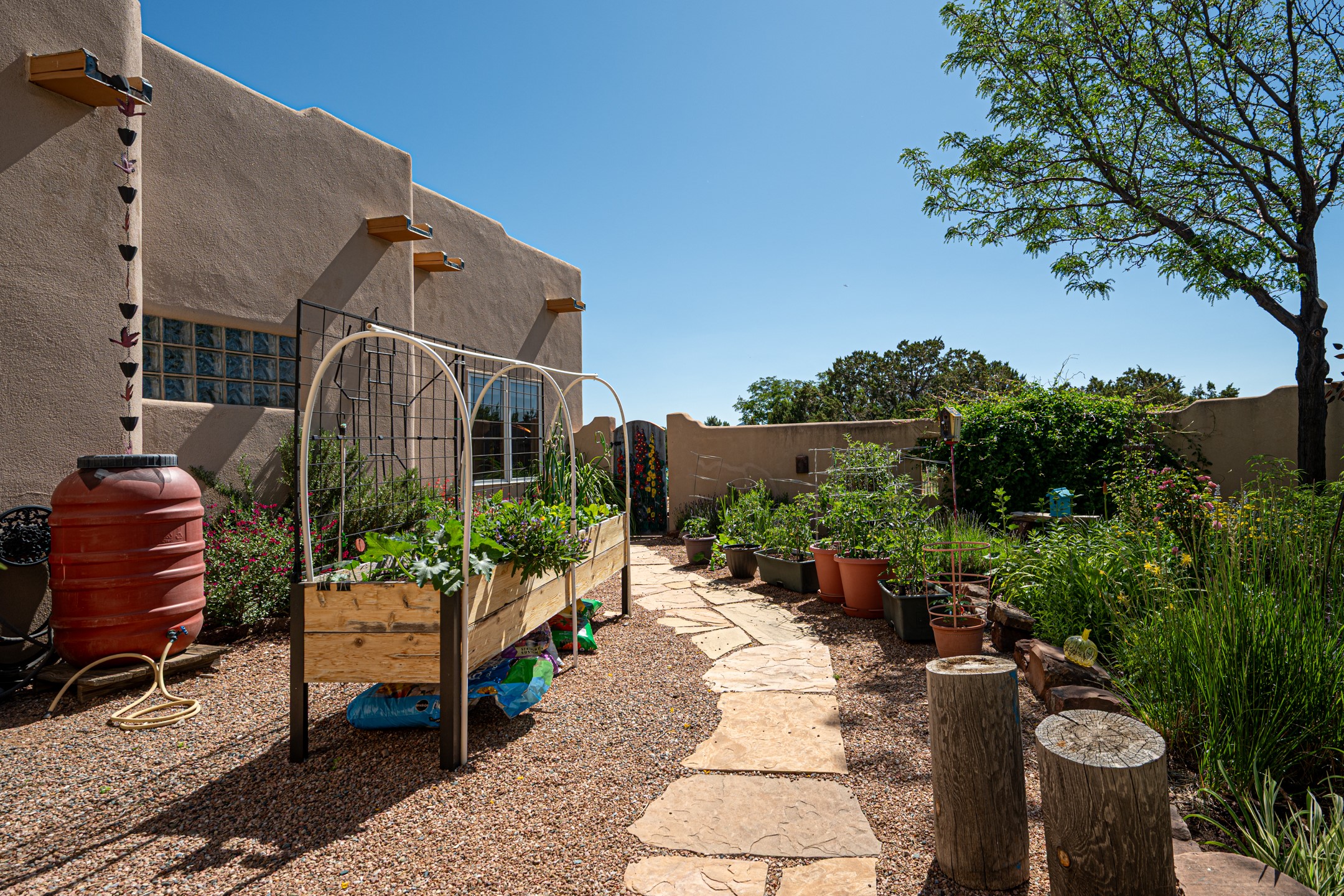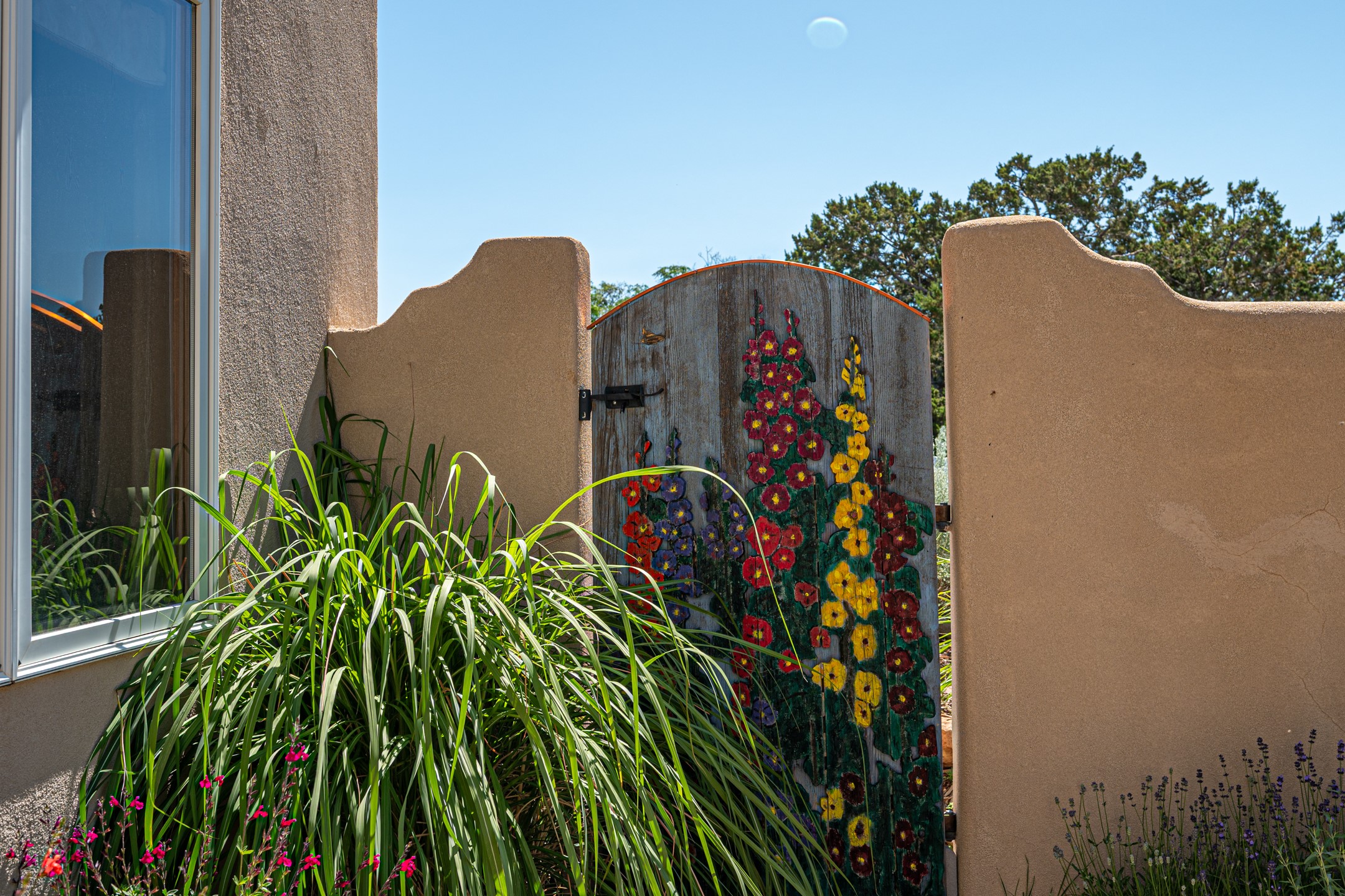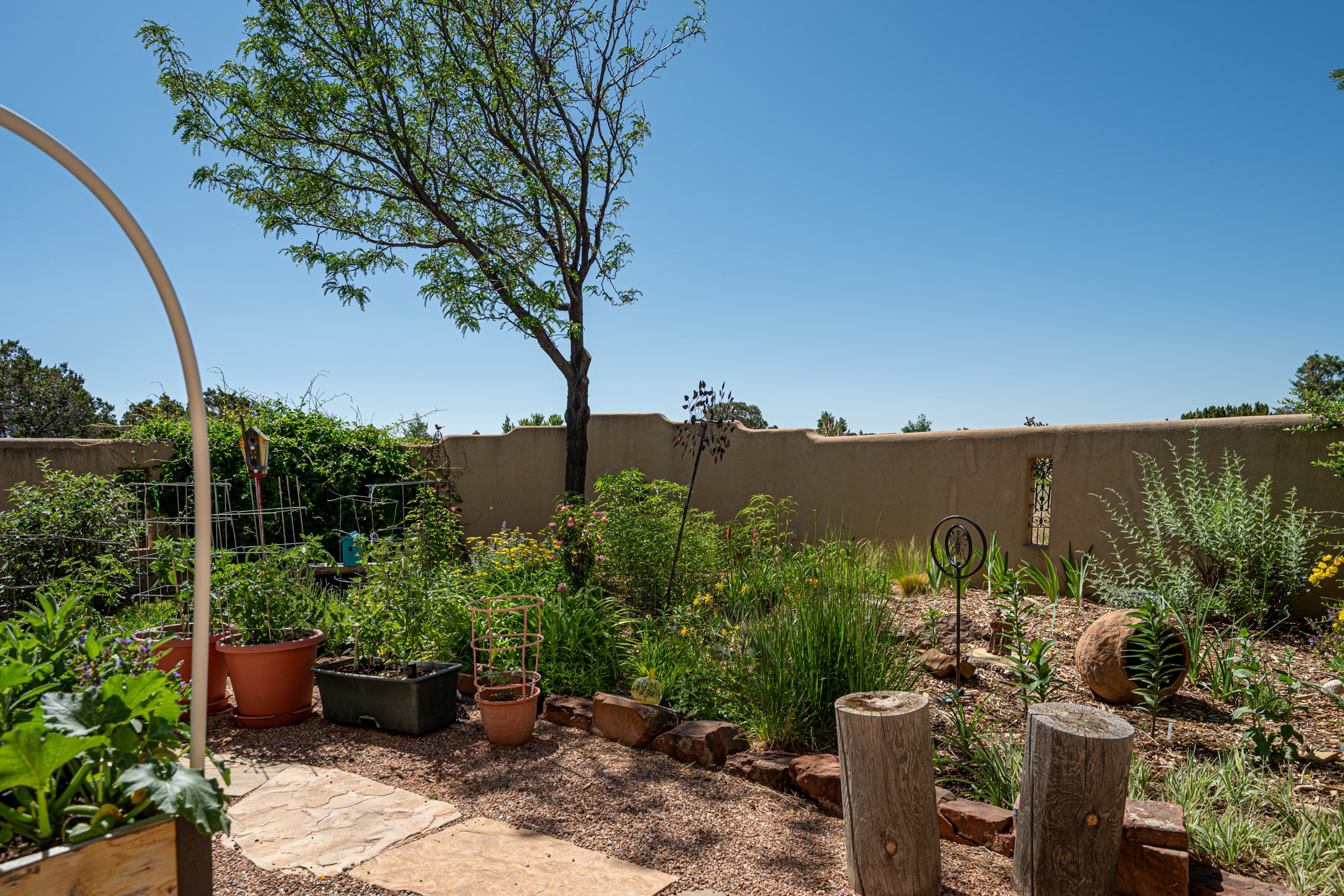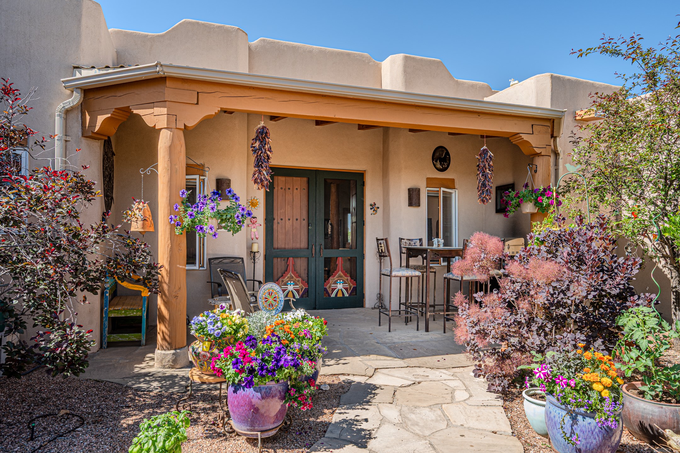 Priced to Sell! Exquisite Eastside Santa Fe 2700 sq.ft home in Eldorado built by Timothy House. Two beautifully landscaped, well established walled gardens create a private oasis on the south, west and north sides offering delightfully colorful views from the long grand 14ft high great room and dining room ceiling with 8ft high Pella windows. French doors lead out onto a large portal and 3 fireplaces including one in the garden for enjoyable outside entertainment. Viga beams, bancos, corbels and nichos add to the Santa Fe ambience and character. A lovely well designed kitchen featuring a large central island, granite counter tops, travertine backsplashes, custom cabinetry and updated appliances. The large owners suite includes a sitting area and kiva fireplace. A new silicone roof was installed in 2023 with a 20 year transferable warranty. A two zone central GFA heating and air-conditioning system on the roof makes for comfortable living year round. The guest area includes a large office which can double as a 3rd bedroom, the Murphy bed is not attached and will not be staying. There is even a secluded area for growing your own veggies. All this with Eldorado amenities close by, local shopping and services only minutes into Santa Fe.