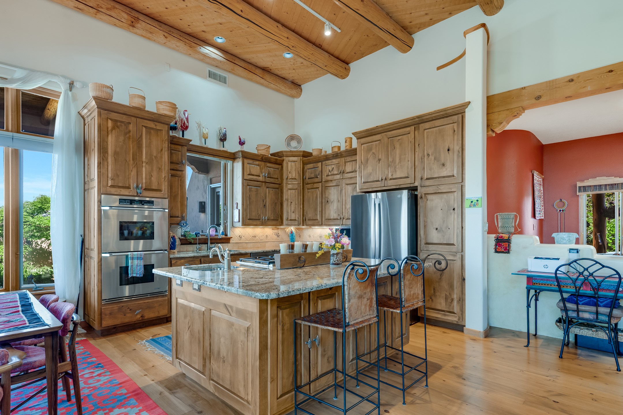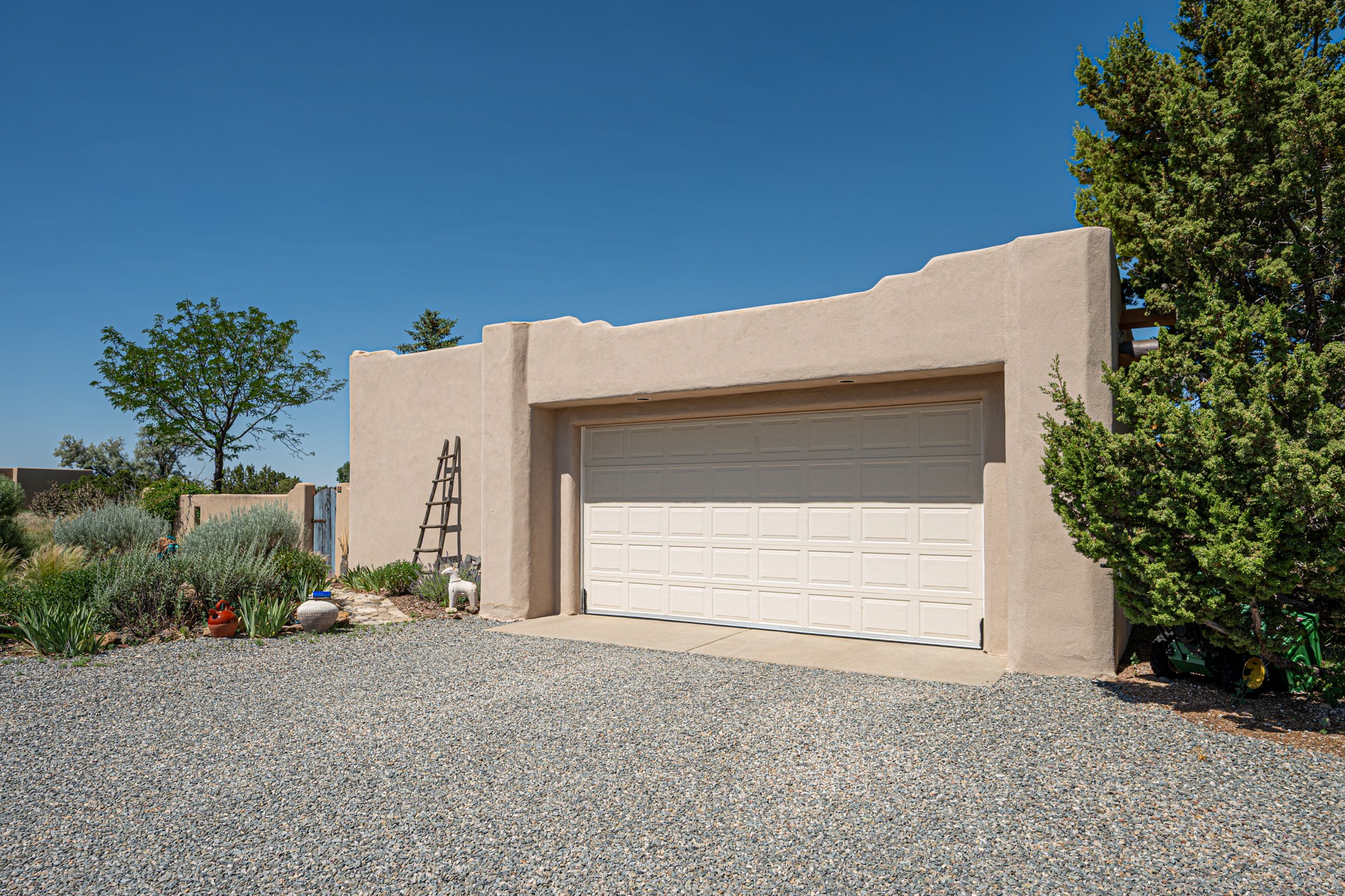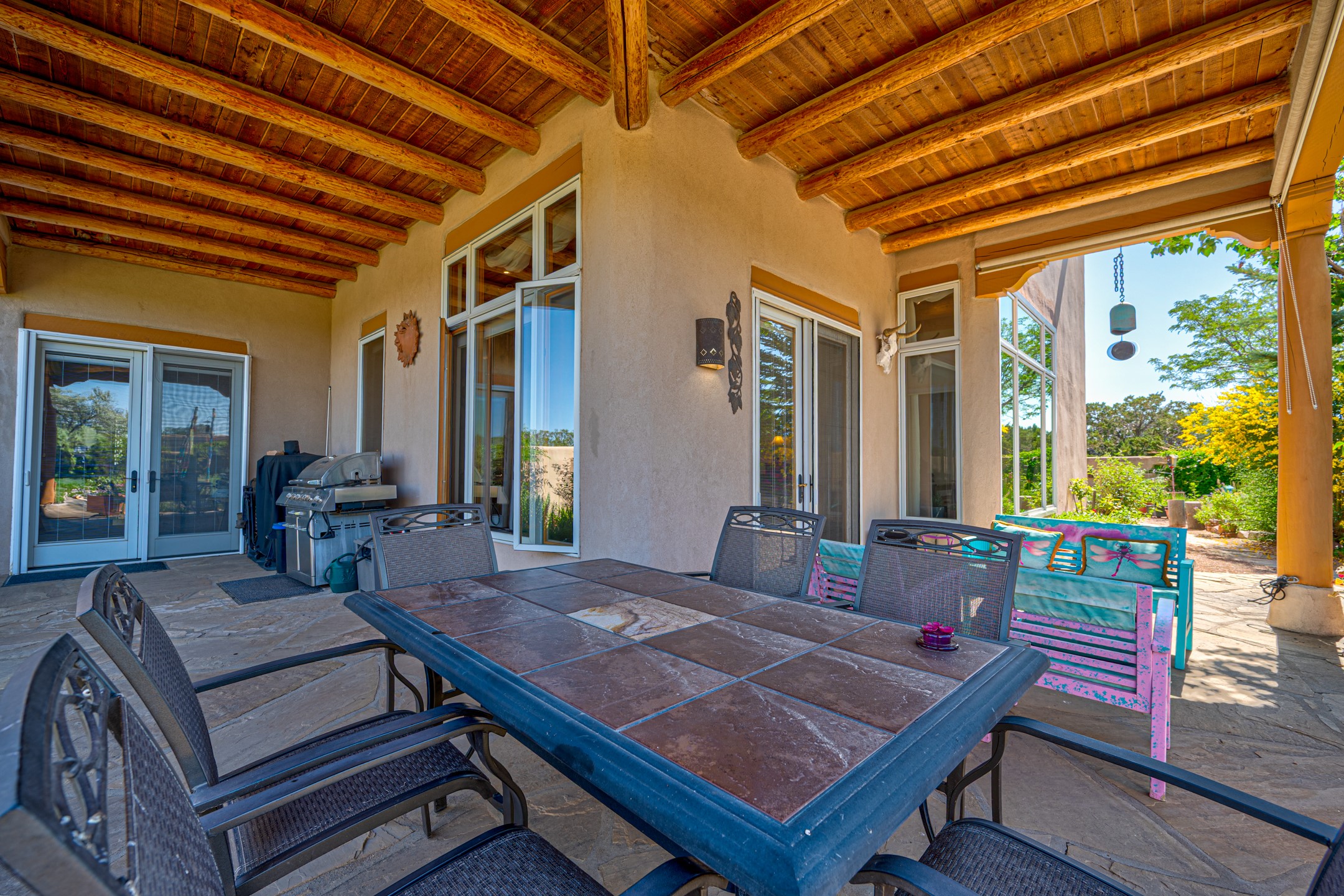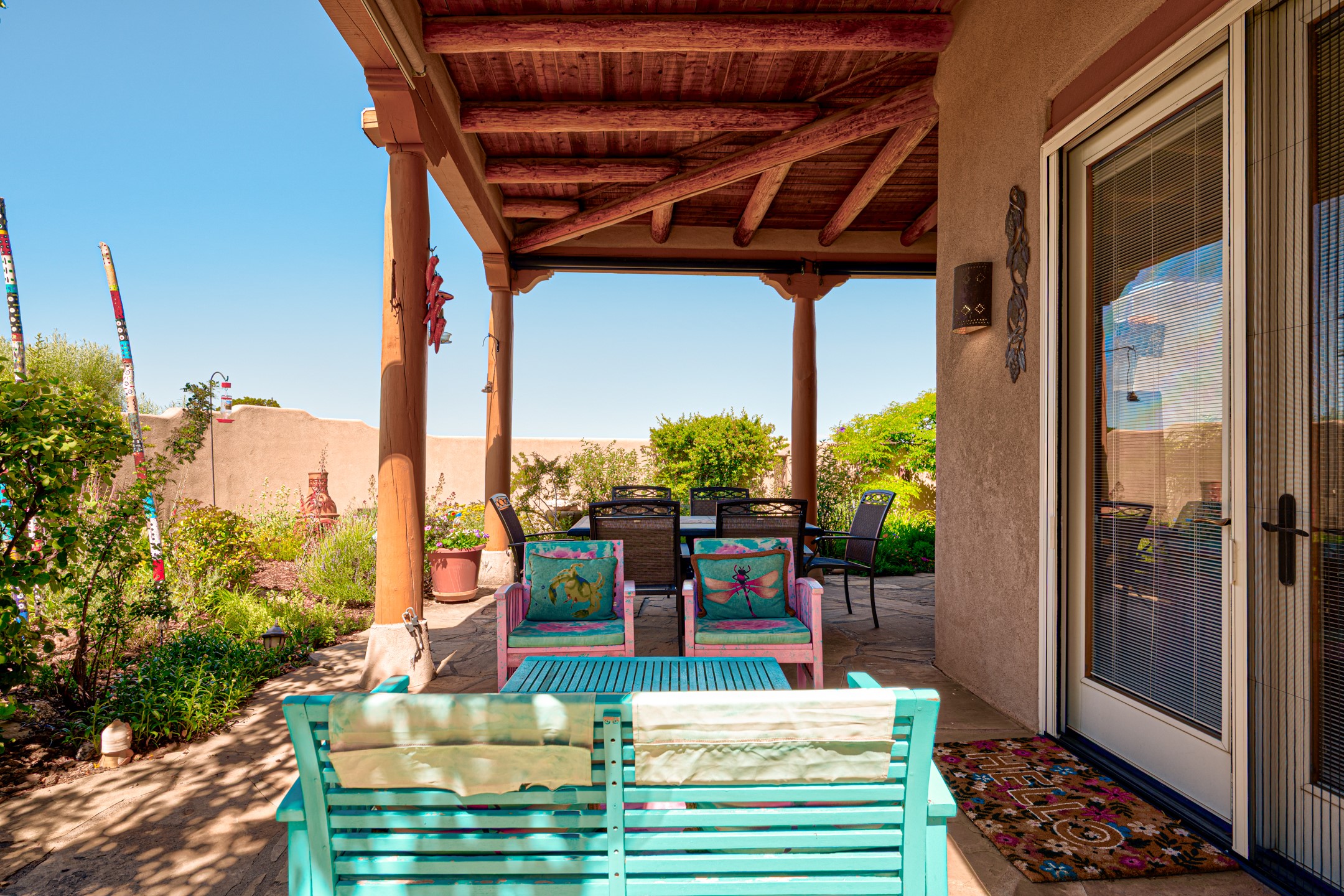 Priced to Sell! Exquisite Eastside Santa Fe 2700 sq.ft home in Eldorado built by Timothy House. Two beautifully landscaped, well established walled gardens create a private oasis on the south, west and north sides offering delightfully colorful views from the long grand 14ft high great room and dining room ceiling with 8ft high Pella windows. French doors lead out onto a large portal and 3 fireplaces including one in the garden for enjoyable outside entertainment. Viga beams, bancos, corbels and nichos add to the Santa Fe ambience and character. A lovely well designed kitchen featuring a large central island, granite counter tops, travertine backsplashes, custom cabinetry and updated appliances. The large owners suite includes a sitting area and kiva fireplace. A new silicone roof was installed in 2023 with a 20 year transferable warranty. A two zone central GFA heating and air-conditioning system on the roof makes for comfortable living year round. The guest area includes a large office which can double as a 3rd bedroom, the Murphy bed is not attached and will not be staying. There is even a secluded area for growing your own veggies. All this with Eldorado amenities close by, local shopping and services only minutes into Santa Fe.