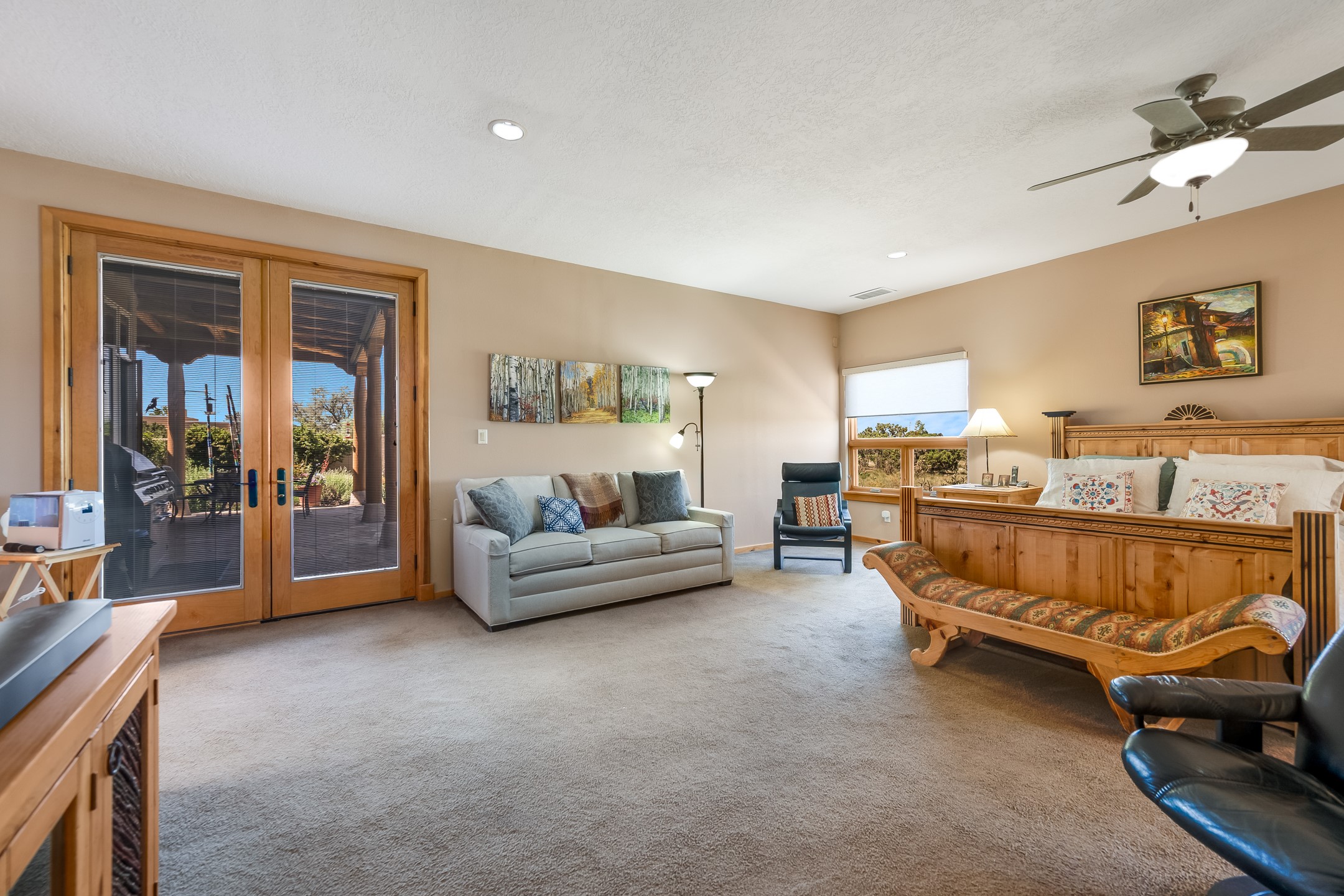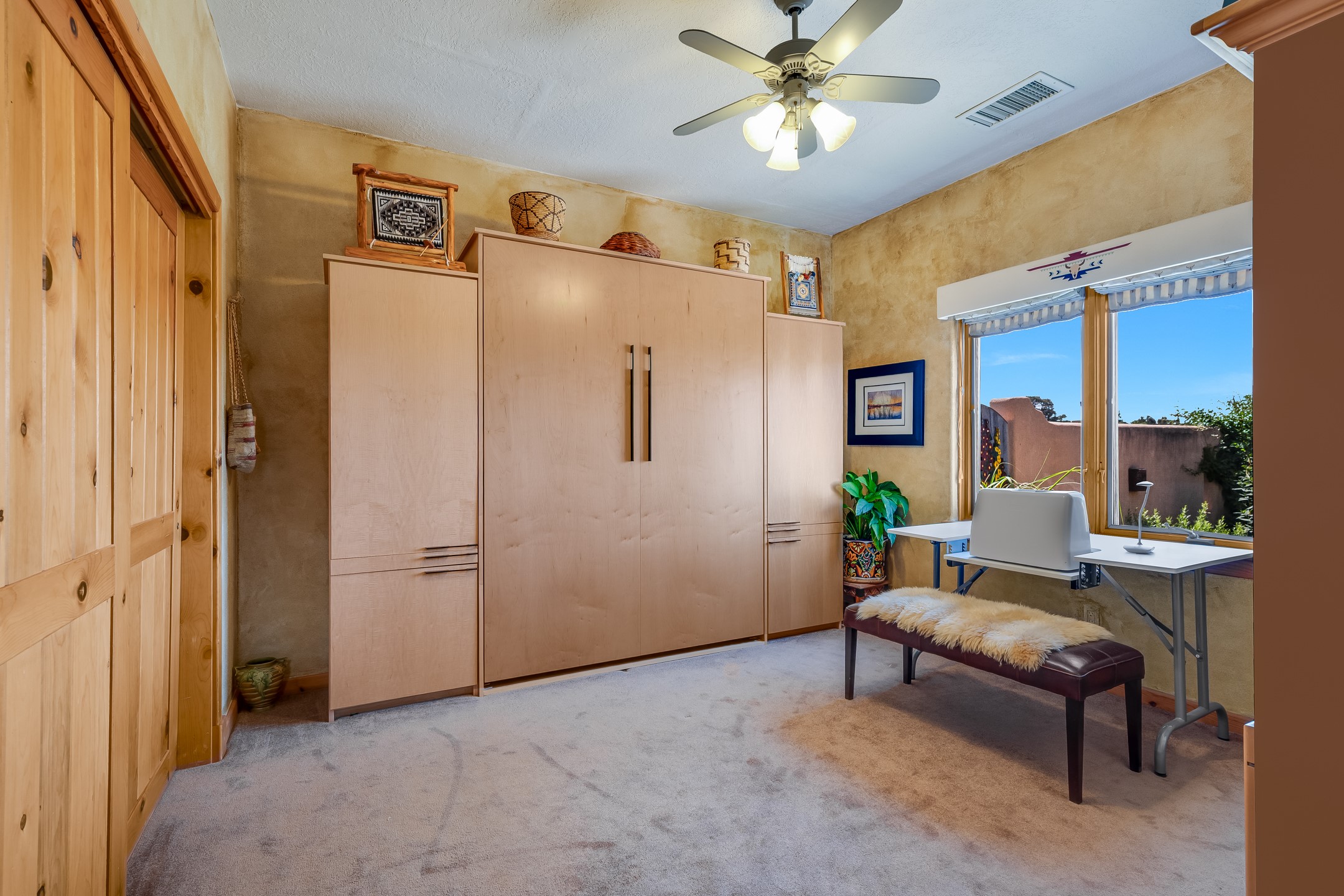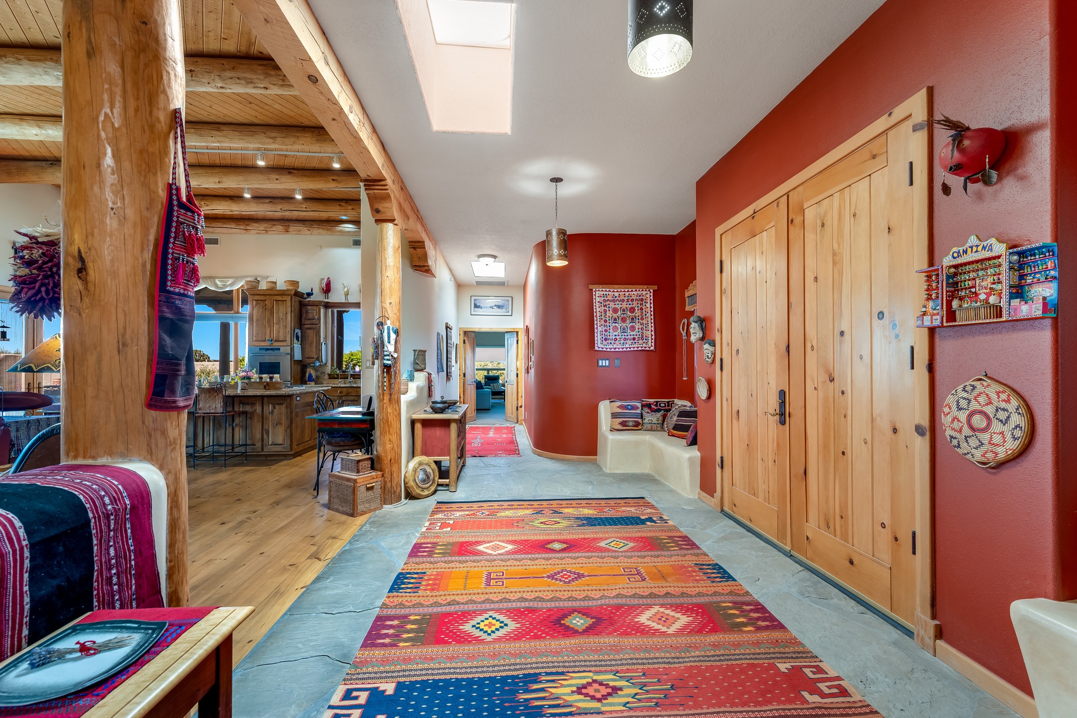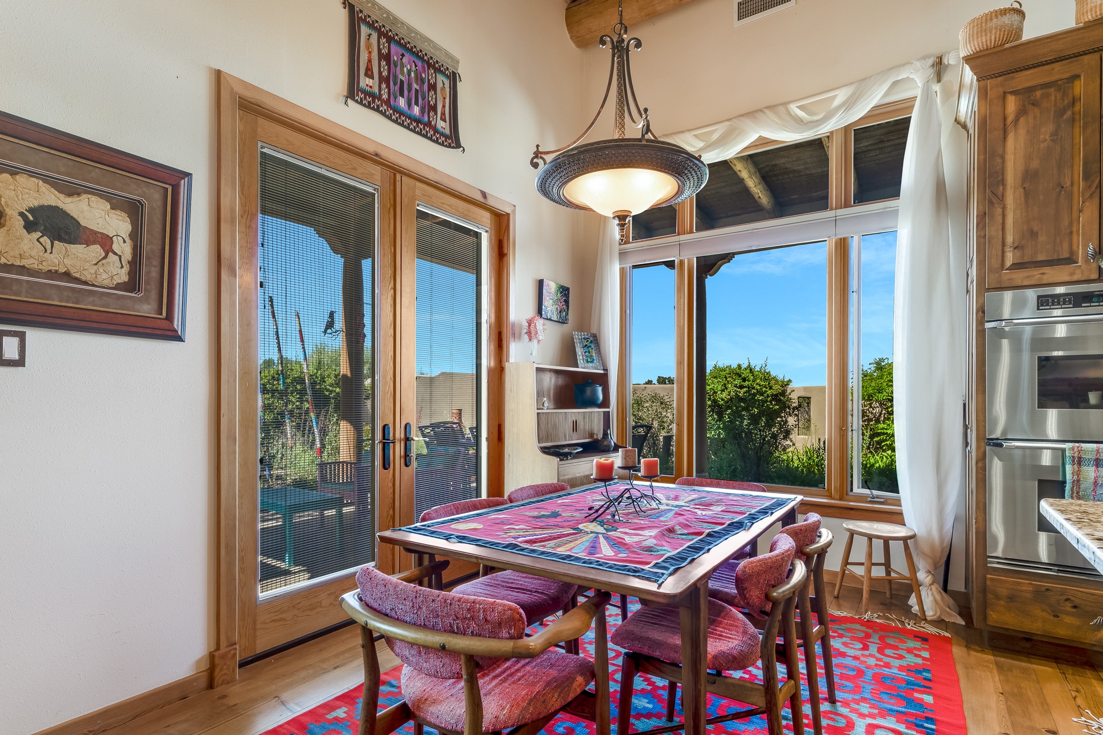 Priced to Sell! Exquisite Eastside Santa Fe 2700 sq.ft home in Eldorado built by Timothy House. Two beautifully landscaped, well established walled gardens create a private oasis on the south, west and north sides offering delightfully colorful views from the long grand 14ft high great room and dining room ceiling with 8ft high Pella windows. French doors lead out onto a large portal and 3 fireplaces including one in the garden for enjoyable outside entertainment. Viga beams, bancos, corbels and nichos add to the Santa Fe ambience and character. A lovely well designed kitchen featuring a large central island, granite counter tops, travertine backsplashes, custom cabinetry and updated appliances. The large owners suite includes a sitting area and kiva fireplace. A new silicone roof was installed in 2023 with a 20 year transferable warranty. A two zone central GFA heating and air-conditioning system on the roof makes for comfortable living year round. The guest area includes a large office which can double as a 3rd bedroom, the Murphy bed is not attached and will not be staying. There is even a secluded area for growing your own veggies. All this with Eldorado amenities close by, local shopping and services only minutes into Santa Fe.