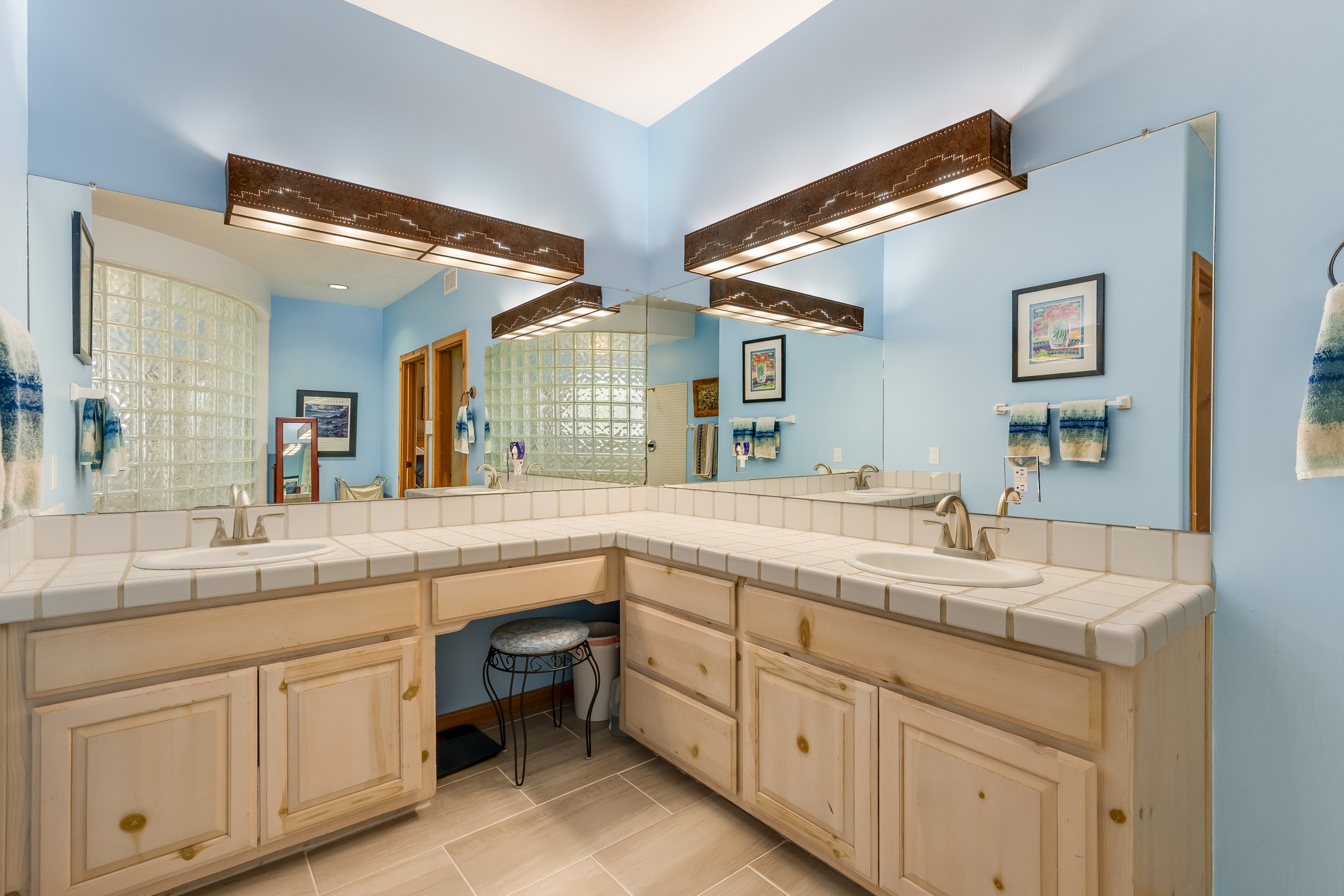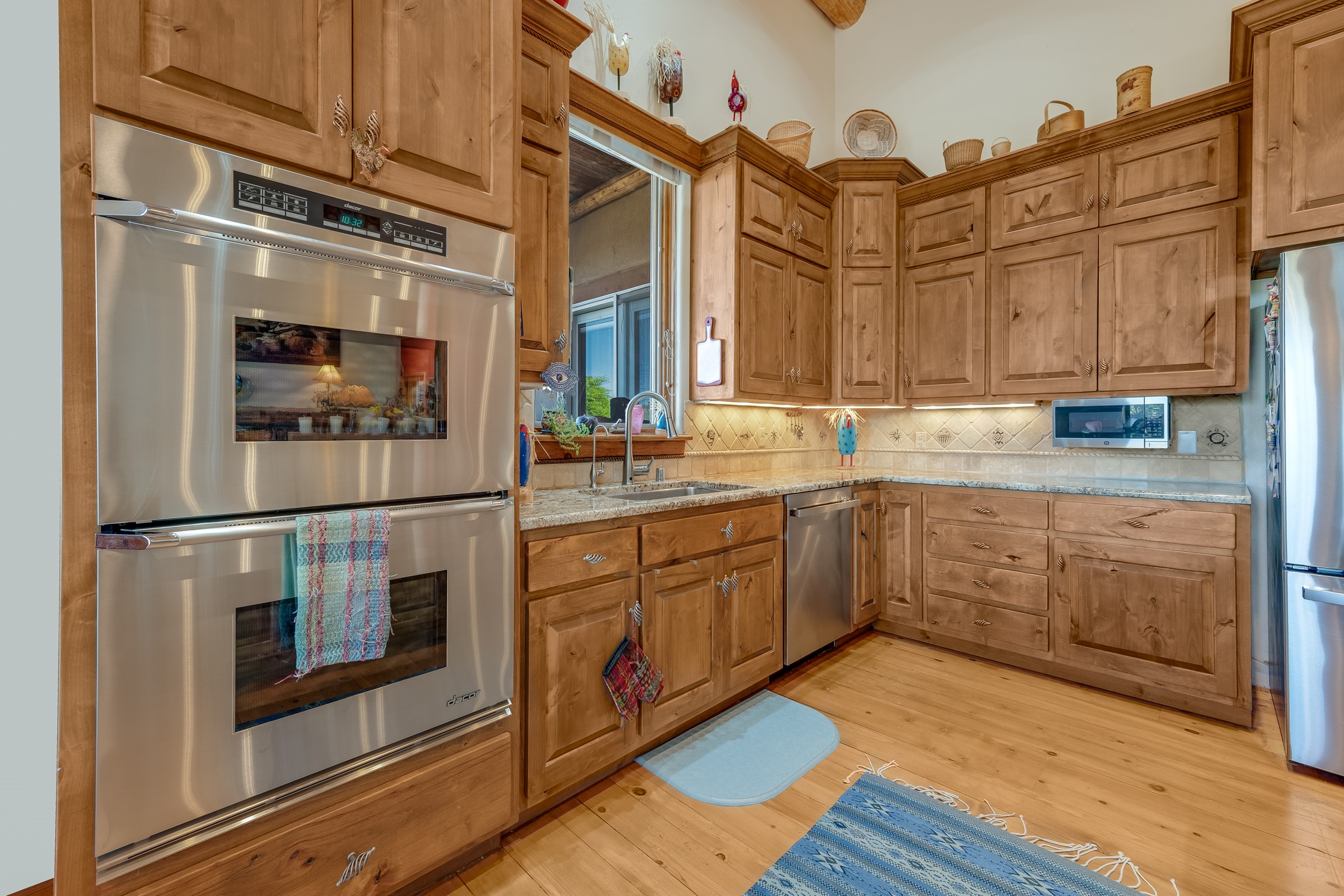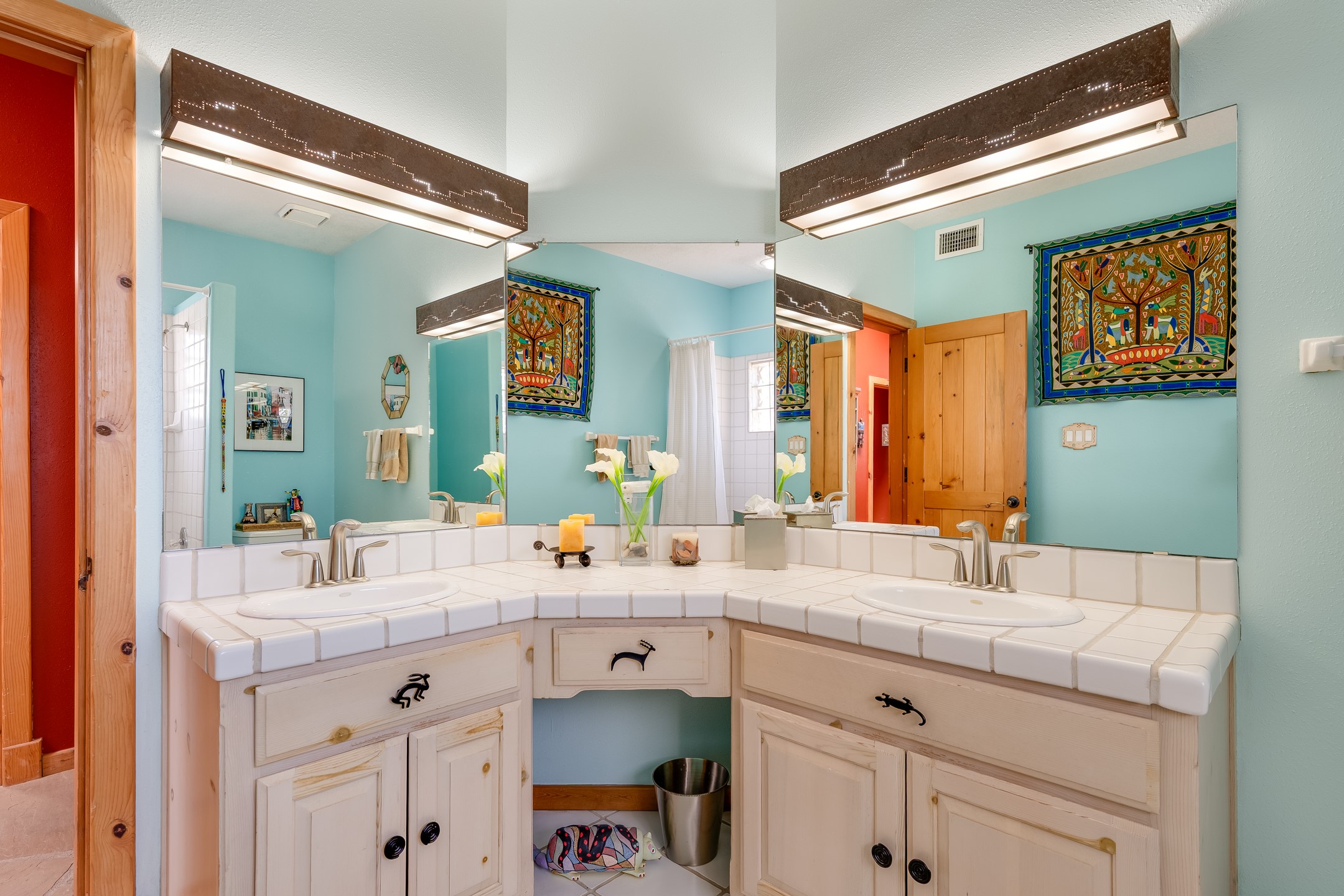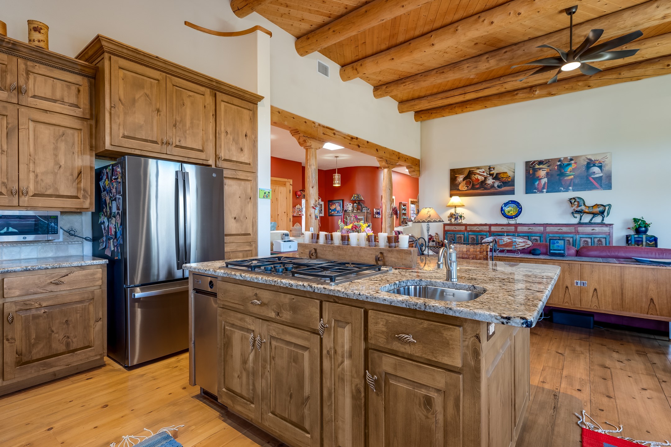 Priced to Sell! Exquisite Eastside Santa Fe 2700 sq.ft home in Eldorado built by Timothy House. Two beautifully landscaped, well established walled gardens create a private oasis on the south, west and north sides offering delightfully colorful views from the long grand 14ft high great room and dining room ceiling with 8ft high Pella windows. French doors lead out onto a large portal and 3 fireplaces including one in the garden for enjoyable outside entertainment. Viga beams, bancos, corbels and nichos add to the Santa Fe ambience and character. A lovely well designed kitchen featuring a large central island, granite counter tops, travertine backsplashes, custom cabinetry and updated appliances. The large owners suite includes a sitting area and kiva fireplace. A new silicone roof was installed in 2023 with a 20 year transferable warranty. A two zone central GFA heating and air-conditioning system on the roof makes for comfortable living year round. The guest area includes a large office which can double as a 3rd bedroom, the Murphy bed is not attached and will not be staying. There is even a secluded area for growing your own veggies. All this with Eldorado amenities close by, local shopping and services only minutes into Santa Fe.