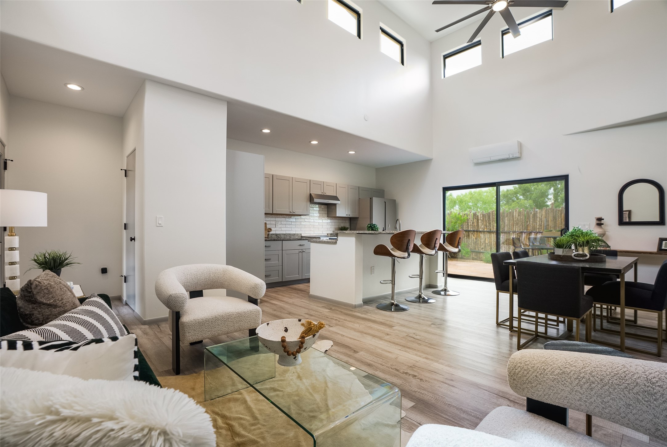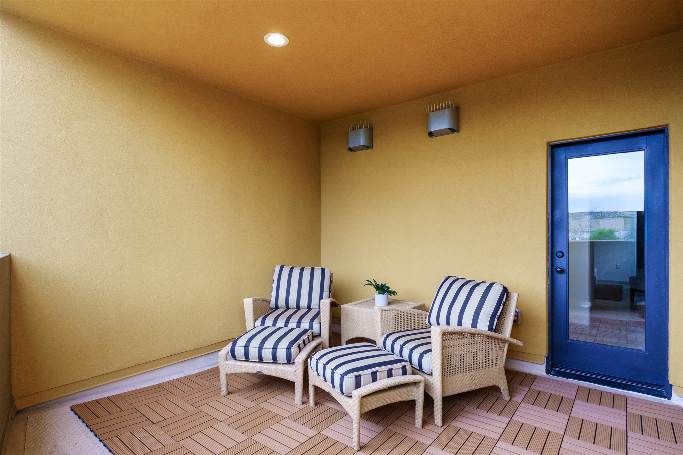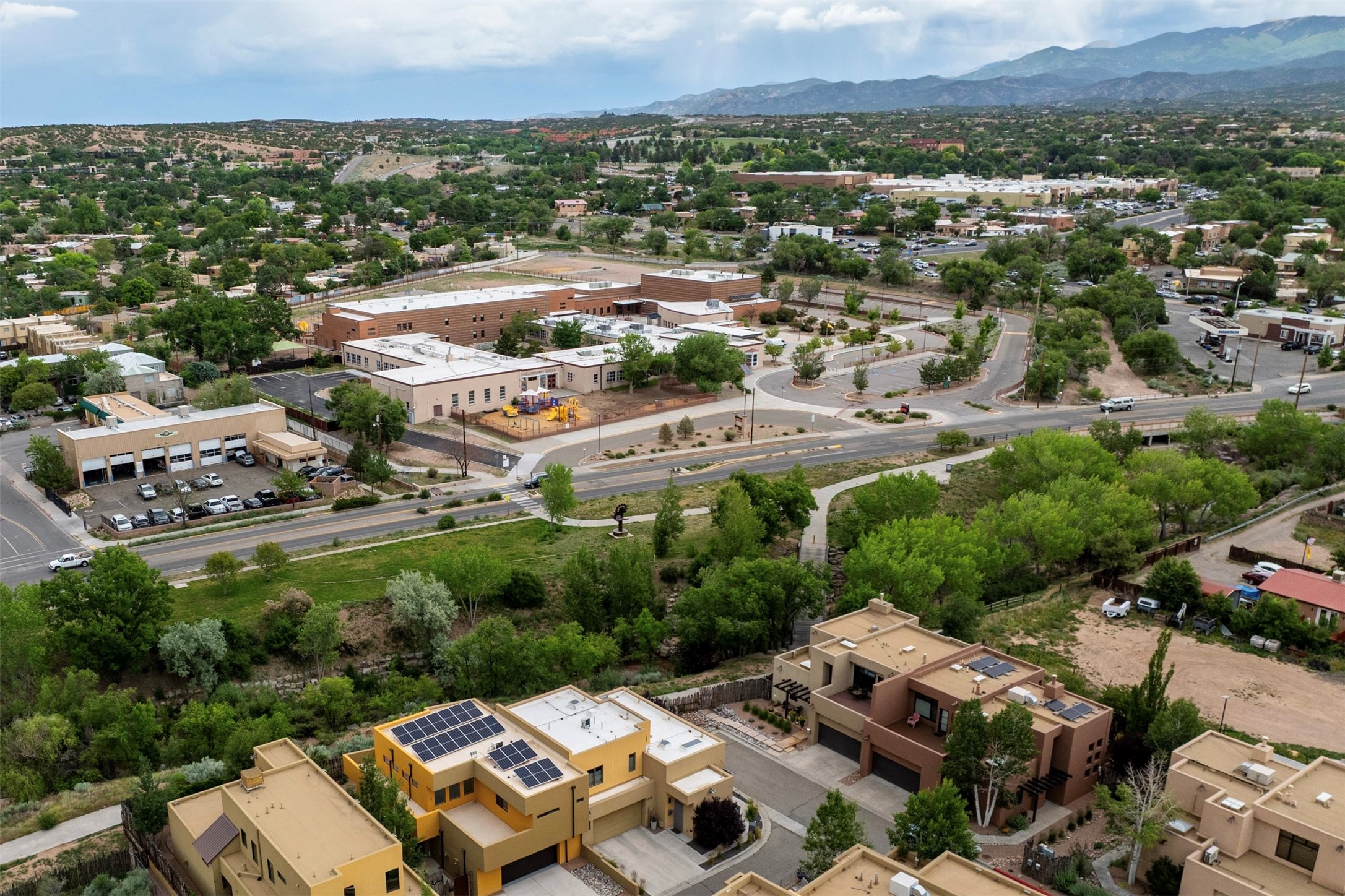 Tucked away at the end of a private drive alongside the Santa Fe River Trail, this expertly designed condominium offers both privacy and proximity to the Plaza. Crafted as an all-electric home with an Emerald Green Certification, the highest level attainable including owned solar equaling zero electricity bills. Inside, the main living area features double height ceilings with architectural clerestory windows and seamless indoor-outdoor flow to the rear patio. The downstairs bedroom offers flexibility as a guest space or private office, while the upstairs primary suite feels like a retreat with a sense of quiet separation. Plus a covered portal with stunning mountain views. Located just one mile from the Plaza along the river trail and less than a mile from the Santa Fe Railyard & Farmers Market this unique property is perfectly positioned for convenience. In-floor radiant heating throughout including the garage and mini splits offer year round comfort. Low maintenance landscaping and smart home features offer the ability to lock and leave without worry. A rare contemporary offering near the Plaza!