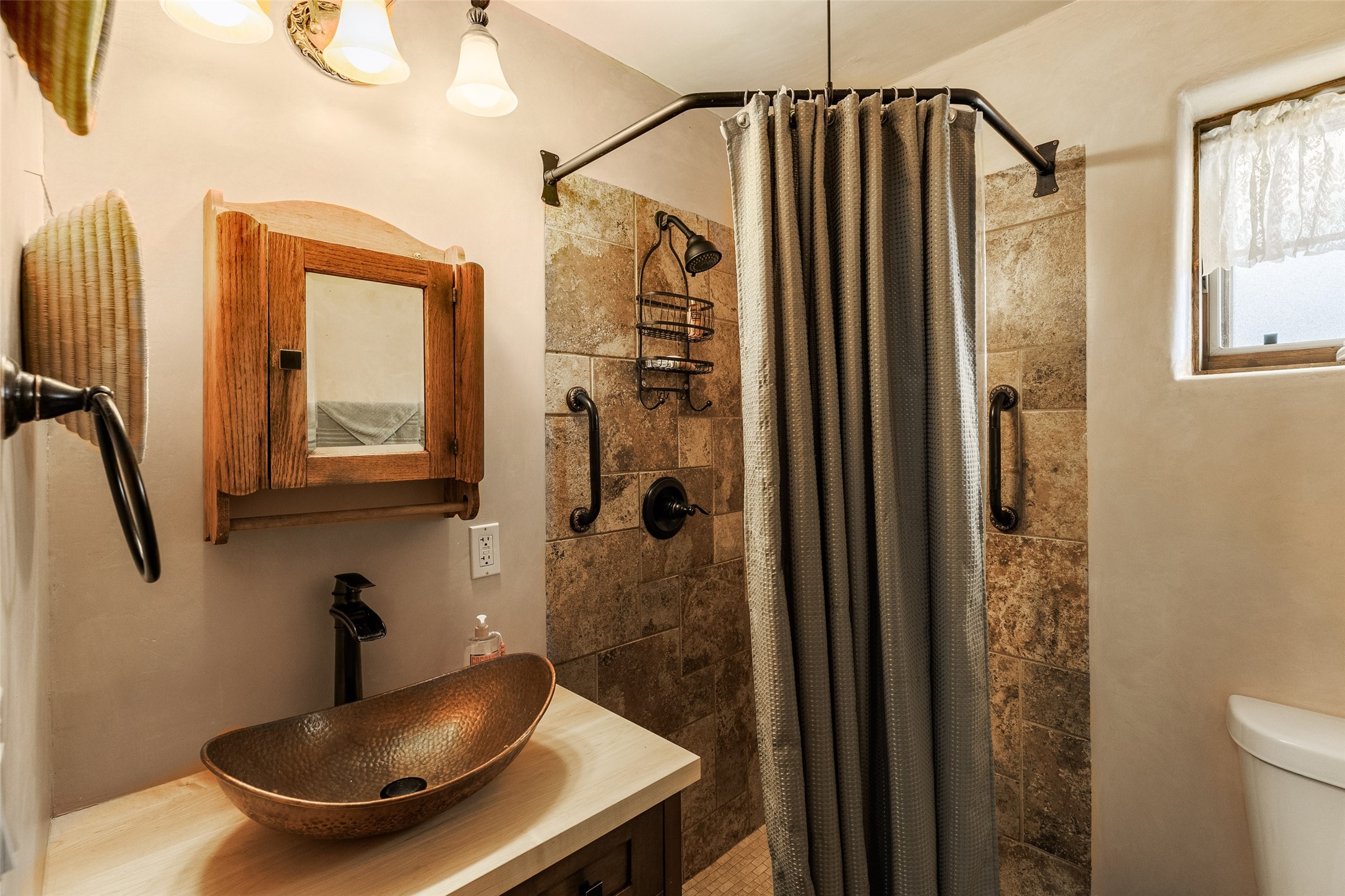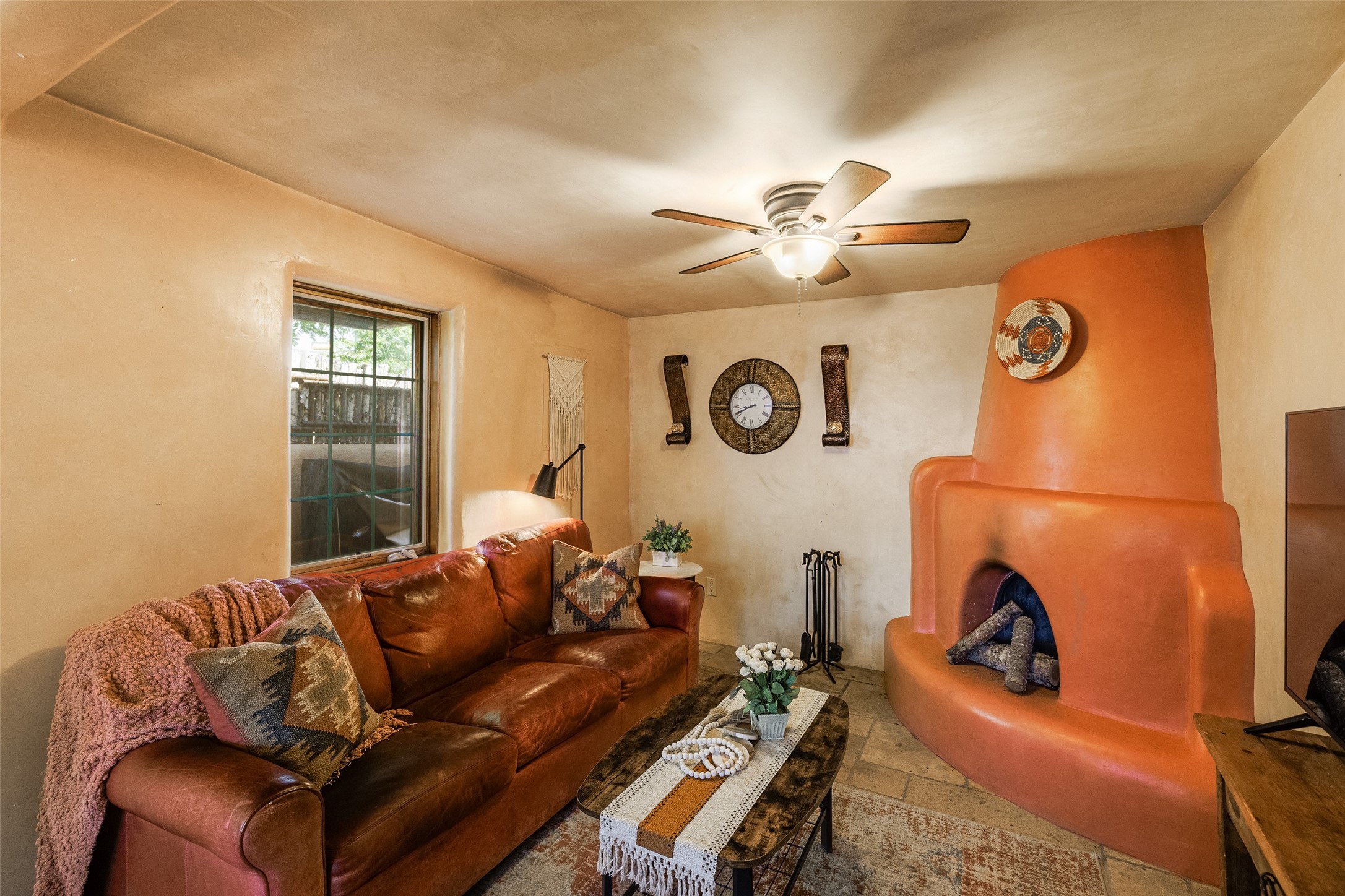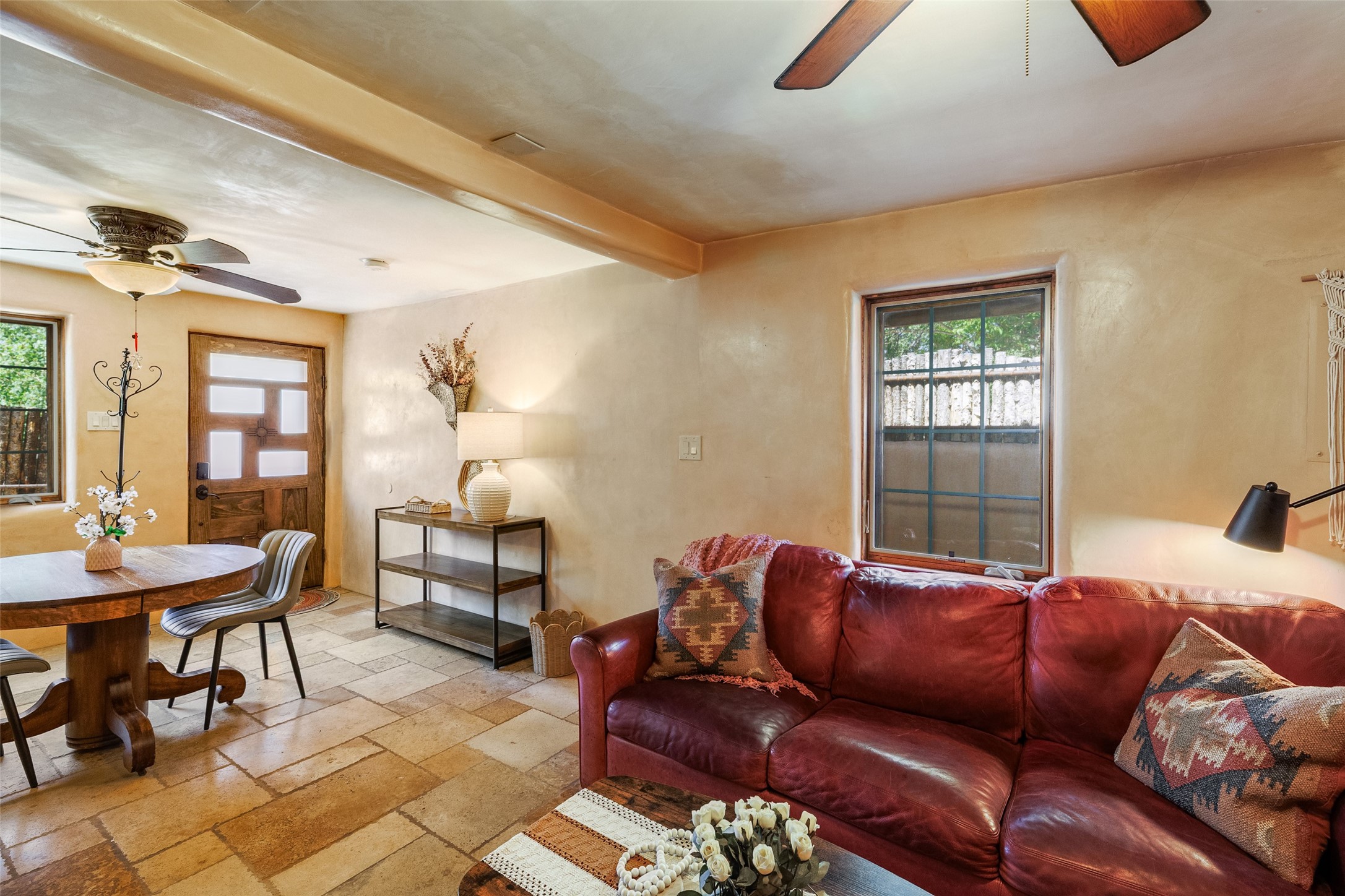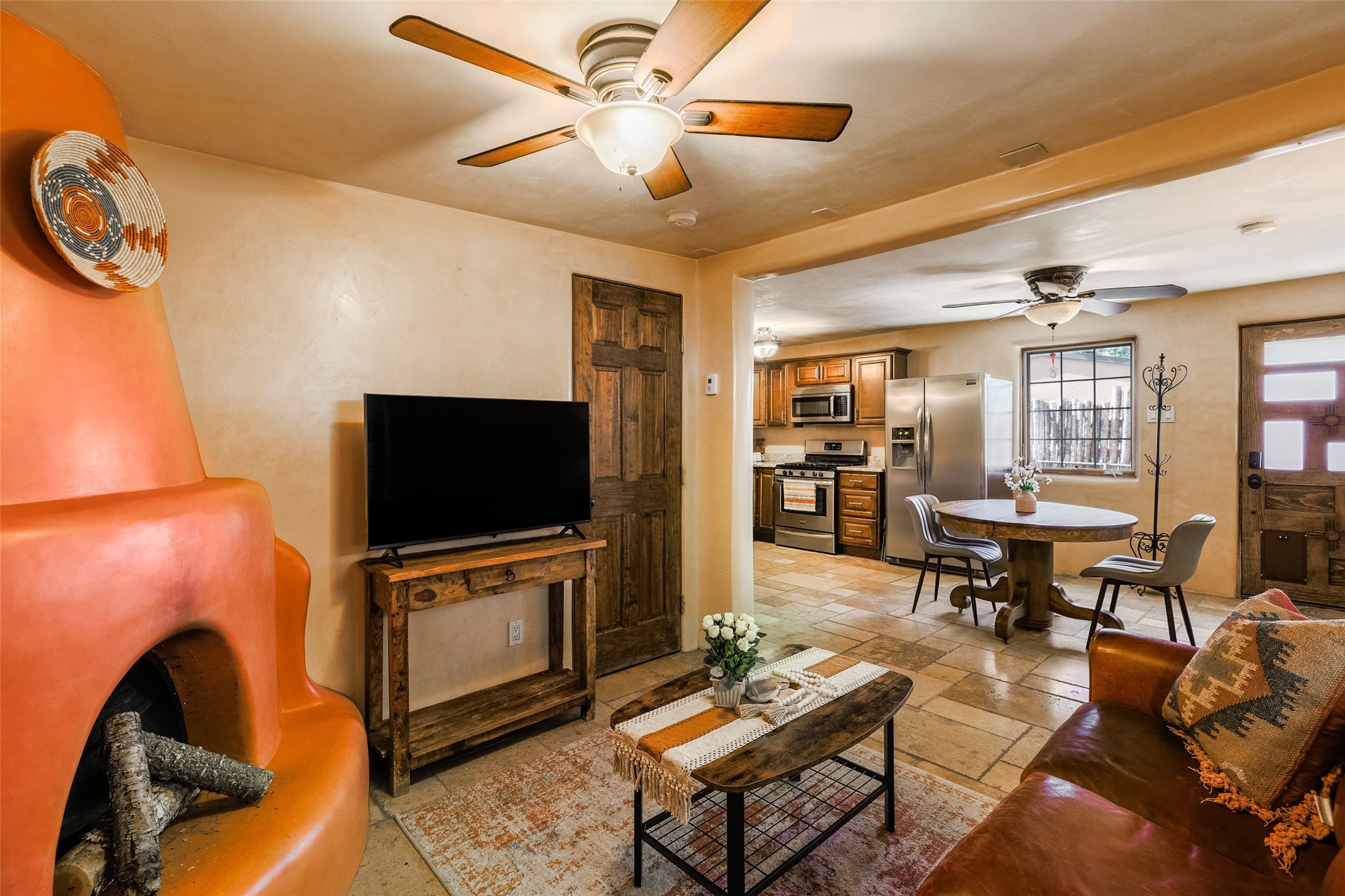 Charming Casita in the Heart of Santa Fe's Guadalupe Historic DistrictWalk to the Plaza | 1 Bed | 1 Bath | Private Courtyard | Off-Street ParkingLocated at the end of a quiet lane in the desirable Guadalupe Historic District, this beautifully updated 1BD/1BA casita offers classic Santa Fe charm, modern amenities, and an unbeatable walkable location. Just 0.8 miles from the Plaza, minutes from the Railyard, Canyon Road, markets, and top restaurants, it's ideal as a turn-key vacation getaway or a low-maintenance home.This property may also be suitable for short-term rental use, subject to the buyer obtaining all necessary permits and adhering to the City of Santa Fe's current short-term rental ordinances, which are subject to specific limitations and requirements.Enter through a serene flagstone courtyard with coyote fencing and a custom sail canopy for shade from the desert sun. A hand-carved front door with Zia symbols welcomes you into a warm, inviting interior featuring a wood-burning Kiva fireplace, hand-troweled diamond plaster walls, and radiant-heated stone floors. Ductless A/C and a recently updated tar and gravel roof add year-year comfort and peace of mind.The kitchen is equipped with stainless steel appliances, granite countertops, and ample storage. The updated bathroom includes a hammered copper vessel sink and custom vanity.Enjoy two private outdoor spaces--a front courtyard and a back patio. Don't miss the hand-painted mountain mural tucked away on the stucco wall, adding a unique artistic touch.Rare for downtown, this home includes two off-street parking spaces, enhancing its convenience and value. Plus, the unbeatable walkability lets you leave the car behind and enjoy everything Santa Fe has to offer on foot.
