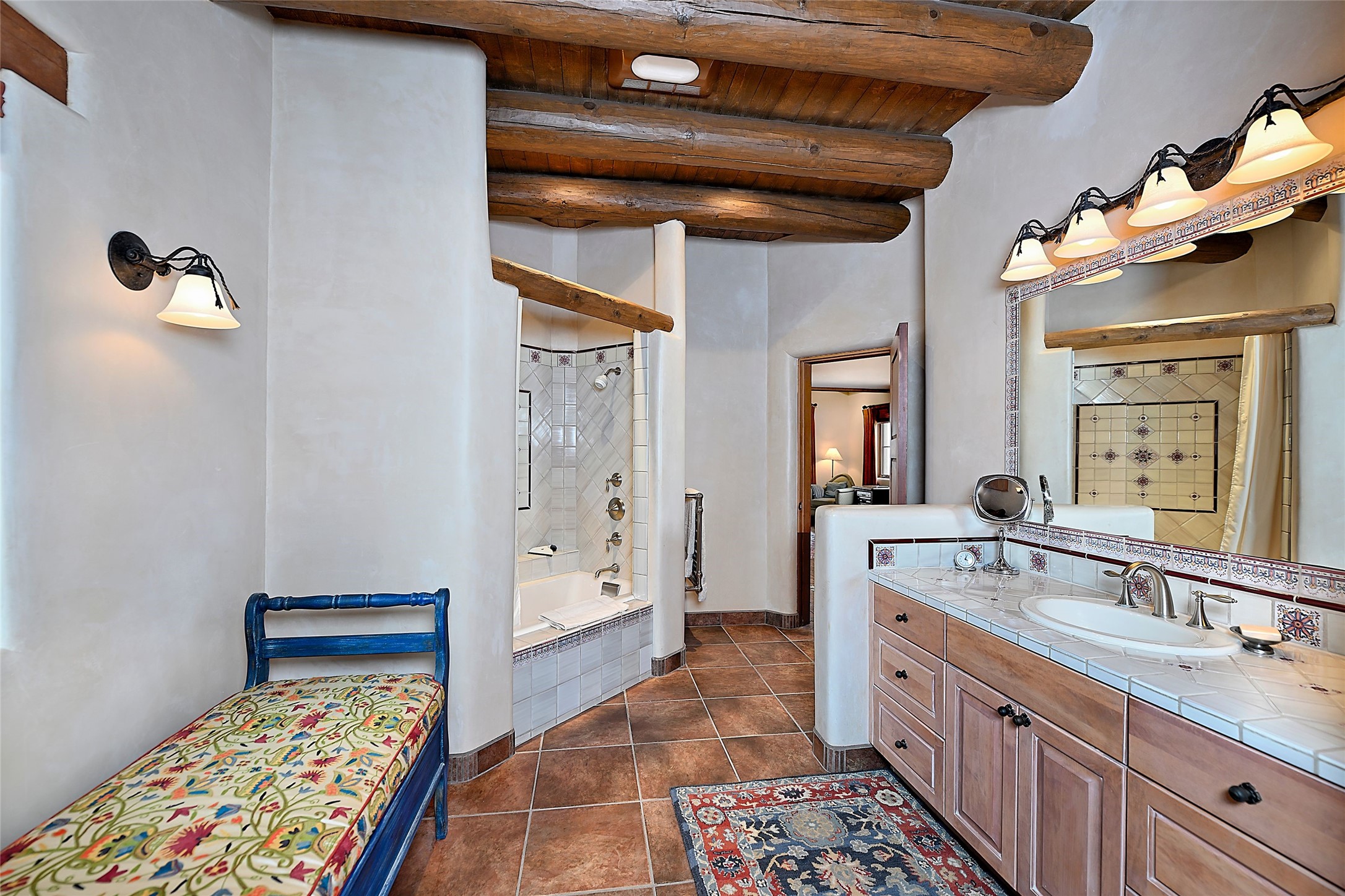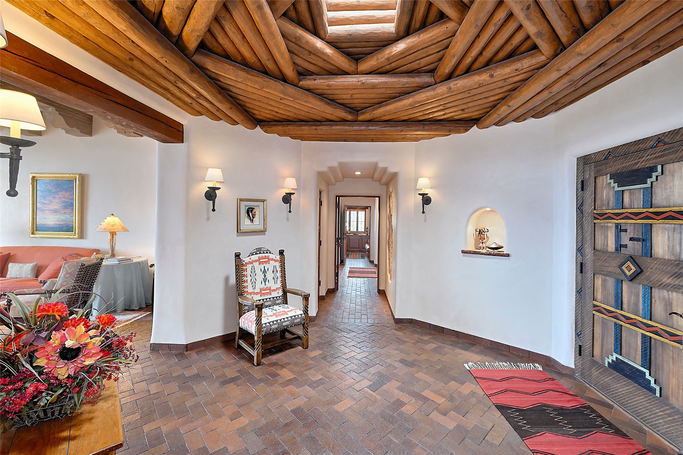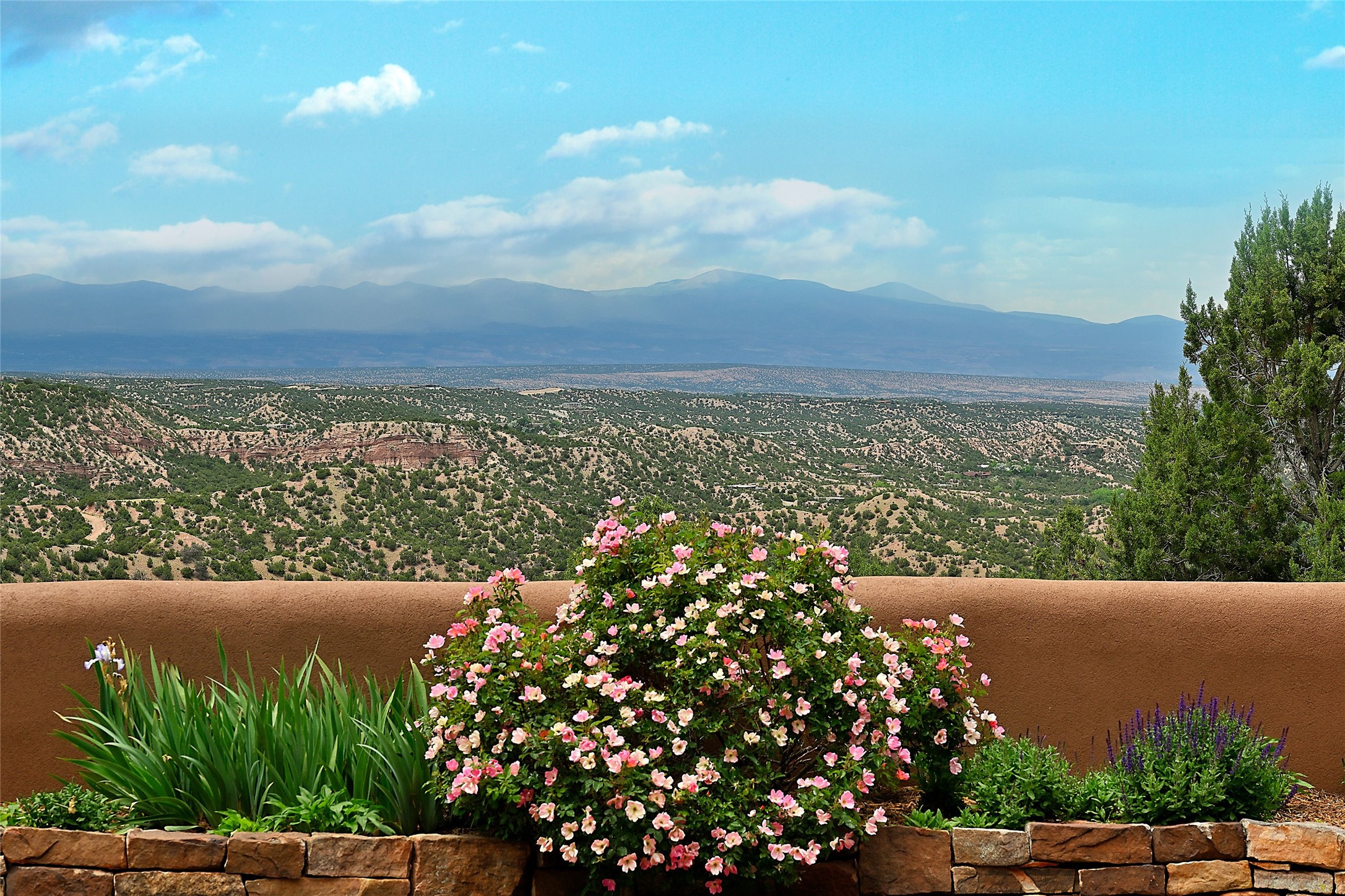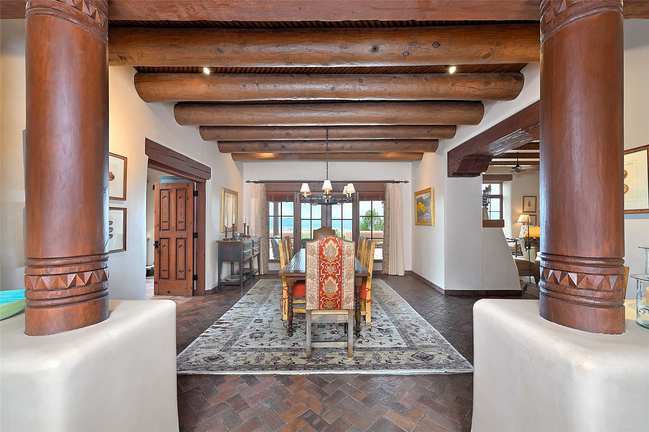 A true masterpiece of Spanish Pueblo architecture, this exceptional residence in Bishop's Lodge Hills is a stunning collaboration between acclaimed architect Ed Boniface and master builder Will Prull. Designed and constructed in 2007 for the current owner, with meticulous attention to detail, this home seamlessly blends traditional craftsmanship with modern luxury, all while capturing commanding views of the surrounding mountains and breathtaking sunsets. Upon entering the foyer, guests are enveloped in a space inspired by the sacred geometry of a Navajo Hogan, setting the tone for the rich architectural heritage woven throughout the home. The grand living room boasts soaring beamed ceilings supported by hand-carved corbels, while a striking fireplace design--borrowed from ancient traditions--serves as a warm and welcoming focal point. The formal dining area opens gracefully onto the Grand Portal, which leads to an expansive rooftop deck, offering panoramic vistas that define Santa Fe's unparalleled beauty. The chef's kitchen is a showpiece of authenticity and elegance, featuring antiqued custom cabinetry, classic tile countertops and custom carved backsplashes, and top-of-the-line Viking Stainless appliances. At its heart sits a black walnut-topped center island--both functional and visually stunning--complemented by an adjacent breakfast room that overlooks the walled entry courtyard, creating an intimate space for morning gatherings. The luxurious primary suite is a retreat unto itself, complete with a charming gas Kiva fireplace, two spa-like baths, and two walk-in closets. A separate office, situated within the primary wing, provides the perfect setting for focus and creativity. On the opposite wing, comfortable guest suites ensure privacy and tranquility, making this home an ideal sanctuary for both residents and visitors alike. Every aspect of this home's design and construction reflects an extraordinary commitment to craftsmanship, authenticity, and architectural excellence.