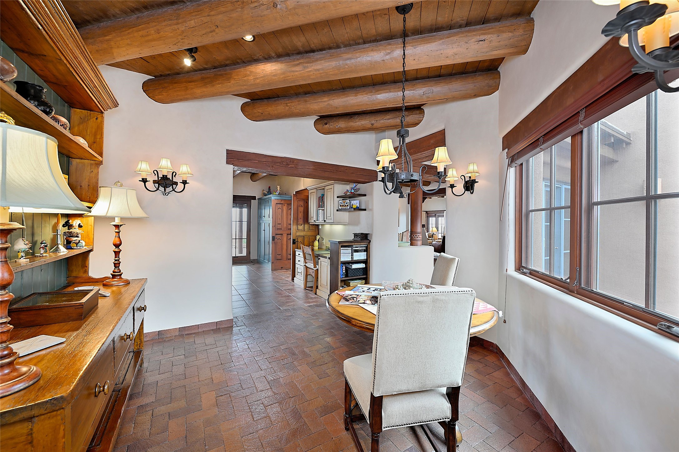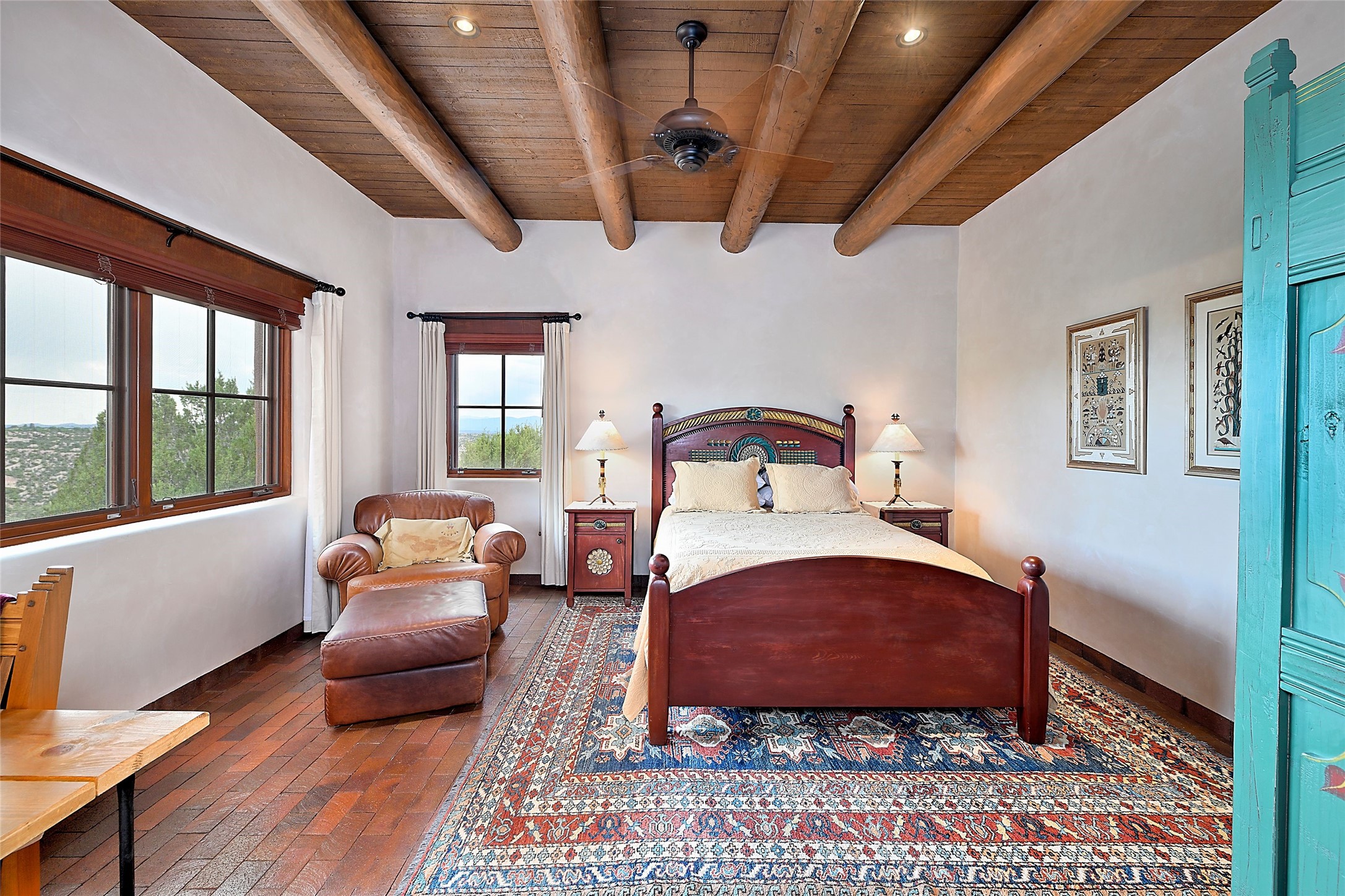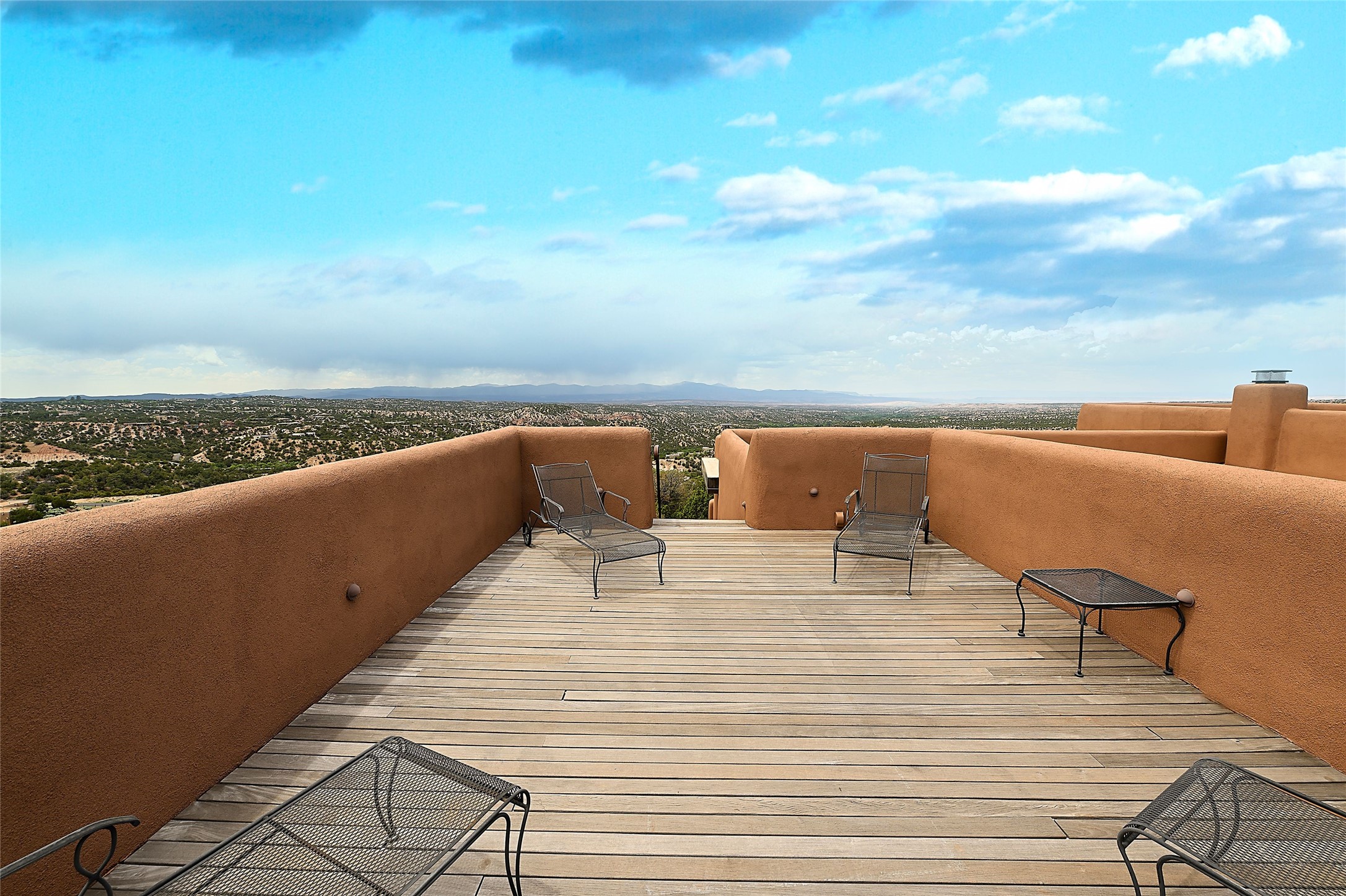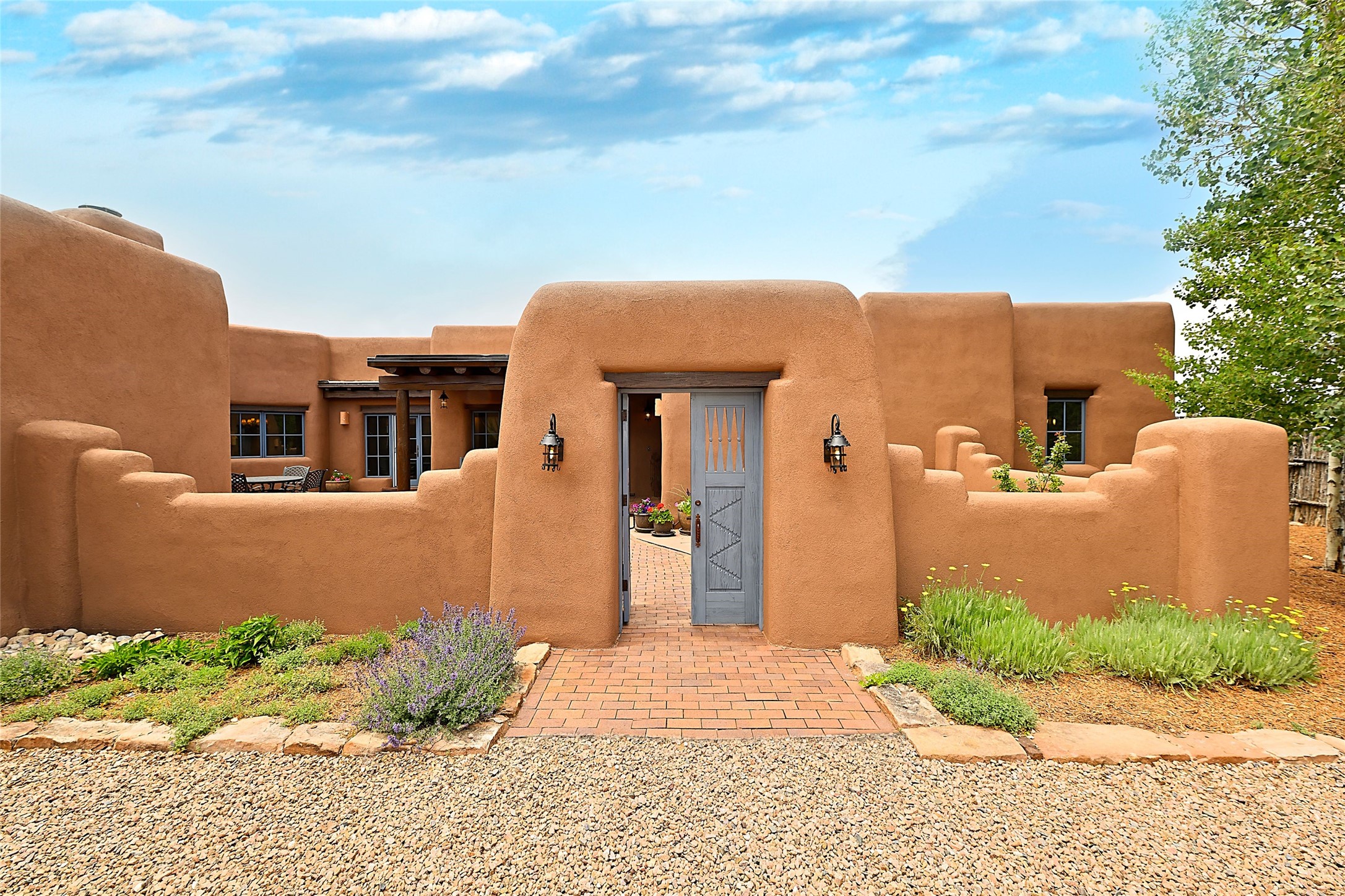 A true masterpiece of Spanish Pueblo architecture, this exceptional residence in Bishop's Lodge Hills is a stunning collaboration between acclaimed architect Ed Boniface and master builder Will Prull. Designed and constructed in 2007 for the current owner, with meticulous attention to detail, this home seamlessly blends traditional craftsmanship with modern luxury, all while capturing commanding views of the surrounding mountains and breathtaking sunsets. Upon entering the foyer, guests are enveloped in a space inspired by the sacred geometry of a Navajo Hogan, setting the tone for the rich architectural heritage woven throughout the home. The grand living room boasts soaring beamed ceilings supported by hand-carved corbels, while a striking fireplace design--borrowed from ancient traditions--serves as a warm and welcoming focal point. The formal dining area opens gracefully onto the Grand Portal, which leads to an expansive rooftop deck, offering panoramic vistas that define Santa Fe's unparalleled beauty. The chef's kitchen is a showpiece of authenticity and elegance, featuring antiqued custom cabinetry, classic tile countertops and custom carved backsplashes, and top-of-the-line Viking Stainless appliances. At its heart sits a black walnut-topped center island--both functional and visually stunning--complemented by an adjacent breakfast room that overlooks the walled entry courtyard, creating an intimate space for morning gatherings. The luxurious primary suite is a retreat unto itself, complete with a charming gas Kiva fireplace, two spa-like baths, and two walk-in closets. A separate office, situated within the primary wing, provides the perfect setting for focus and creativity. On the opposite wing, comfortable guest suites ensure privacy and tranquility, making this home an ideal sanctuary for both residents and visitors alike. Every aspect of this home's design and construction reflects an extraordinary commitment to craftsmanship, authenticity, and architectural excellence.