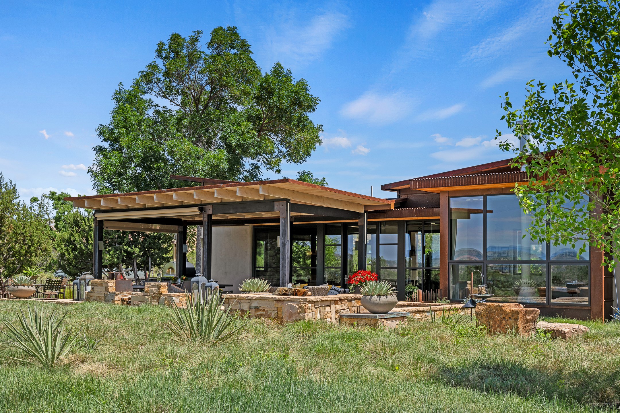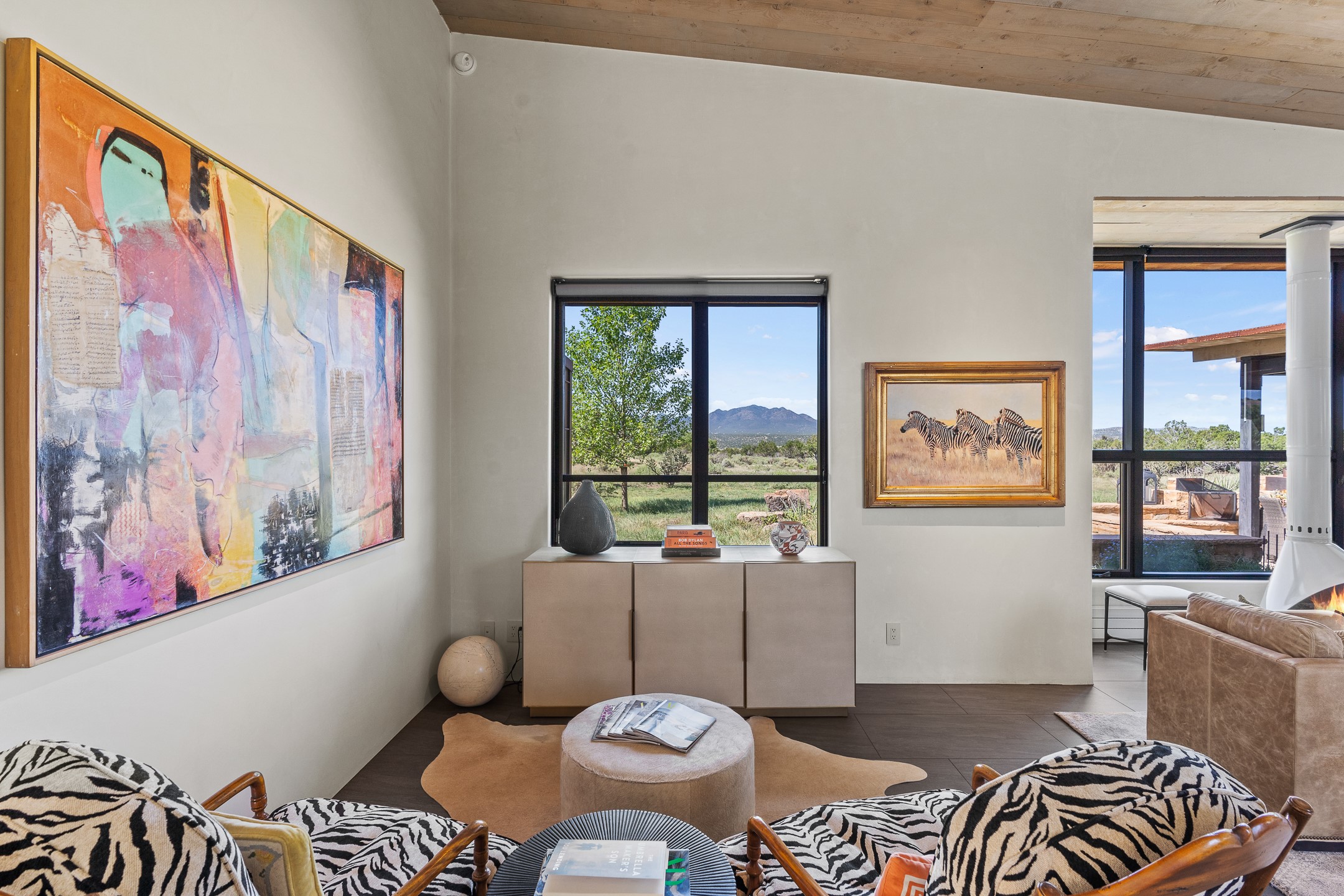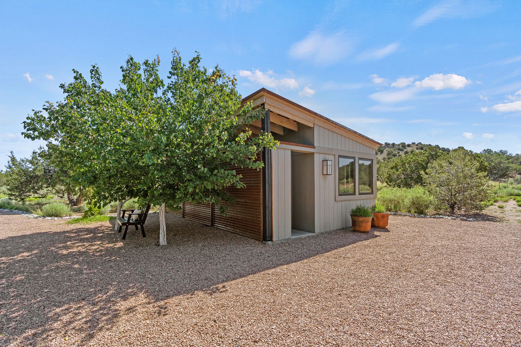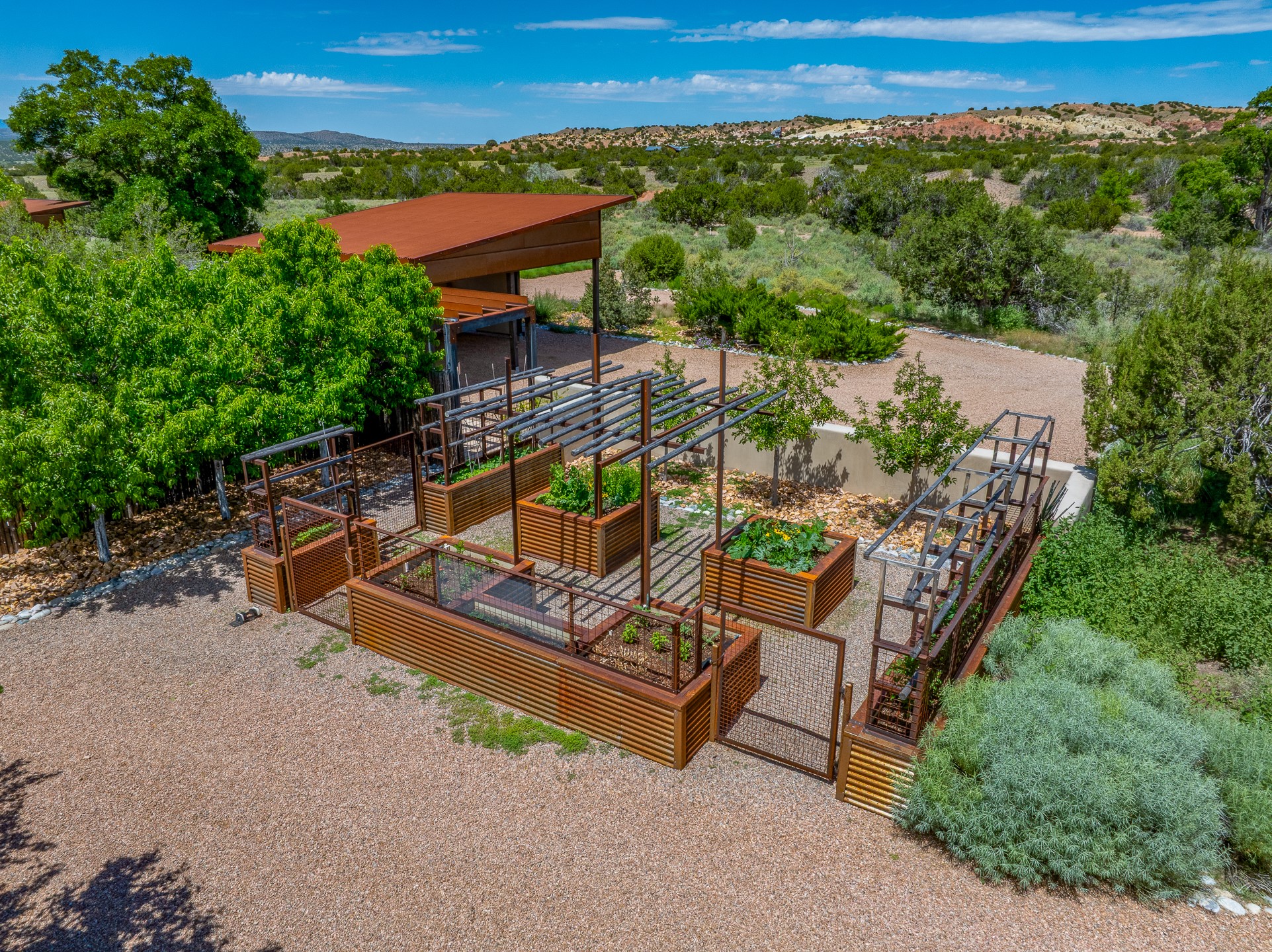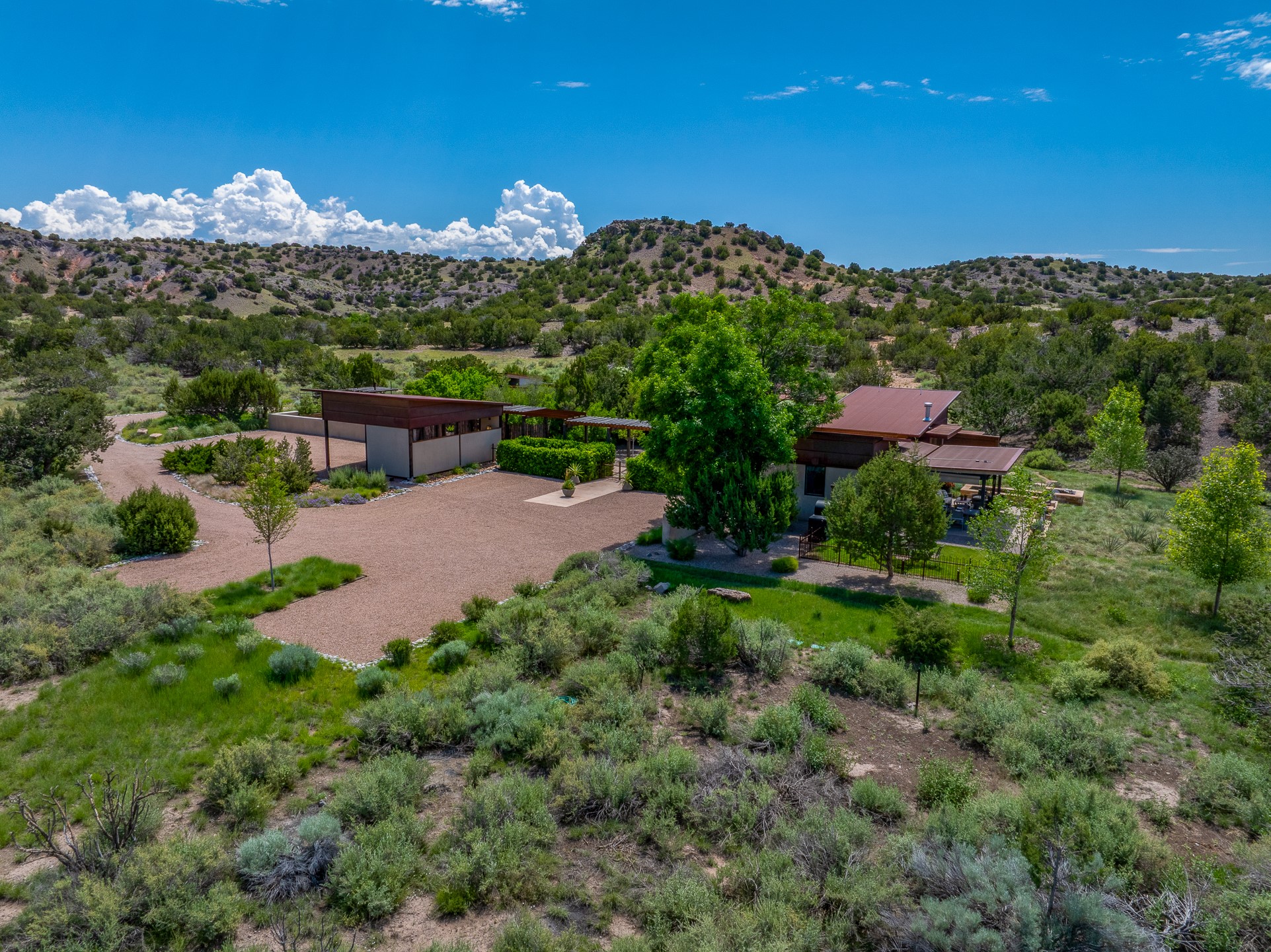 Architect-Designed Sanctuary on 44 Acres with Sweeping Ortiz Mountain ViewsSet on 44 pristine acres in the heart of Garden of the Gods rock formations, this architect-designed home is a striking fusion of form, function, and landscape. Completed in 2019 by its architect-owners, the residence reflects a deep sensitivity to place - modern in its lines, yet timeless in its connection to the land and its mesmerizing views of the Ortiz Mountains.The layout offers both simplicity and flexibility, with two bedrooms and a third space perfectly suited for a guest suite, office, or creative studio. Every detail is intentional--custom built-ins and integrated storage maintain clean lines without sacrificing utility. Expansive ceilings and precisely placed windows draw in natural light and frame breathtaking panoramas from nearly every room. The chef's kitchen is a showpiece of design and performance, anchored by a La Cornue range, Sub-Zero refrigerator and freezer, and Miele dishwasher. Raked German oak cabinetry and honed Taj Mahal marble countertops offer a warm, sculptural backdrop for both cooking and gathering. The primary suite is a peaceful retreat, complete with a spa-like bath featuring a Caldara salt-water hot tub, a custom walnut vanity with black Caesarstone counters, and a beautifully crafted walk-in shower. Seamless indoor-outdoor living defines the home. A welcoming entry courtyard, stone patios and covered areas extend the living space, perfectly oriented for sunrise coffee and sunset gatherings. A custom water feature adds a meditative element and is fed by a 12,000 gallon rain-catchment system that also supports the landscaping and garden irrigation. A 52-inch propane firepit, built-in pizza oven, and drought-tolerant yet lush landscaping complete the inviting feel of the exterior spaces. A 21 gal/min private well ensures abundant, high-quality water. A fenced and irrigated raised-bed vegetable garden/orchard and equipment/tractor workshop are adjacent to the 2 car carport (with EV car charger). The perimeter of the acreage is fenced and offers a perfect setting for equestrian facilities, including over two miles of scenic private riding/hiking trails that wind through rolling high desert terrain. An adjacent 20 acre parcel is also available for those seeking even more space and privacy. Rarely does a property of this architectural caliber and ecological sensitivity come to market. This is an extraordinary opportunity to own a soulful, design-forward retreat in one of Northern New Mexico's most scenic and serene settings. Only 10 minutes to Madrid and 20 minutes to Santa Fe.