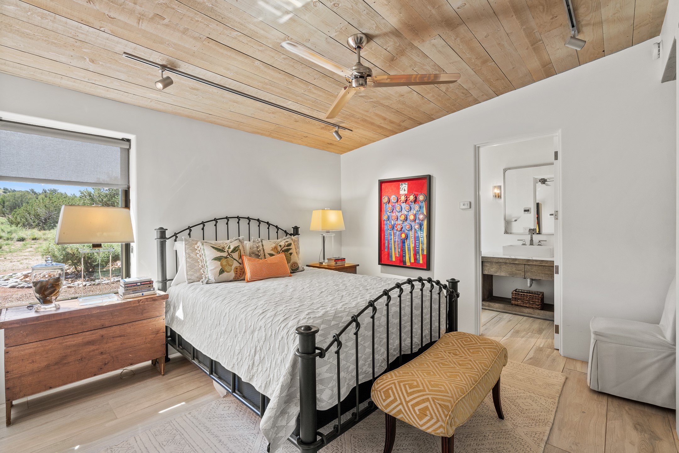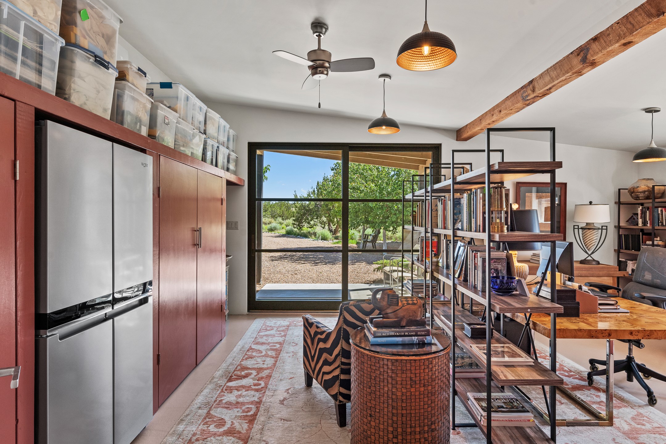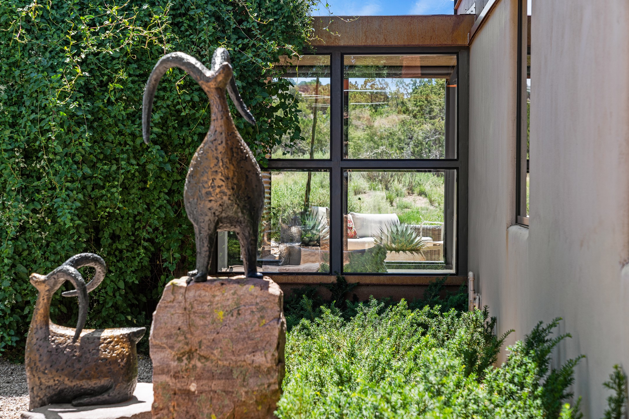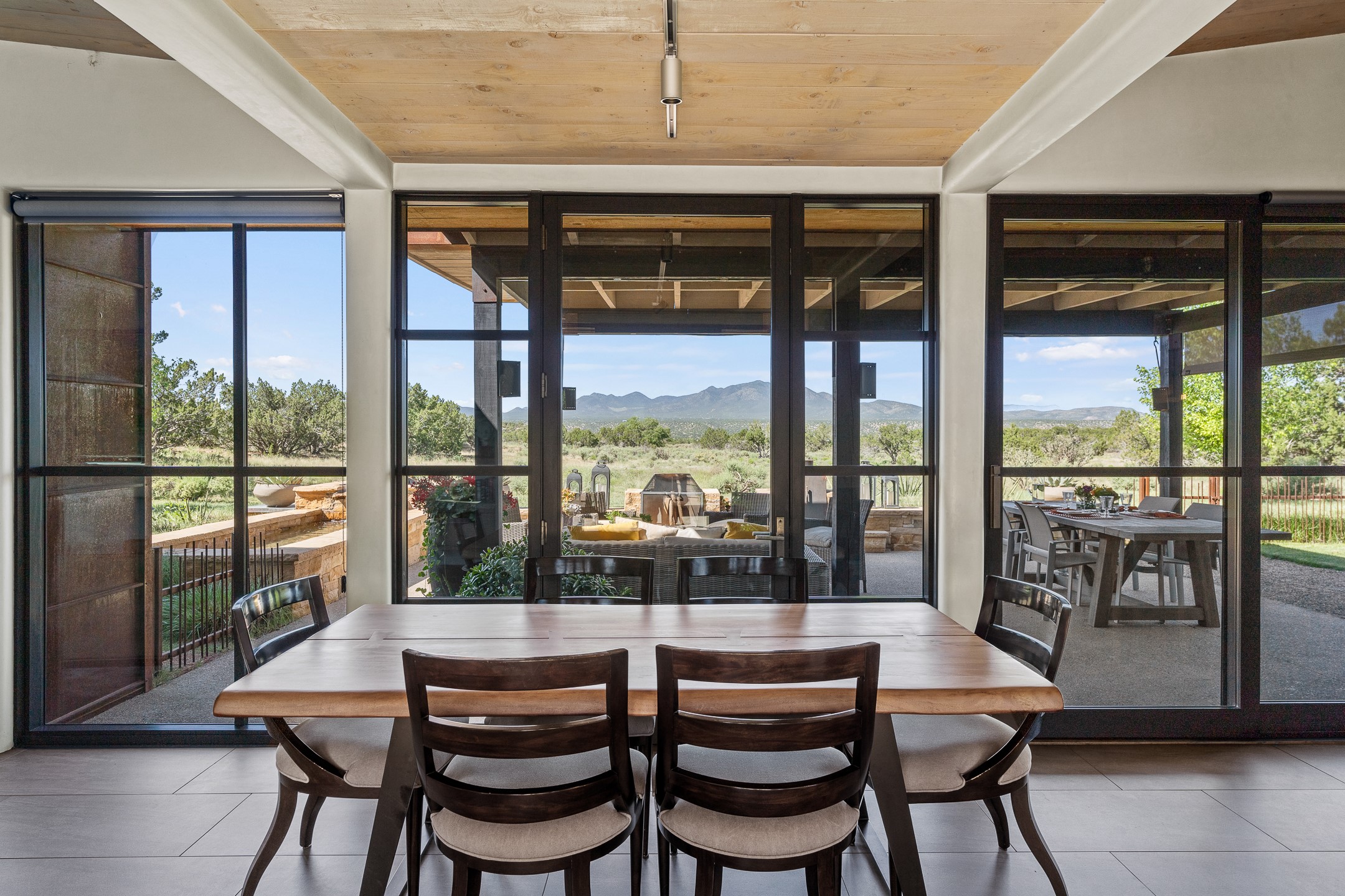 Architect-Designed Sanctuary on 44 Acres with Sweeping Ortiz Mountain ViewsSet on 44 pristine acres in the heart of Garden of the Gods rock formations, this architect-designed home is a striking fusion of form, function, and landscape. Completed in 2019 by its architect-owners, the residence reflects a deep sensitivity to place - modern in its lines, yet timeless in its connection to the land and its mesmerizing views of the Ortiz Mountains.The layout offers both simplicity and flexibility, with two bedrooms and a third space perfectly suited for a guest suite, office, or creative studio. Every detail is intentional--custom built-ins and integrated storage maintain clean lines without sacrificing utility. Expansive ceilings and precisely placed windows draw in natural light and frame breathtaking panoramas from nearly every room. The chef's kitchen is a showpiece of design and performance, anchored by a La Cornue range, Sub-Zero refrigerator and freezer, and Miele dishwasher. Raked German oak cabinetry and honed Taj Mahal marble countertops offer a warm, sculptural backdrop for both cooking and gathering. The primary suite is a peaceful retreat, complete with a spa-like bath featuring a Caldara salt-water hot tub, a custom walnut vanity with black Caesarstone counters, and a beautifully crafted walk-in shower. Seamless indoor-outdoor living defines the home. A welcoming entry courtyard, stone patios and covered areas extend the living space, perfectly oriented for sunrise coffee and sunset gatherings. A custom water feature adds a meditative element and is fed by a 12,000 gallon rain-catchment system that also supports the landscaping and garden irrigation. A 52-inch propane firepit, built-in pizza oven, and drought-tolerant yet lush landscaping complete the inviting feel of the exterior spaces. A 21 gal/min private well ensures abundant, high-quality water. A fenced and irrigated raised-bed vegetable garden/orchard and equipment/tractor workshop are adjacent to the 2 car carport (with EV car charger). The perimeter of the acreage is fenced and offers a perfect setting for equestrian facilities, including over two miles of scenic private riding/hiking trails that wind through rolling high desert terrain. An adjacent 20 acre parcel is also available for those seeking even more space and privacy. Rarely does a property of this architectural caliber and ecological sensitivity come to market. This is an extraordinary opportunity to own a soulful, design-forward retreat in one of Northern New Mexico's most scenic and serene settings. Only 10 minutes to Madrid and 20 minutes to Santa Fe.