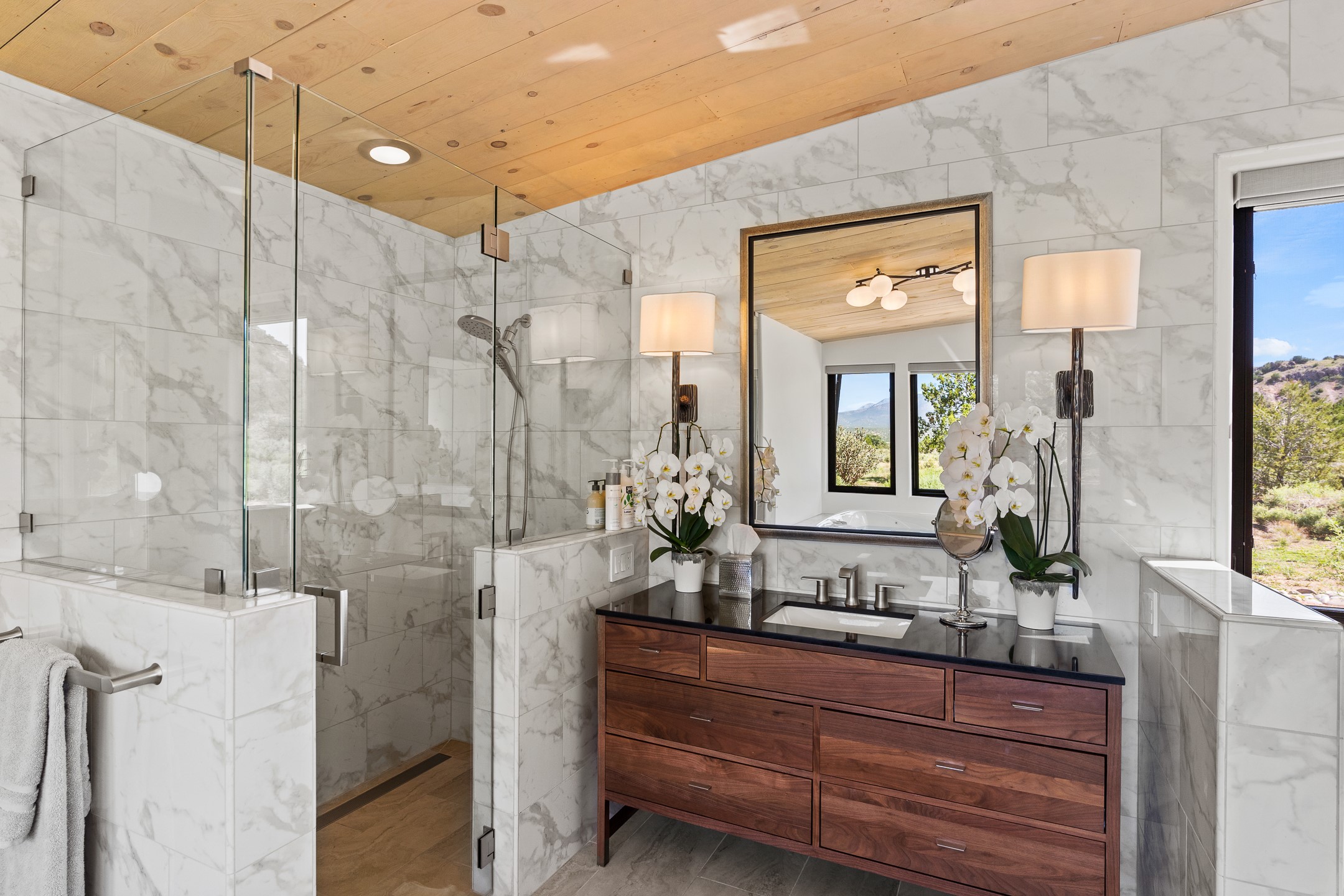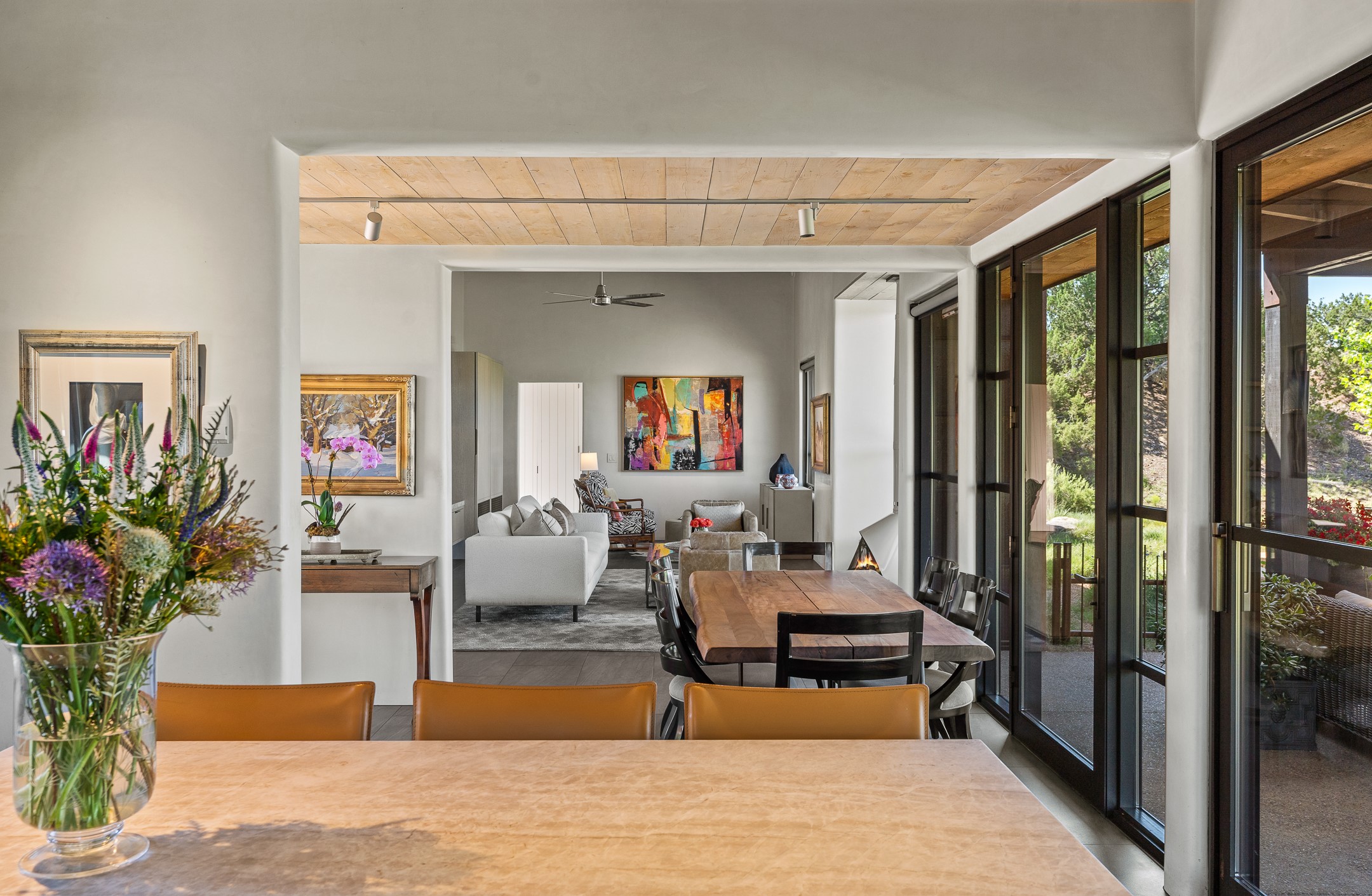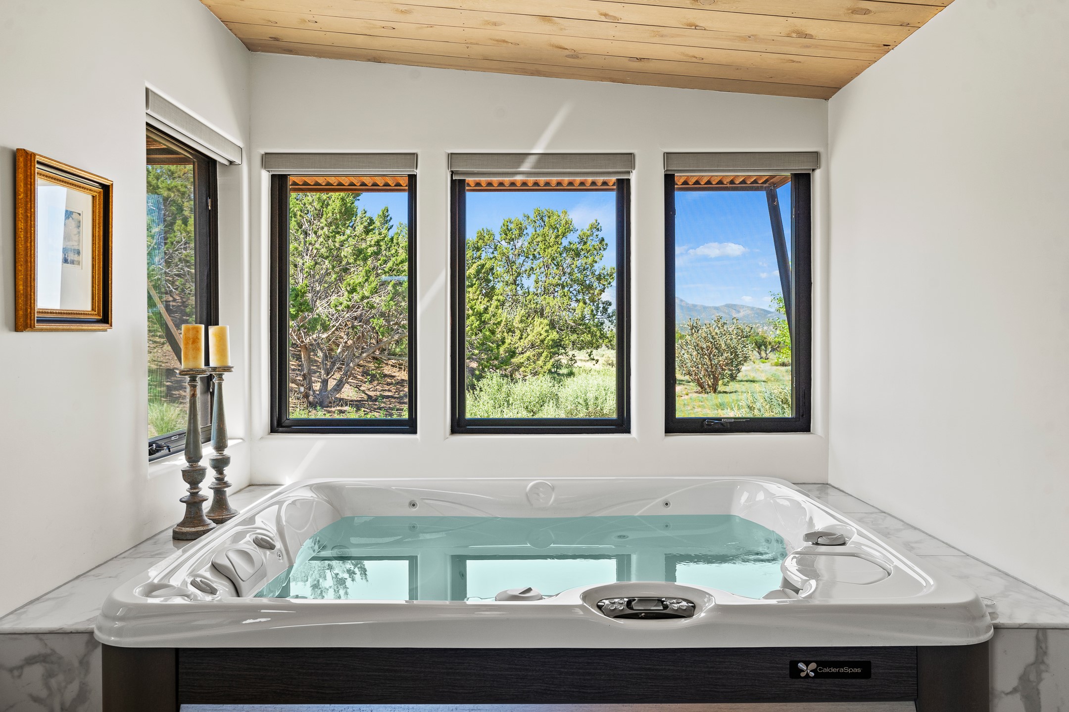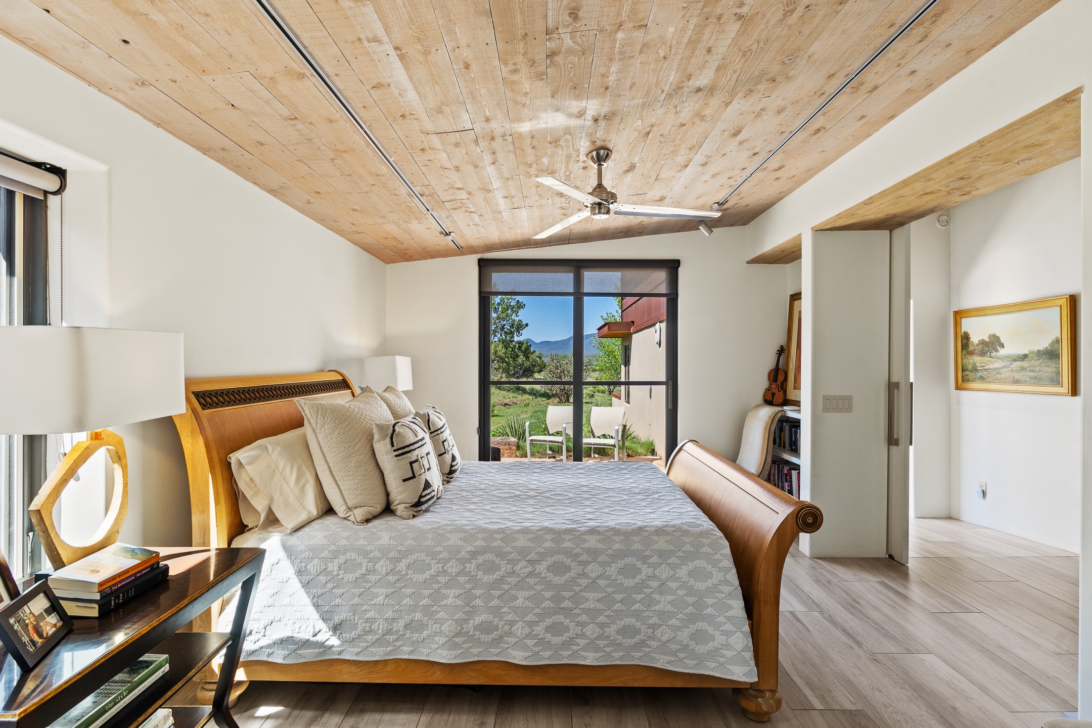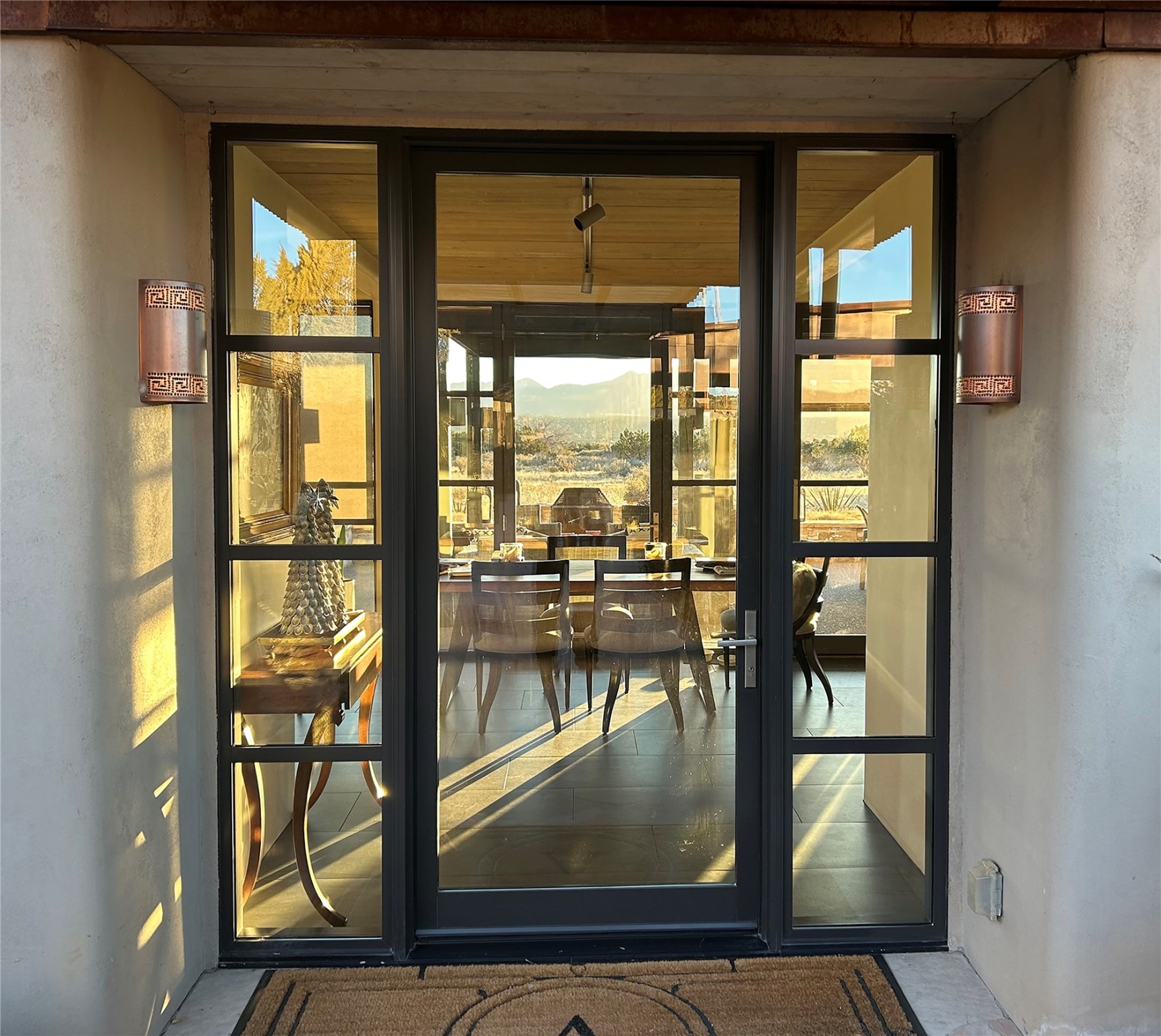 Architect-Designed Sanctuary on 44 Acres with Sweeping Ortiz Mountain ViewsSet on 44 pristine acres in the heart of Garden of the Gods rock formations, this architect-designed home is a striking fusion of form, function, and landscape. Completed in 2019 by its architect-owners, the residence reflects a deep sensitivity to place - modern in its lines, yet timeless in its connection to the land and its mesmerizing views of the Ortiz Mountains.The layout offers both simplicity and flexibility, with two bedrooms and a third space perfectly suited for a guest suite, office, or creative studio. Every detail is intentional--custom built-ins and integrated storage maintain clean lines without sacrificing utility. Expansive ceilings and precisely placed windows draw in natural light and frame breathtaking panoramas from nearly every room. The chef's kitchen is a showpiece of design and performance, anchored by a La Cornue range, Sub-Zero refrigerator and freezer, and Miele dishwasher. Raked German oak cabinetry and honed Taj Mahal marble countertops offer a warm, sculptural backdrop for both cooking and gathering. The primary suite is a peaceful retreat, complete with a spa-like bath featuring a Caldara salt-water hot tub, a custom walnut vanity with black Caesarstone counters, and a beautifully crafted walk-in shower. Seamless indoor-outdoor living defines the home. A welcoming entry courtyard, stone patios and covered areas extend the living space, perfectly oriented for sunrise coffee and sunset gatherings. A custom water feature adds a meditative element and is fed by a 12,000 gallon rain-catchment system that also supports the landscaping and garden irrigation. A 52-inch propane firepit, built-in pizza oven, and drought-tolerant yet lush landscaping complete the inviting feel of the exterior spaces. A 21 gal/min private well ensures abundant, high-quality water. A fenced and irrigated raised-bed vegetable garden/orchard and equipment/tractor workshop are adjacent to the 2 car carport (with EV car charger). The perimeter of the acreage is fenced and offers a perfect setting for equestrian facilities, including over two miles of scenic private riding/hiking trails that wind through rolling high desert terrain. An adjacent 20 acre parcel is also available for those seeking even more space and privacy. Rarely does a property of this architectural caliber and ecological sensitivity come to market. This is an extraordinary opportunity to own a soulful, design-forward retreat in one of Northern New Mexico's most scenic and serene settings. Only 10 minutes to Madrid and 20 minutes to Santa Fe.