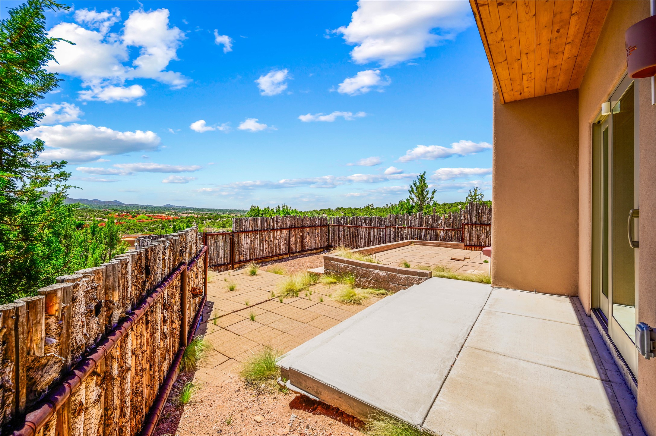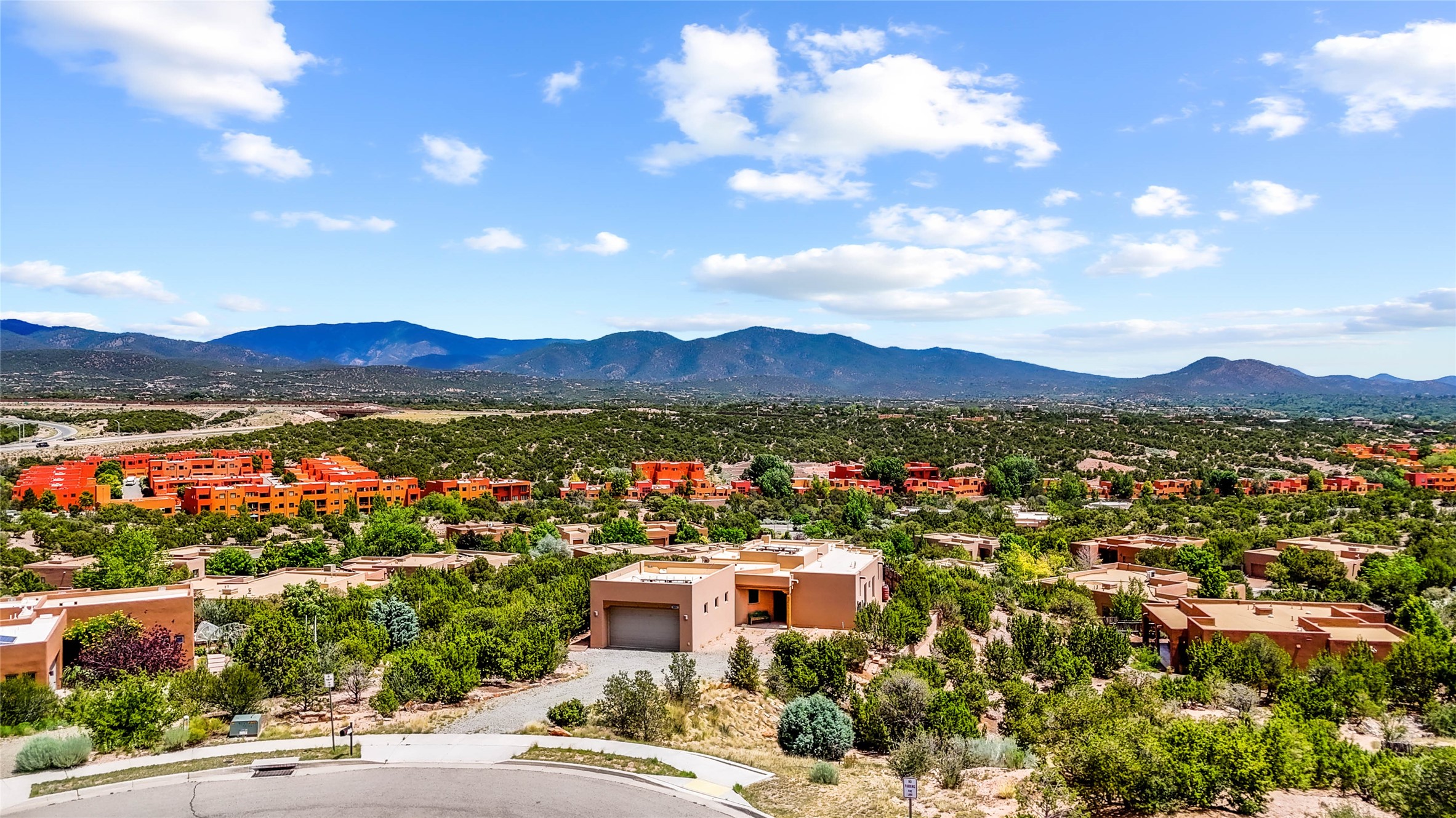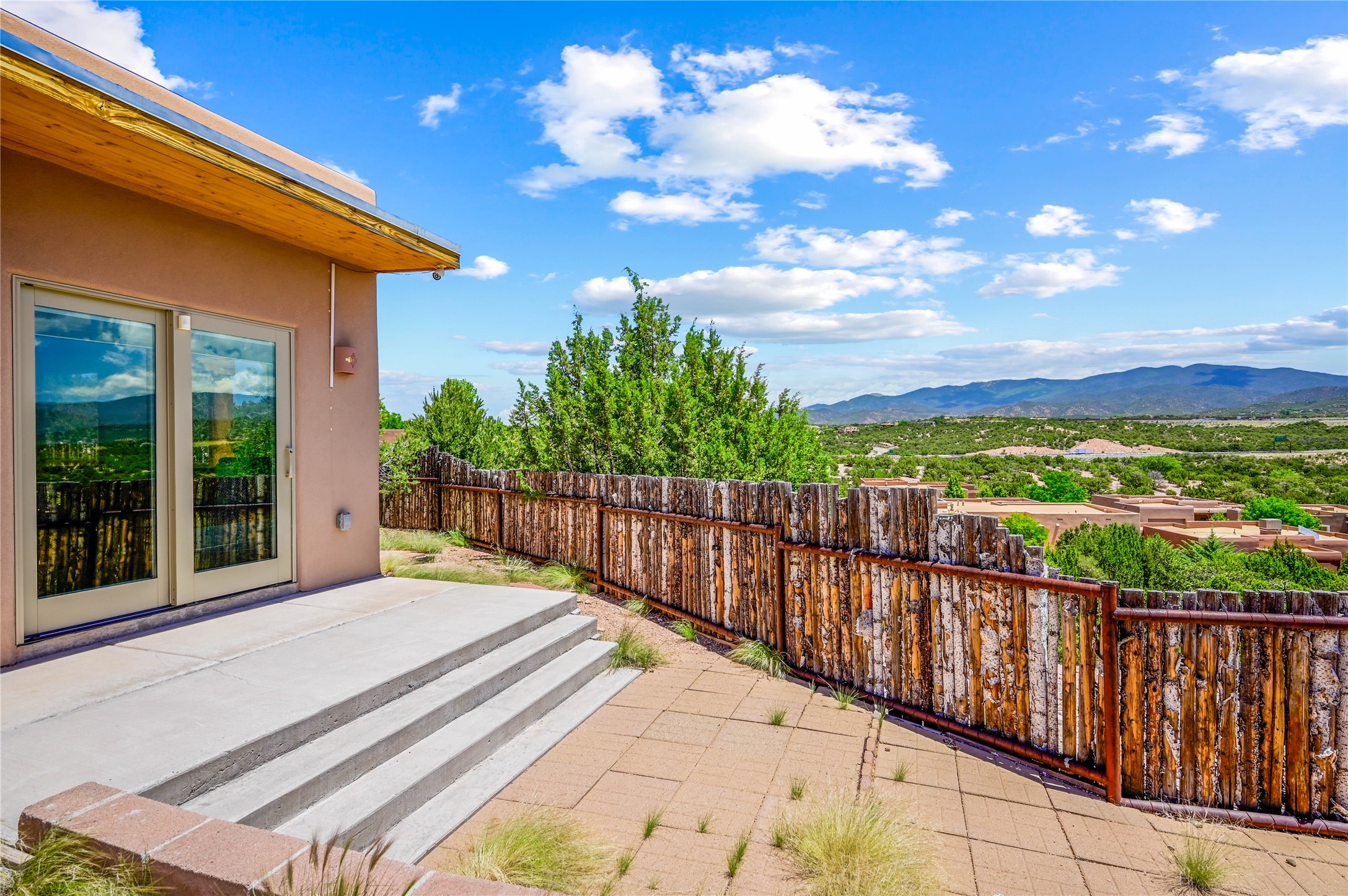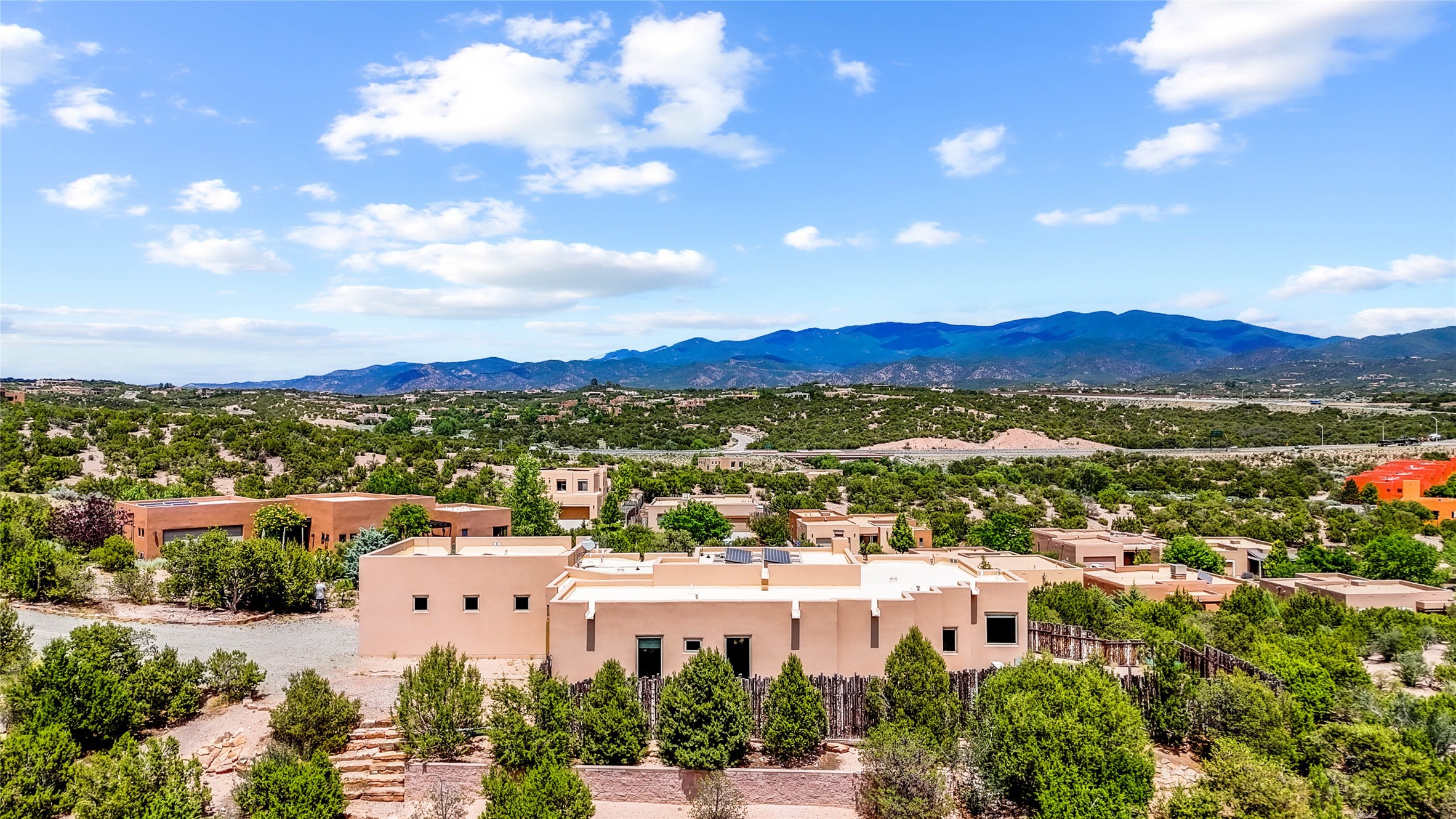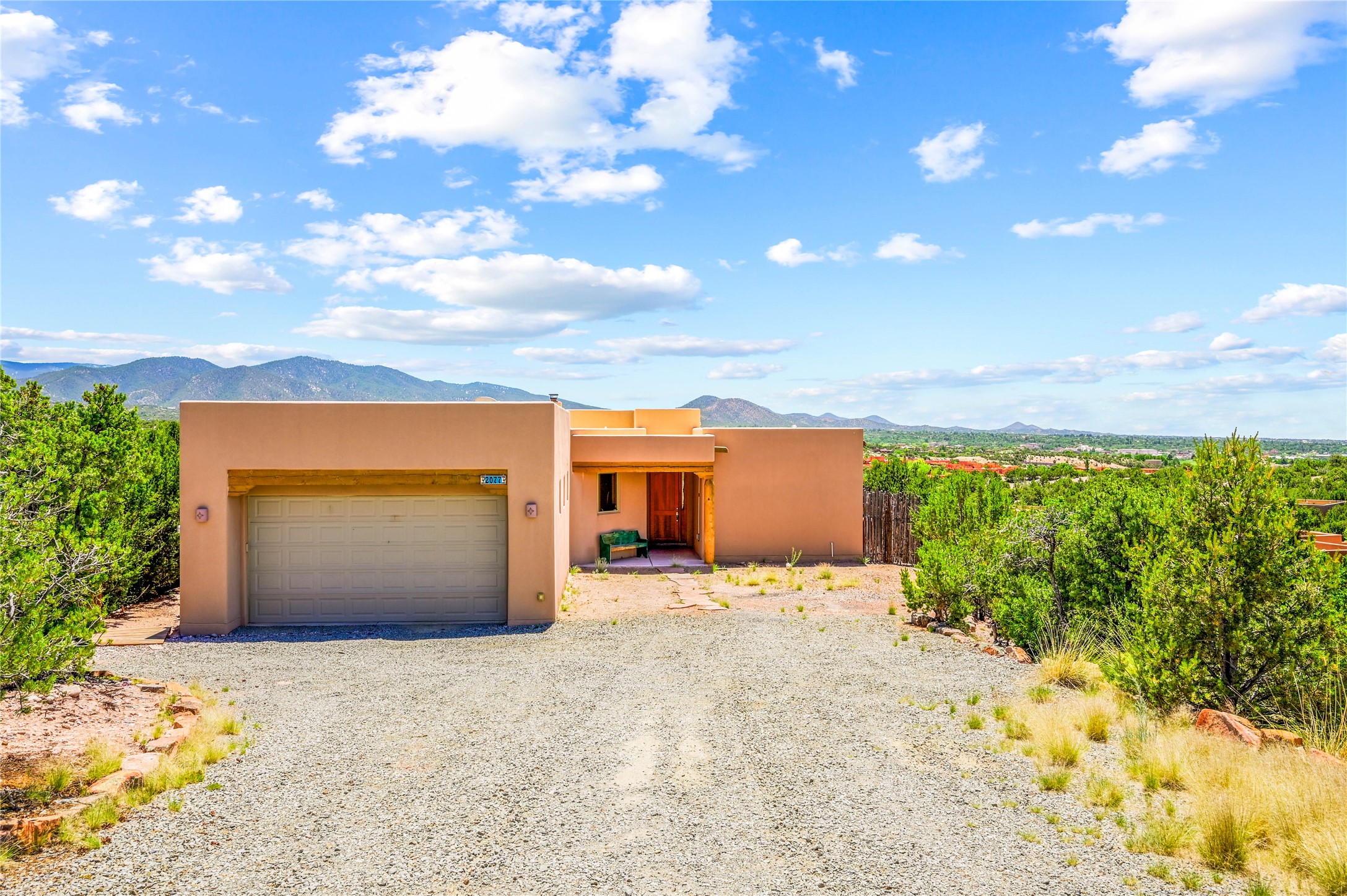 Perched at the top of the desirable Pion Bluffs subdivision, this charming three-bedroom, two-bath contemporary home offers breathtaking views of the Sangre de Cristos. Ideally located with easy access to downtown Santa Fe, Albuquerque, and Los Alamos, this home is perfect for those seeking both convenience and a great Santa fe vibe. The open-concept kitchen and dining area flow seamlessly onto a spacious outdoor patio--an ideal setting for entertaining or enjoying spectacular mountain sunsets. The inviting living room features a wood-burning fireplace, creating a cozy space for gathering. The primary suite includes a lovely en suite bath and French doors that open onto a private yard and patio, perfect for morning coffee with a view. Just minutes from Santa Fe's vibrant Plaza, you'll have quick access to summer markets, live music, and all the cultural richness the city has to offer. Owned solar panels (not leased) offer the next owner the benefit of reduced electric bills and energy independence. Don't miss this opportunity to own a beautifully situated home with comfort, style, and unbeatable views.