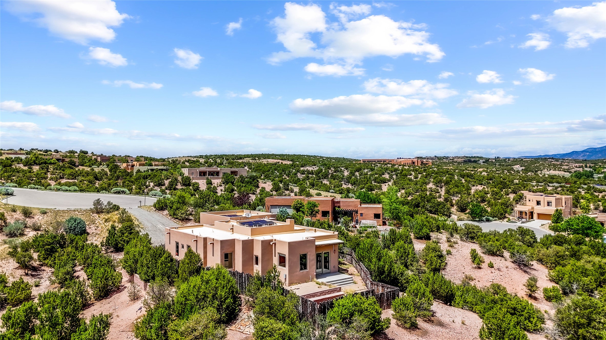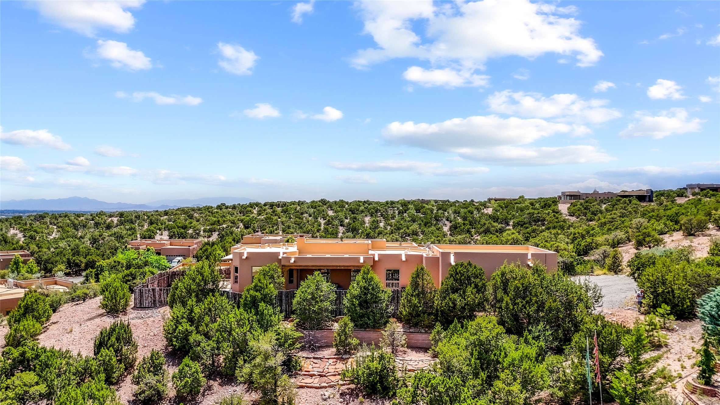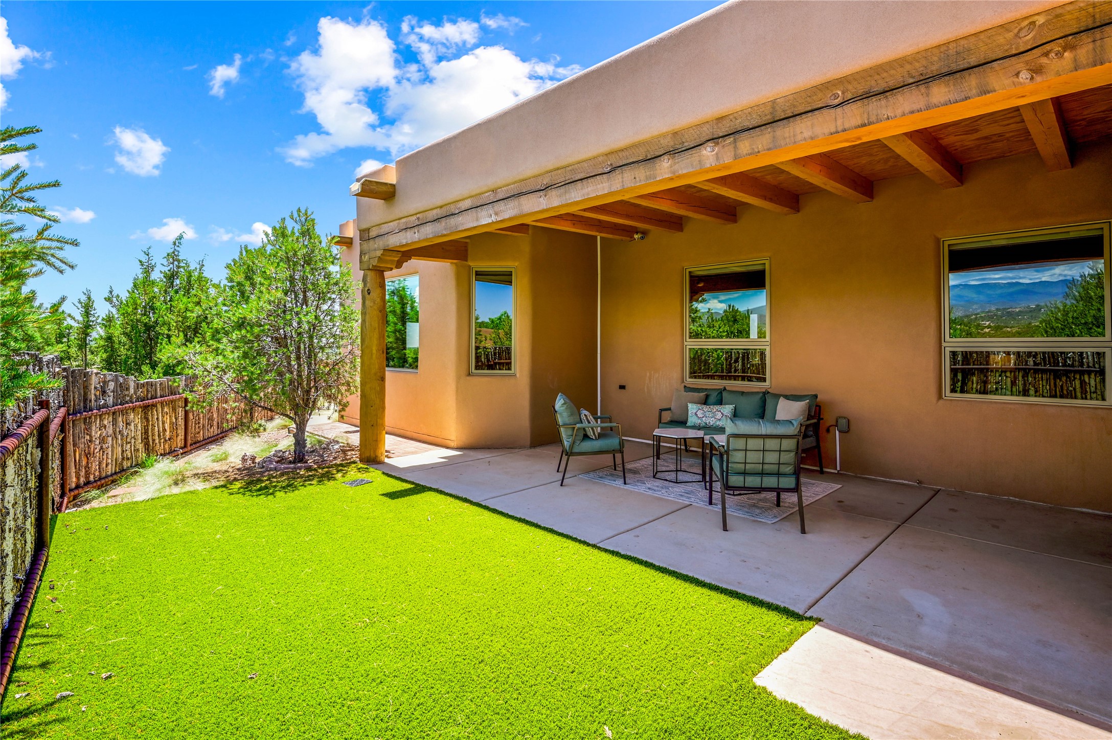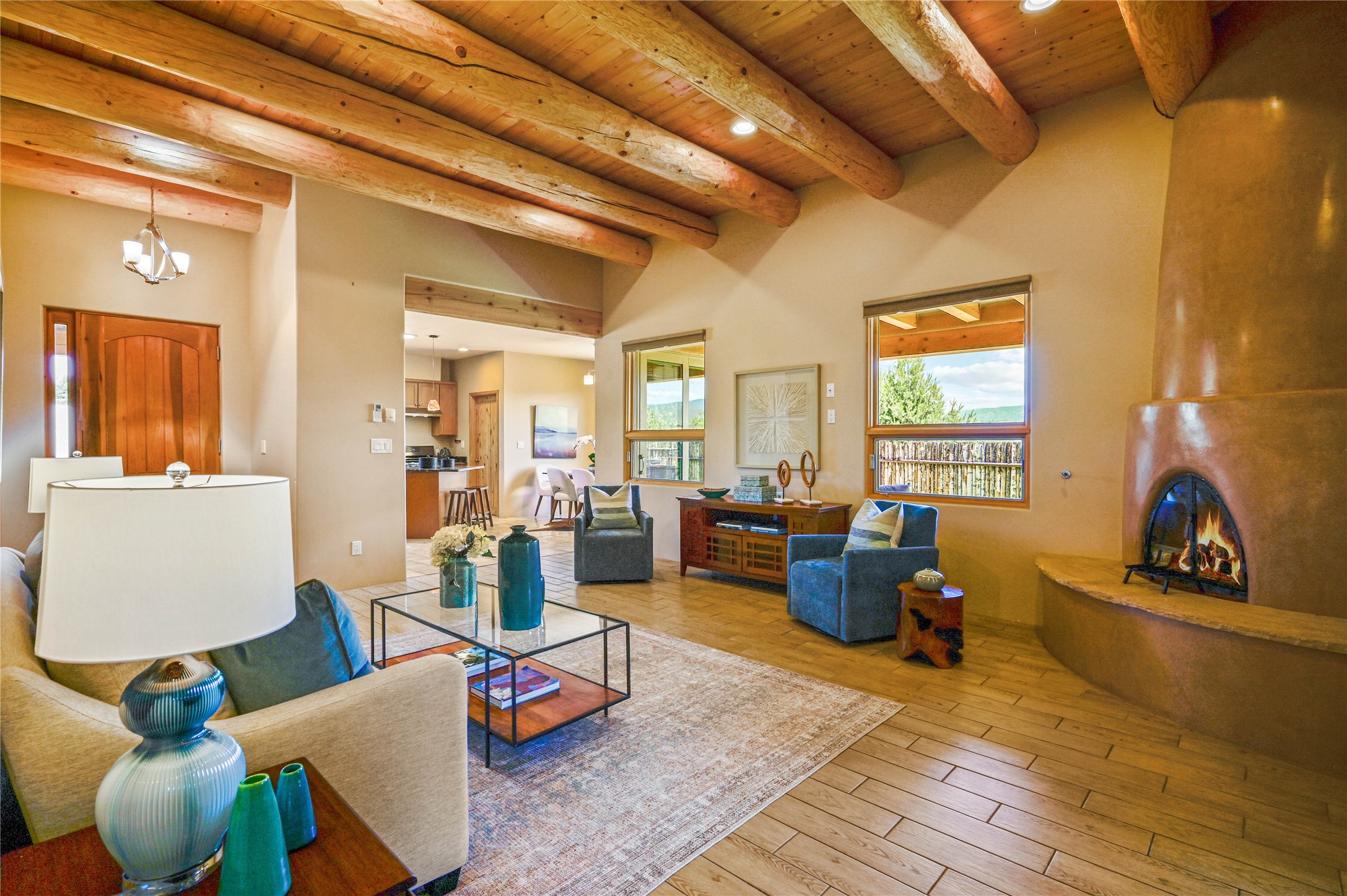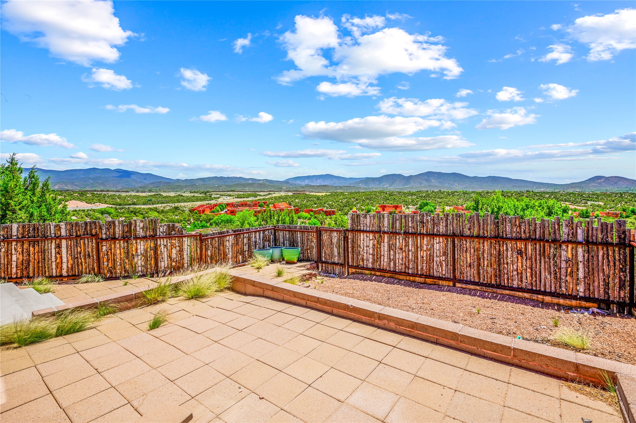 Perched at the top of the desirable Pion Bluffs subdivision, this charming three-bedroom, two-bath contemporary home offers breathtaking views of the Sangre de Cristos. Ideally located with easy access to downtown Santa Fe, Albuquerque, and Los Alamos, this home is perfect for those seeking both convenience and a great Santa fe vibe. The open-concept kitchen and dining area flow seamlessly onto a spacious outdoor patio--an ideal setting for entertaining or enjoying spectacular mountain sunsets. The inviting living room features a wood-burning fireplace, creating a cozy space for gathering. The primary suite includes a lovely en suite bath and French doors that open onto a private yard and patio, perfect for morning coffee with a view. Just minutes from Santa Fe's vibrant Plaza, you'll have quick access to summer markets, live music, and all the cultural richness the city has to offer. Owned solar panels (not leased) offer the next owner the benefit of reduced electric bills and energy independence. Don't miss this opportunity to own a beautifully situated home with comfort, style, and unbeatable views.