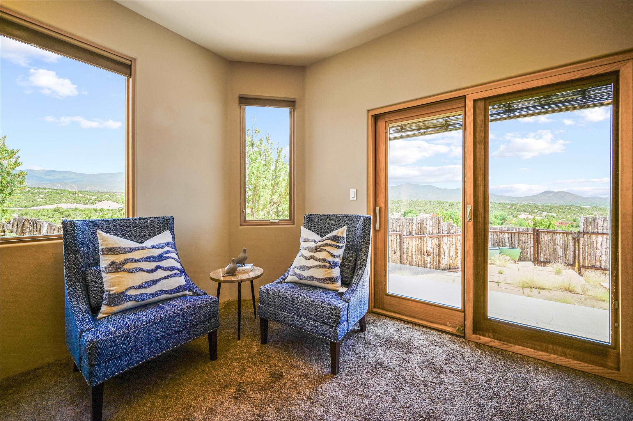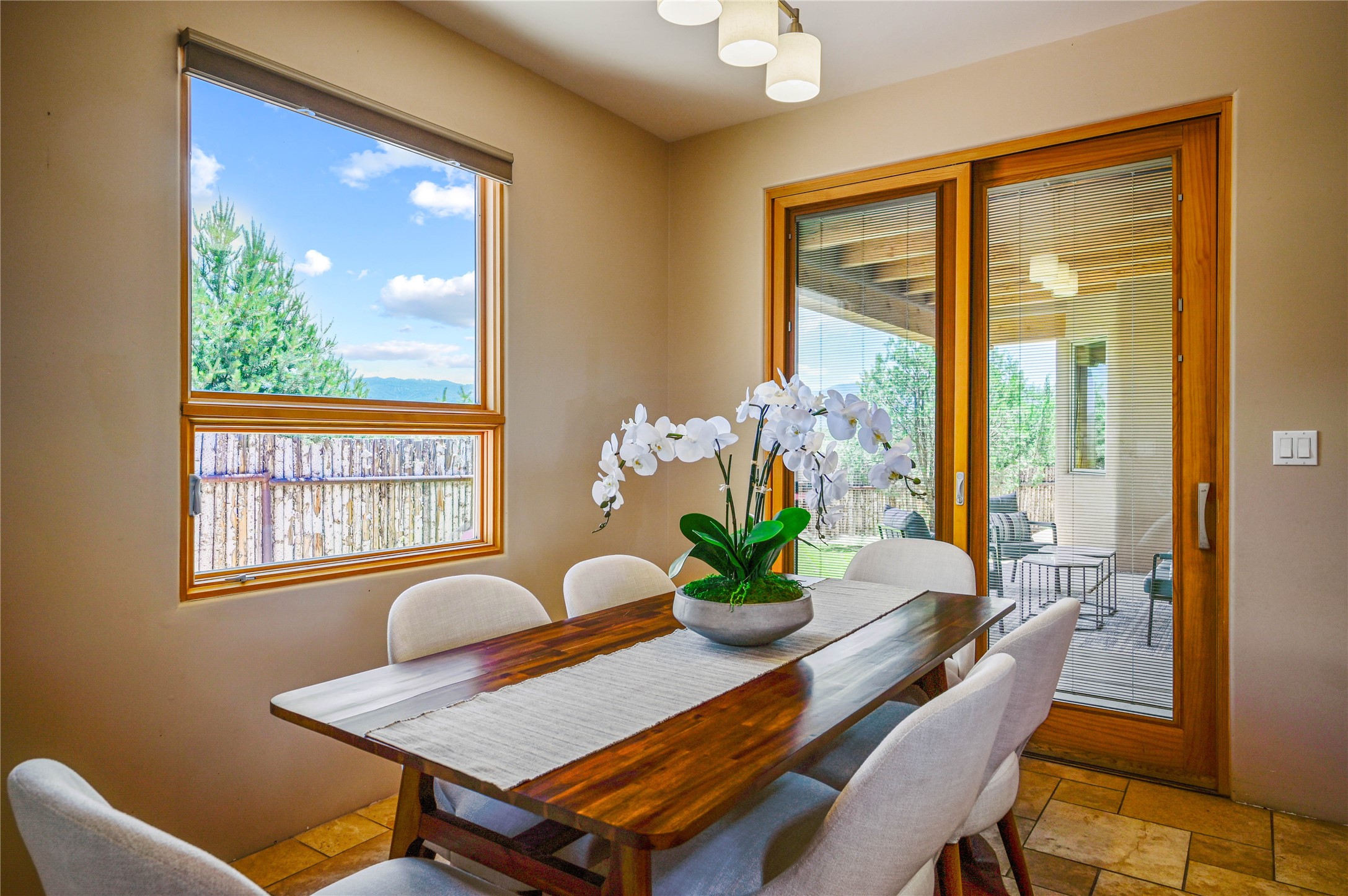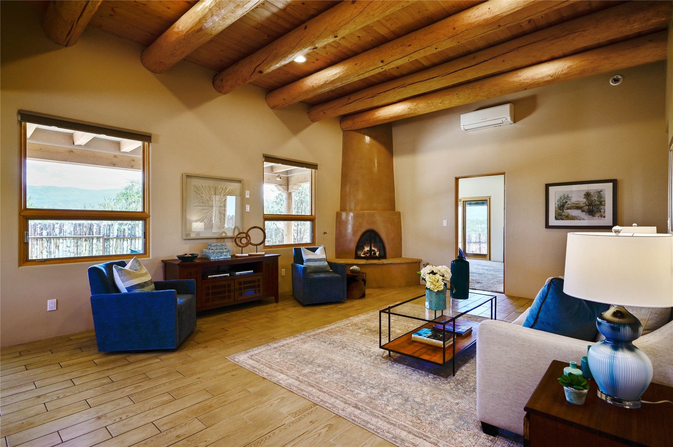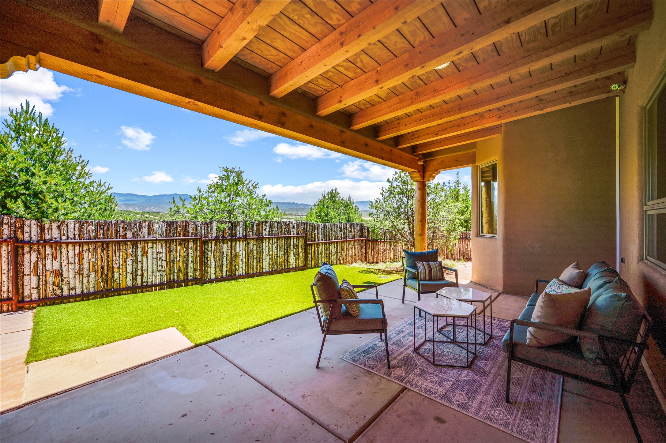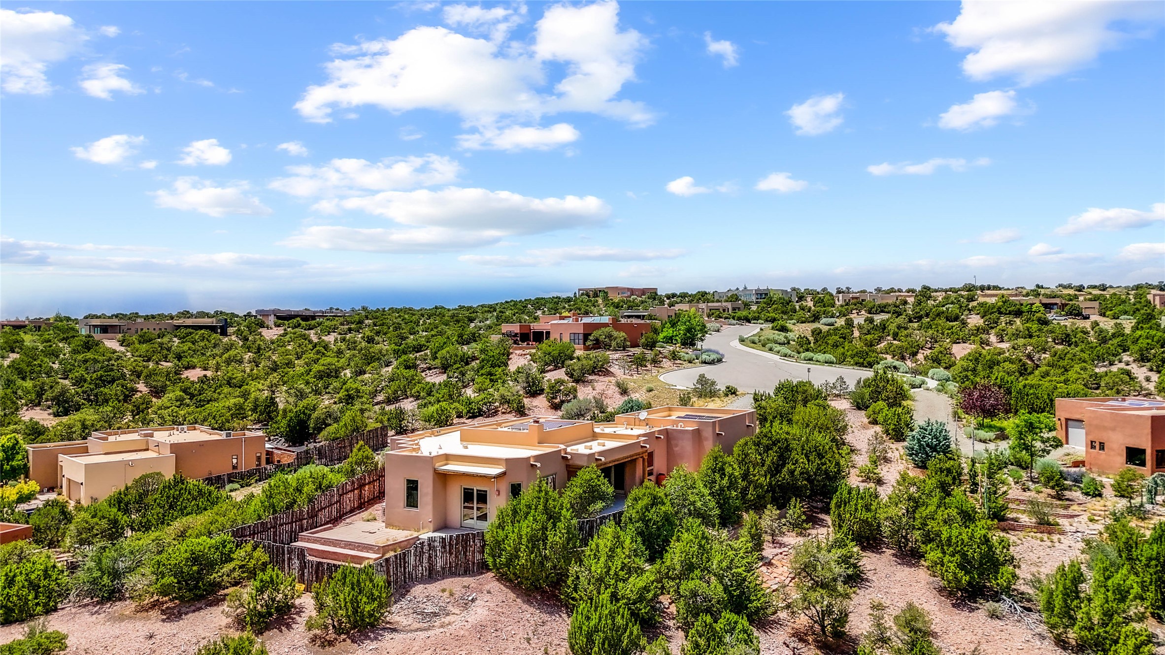 Perched at the top of the desirable Pion Bluffs subdivision, this charming three-bedroom, two-bath contemporary home offers breathtaking views of the Sangre de Cristos. Ideally located with easy access to downtown Santa Fe, Albuquerque, and Los Alamos, this home is perfect for those seeking both convenience and a great Santa fe vibe. The open-concept kitchen and dining area flow seamlessly onto a spacious outdoor patio--an ideal setting for entertaining or enjoying spectacular mountain sunsets. The inviting living room features a wood-burning fireplace, creating a cozy space for gathering. The primary suite includes a lovely en suite bath and French doors that open onto a private yard and patio, perfect for morning coffee with a view. Just minutes from Santa Fe's vibrant Plaza, you'll have quick access to summer markets, live music, and all the cultural richness the city has to offer. Owned solar panels (not leased) offer the next owner the benefit of reduced electric bills and energy independence. Don't miss this opportunity to own a beautifully situated home with comfort, style, and unbeatable views.