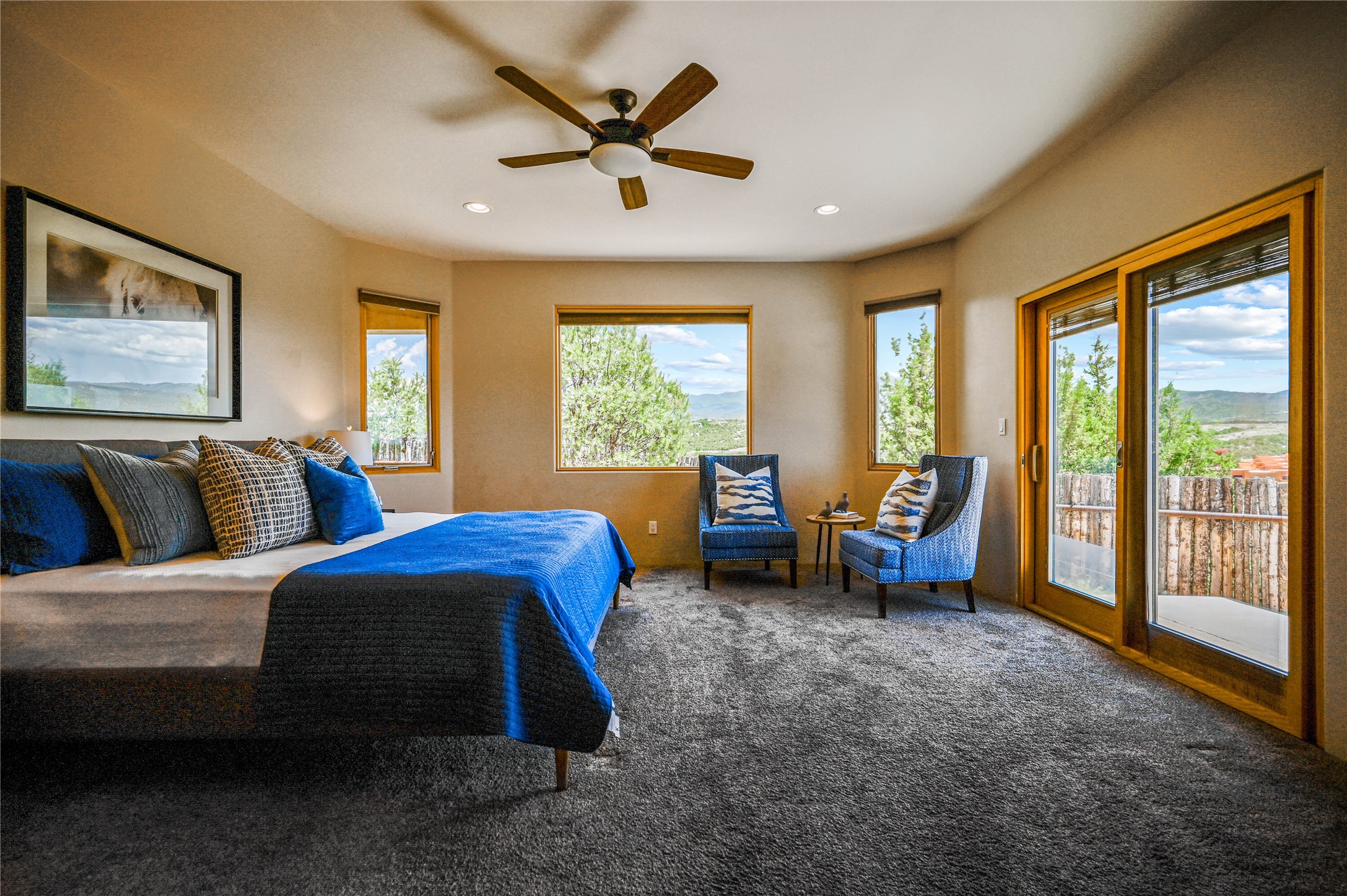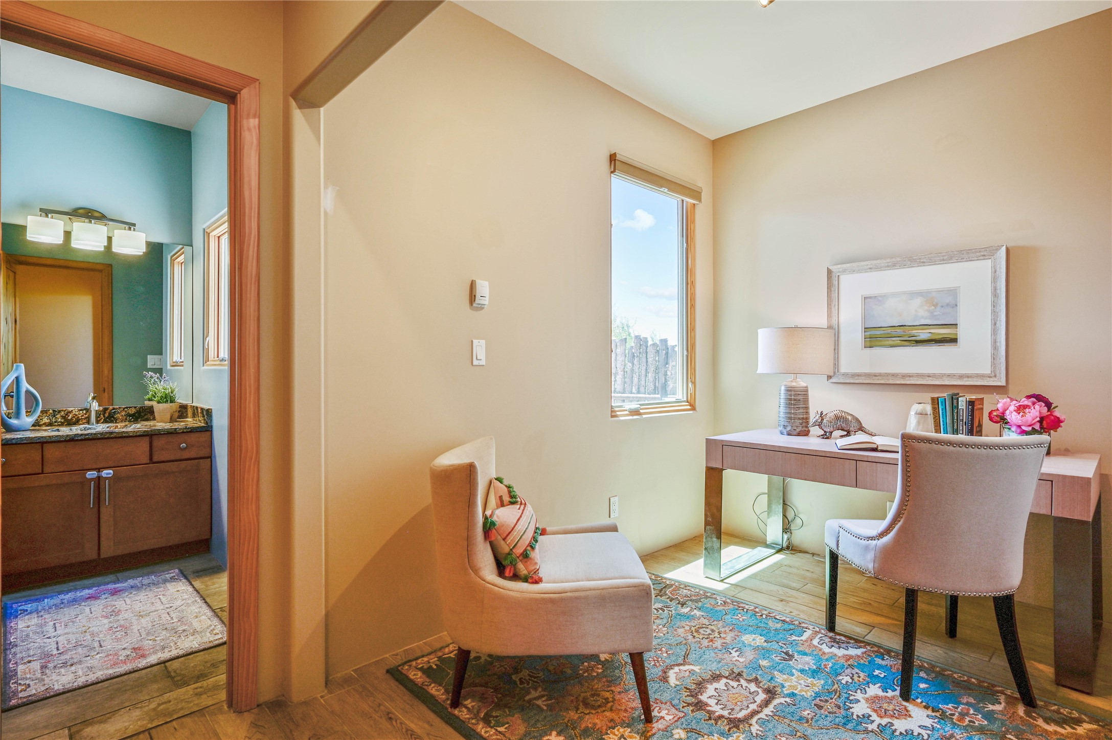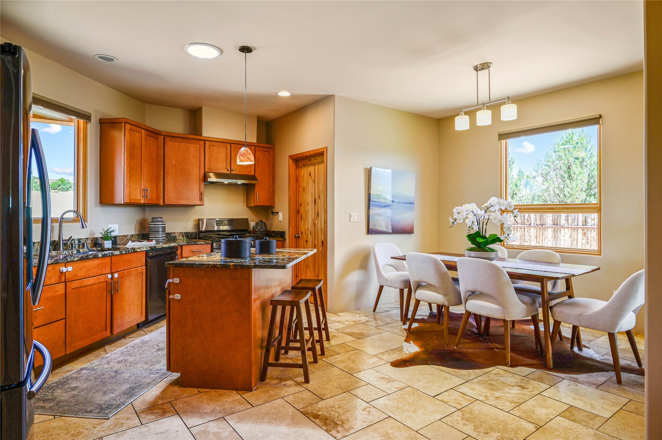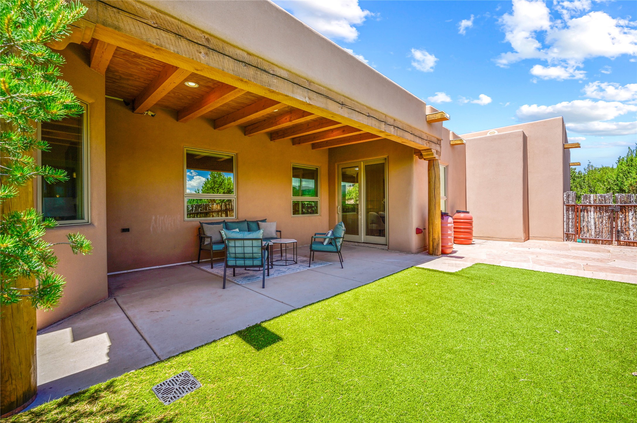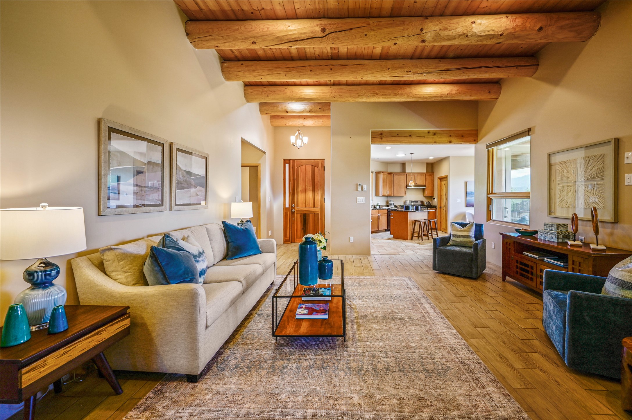 Perched at the top of the desirable Pion Bluffs subdivision, this charming three-bedroom, two-bath contemporary home offers breathtaking views of the Sangre de Cristos. Ideally located with easy access to downtown Santa Fe, Albuquerque, and Los Alamos, this home is perfect for those seeking both convenience and a great Santa fe vibe. The open-concept kitchen and dining area flow seamlessly onto a spacious outdoor patio--an ideal setting for entertaining or enjoying spectacular mountain sunsets. The inviting living room features a wood-burning fireplace, creating a cozy space for gathering. The primary suite includes a lovely en suite bath and French doors that open onto a private yard and patio, perfect for morning coffee with a view. Just minutes from Santa Fe's vibrant Plaza, you'll have quick access to summer markets, live music, and all the cultural richness the city has to offer. Owned solar panels (not leased) offer the next owner the benefit of reduced electric bills and energy independence. Don't miss this opportunity to own a beautifully situated home with comfort, style, and unbeatable views.