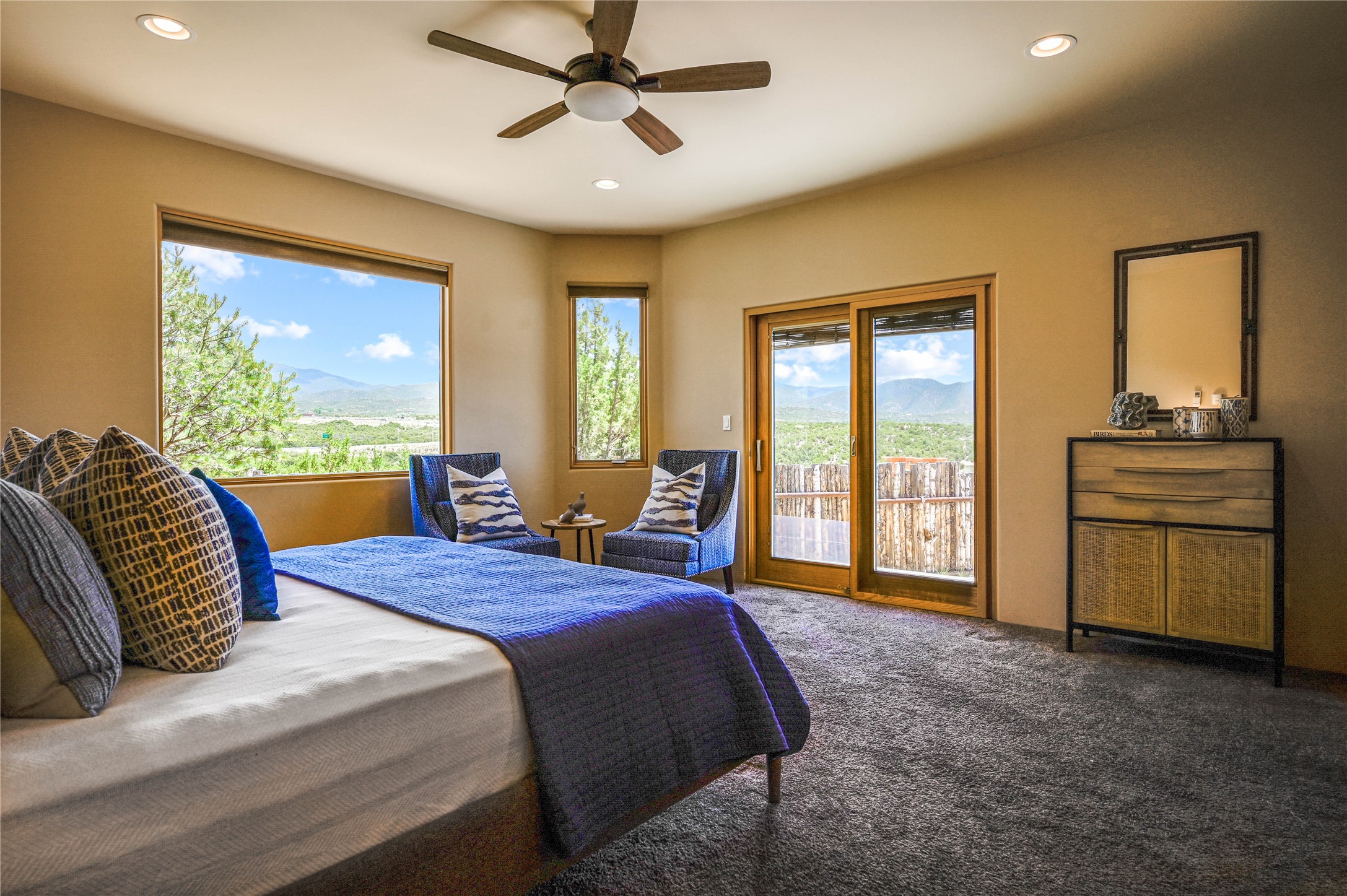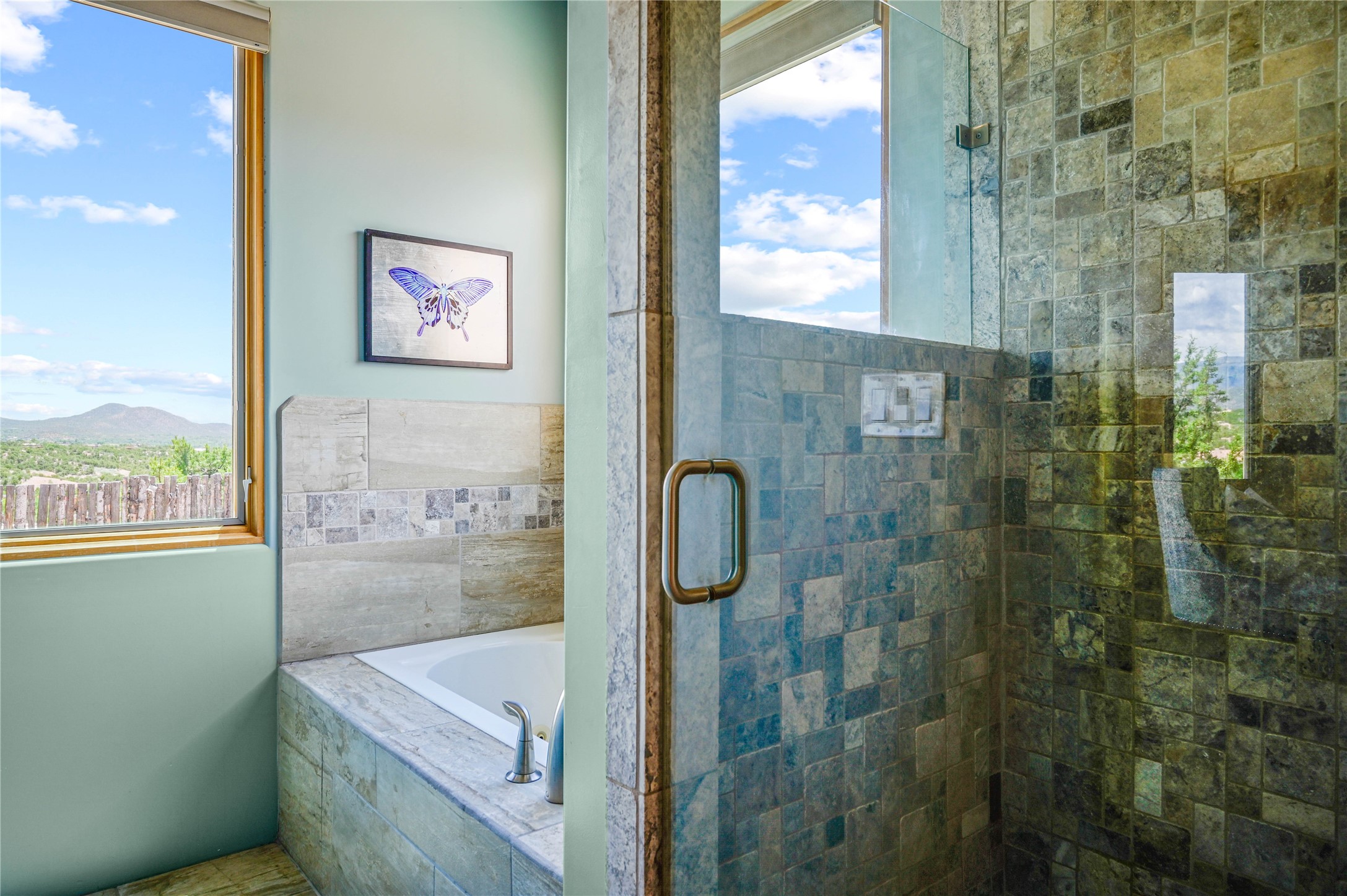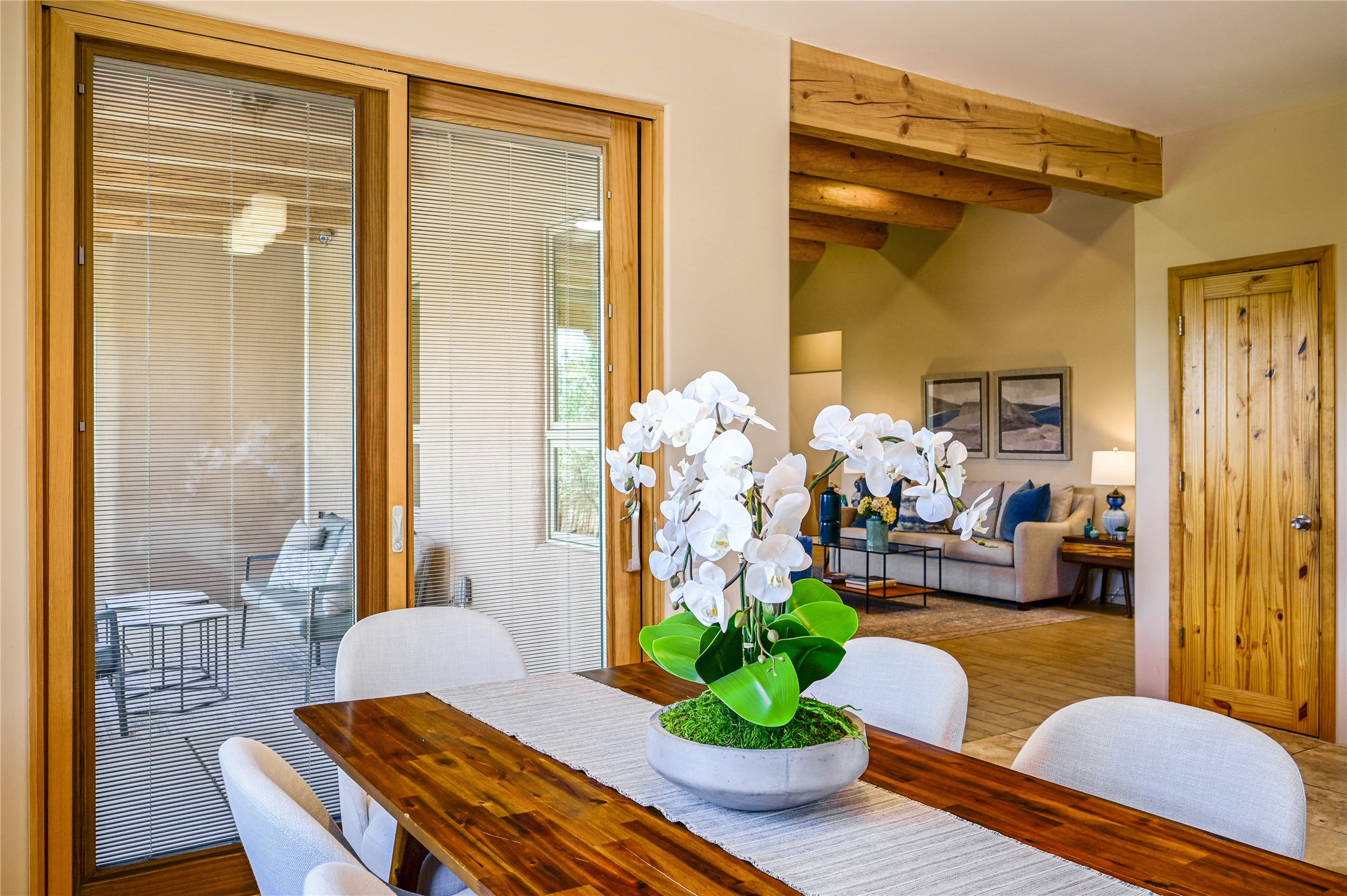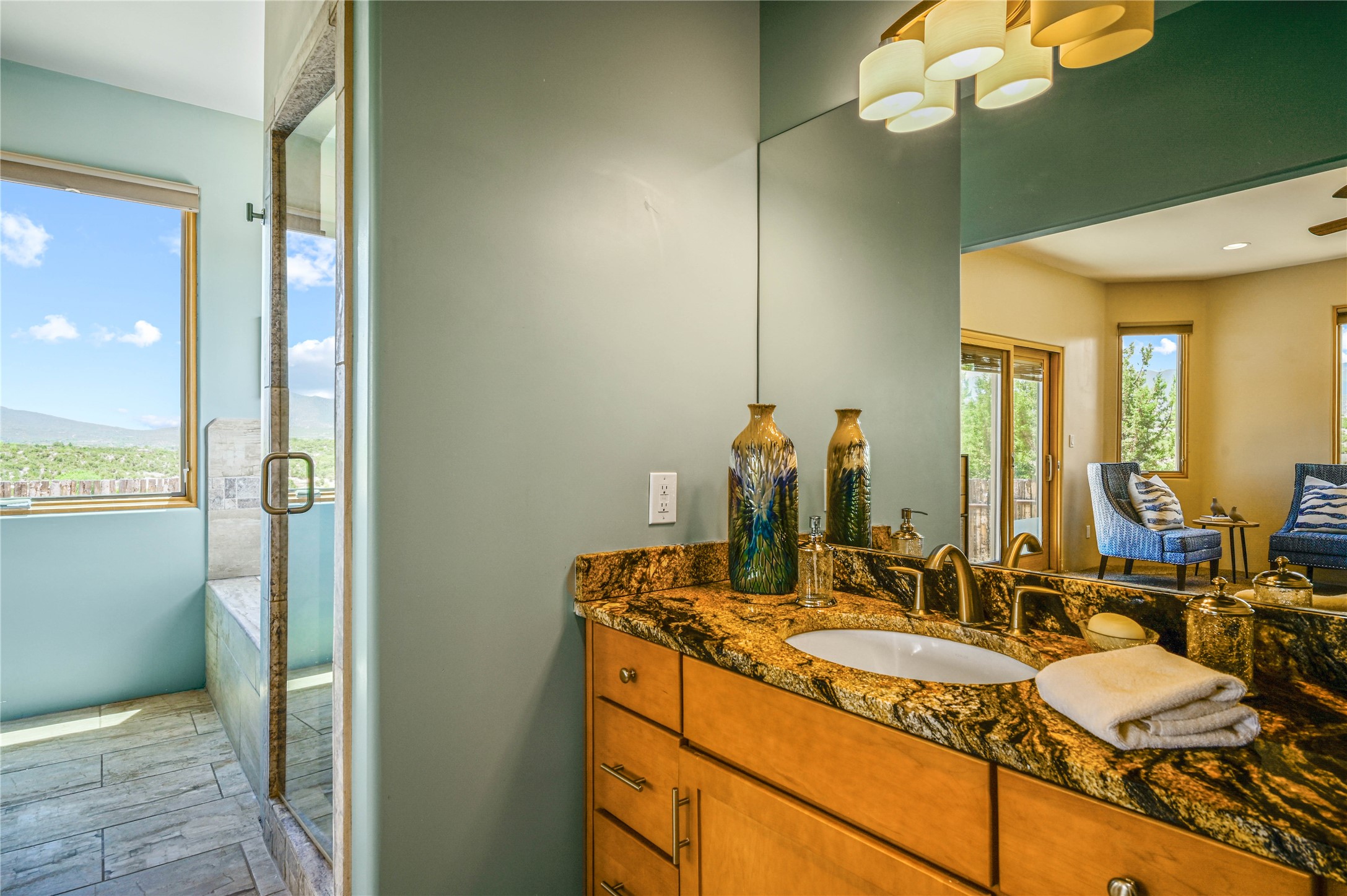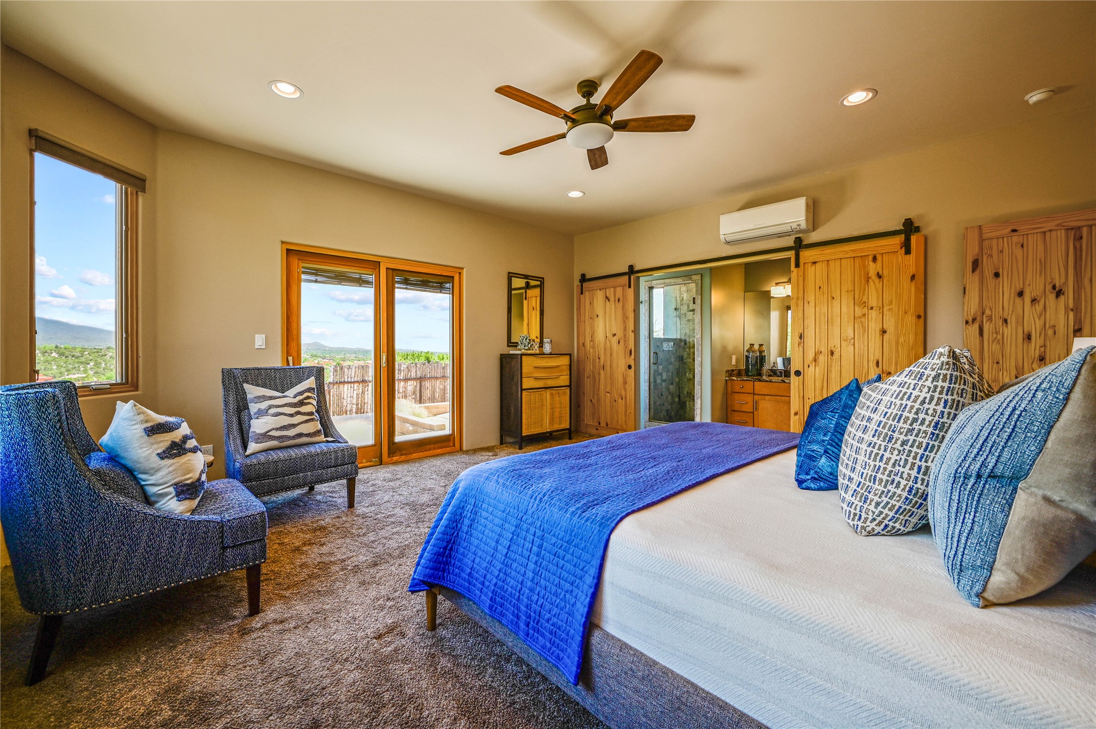 Perched at the top of the desirable Pion Bluffs subdivision, this charming three-bedroom, two-bath contemporary home offers breathtaking views of the Sangre de Cristos. Ideally located with easy access to downtown Santa Fe, Albuquerque, and Los Alamos, this home is perfect for those seeking both convenience and a great Santa fe vibe. The open-concept kitchen and dining area flow seamlessly onto a spacious outdoor patio--an ideal setting for entertaining or enjoying spectacular mountain sunsets. The inviting living room features a wood-burning fireplace, creating a cozy space for gathering. The primary suite includes a lovely en suite bath and French doors that open onto a private yard and patio, perfect for morning coffee with a view. Just minutes from Santa Fe's vibrant Plaza, you'll have quick access to summer markets, live music, and all the cultural richness the city has to offer. Owned solar panels (not leased) offer the next owner the benefit of reduced electric bills and energy independence. Don't miss this opportunity to own a beautifully situated home with comfort, style, and unbeatable views.
