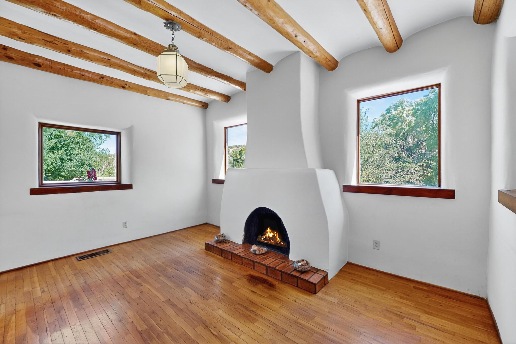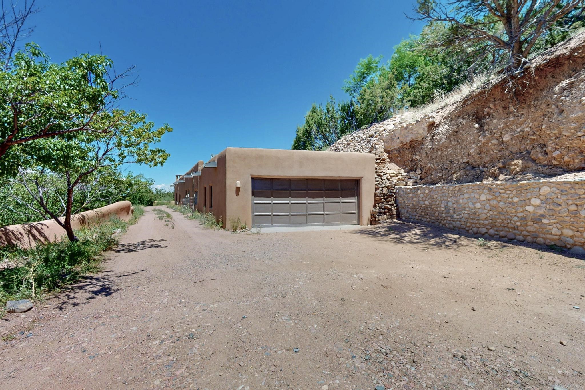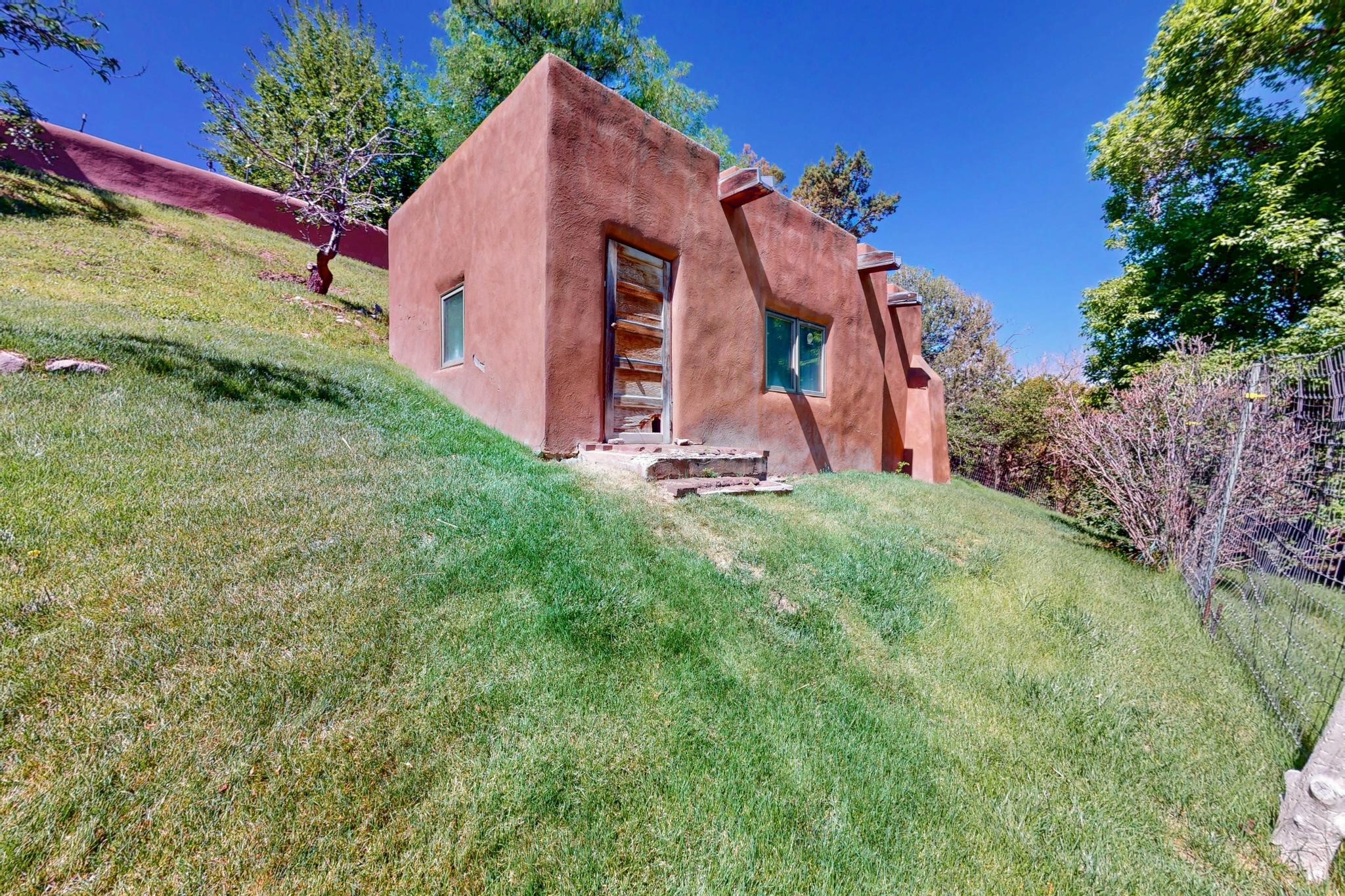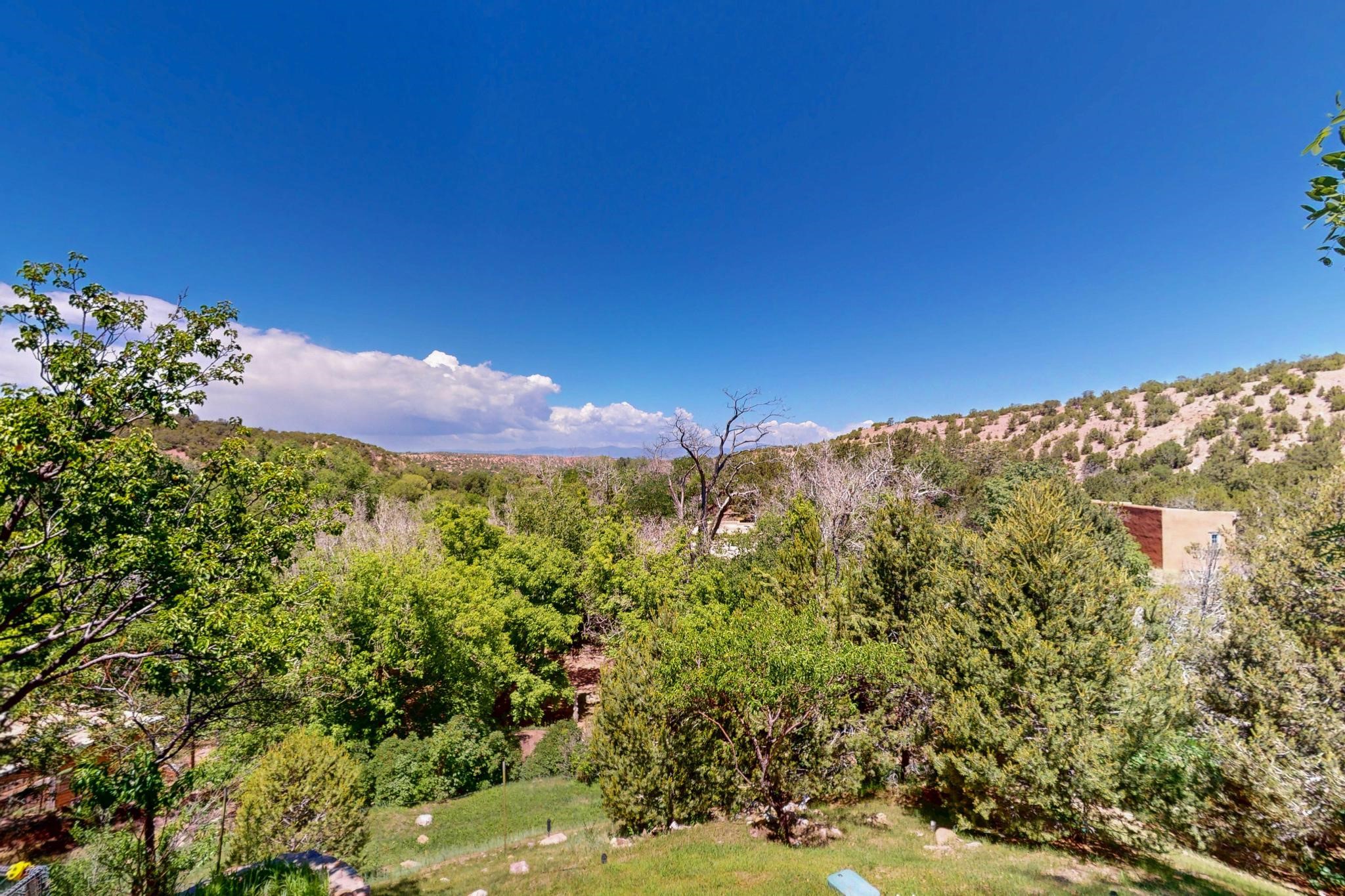 Rare Tesuque Offering & One of the last original Big Tesuque Canyon properties: all adobe and on nearly 9 acres this is a spectacular opportunity! Located at the end of the Canyon and bordering the National Forest, this has unparalleled privacy and quietude. Set in a verdant landscape, this three-bedroom two-bathtwo home is an original, charming adobe pueblo. In addition to this home on the hill, there is an adobe outbuilding which can become a guest house and or studio. There is also a small barn which can be further developed. The home and lovely acreage of sweeping hills, grassy knolls and many fruit trees is irrigated by a private well. Well loved and cared for many years by one family, this is a chance to have an extraordinary piece of beautiful Tesuque. All depictions of furniture are virtually staged.