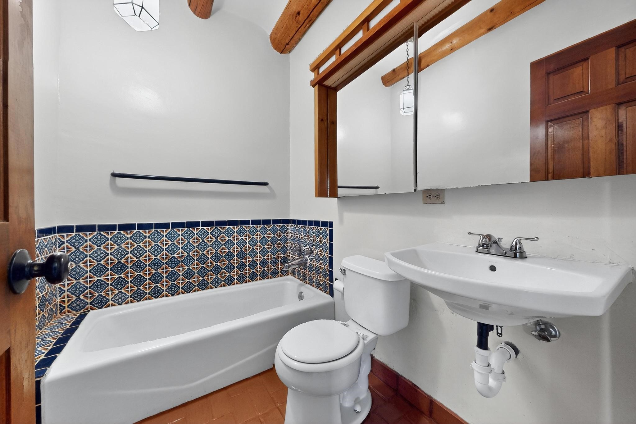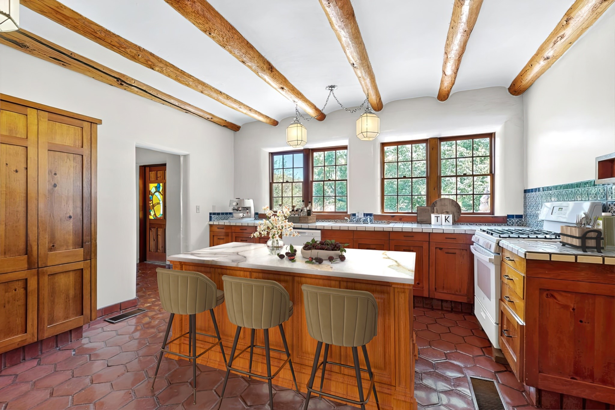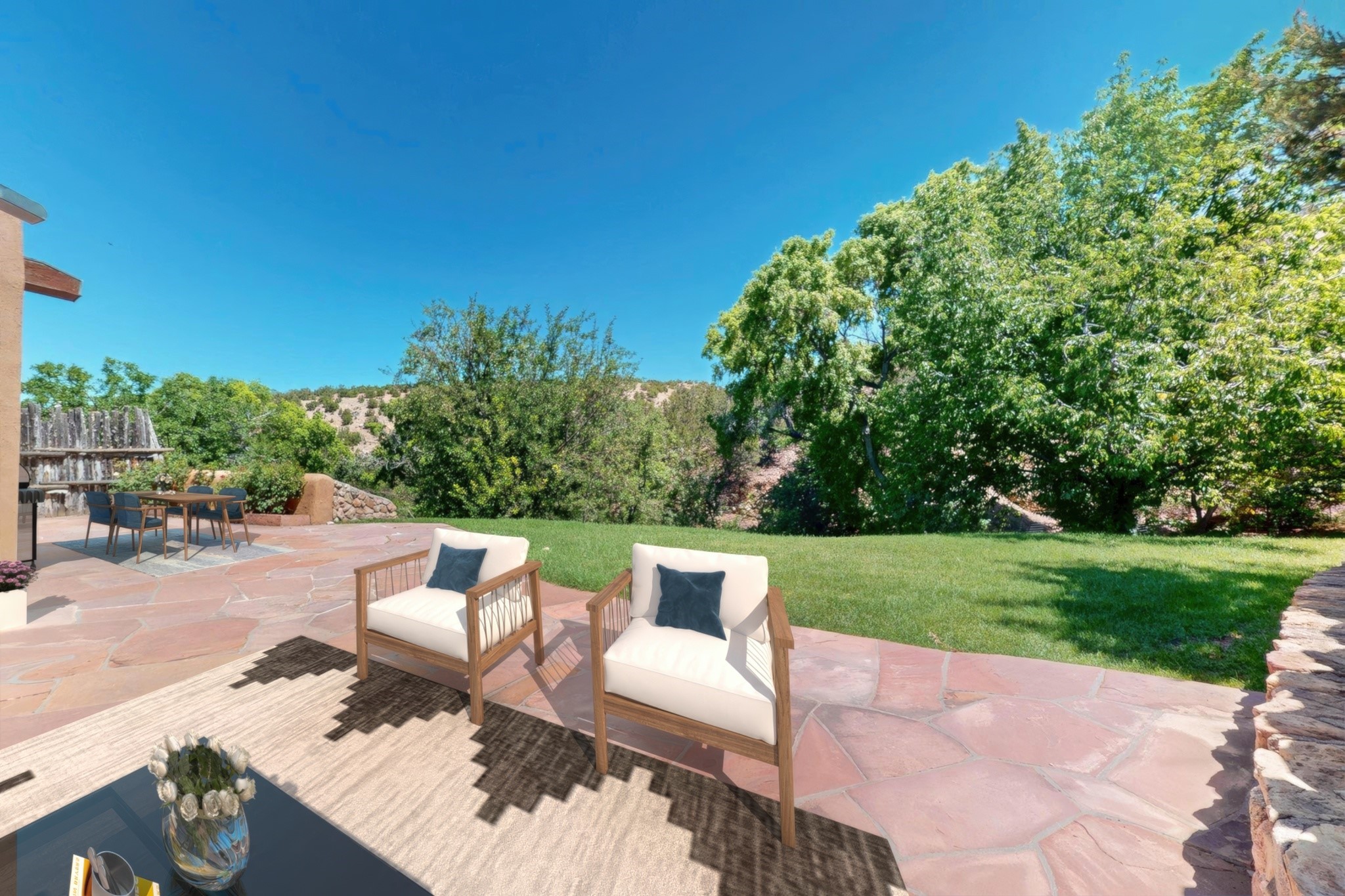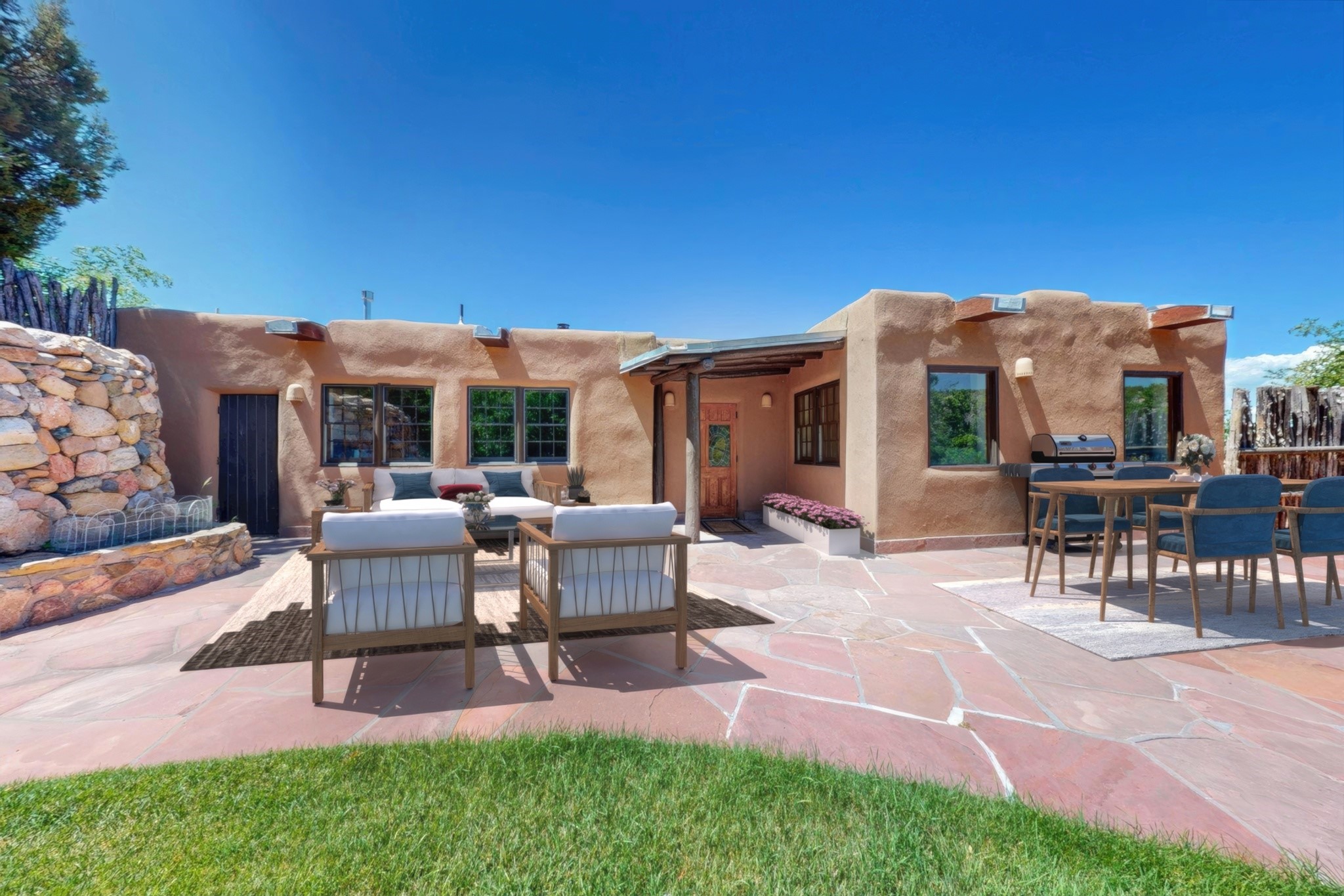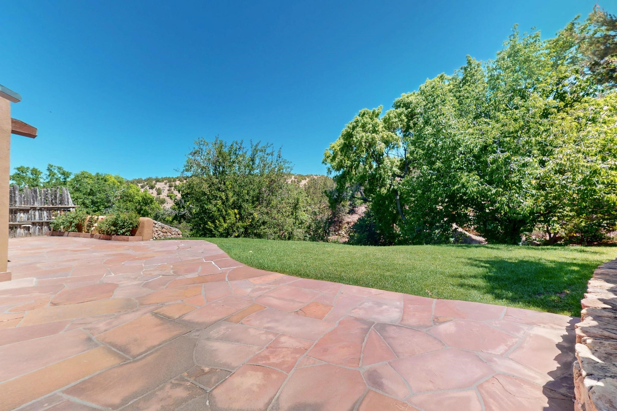Rare Tesuque Offering & One of the last original Big Tesuque Canyon properties: all adobe and on nearly 9 acres this is a spectacular opportunity! Located at the end of the Canyon and bordering the National Forest, this has unparalleled privacy and quietude. Set in a verdant landscape, this three-bedroom two-bathtwo home is an original, charming adobe pueblo. In addition to this home on the hill, there is an adobe outbuilding which can become a guest house and or studio. There is also a small barn which can be further developed. The home and lovely acreage of sweeping hills, grassy knolls and many fruit trees is irrigated by a private well. Well loved and cared for many years by one family, this is a chance to have an extraordinary piece of beautiful Tesuque. All depictions of furniture are virtually staged.