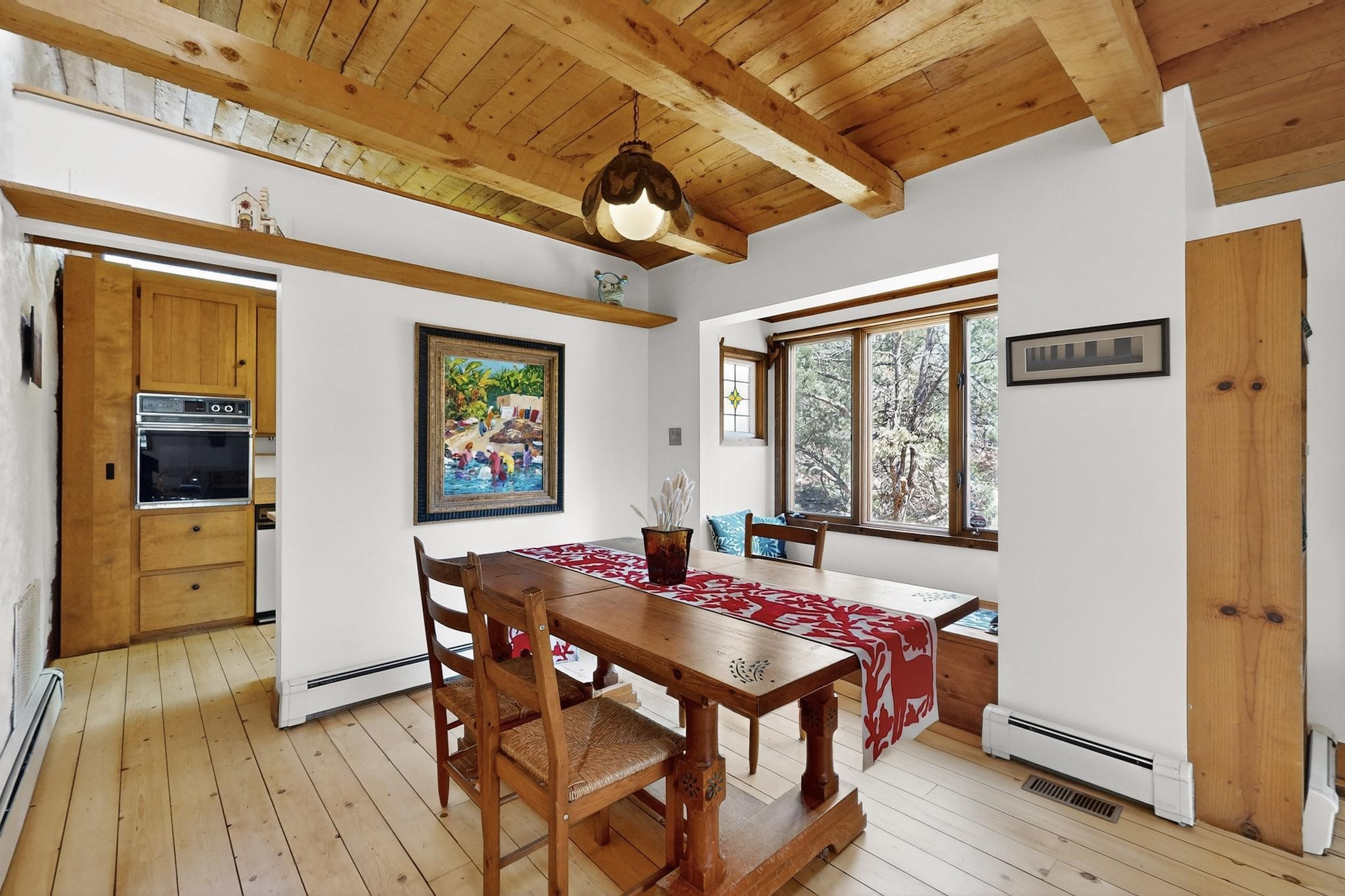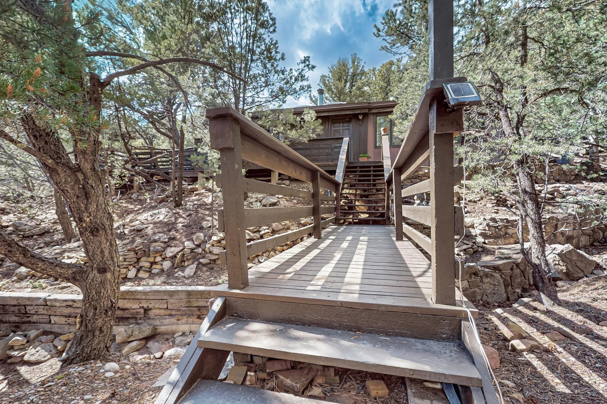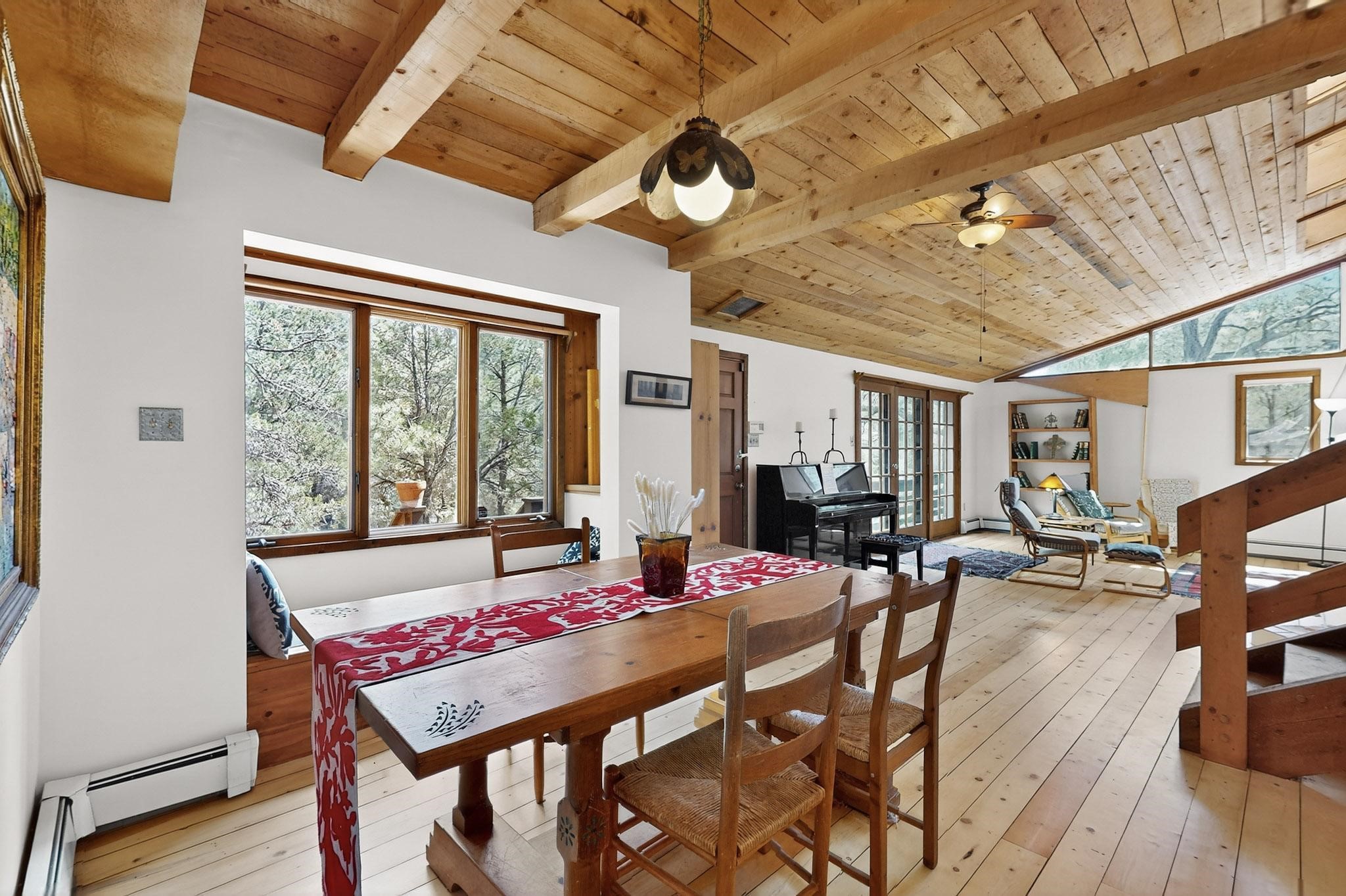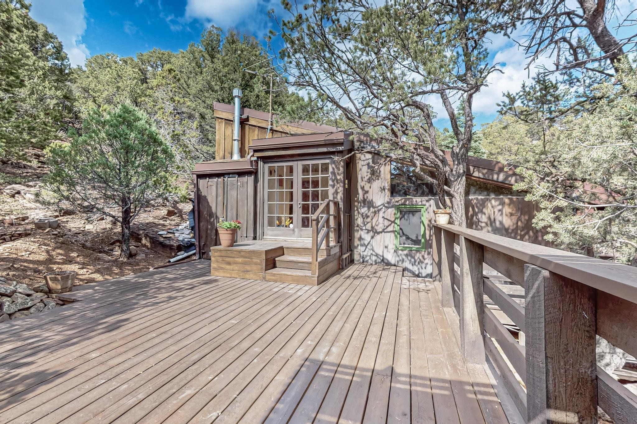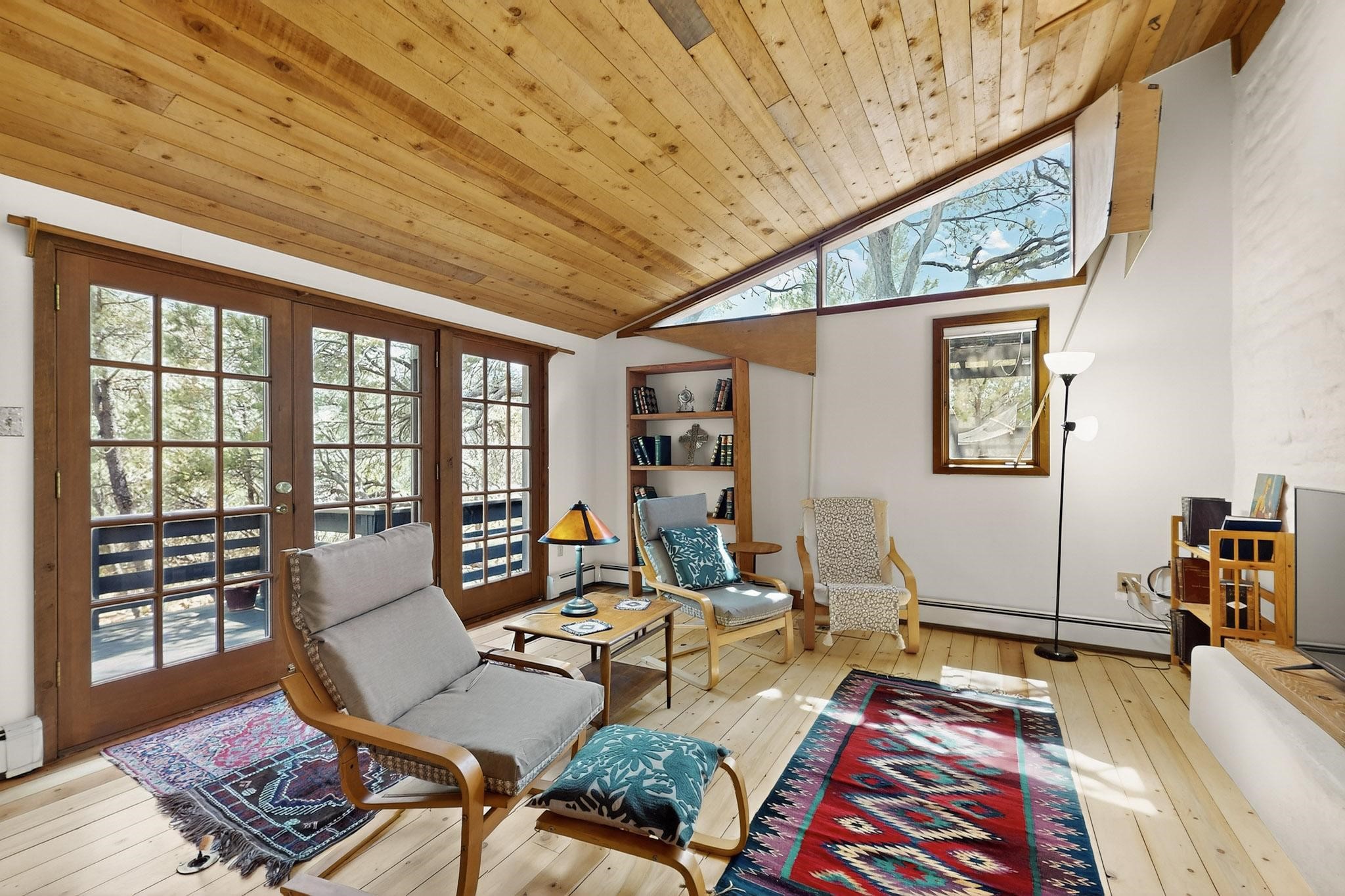 This architect designed 2 bedroom 2 bath mountain residence in Hyde Park Estates sits well within a treed hillside landscape on a 1.021 acre lot. With interior exposed adobe walls for solar energy efficiency, wide plank floors and a set of expansive outside decks, it delivers seclusion and convenience of a get-away for hiking, biking and skiing. It is only 3 miles from the Santa Fe Plaza, walking distance from Ten Thousand Waves and a short drive to Ski Santa Fe.