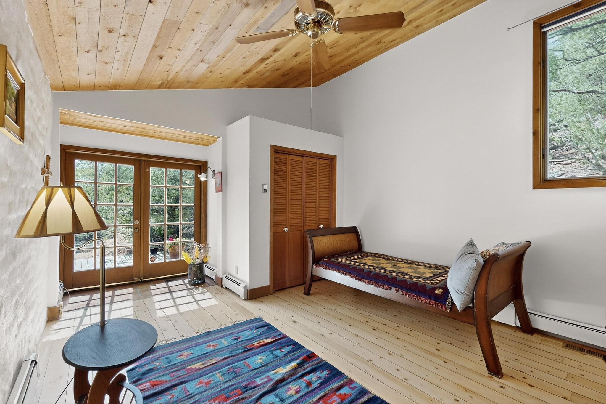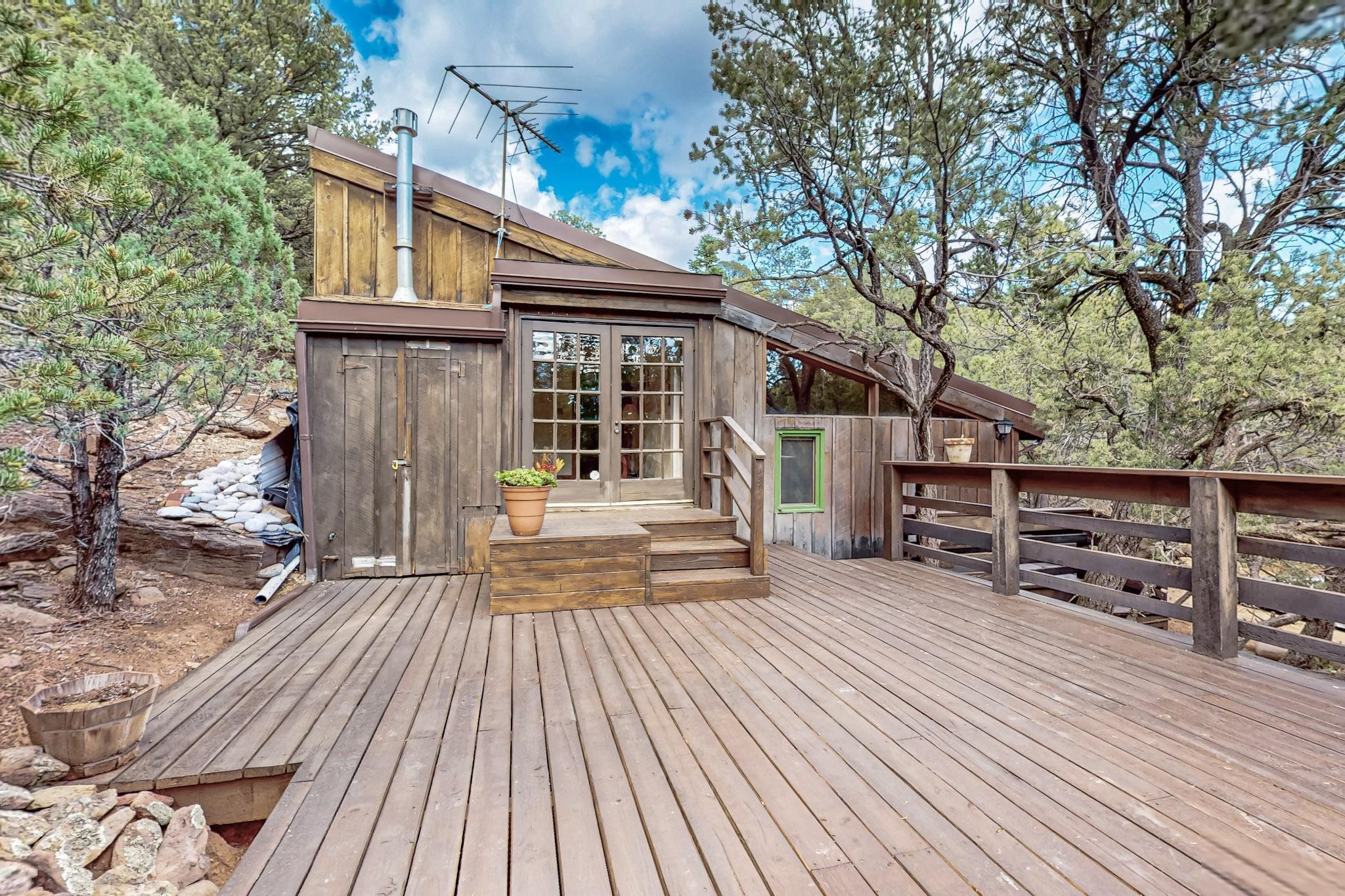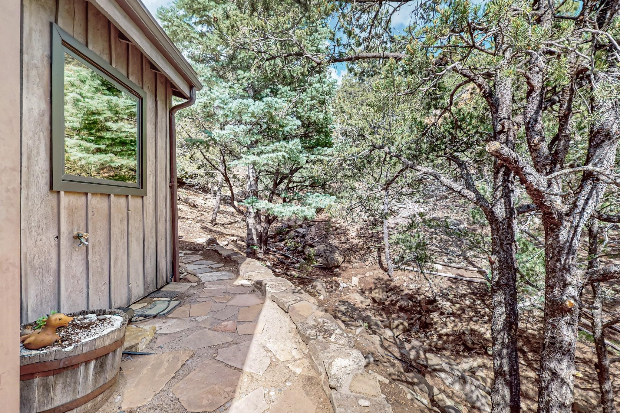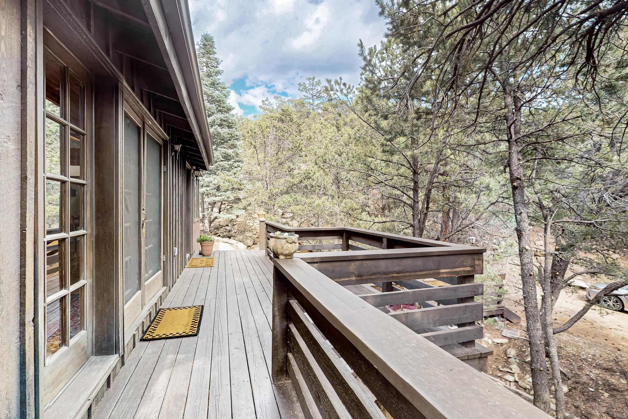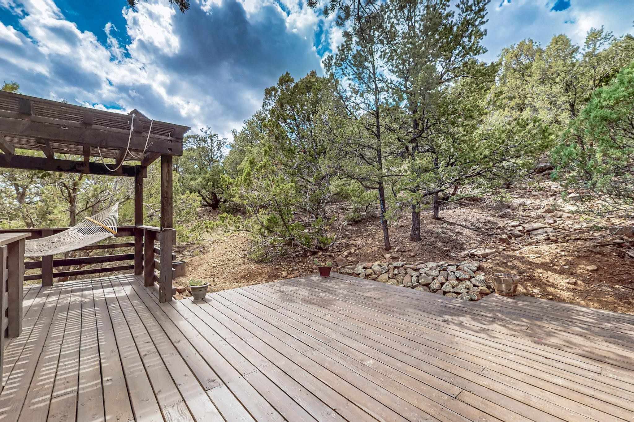 This architect designed 2 bedroom 2 bath mountain residence in Hyde Park Estates sits well within a treed hillside landscape on a 1.021 acre lot. With interior exposed adobe walls for solar energy efficiency, wide plank floors and a set of expansive outside decks, it delivers seclusion and convenience of a get-away for hiking, biking and skiing. It is only 3 miles from the Santa Fe Plaza, walking distance from Ten Thousand Waves and a short drive to Ski Santa Fe.