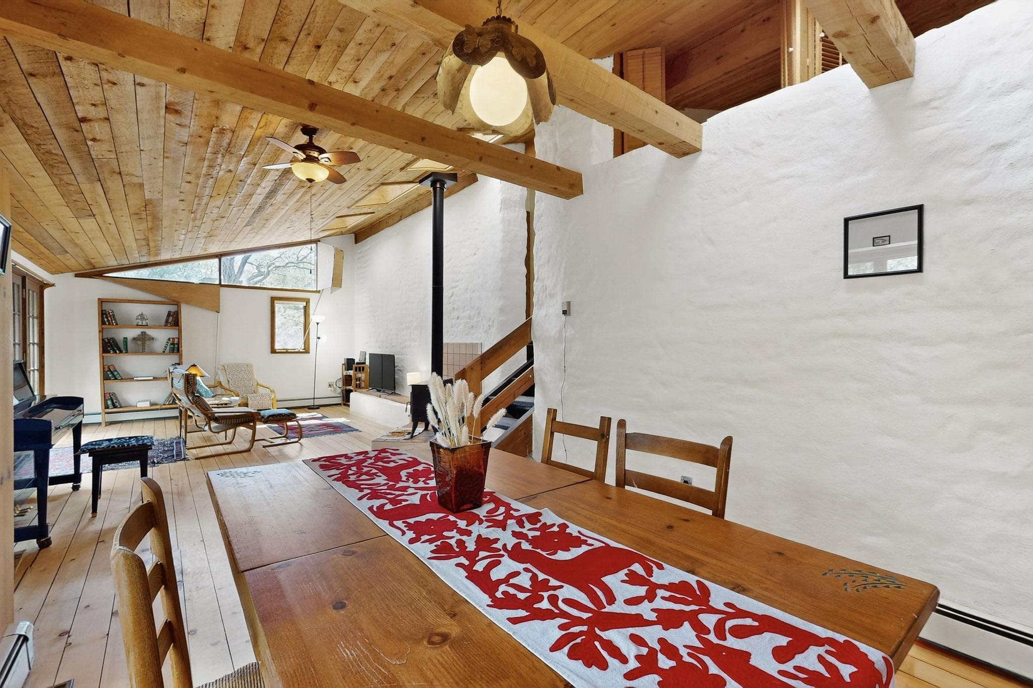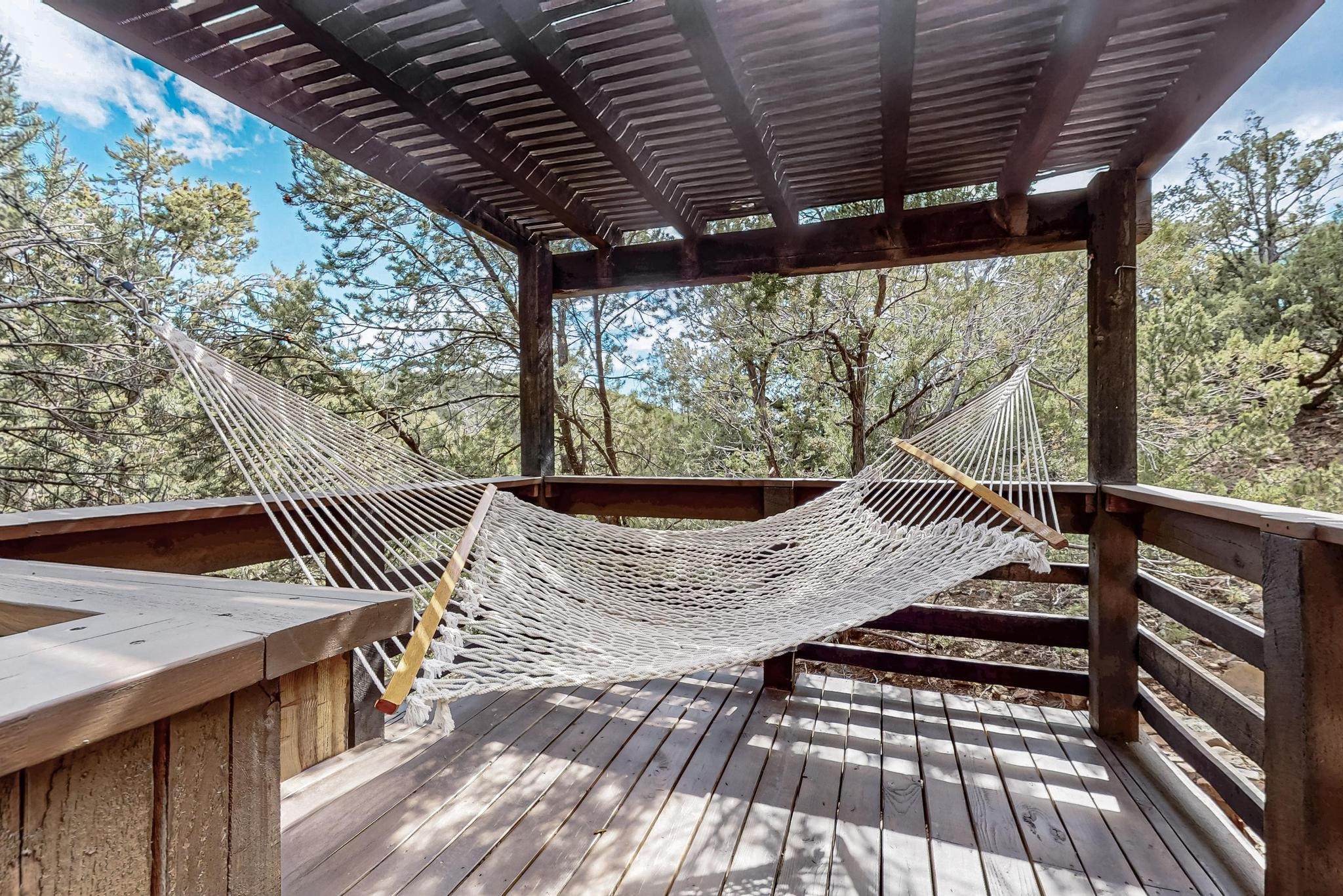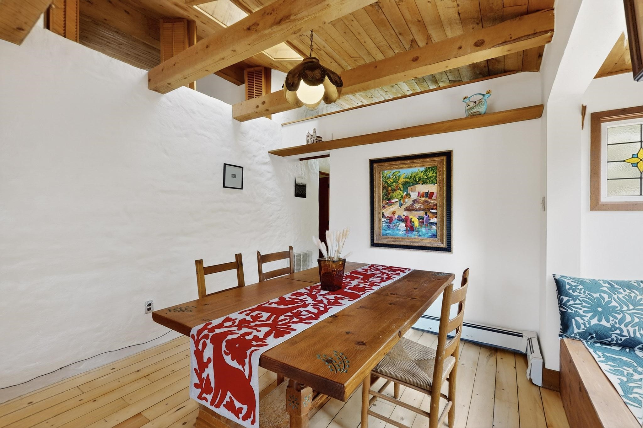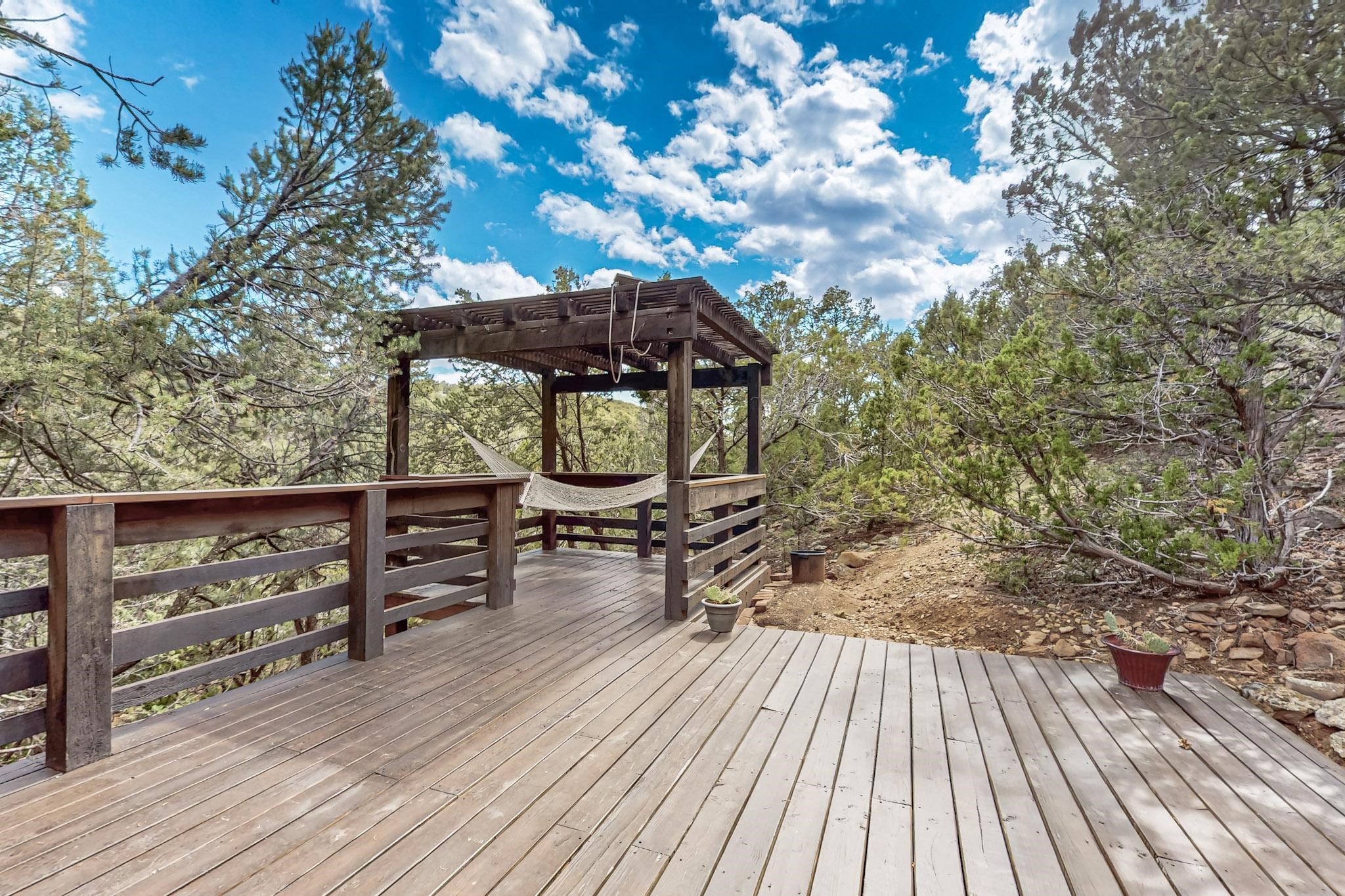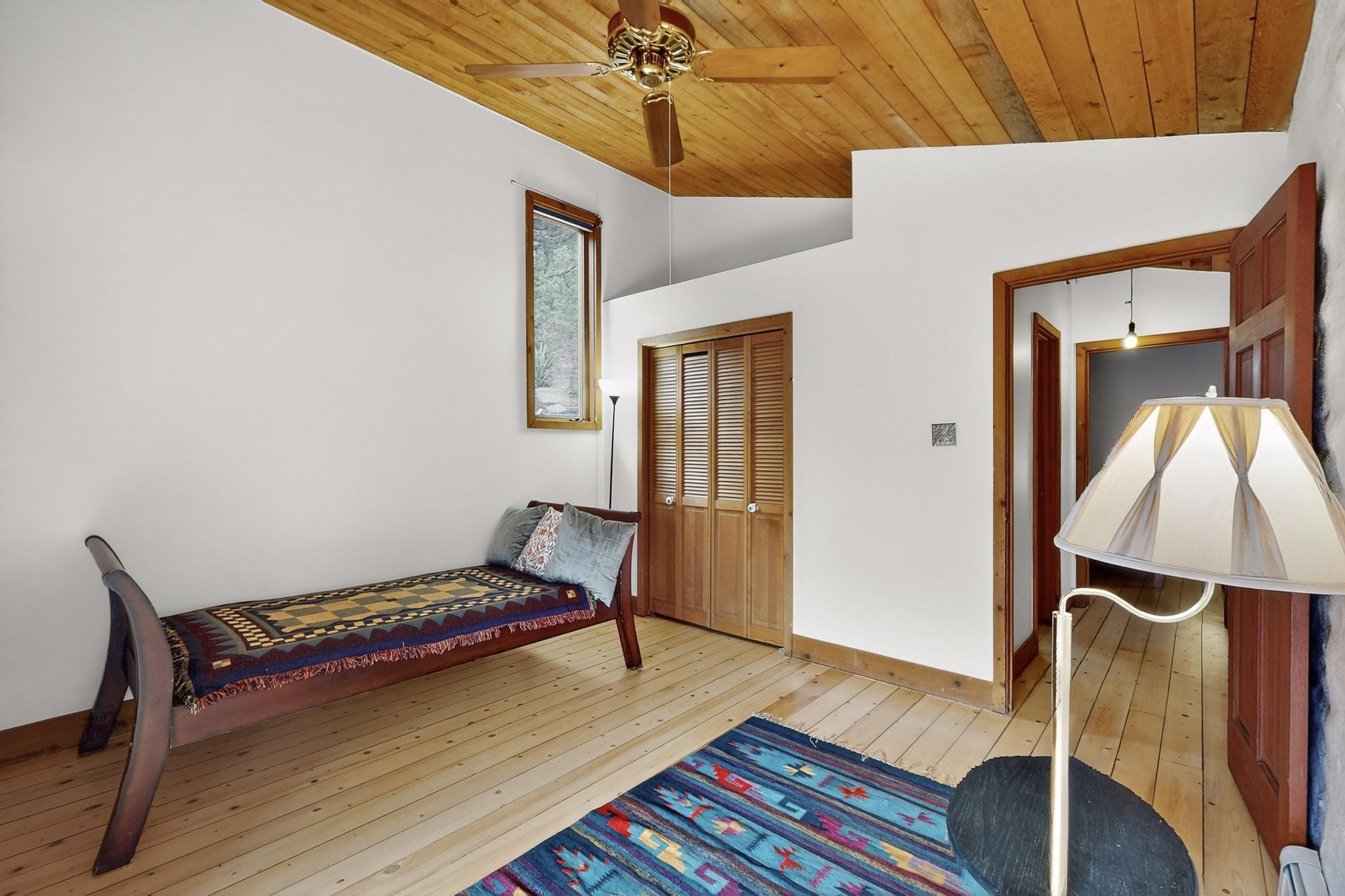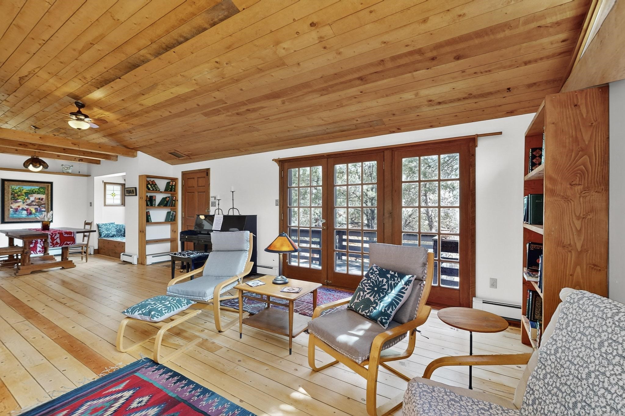 This architect designed 2 bedroom 2 bath mountain residence in Hyde Park Estates sits well within a treed hillside landscape on a 1.021 acre lot. With interior exposed adobe walls for solar energy efficiency, wide plank floors and a set of expansive outside decks, it delivers seclusion and convenience of a get-away for hiking, biking and skiing. It is only 3 miles from the Santa Fe Plaza, walking distance from Ten Thousand Waves and a short drive to Ski Santa Fe.