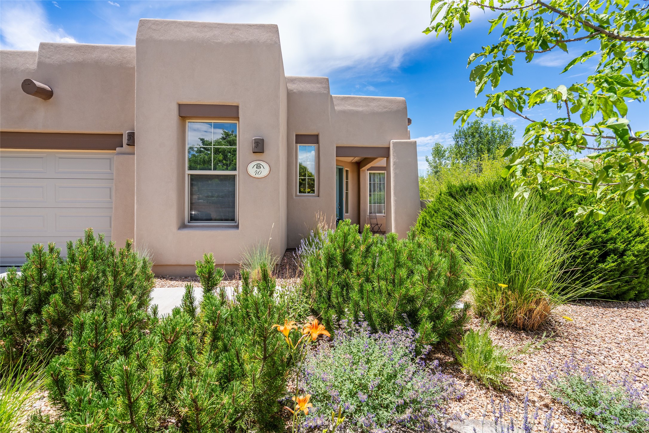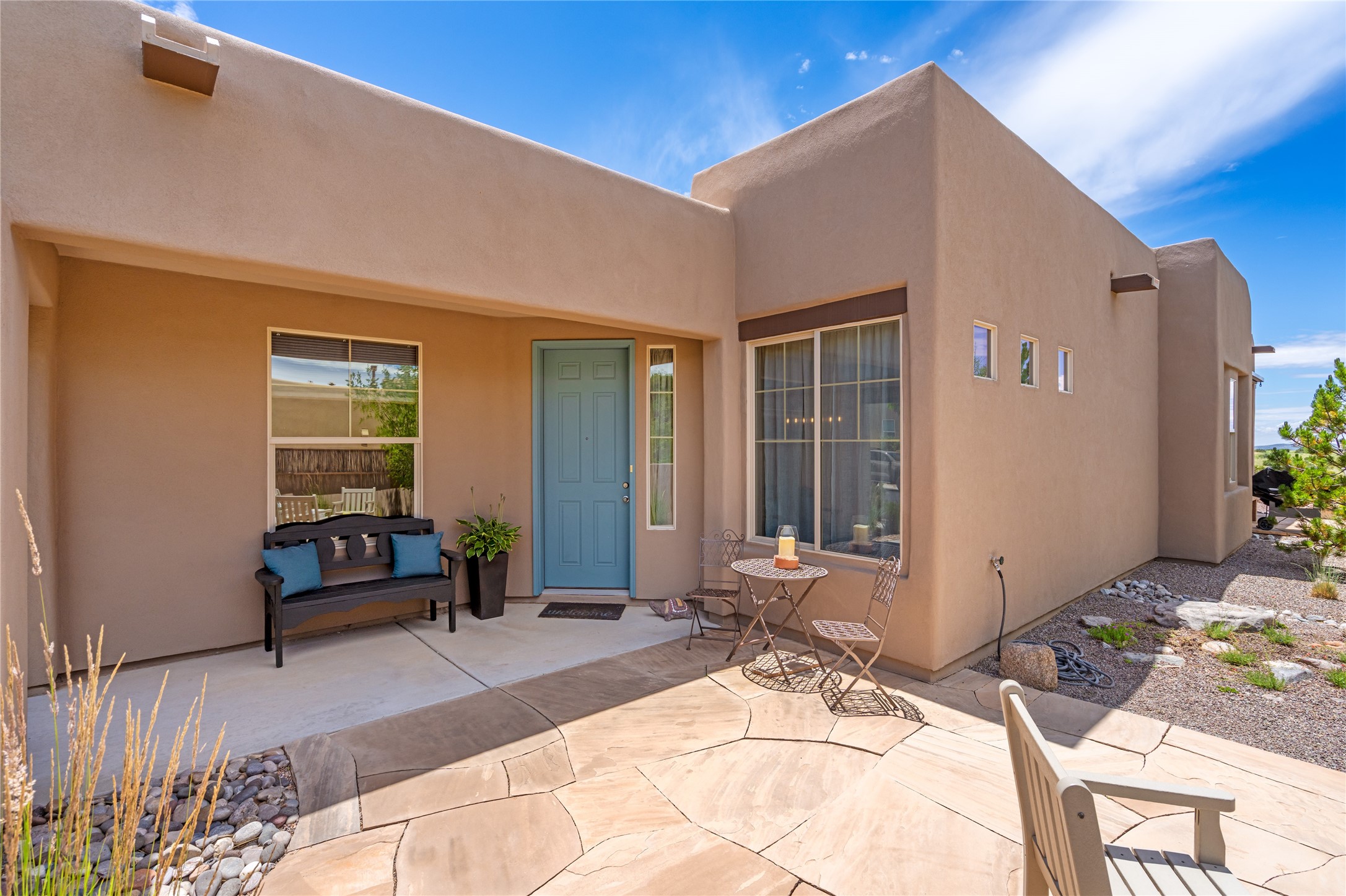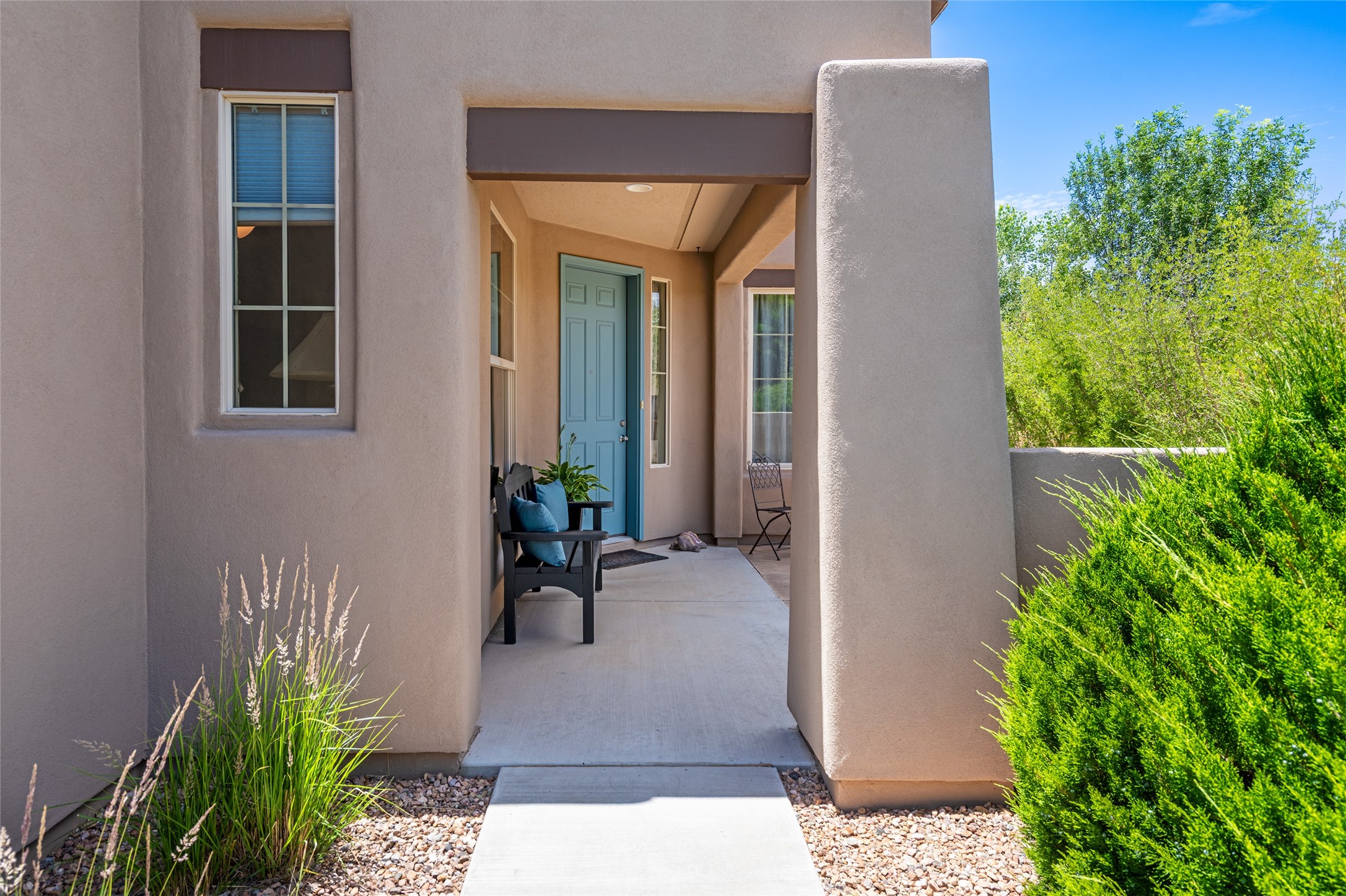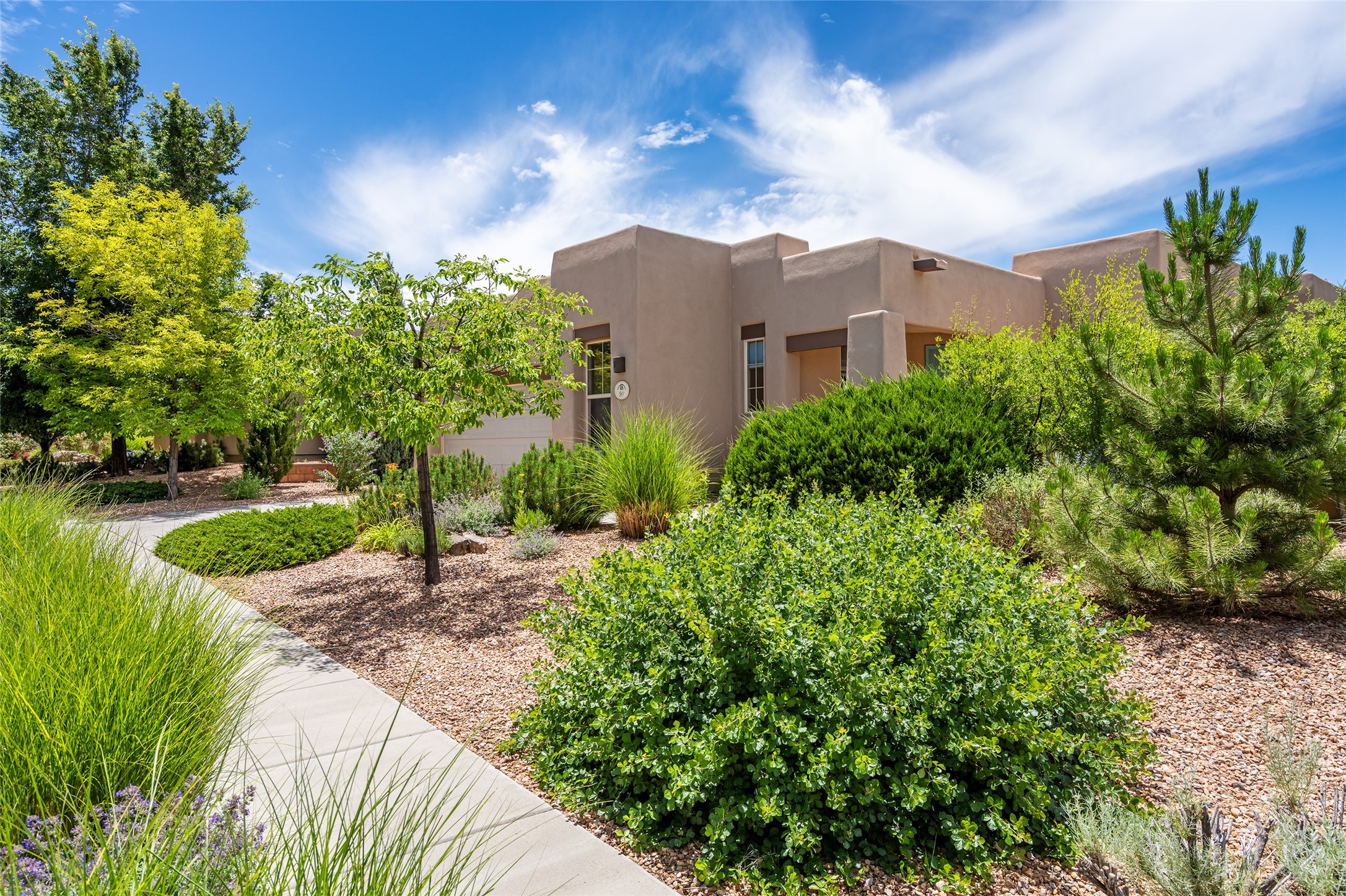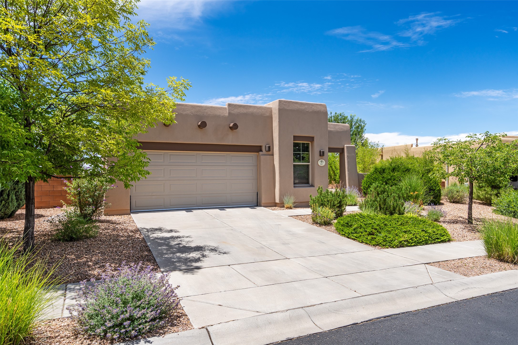 Welcome to 40 Via Punto Nuevo, a thoughtfully designed 3-bedroom, 2-bath home nestled in the heart of Rancho Viejo. This charming residence exudes classic Santa Fe style, with high ceilings adorned with vigas, and abundant natural light from well-placed skylights. The living room features a traditional Kiva fireplace,--perfect for quiet evenings. The open-concept kitchen is ideal for entertaining, with granite countertops, GE Profile and LG appliances, and ample storage. Set on a premium lot, the home backs to an open space with scenic walking trails and fronts a tranquil park, creating a private and picturesque setting. Enjoy true indoor-outdoor living with over 550 square feet of covered front and rear portals, a fully walled backyard, and a welcoming front courtyard. This one owner beauty features instant hot water and a two-car garage. Located in a vibrant community with access to parks, trails, sports courts, and a nearby commercial plaza, this home blends Southwest warmth with modern comfort--truly the best of Santa Fe living.