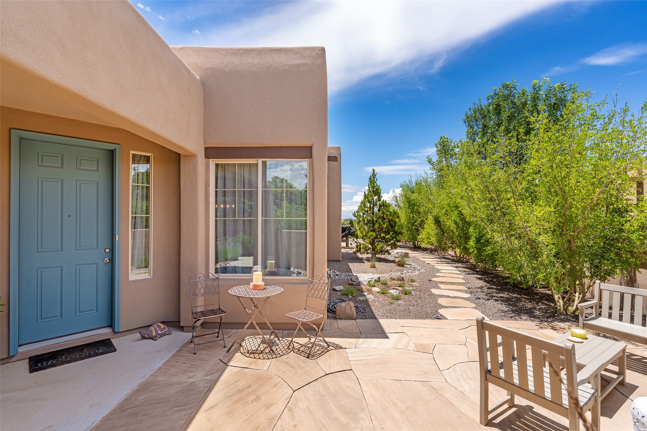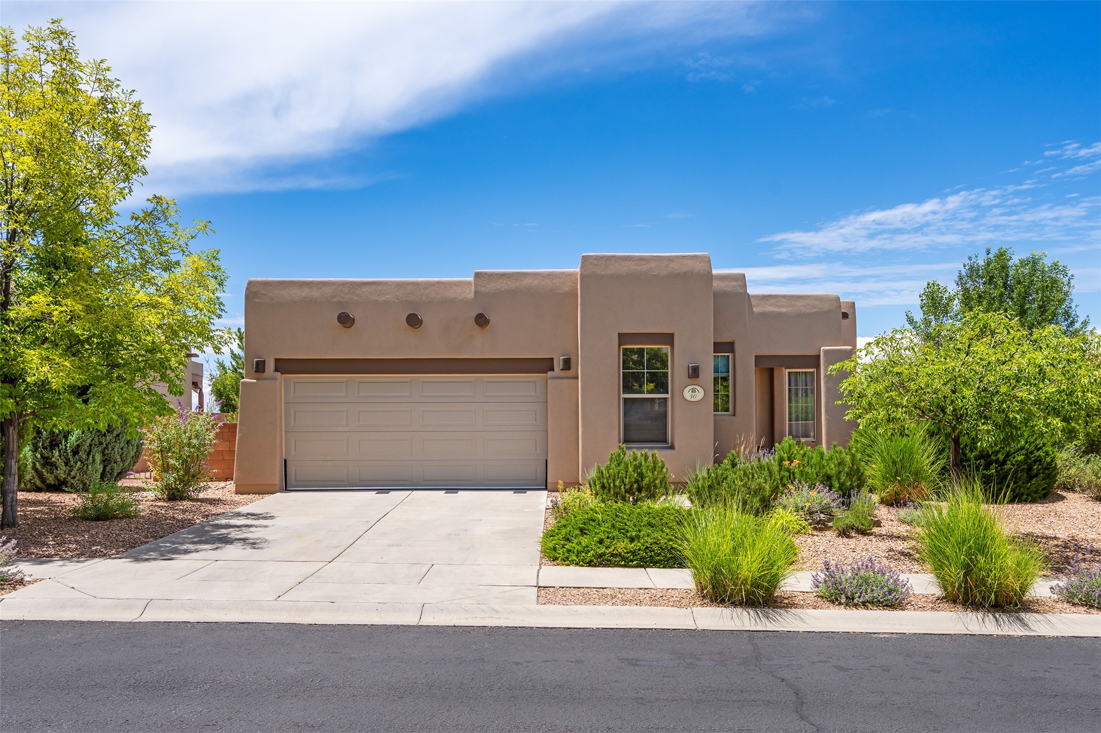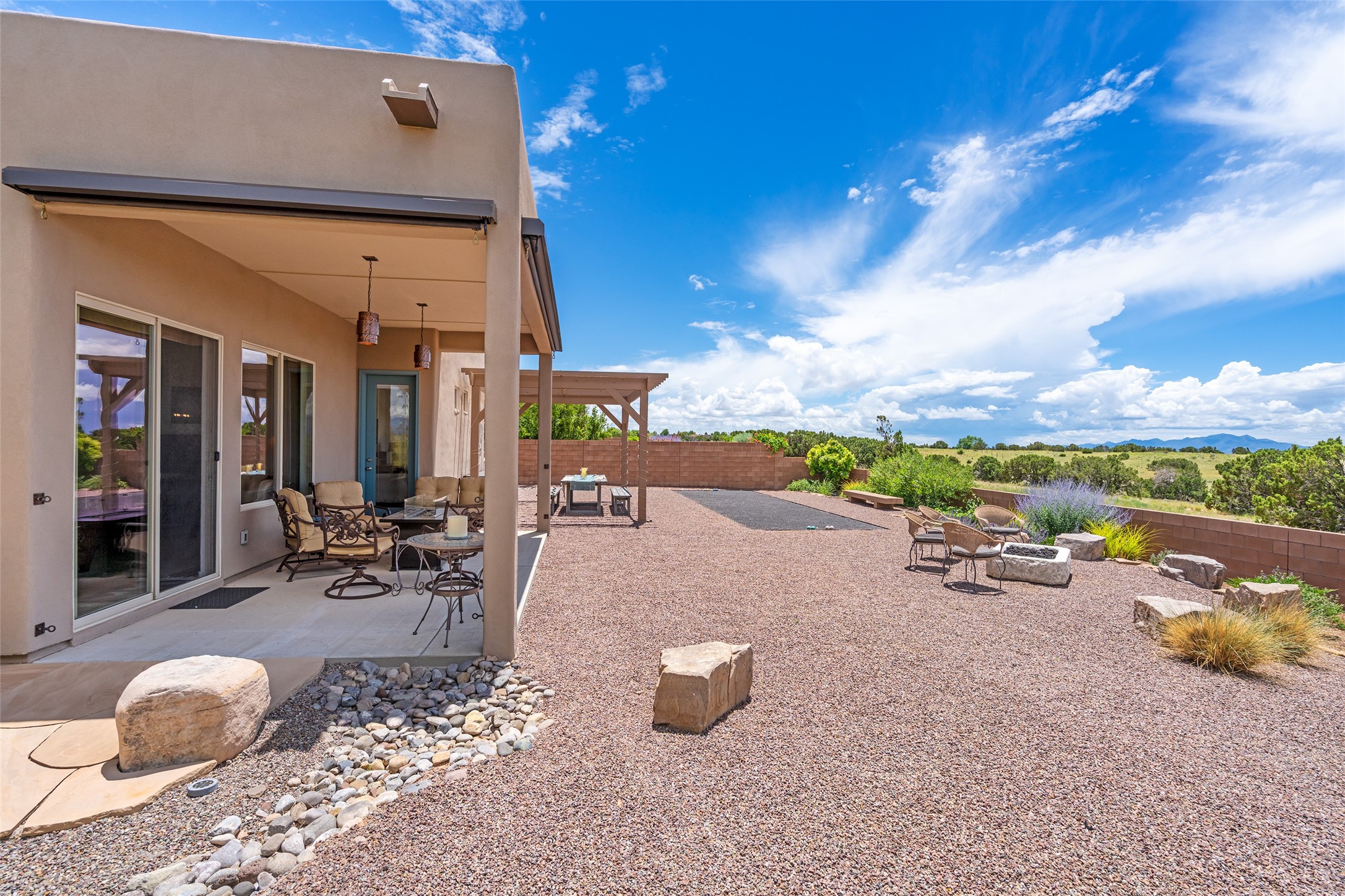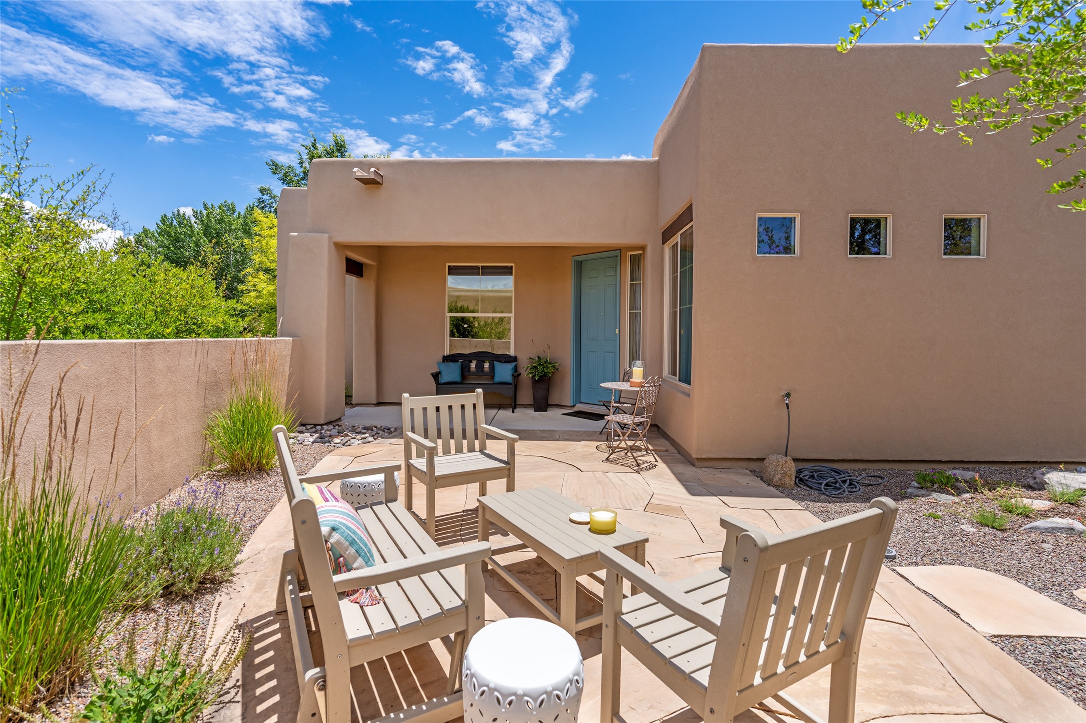 Welcome to 40 Via Punto Nuevo, a thoughtfully designed 3-bedroom, 2-bath home nestled in the heart of Rancho Viejo. This charming residence exudes classic Santa Fe style, with high ceilings adorned with vigas, and abundant natural light from well-placed skylights. The living room features a traditional Kiva fireplace,--perfect for quiet evenings. The open-concept kitchen is ideal for entertaining, with granite countertops, GE Profile and LG appliances, and ample storage. Set on a premium lot, the home backs to an open space with scenic walking trails and fronts a tranquil park, creating a private and picturesque setting. Enjoy true indoor-outdoor living with over 550 square feet of covered front and rear portals, a fully walled backyard, and a welcoming front courtyard. This one owner beauty features instant hot water and a two-car garage. Located in a vibrant community with access to parks, trails, sports courts, and a nearby commercial plaza, this home blends Southwest warmth with modern comfort--truly the best of Santa Fe living.