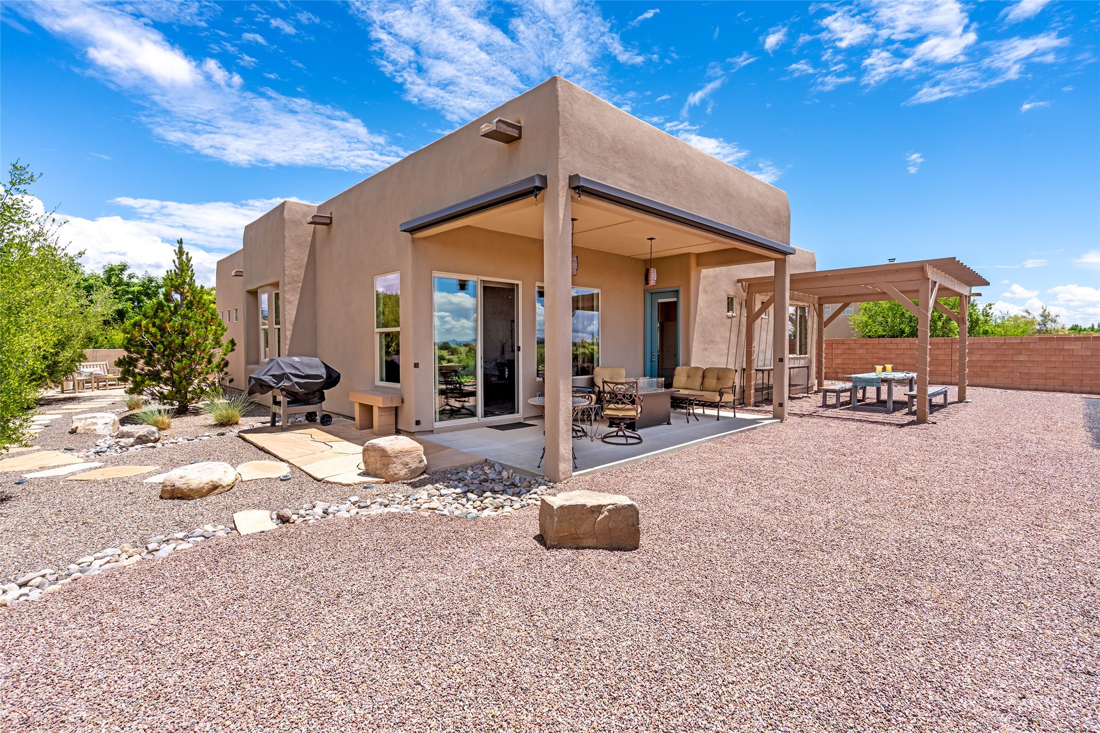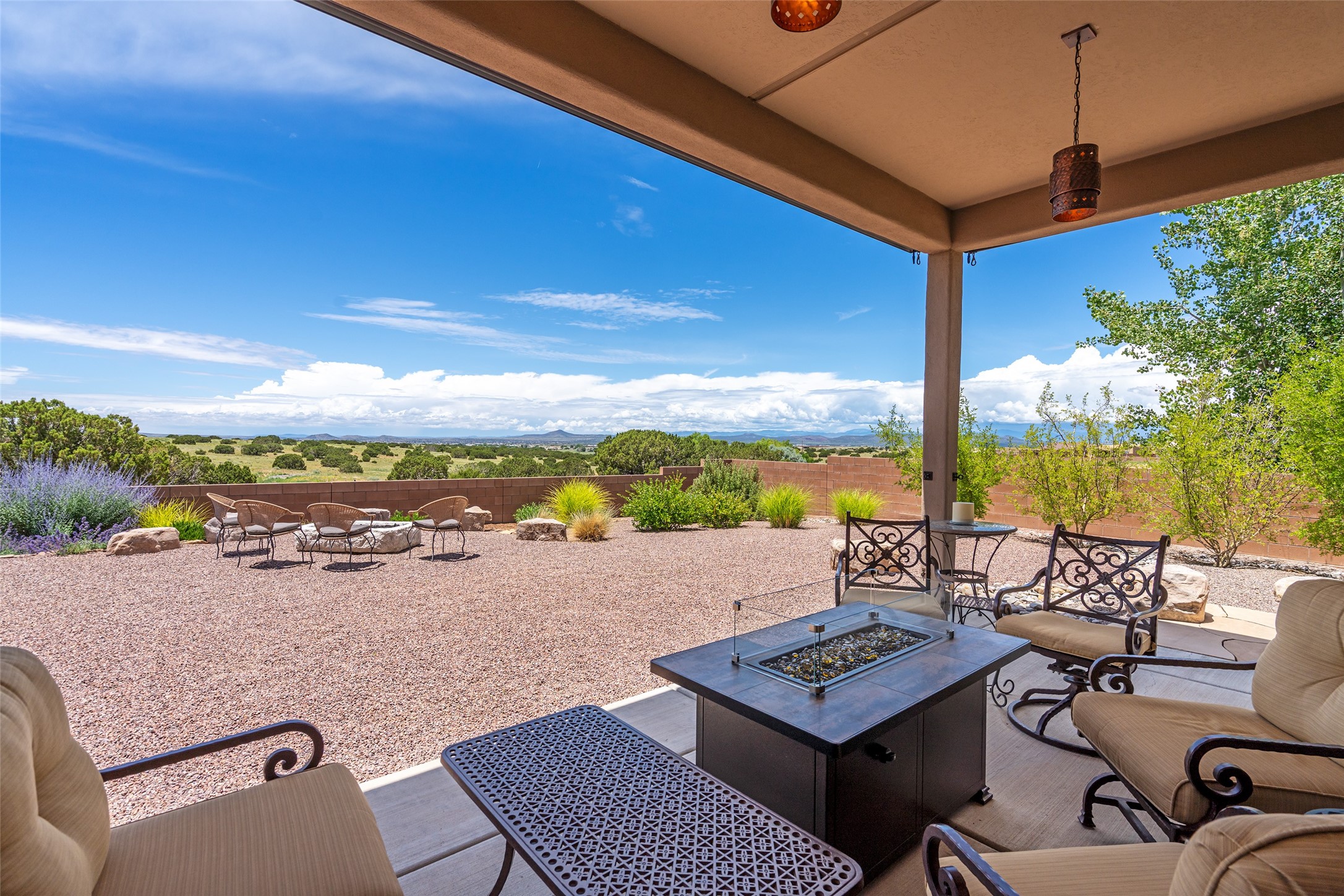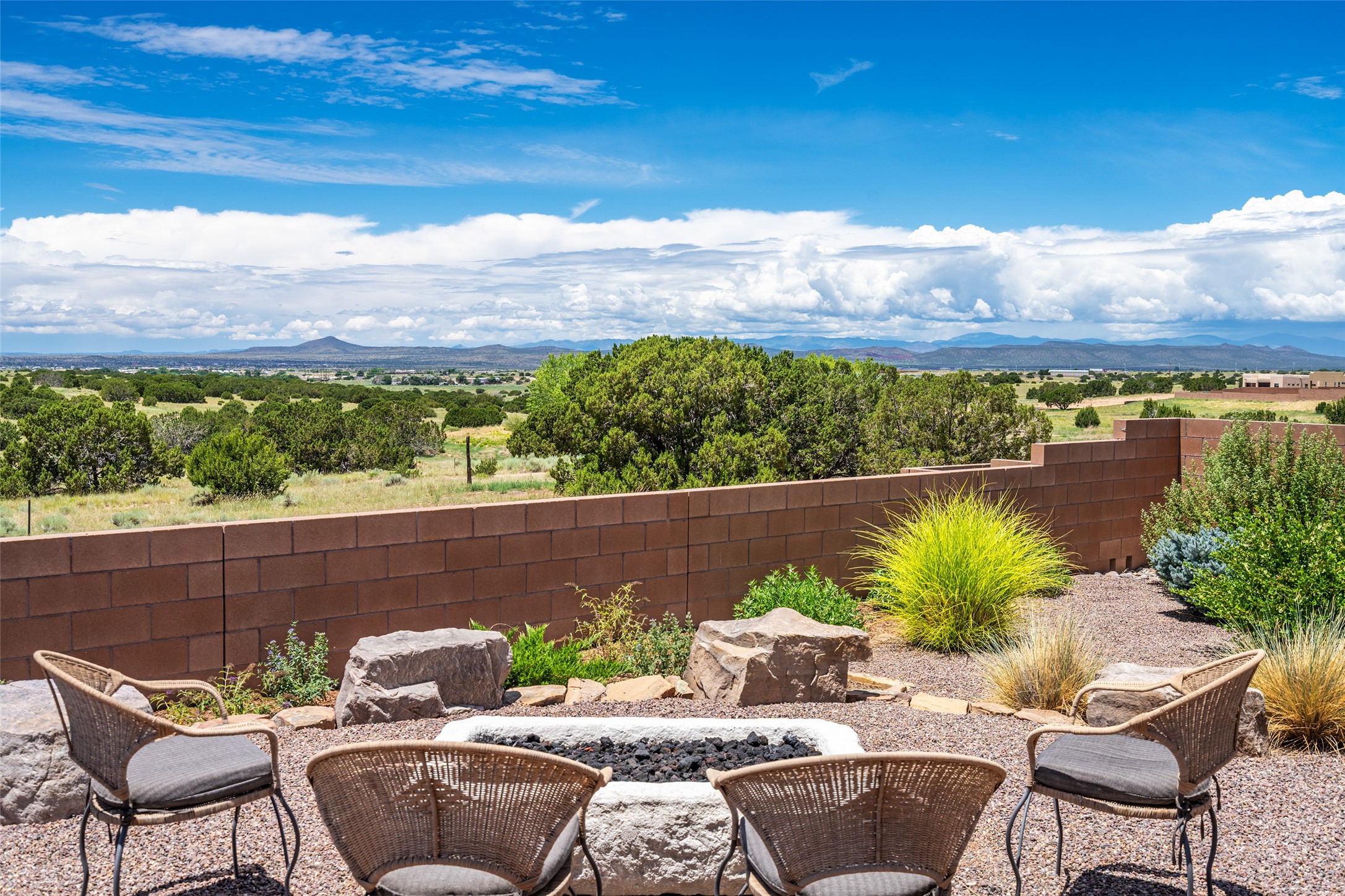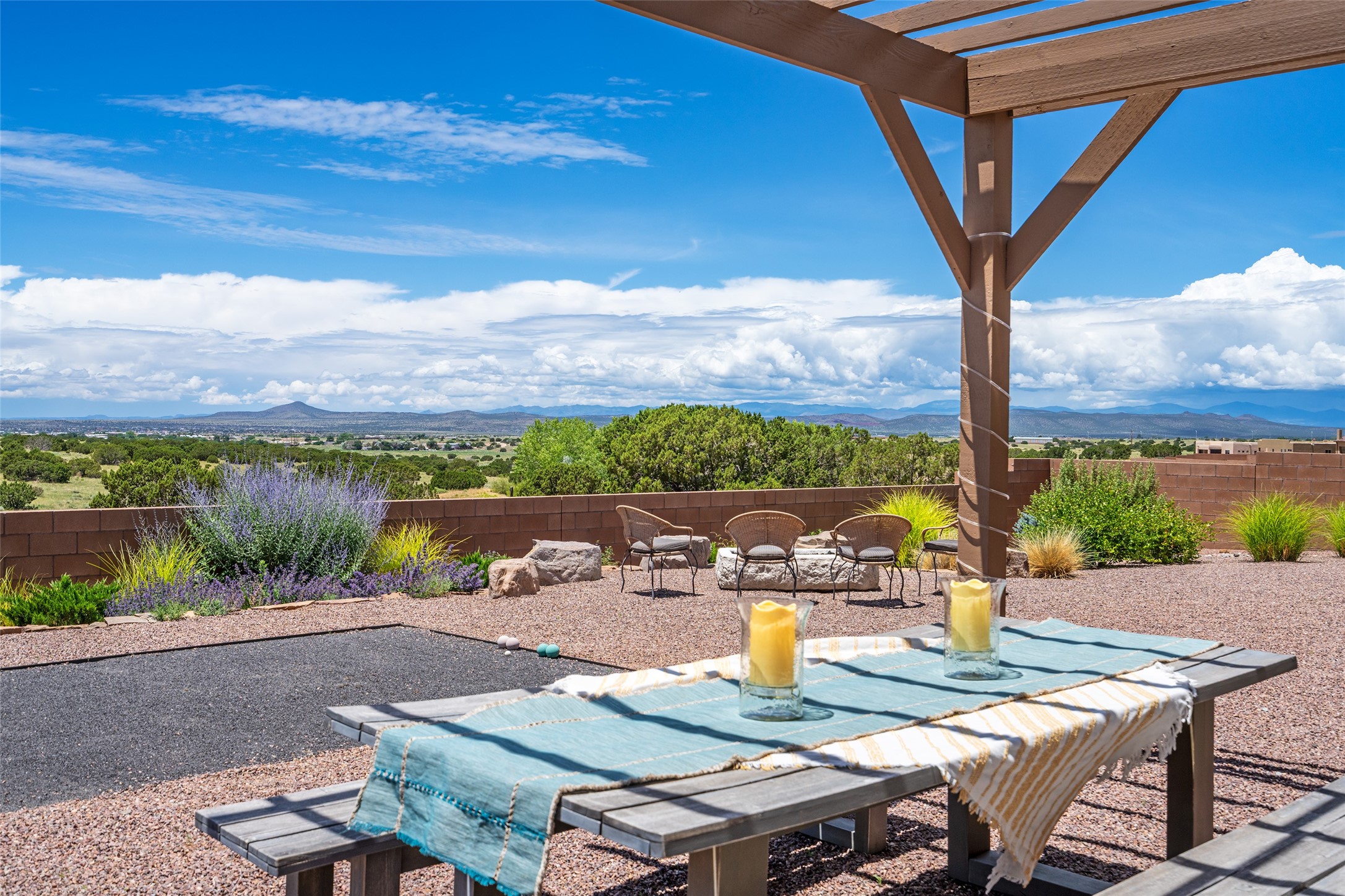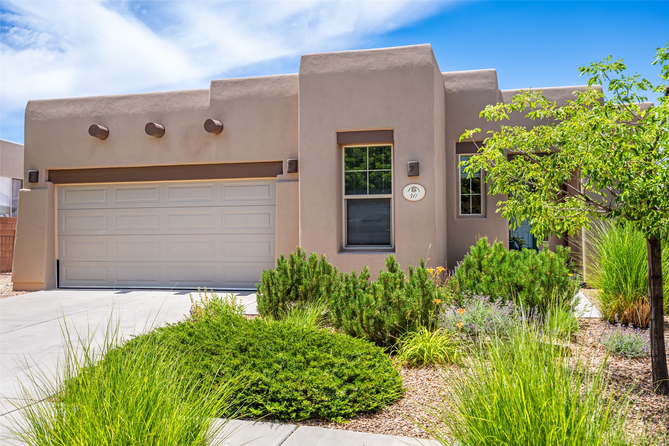 Welcome to 40 Via Punto Nuevo, a thoughtfully designed 3-bedroom, 2-bath home nestled in the heart of Rancho Viejo. This charming residence exudes classic Santa Fe style, with high ceilings adorned with vigas, and abundant natural light from well-placed skylights. The living room features a traditional Kiva fireplace,--perfect for quiet evenings. The open-concept kitchen is ideal for entertaining, with granite countertops, GE Profile and LG appliances, and ample storage. Set on a premium lot, the home backs to an open space with scenic walking trails and fronts a tranquil park, creating a private and picturesque setting. Enjoy true indoor-outdoor living with over 550 square feet of covered front and rear portals, a fully walled backyard, and a welcoming front courtyard. This one owner beauty features instant hot water and a two-car garage. Located in a vibrant community with access to parks, trails, sports courts, and a nearby commercial plaza, this home blends Southwest warmth with modern comfort--truly the best of Santa Fe living.