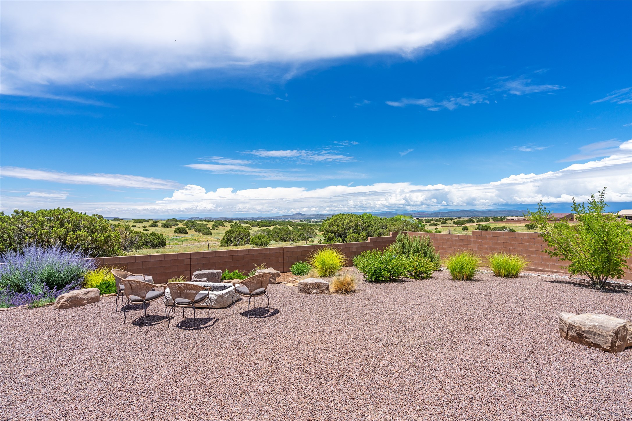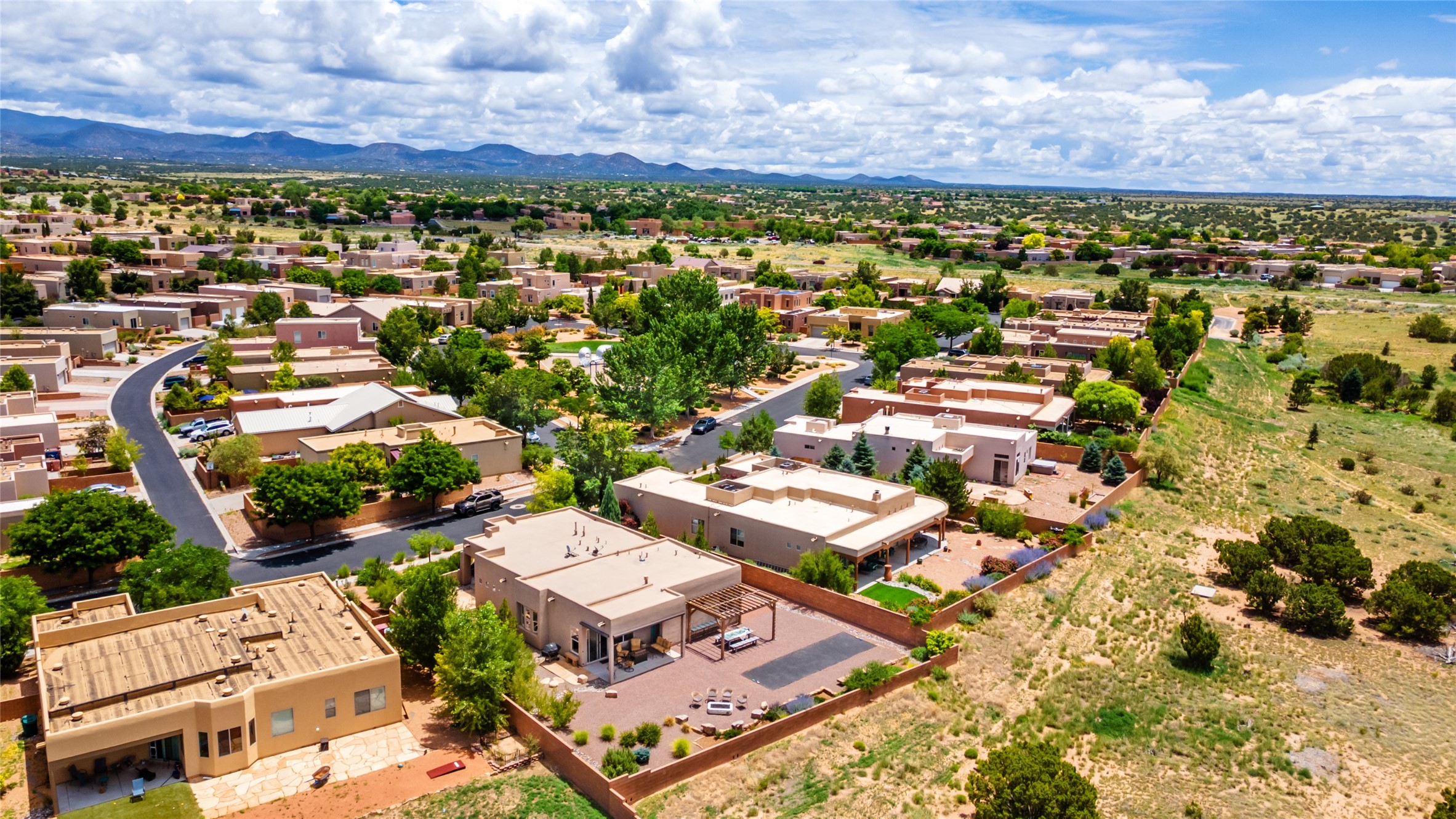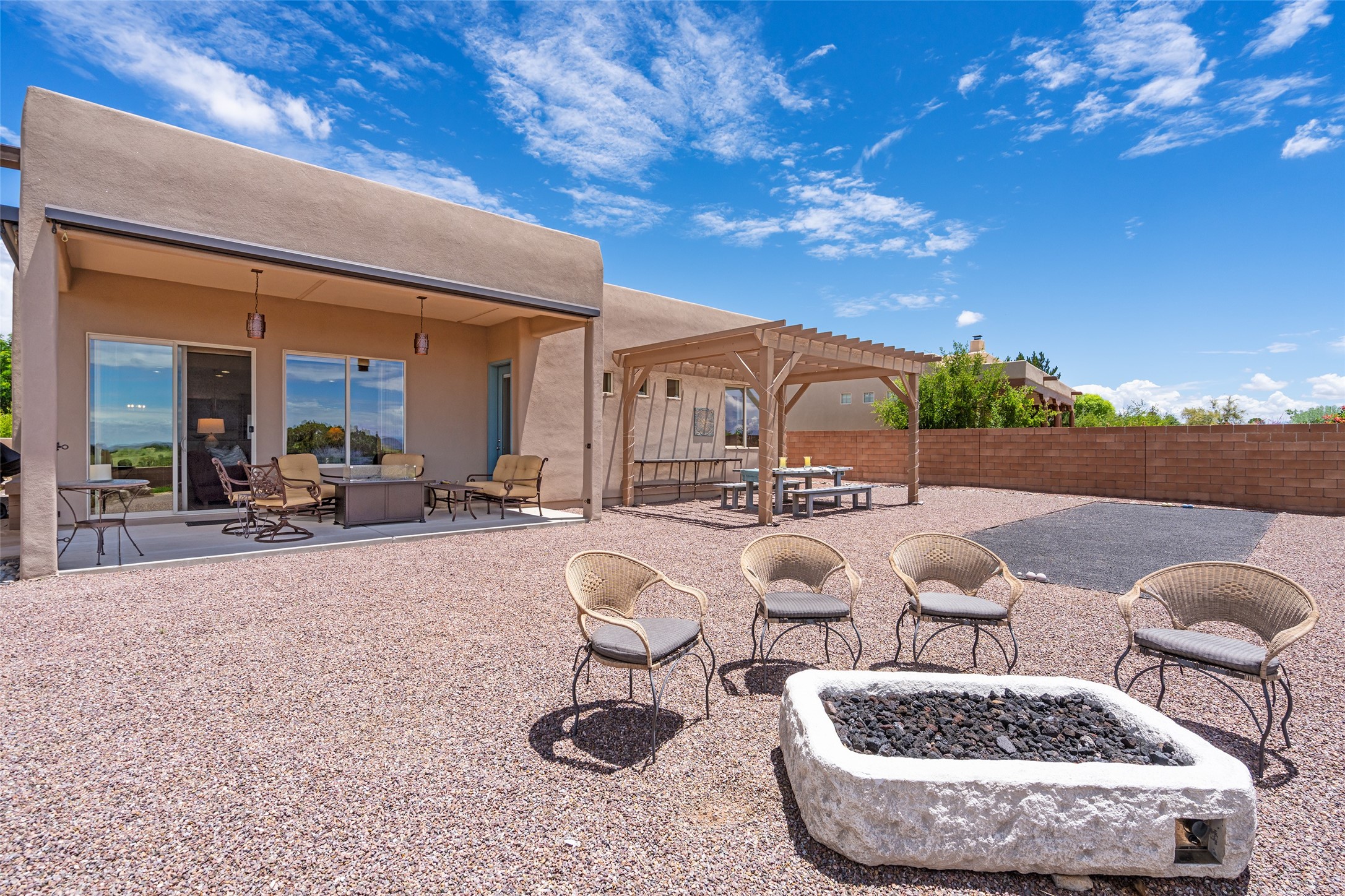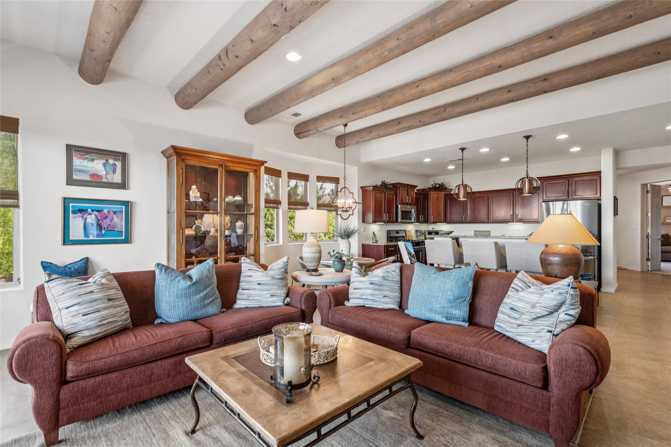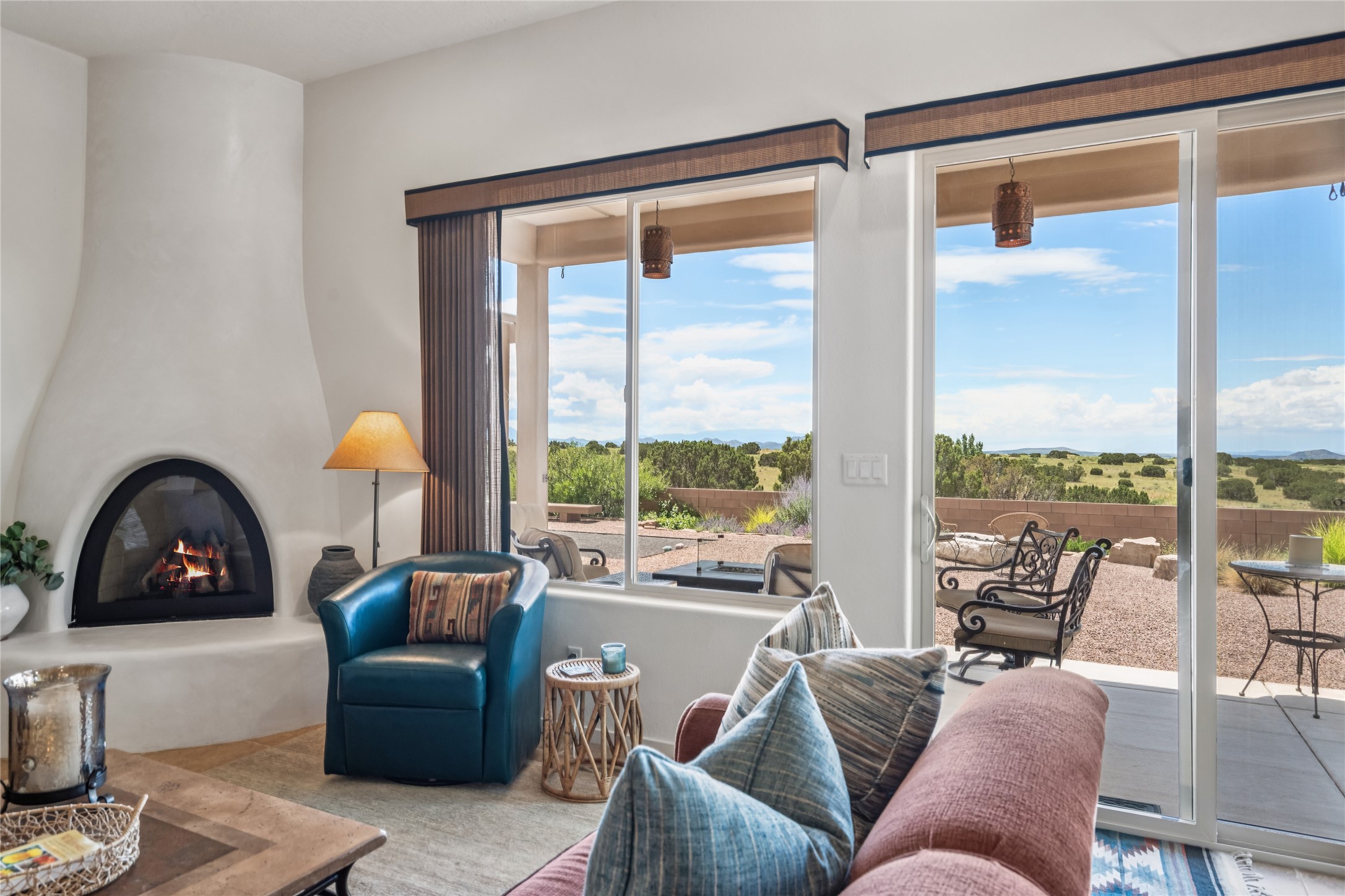 Welcome to 40 Via Punto Nuevo, a thoughtfully designed 3-bedroom, 2-bath home nestled in the heart of Rancho Viejo. This charming residence exudes classic Santa Fe style, with high ceilings adorned with vigas, and abundant natural light from well-placed skylights. The living room features a traditional Kiva fireplace,--perfect for quiet evenings. The open-concept kitchen is ideal for entertaining, with granite countertops, GE Profile and LG appliances, and ample storage. Set on a premium lot, the home backs to an open space with scenic walking trails and fronts a tranquil park, creating a private and picturesque setting. Enjoy true indoor-outdoor living with over 550 square feet of covered front and rear portals, a fully walled backyard, and a welcoming front courtyard. This one owner beauty features instant hot water and a two-car garage. Located in a vibrant community with access to parks, trails, sports courts, and a nearby commercial plaza, this home blends Southwest warmth with modern comfort--truly the best of Santa Fe living.