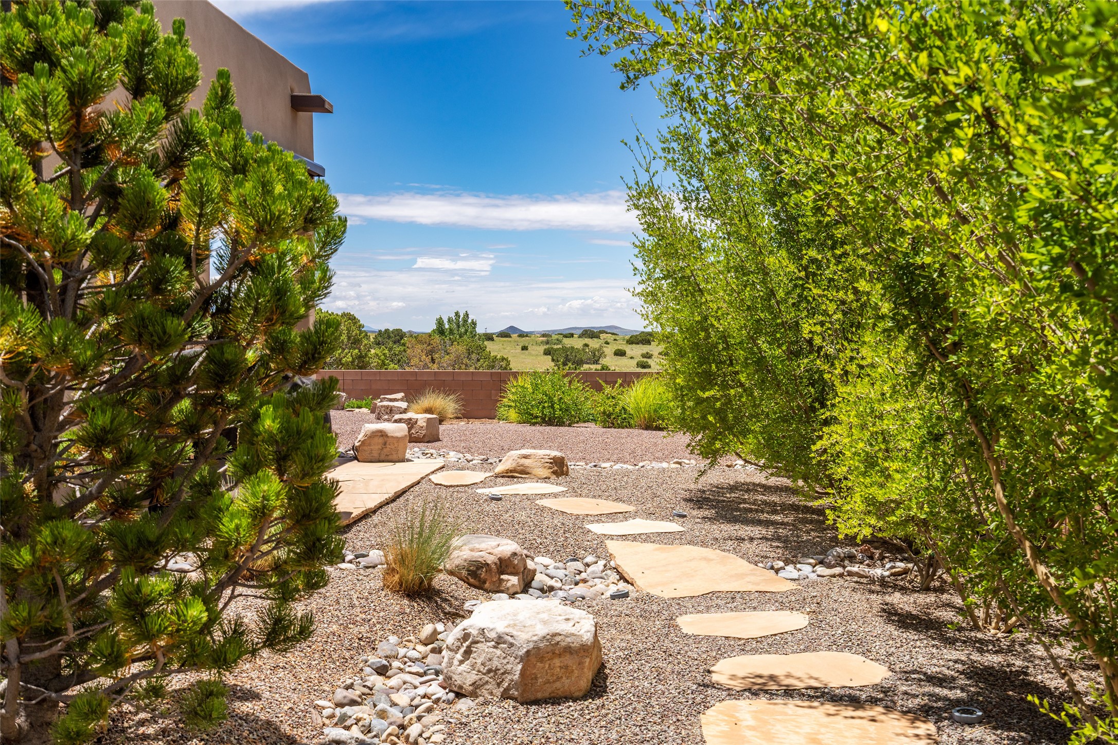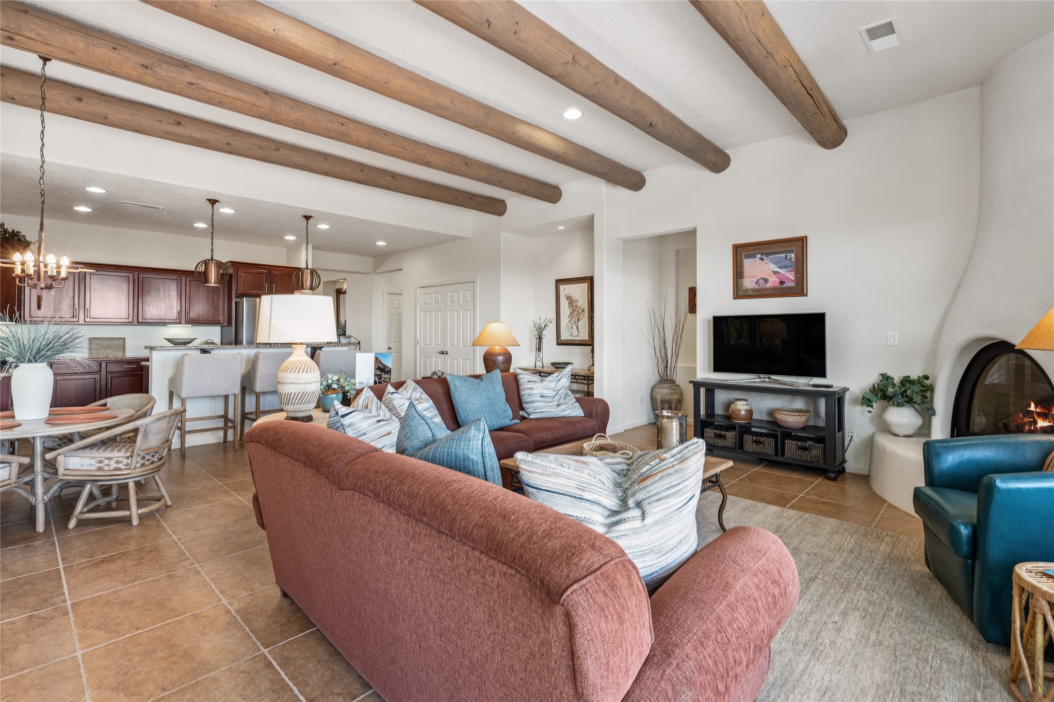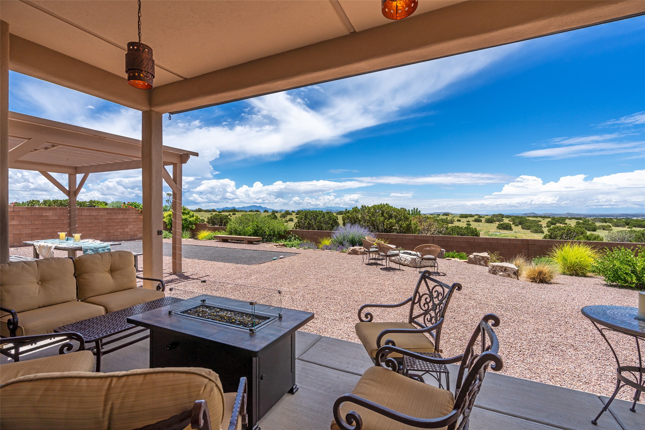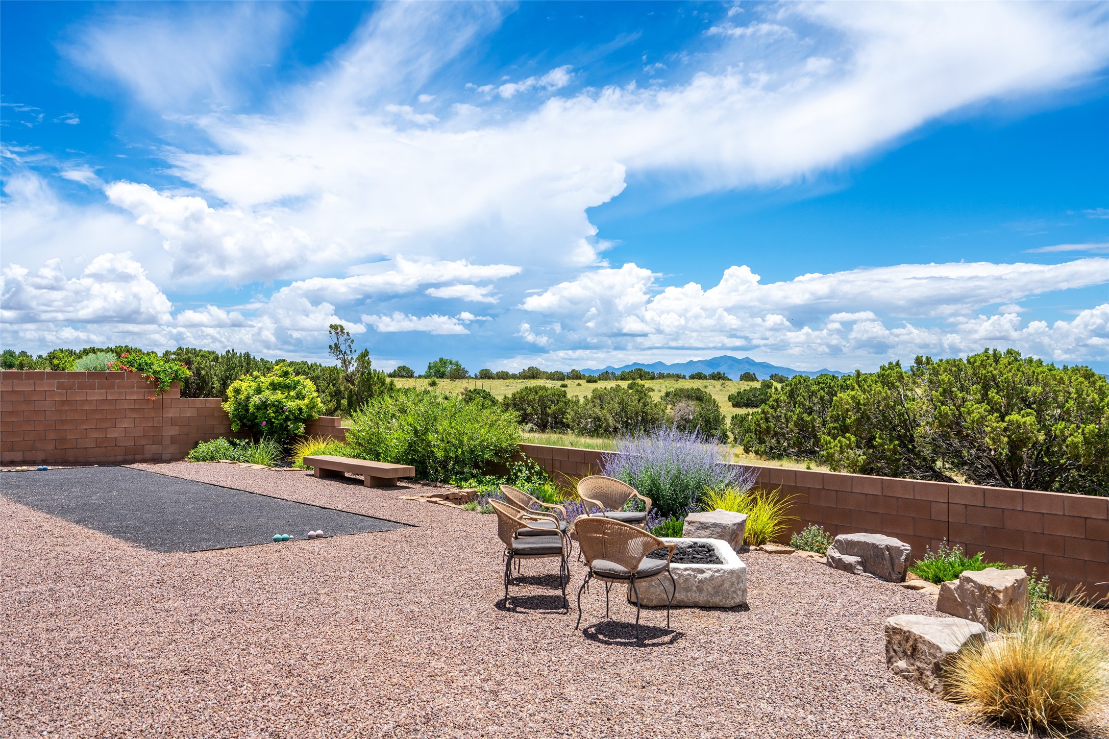Welcome to 40 Via Punto Nuevo, a thoughtfully designed 3-bedroom, 2-bath home nestled in the heart of Rancho Viejo. This charming residence exudes classic Santa Fe style, with high ceilings adorned with vigas, and abundant natural light from well-placed skylights. The living room features a traditional Kiva fireplace,--perfect for quiet evenings. The open-concept kitchen is ideal for entertaining, with granite countertops, GE Profile and LG appliances, and ample storage. Set on a premium lot, the home backs to an open space with scenic walking trails and fronts a tranquil park, creating a private and picturesque setting. Enjoy true indoor-outdoor living with over 550 square feet of covered front and rear portals, a fully walled backyard, and a welcoming front courtyard. This one owner beauty features instant hot water and a two-car garage. Located in a vibrant community with access to parks, trails, sports courts, and a nearby commercial plaza, this home blends Southwest warmth with modern comfort--truly the best of Santa Fe living.