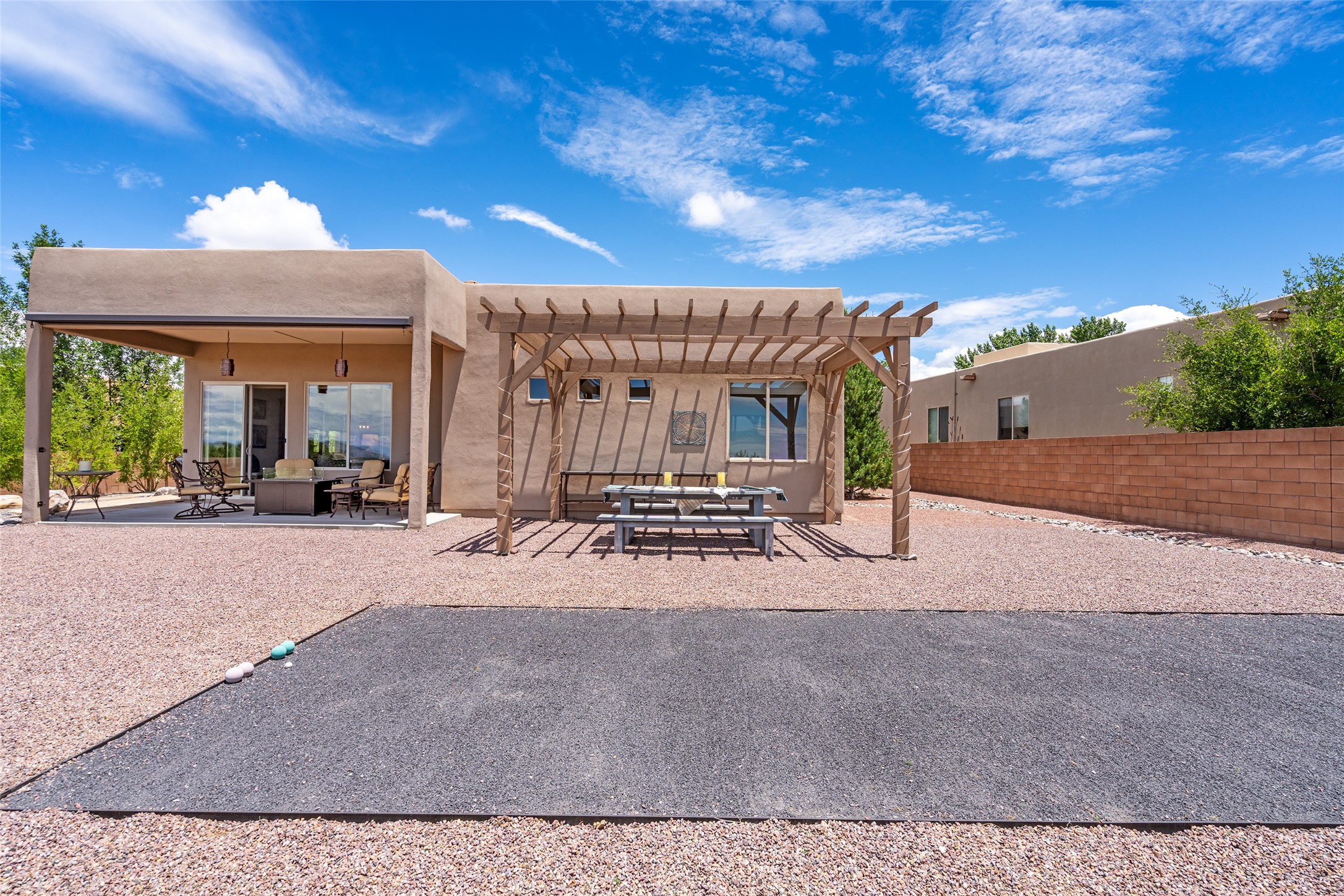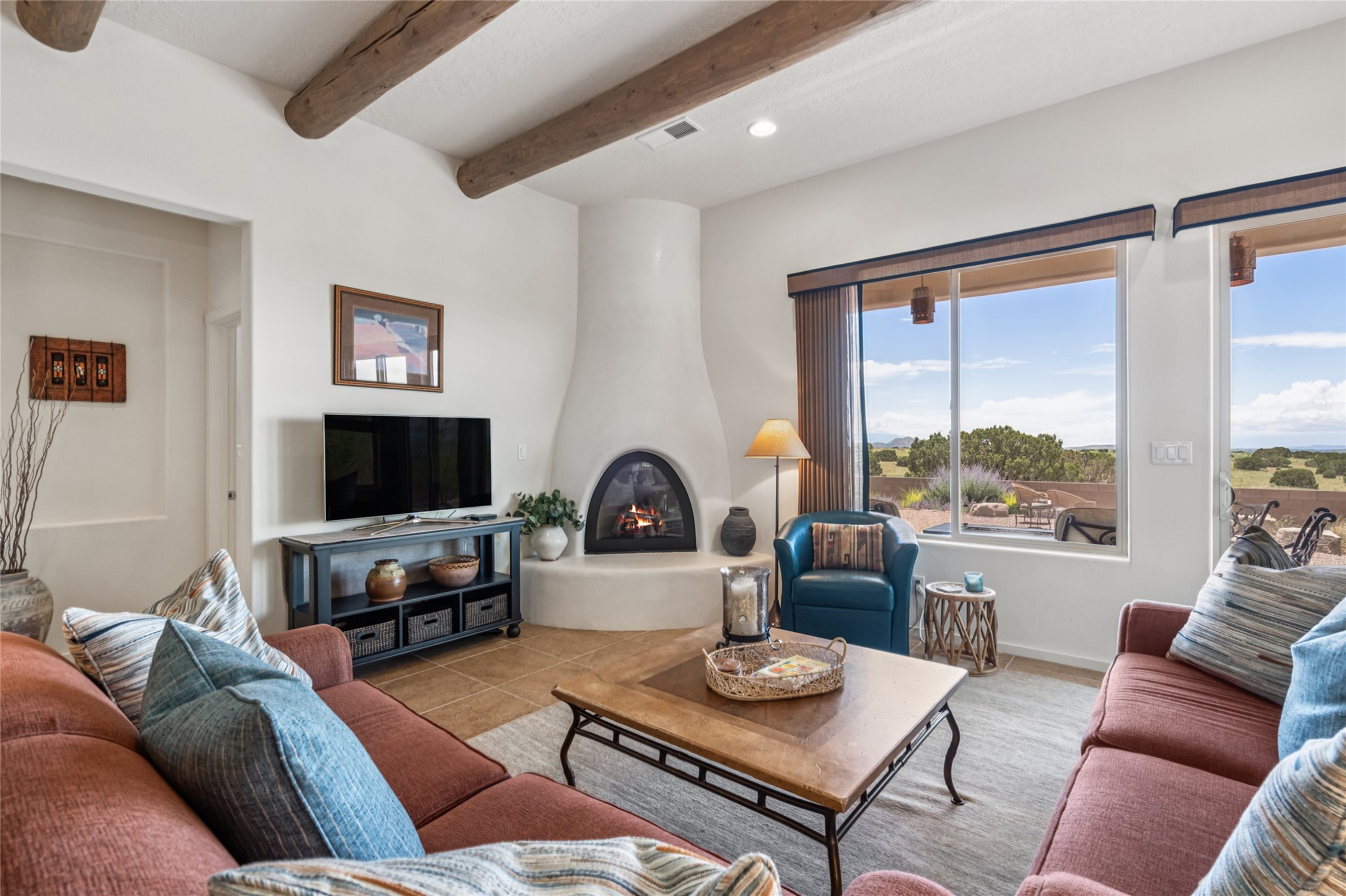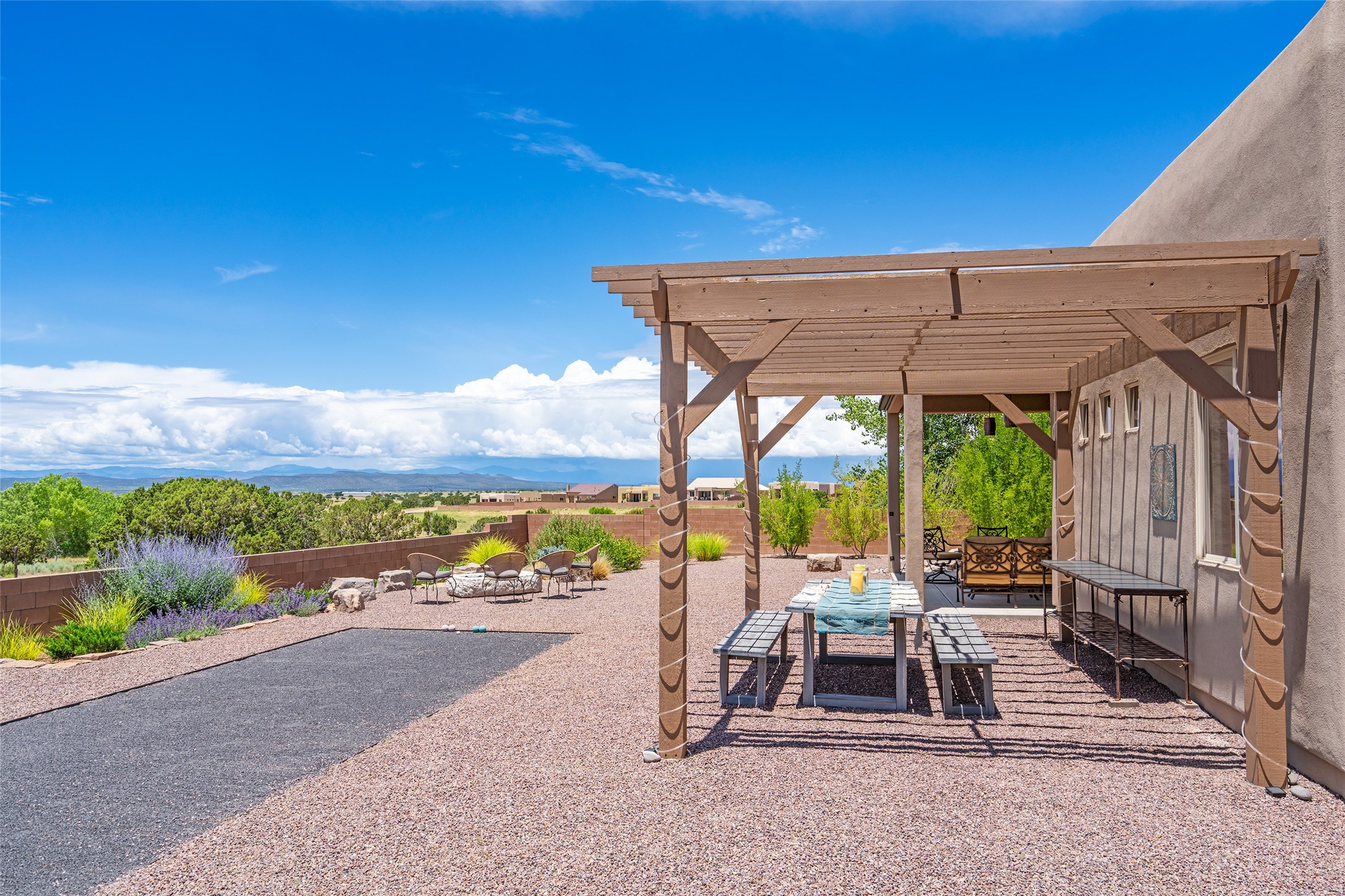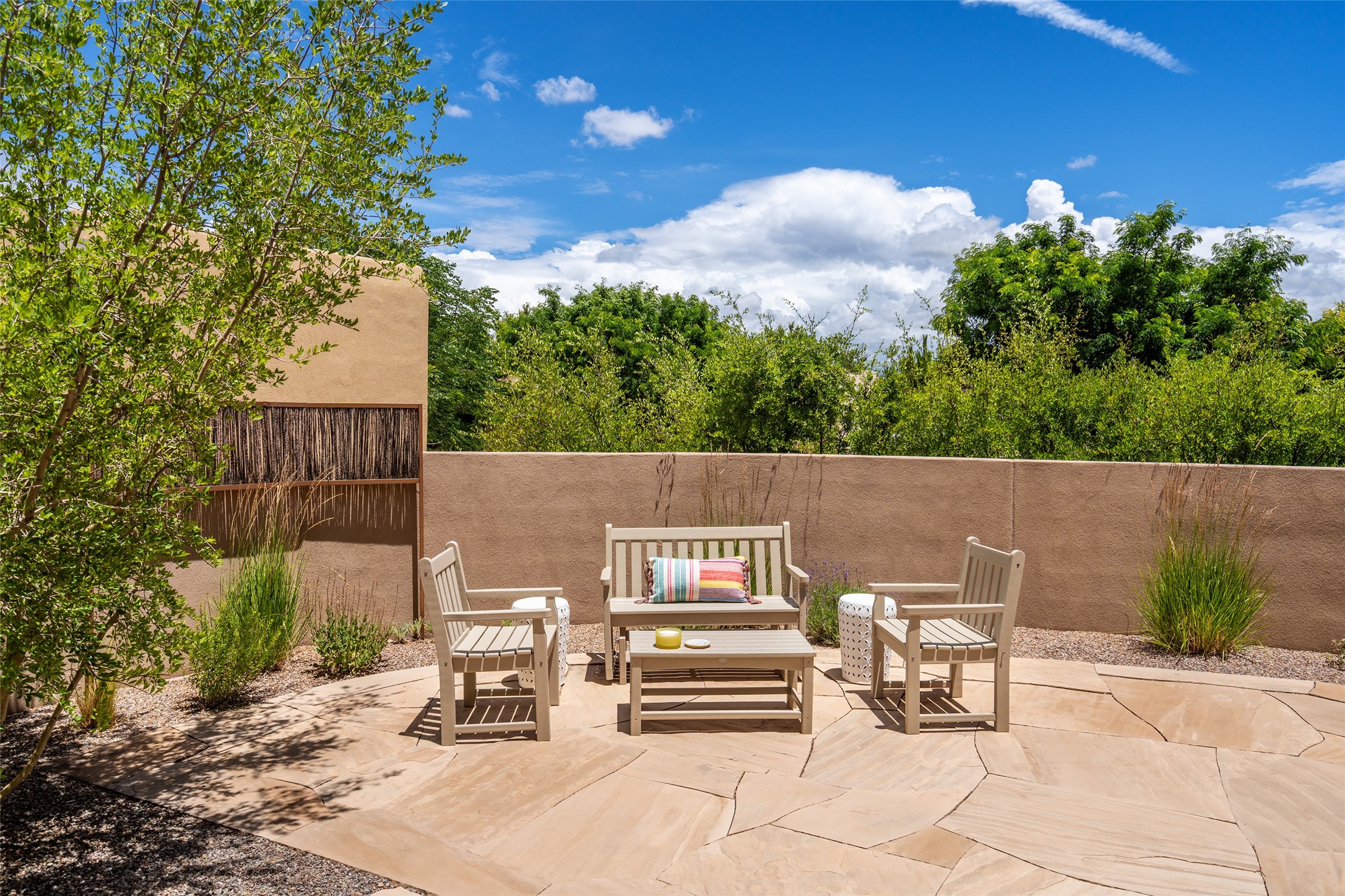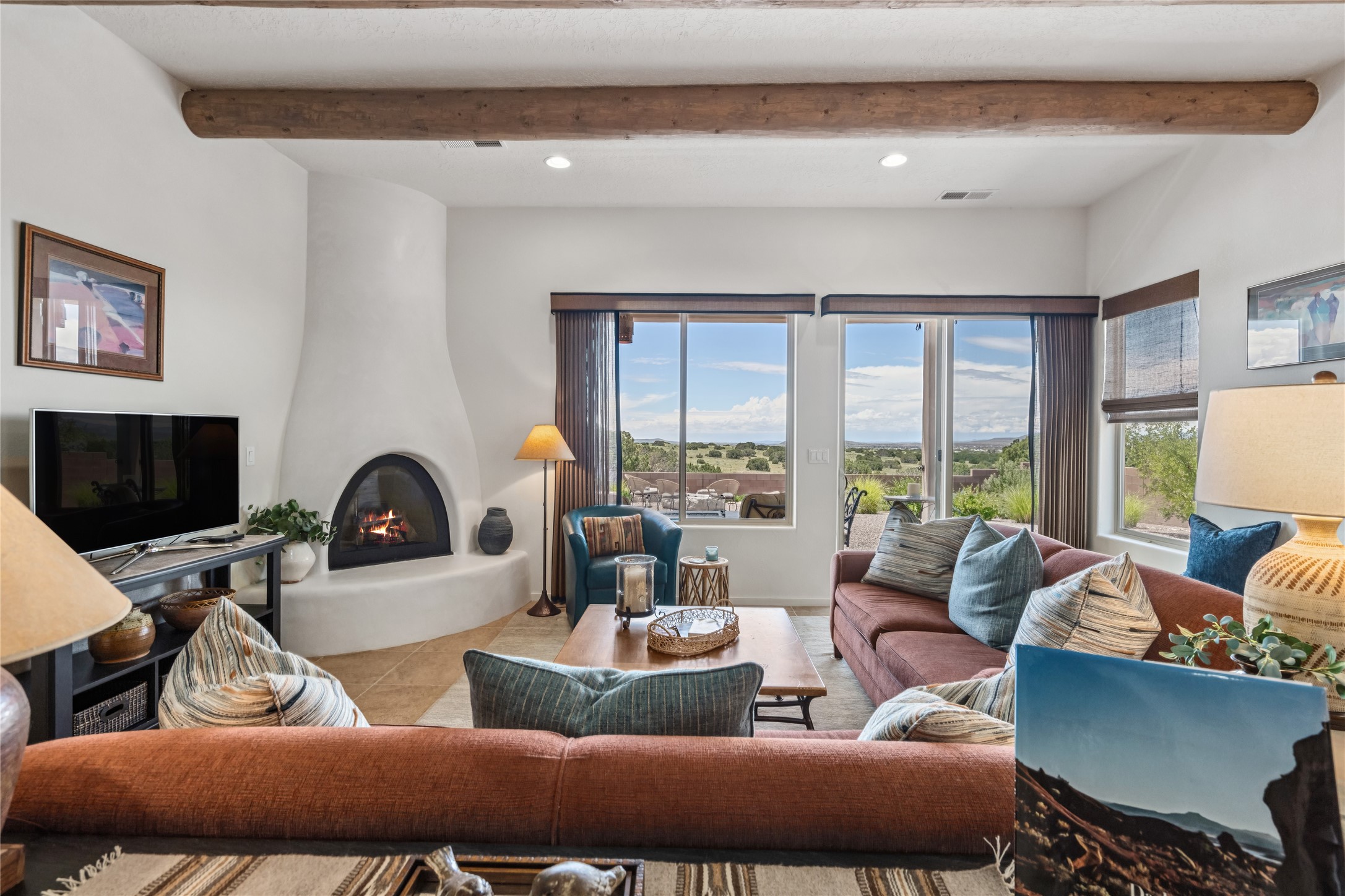 Welcome to 40 Via Punto Nuevo, a thoughtfully designed 3-bedroom, 2-bath home nestled in the heart of Rancho Viejo. This charming residence exudes classic Santa Fe style, with high ceilings adorned with vigas, and abundant natural light from well-placed skylights. The living room features a traditional Kiva fireplace,--perfect for quiet evenings. The open-concept kitchen is ideal for entertaining, with granite countertops, GE Profile and LG appliances, and ample storage. Set on a premium lot, the home backs to an open space with scenic walking trails and fronts a tranquil park, creating a private and picturesque setting. Enjoy true indoor-outdoor living with over 550 square feet of covered front and rear portals, a fully walled backyard, and a welcoming front courtyard. This one owner beauty features instant hot water and a two-car garage. Located in a vibrant community with access to parks, trails, sports courts, and a nearby commercial plaza, this home blends Southwest warmth with modern comfort--truly the best of Santa Fe living.