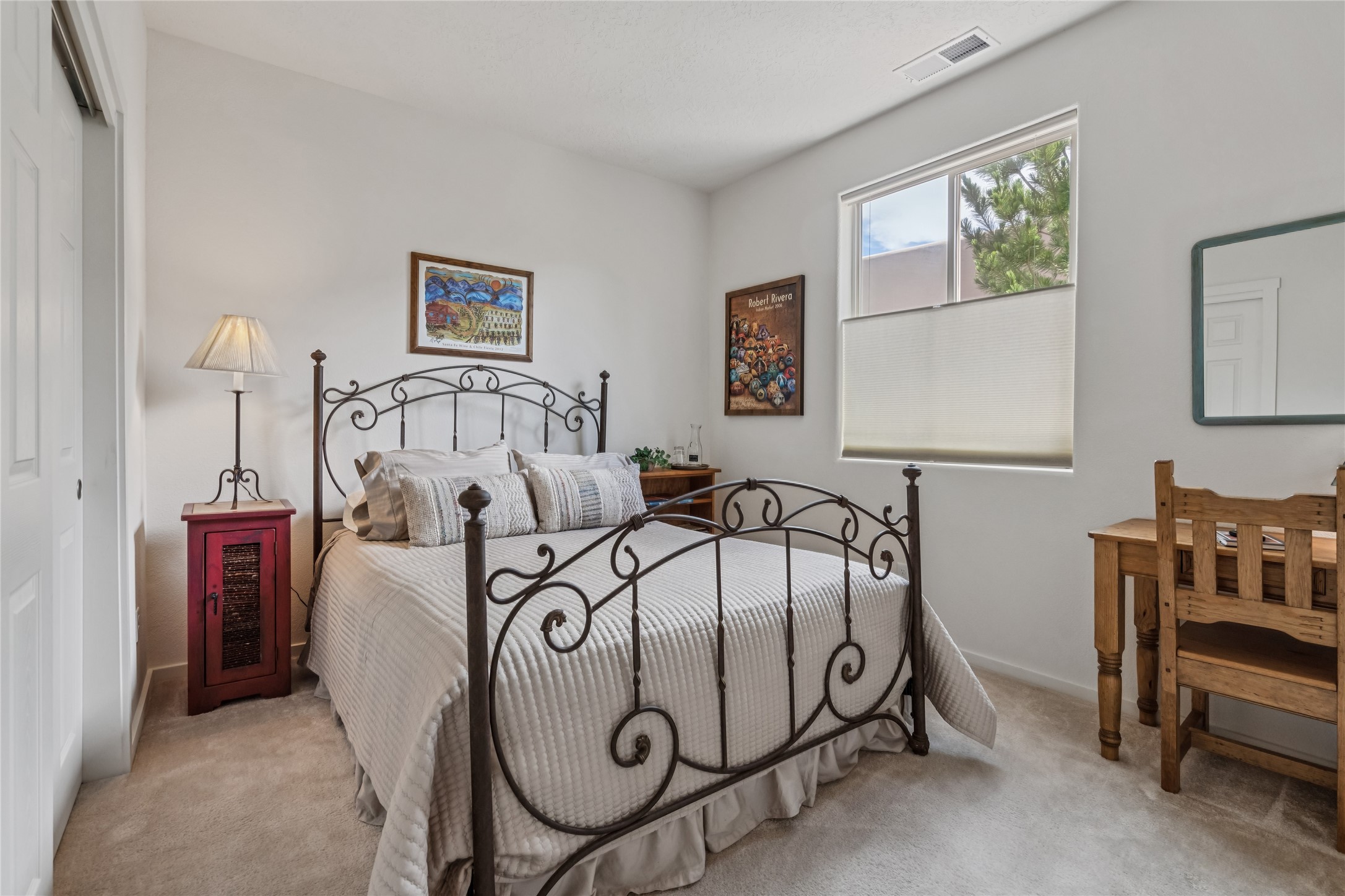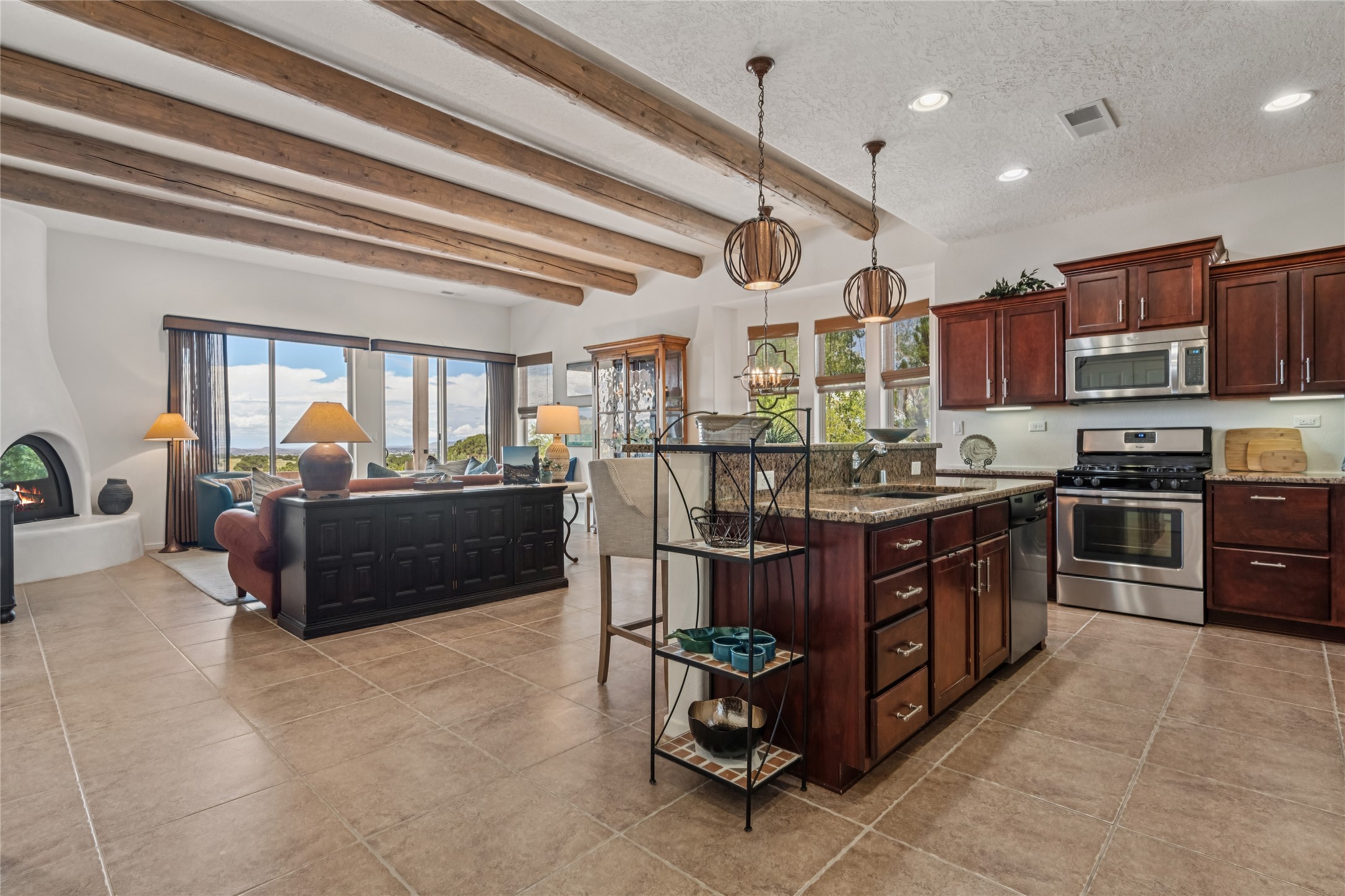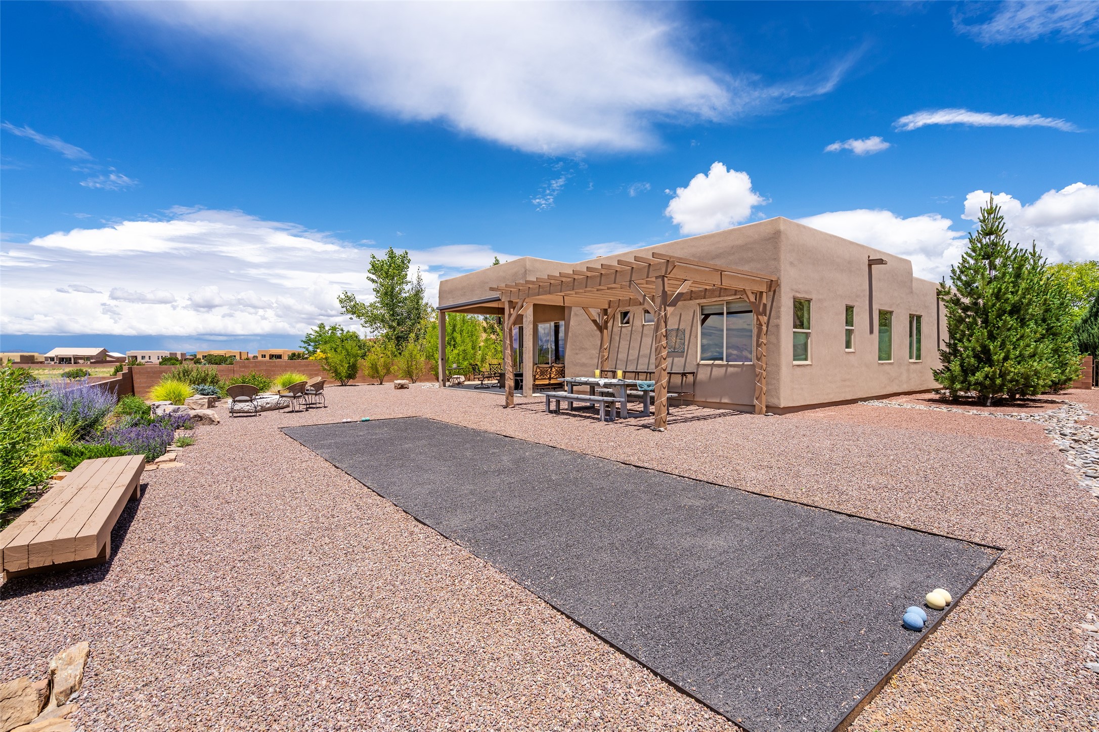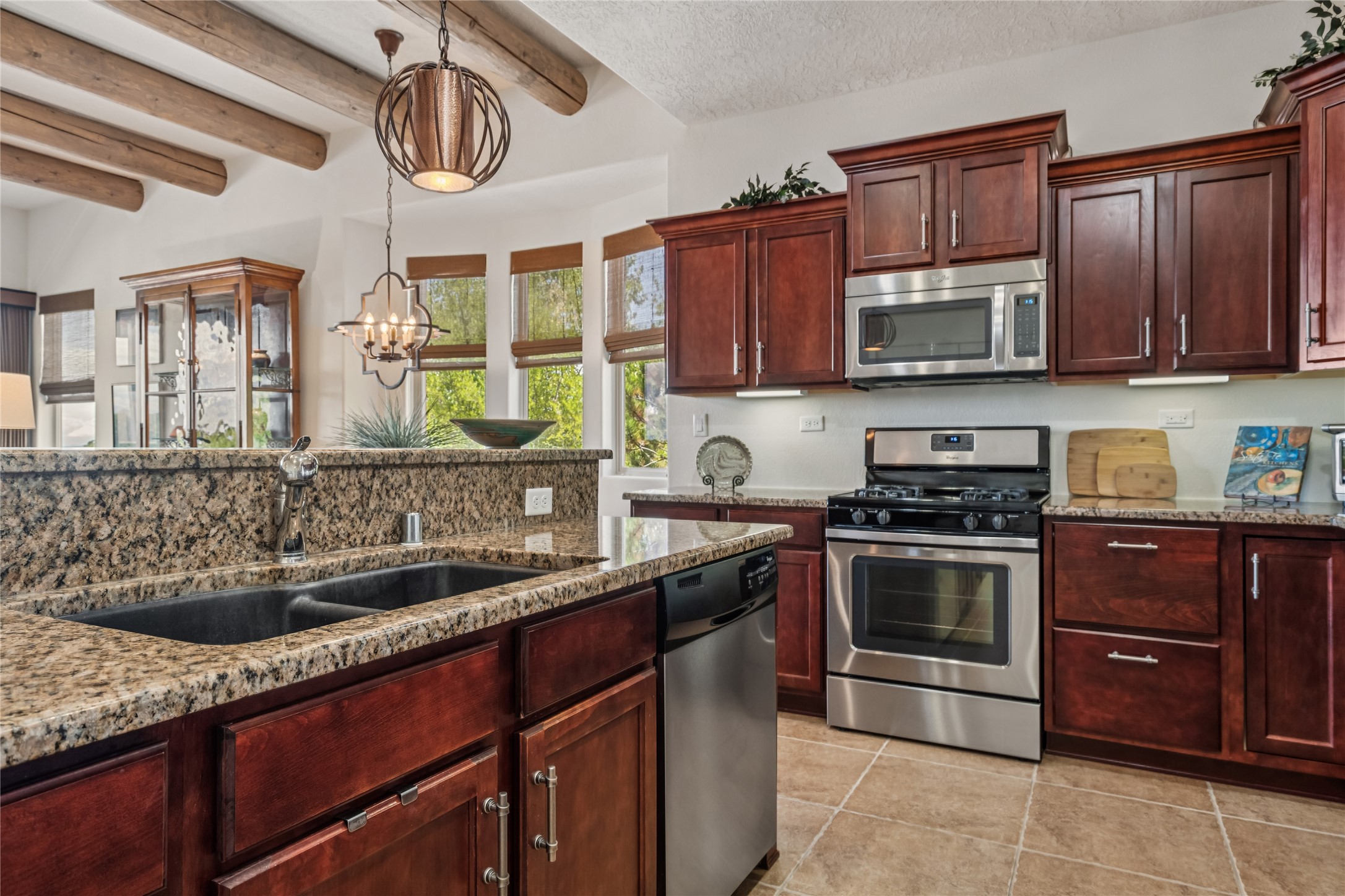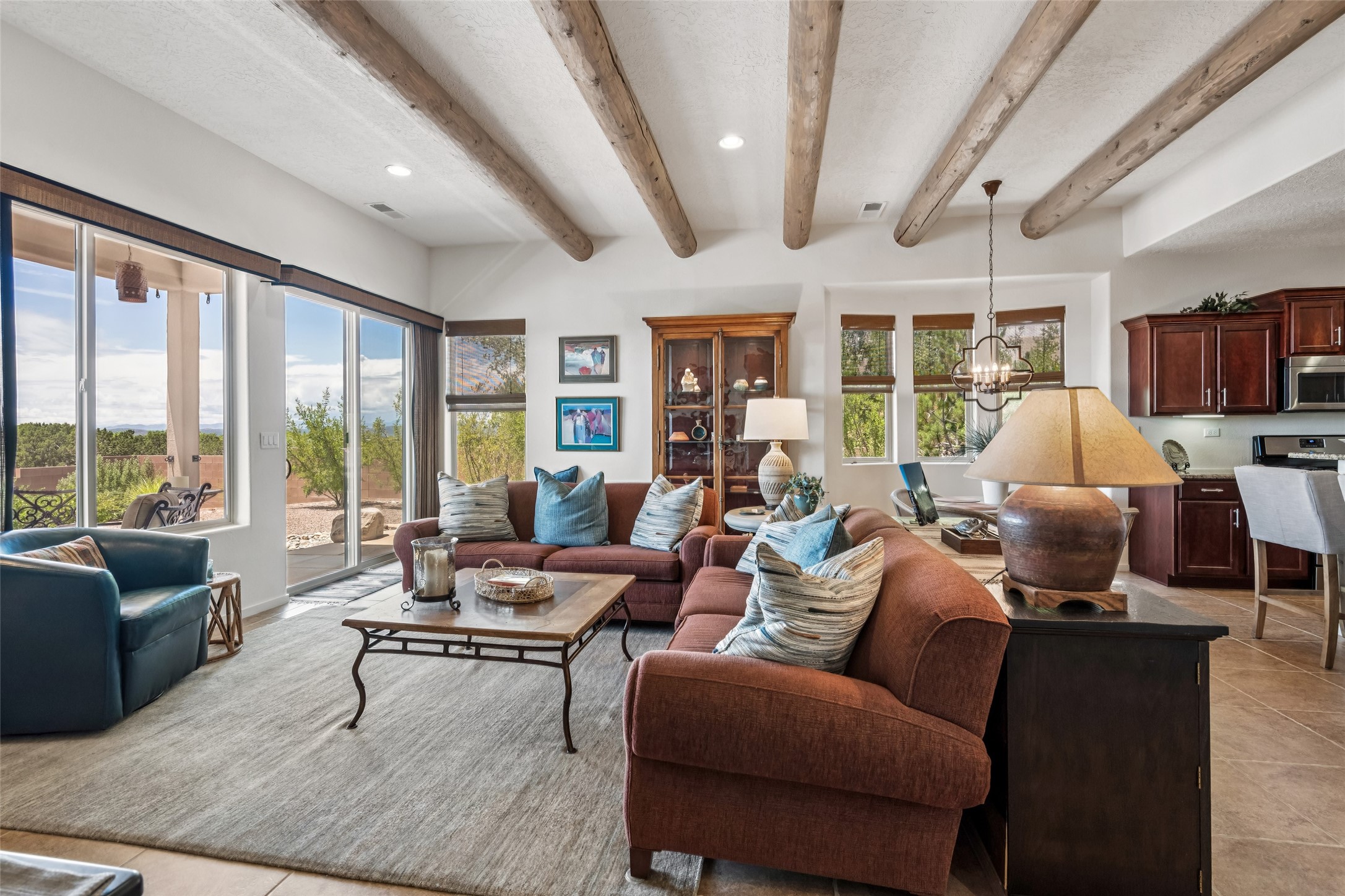 Welcome to 40 Via Punto Nuevo, a thoughtfully designed 3-bedroom, 2-bath home nestled in the heart of Rancho Viejo. This charming residence exudes classic Santa Fe style, with high ceilings adorned with vigas, and abundant natural light from well-placed skylights. The living room features a traditional Kiva fireplace,--perfect for quiet evenings. The open-concept kitchen is ideal for entertaining, with granite countertops, GE Profile and LG appliances, and ample storage. Set on a premium lot, the home backs to an open space with scenic walking trails and fronts a tranquil park, creating a private and picturesque setting. Enjoy true indoor-outdoor living with over 550 square feet of covered front and rear portals, a fully walled backyard, and a welcoming front courtyard. This one owner beauty features instant hot water and a two-car garage. Located in a vibrant community with access to parks, trails, sports courts, and a nearby commercial plaza, this home blends Southwest warmth with modern comfort--truly the best of Santa Fe living.