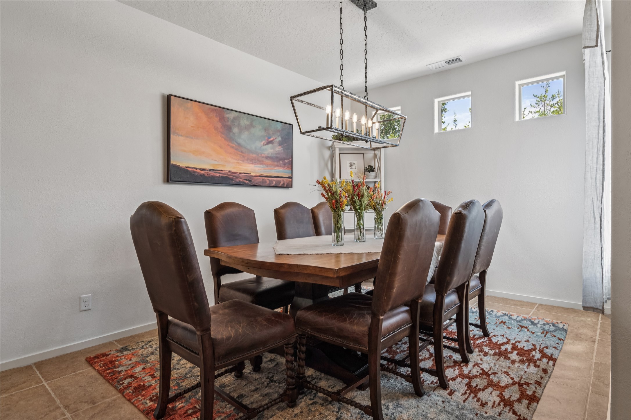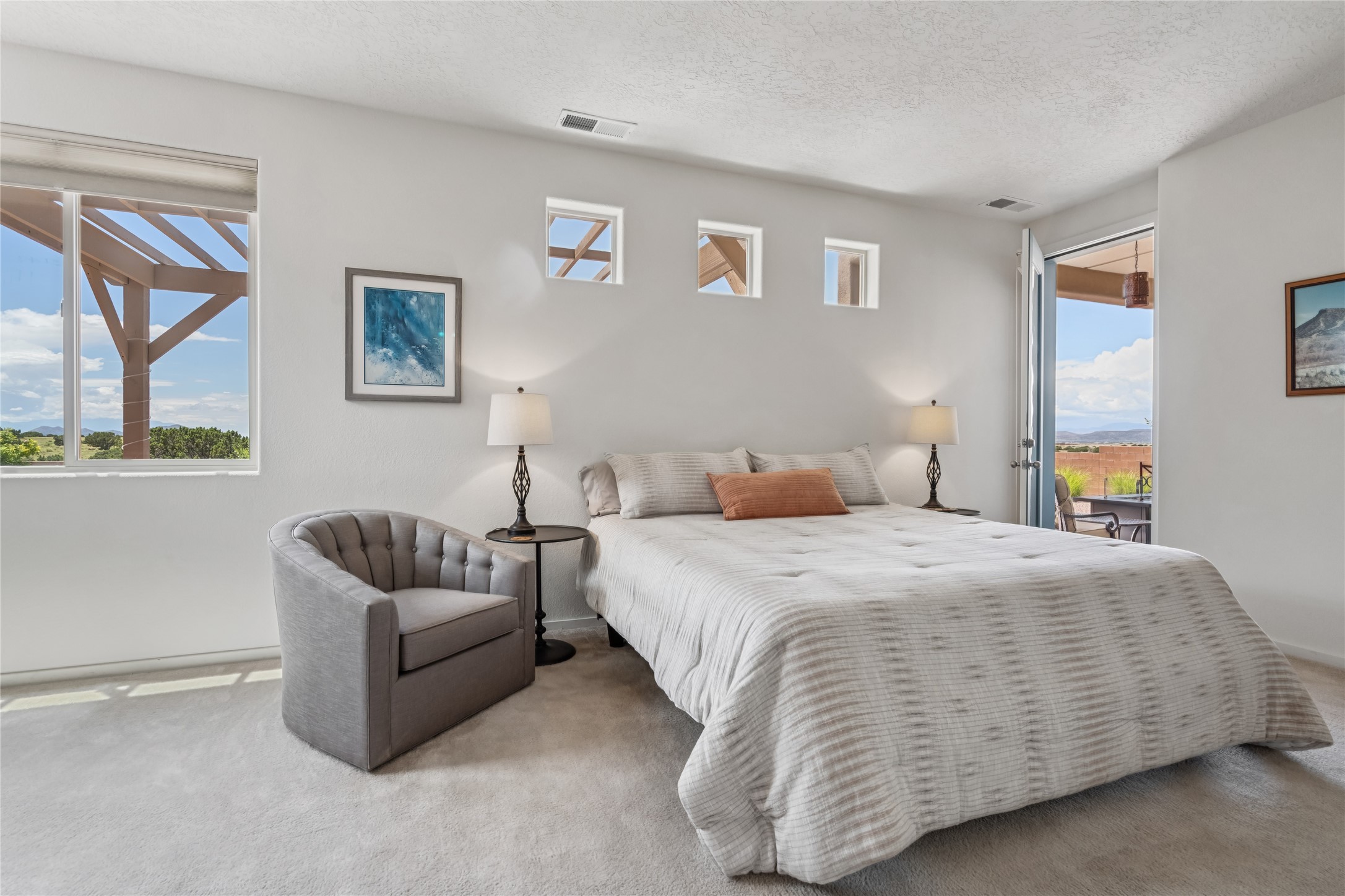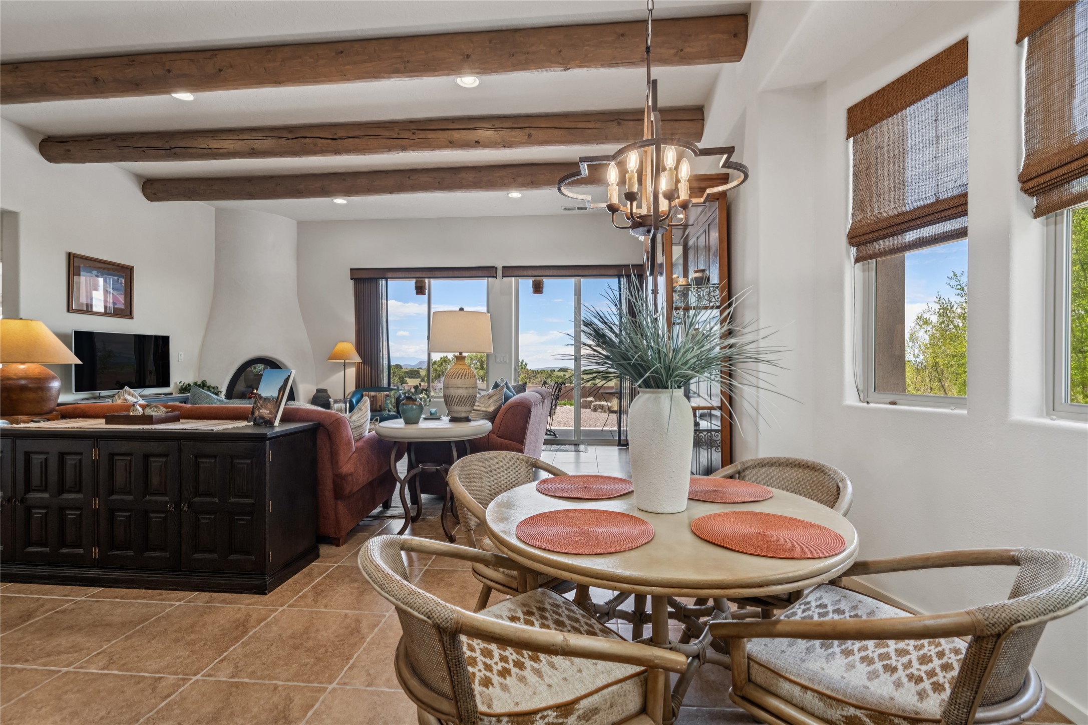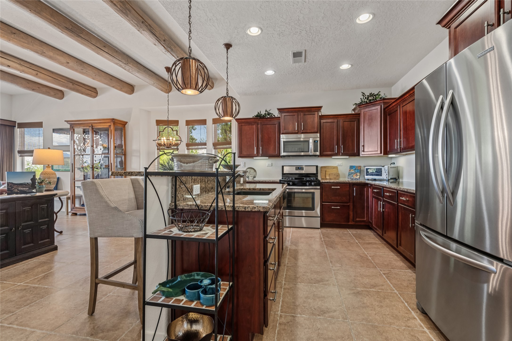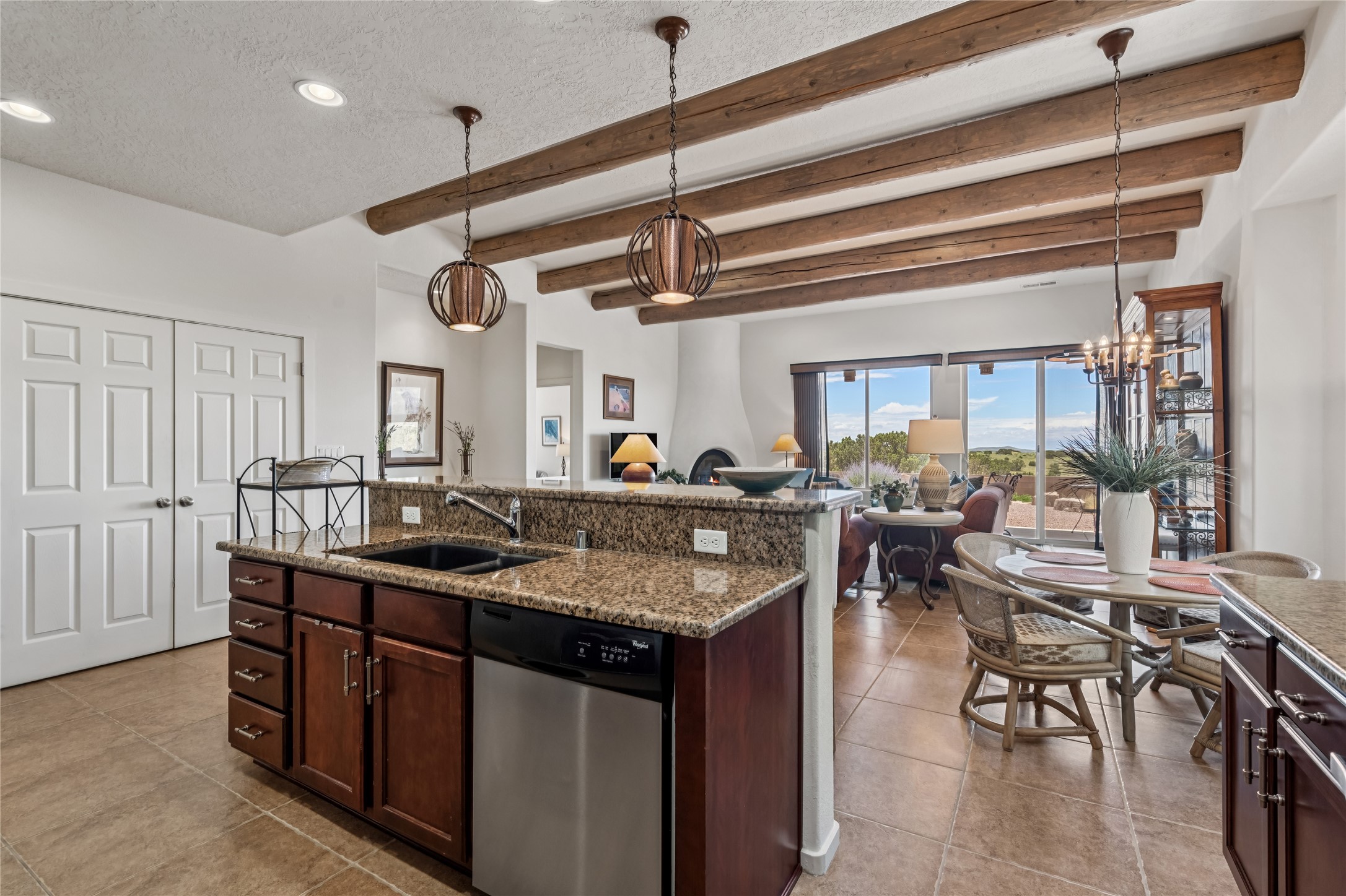 Welcome to 40 Via Punto Nuevo, a thoughtfully designed 3-bedroom, 2-bath home nestled in the heart of Rancho Viejo. This charming residence exudes classic Santa Fe style, with high ceilings adorned with vigas, and abundant natural light from well-placed skylights. The living room features a traditional Kiva fireplace,--perfect for quiet evenings. The open-concept kitchen is ideal for entertaining, with granite countertops, GE Profile and LG appliances, and ample storage. Set on a premium lot, the home backs to an open space with scenic walking trails and fronts a tranquil park, creating a private and picturesque setting. Enjoy true indoor-outdoor living with over 550 square feet of covered front and rear portals, a fully walled backyard, and a welcoming front courtyard. This one owner beauty features instant hot water and a two-car garage. Located in a vibrant community with access to parks, trails, sports courts, and a nearby commercial plaza, this home blends Southwest warmth with modern comfort--truly the best of Santa Fe living.
