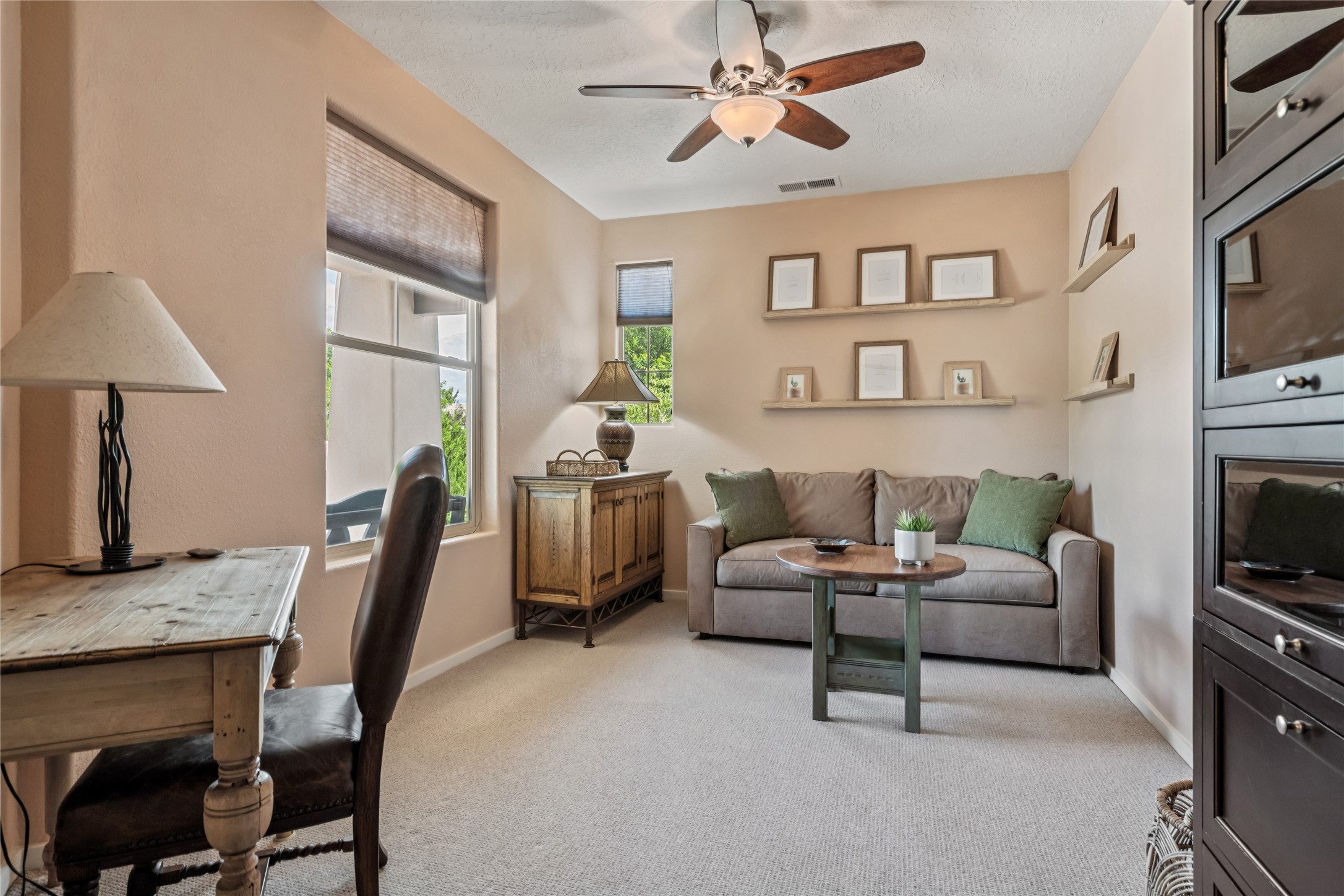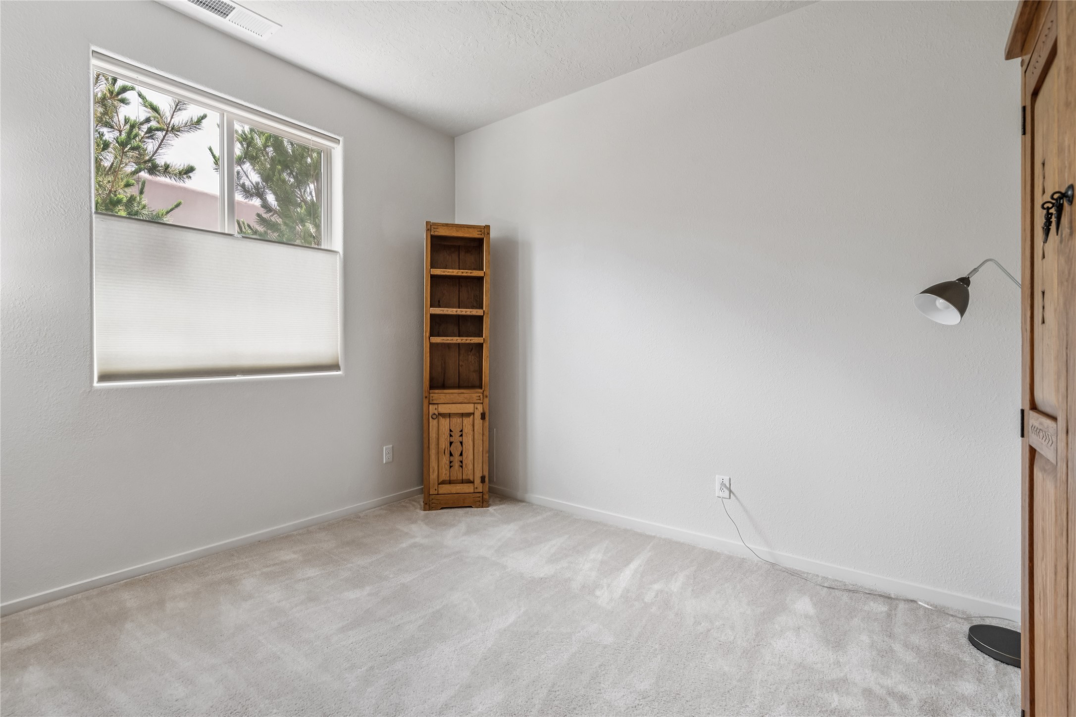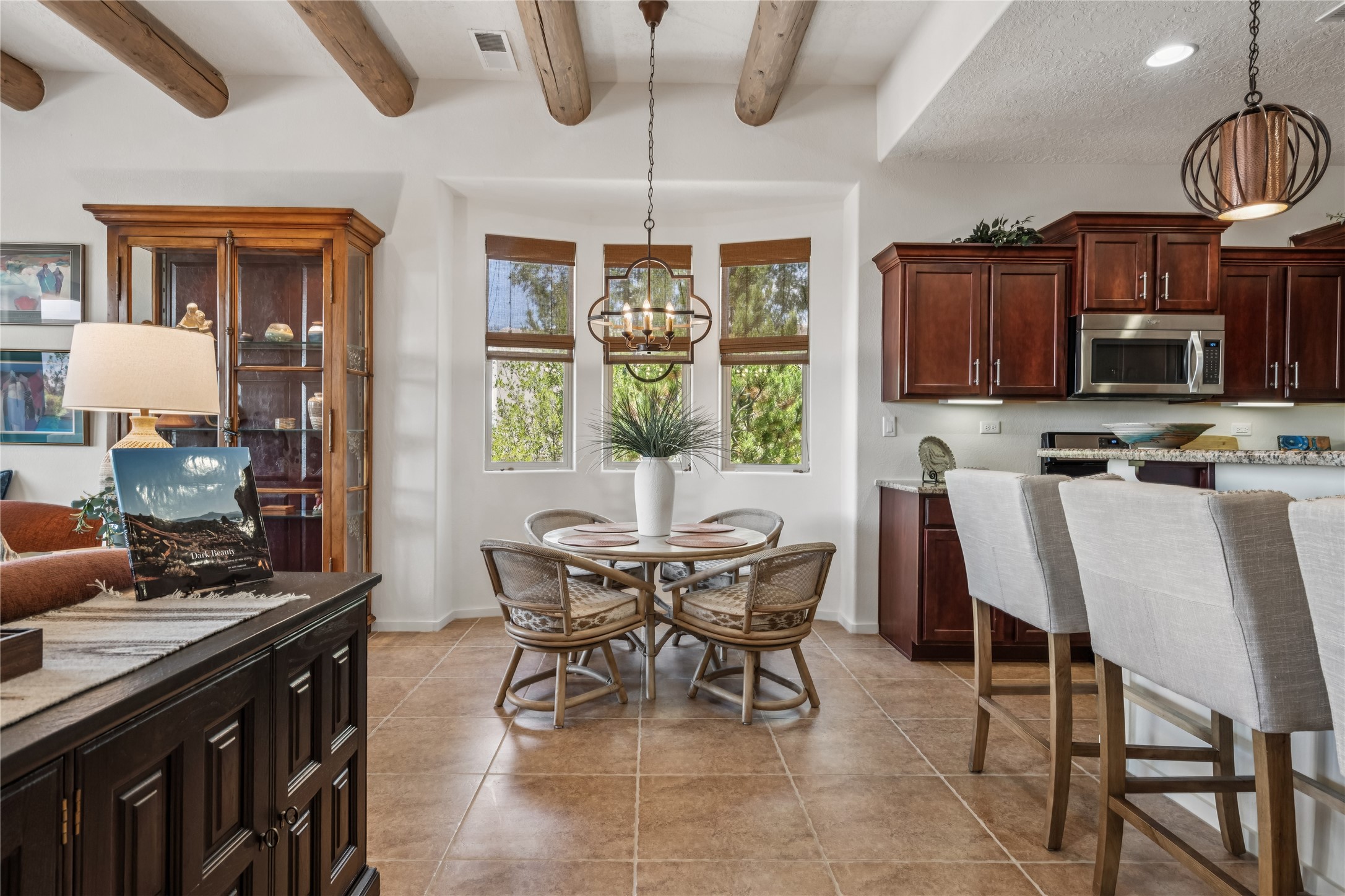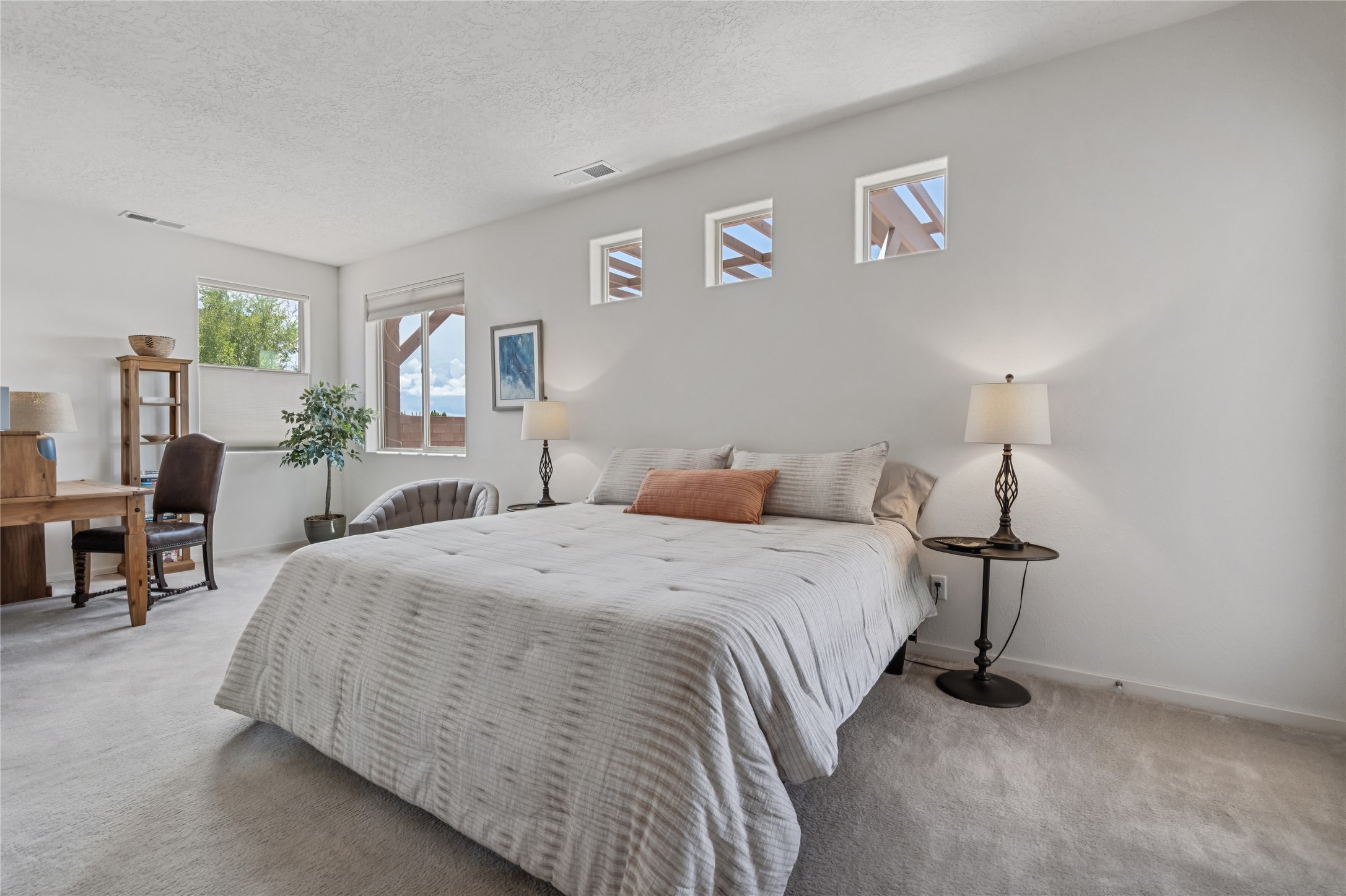 Welcome to 40 Via Punto Nuevo, a thoughtfully designed 3-bedroom, 2-bath home nestled in the heart of Rancho Viejo. This charming residence exudes classic Santa Fe style, with high ceilings adorned with vigas, and abundant natural light from well-placed skylights. The living room features a traditional Kiva fireplace,--perfect for quiet evenings. The open-concept kitchen is ideal for entertaining, with granite countertops, GE Profile and LG appliances, and ample storage. Set on a premium lot, the home backs to an open space with scenic walking trails and fronts a tranquil park, creating a private and picturesque setting. Enjoy true indoor-outdoor living with over 550 square feet of covered front and rear portals, a fully walled backyard, and a welcoming front courtyard. This one owner beauty features instant hot water and a two-car garage. Located in a vibrant community with access to parks, trails, sports courts, and a nearby commercial plaza, this home blends Southwest warmth with modern comfort--truly the best of Santa Fe living.