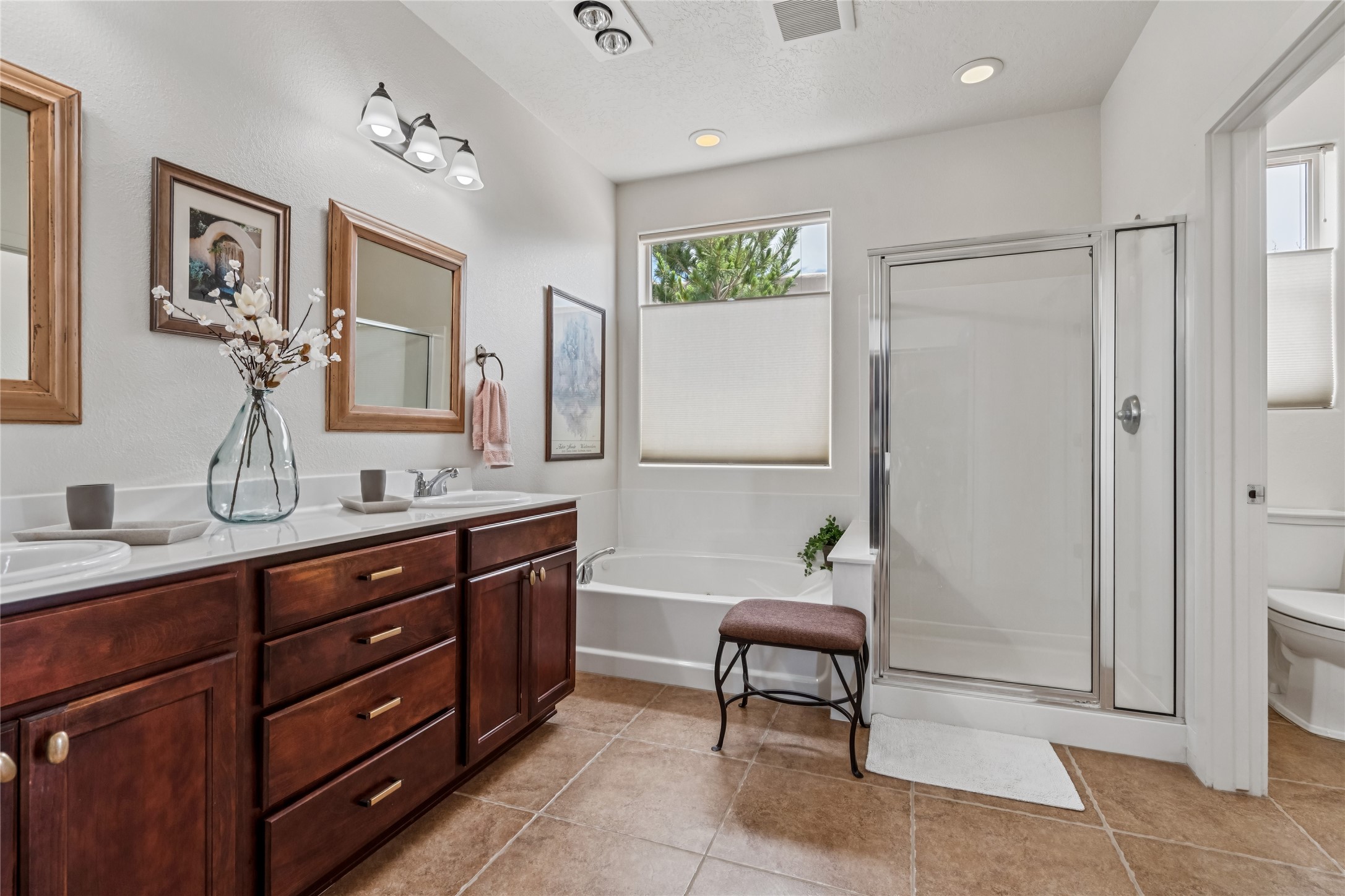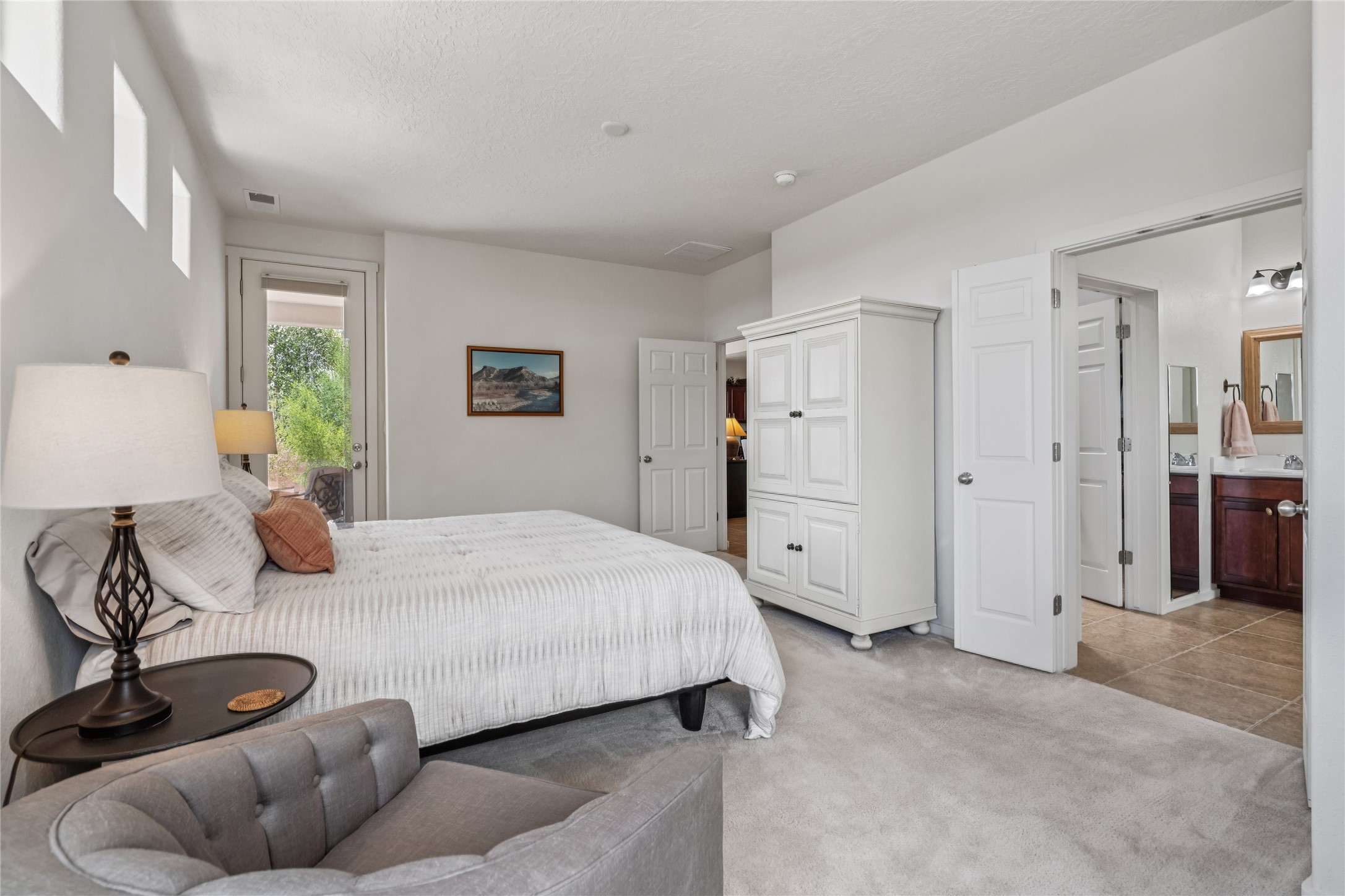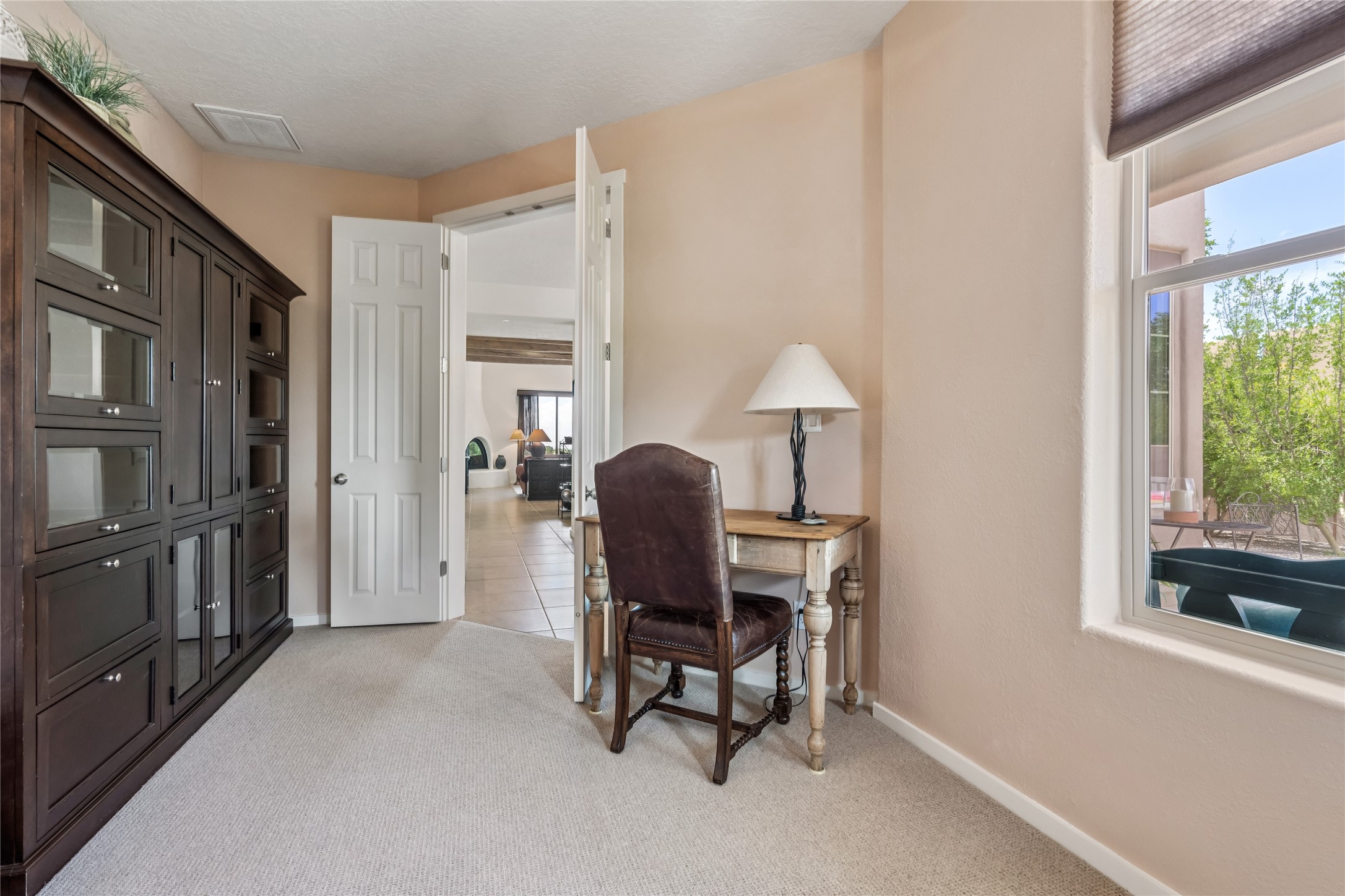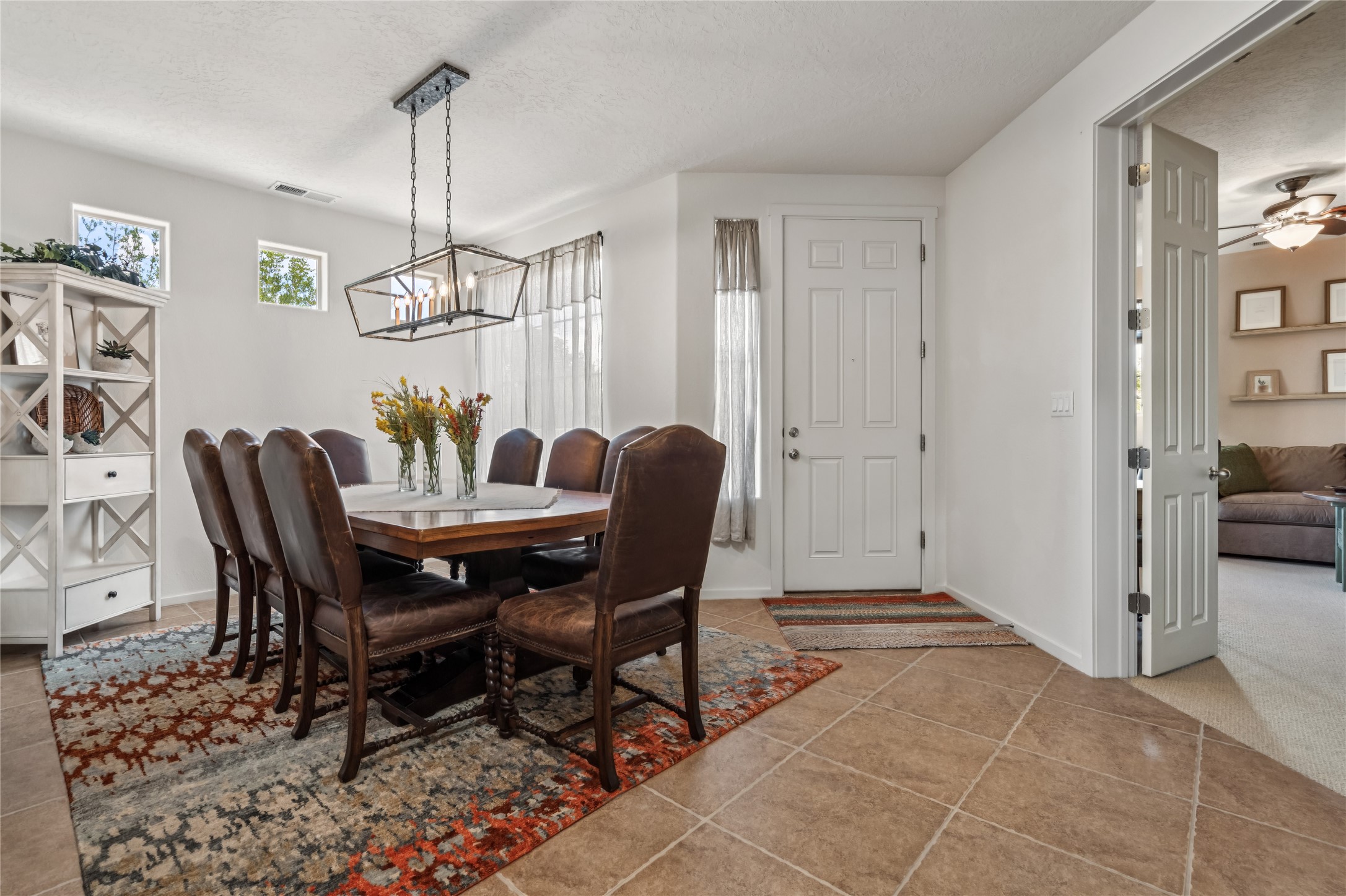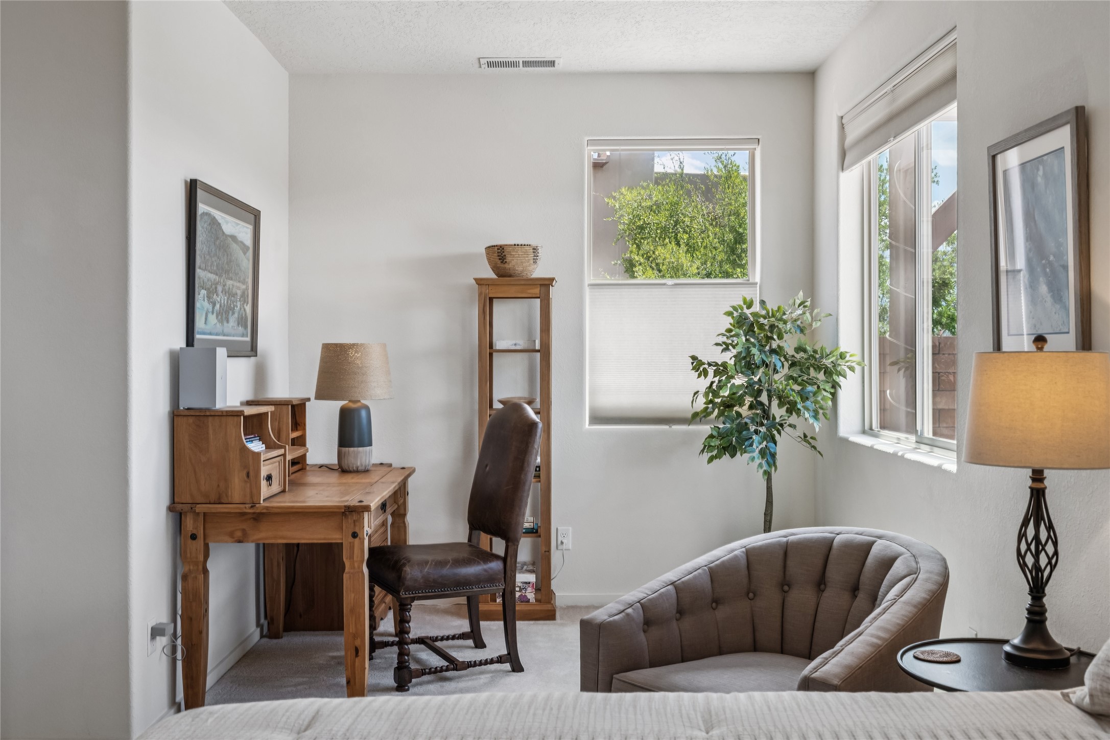 Welcome to 40 Via Punto Nuevo, a thoughtfully designed 3-bedroom, 2-bath home nestled in the heart of Rancho Viejo. This charming residence exudes classic Santa Fe style, with high ceilings adorned with vigas, and abundant natural light from well-placed skylights. The living room features a traditional Kiva fireplace,--perfect for quiet evenings. The open-concept kitchen is ideal for entertaining, with granite countertops, GE Profile and LG appliances, and ample storage. Set on a premium lot, the home backs to an open space with scenic walking trails and fronts a tranquil park, creating a private and picturesque setting. Enjoy true indoor-outdoor living with over 550 square feet of covered front and rear portals, a fully walled backyard, and a welcoming front courtyard. This one owner beauty features instant hot water and a two-car garage. Located in a vibrant community with access to parks, trails, sports courts, and a nearby commercial plaza, this home blends Southwest warmth with modern comfort--truly the best of Santa Fe living.