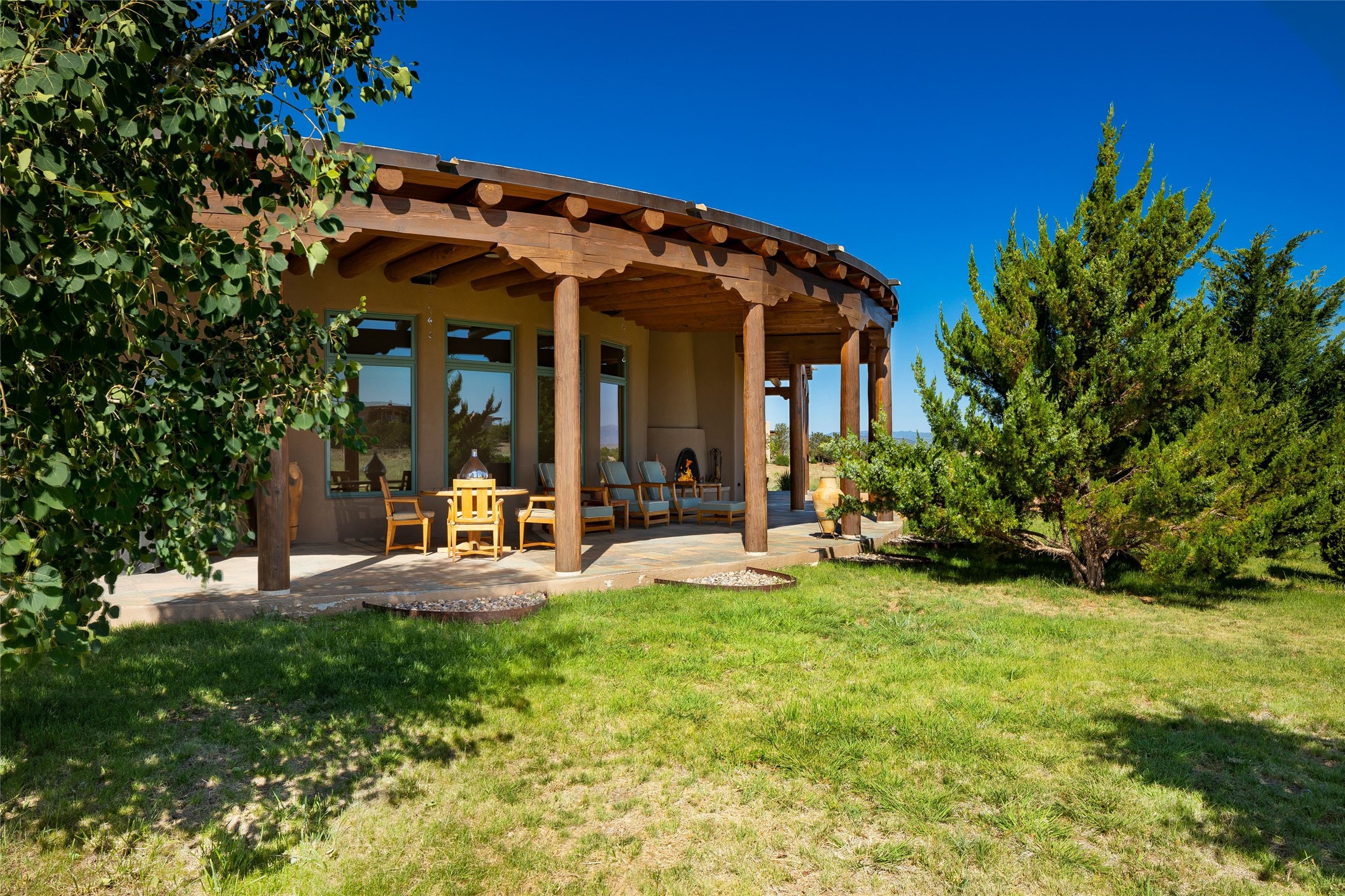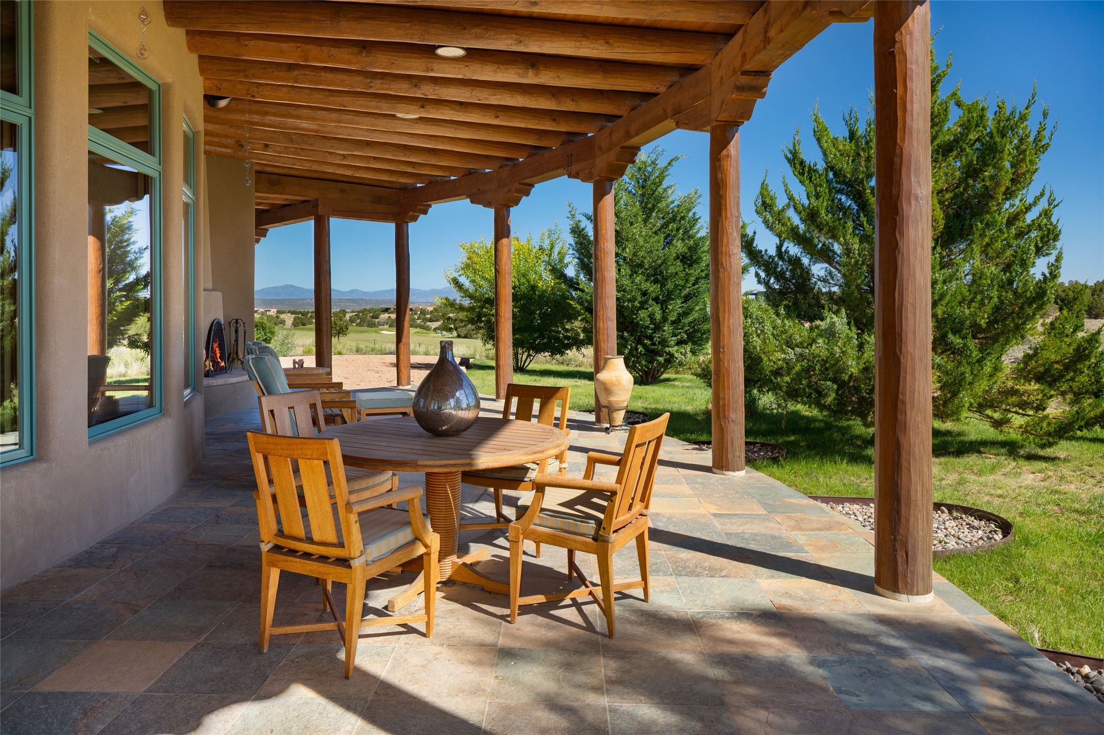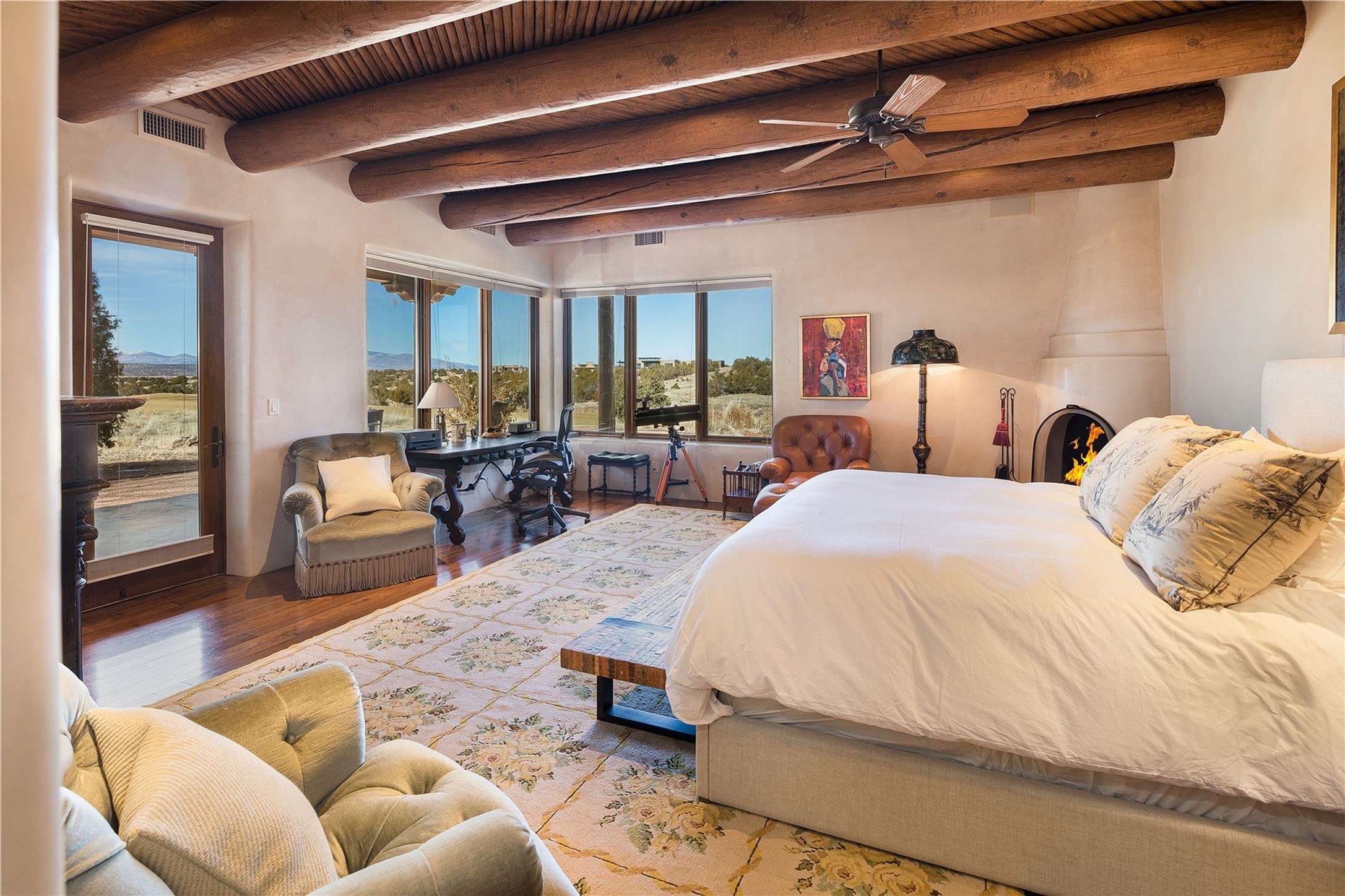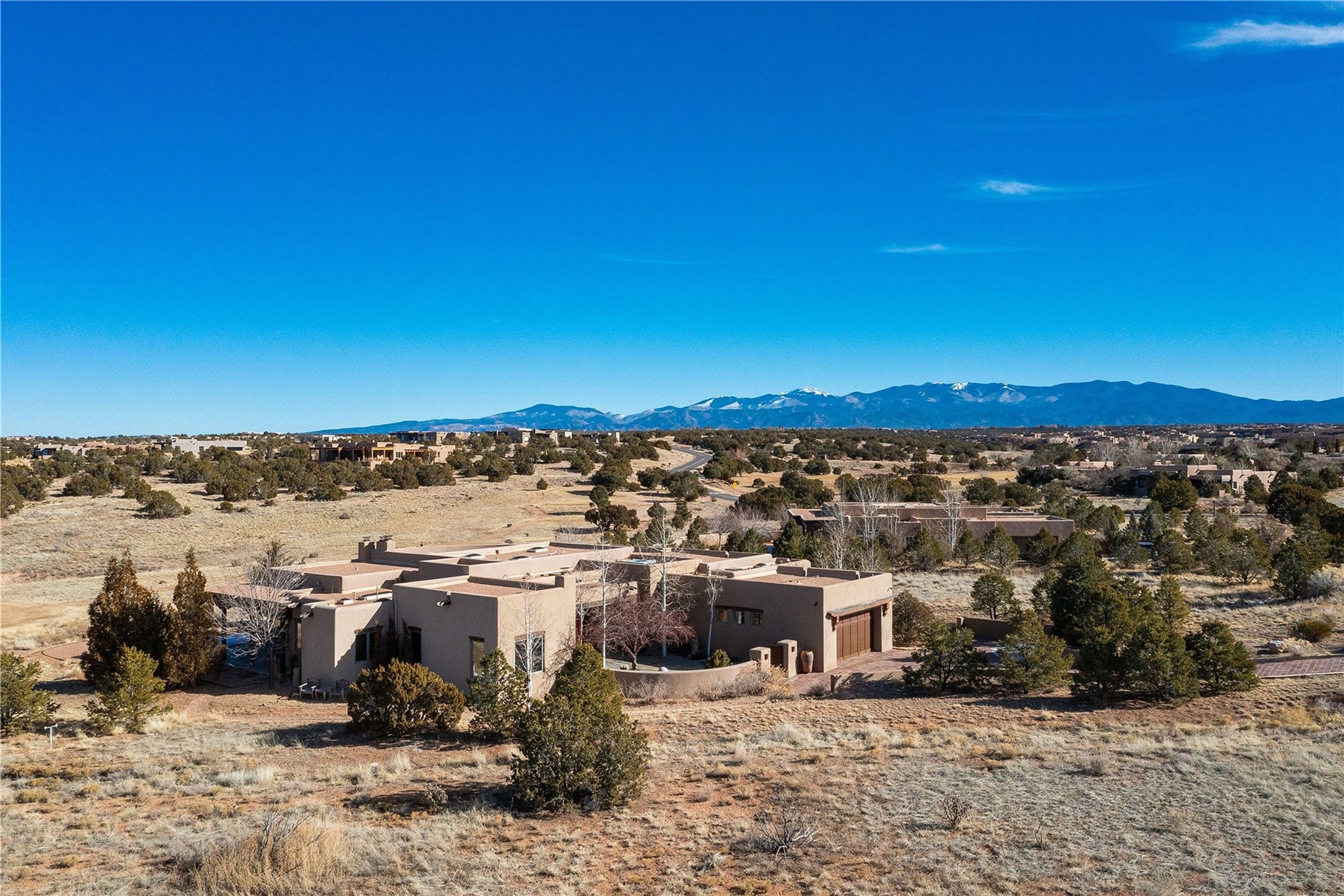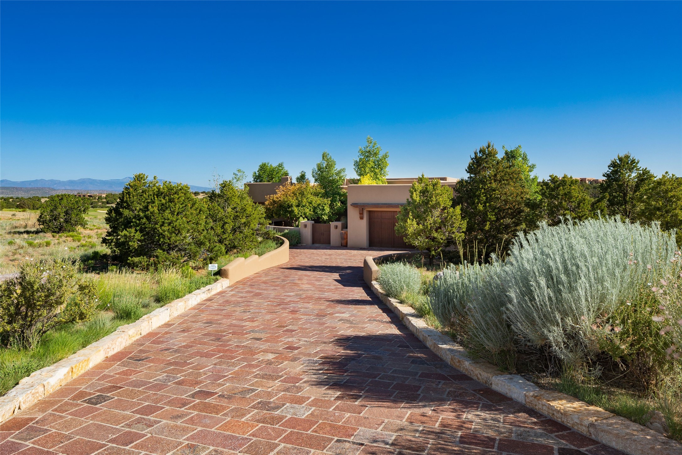 Experience the ultimate Santa Fe and Las Campanas lifestyle. Welcome to 5 N. Brisa Fresca, an extraordinary single-level residence by the award-winning builder Sharon Woods. Located within the master planned community of Las Campanas and sited on a premiere, 1 acre view lot, on the 2nd fairway of the Sunset Golf Course in Las Campanas, this exceptional home captivates with stunning views of the fairway, Jemez and Sangre de Cristo Mountains. Ideal for entertaining, this home was designed with an open concept living experience, with framed views of the golf course and mountain views from nearly every room. Privately accessed through a private entry courtyard with a tranquil water fountain, this exquisite home impresses with a grand living room complete with vast seating areas, a custom curved wall of view windows, a spacious dining room, fireplace and front and back portal access. Directly off the living room is the chef's kitchen with dual breakfast bars, walk-in pantry, luxury appliances, custom cabinetry with extra storage and an adjoining casual dining area or media room. The generous, private owner's suite delights with views, a fireplace, portal access and a spacious spa-like bath with natural stone throughout, a soaking tub, a newly customized walk-in closet, and an expansive vanity with dual sinks. Adjacent to the owner's suite is an office area or library. Guests enjoy true luxury and privacy with two large, ensuite bedrooms, each views and walk-in closets. The home's exceptional finishes include rich hardwood and natural stone flooring, vigas and beams, creamy white plaster walls, superior-quality craftsmanship, custom doors, a large laundry room and mudroom with a utility sink, a newly updated Lutron lighting system, (4) fireplaces, superior outdoor living areas with expansive covered portals with an outdoor fireplace and a private driveway with pavers. The owner's Equity Golf Membership to the Club at Las Campanas is available for purchase separately.