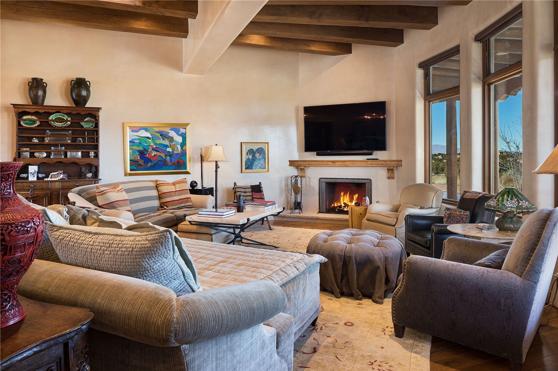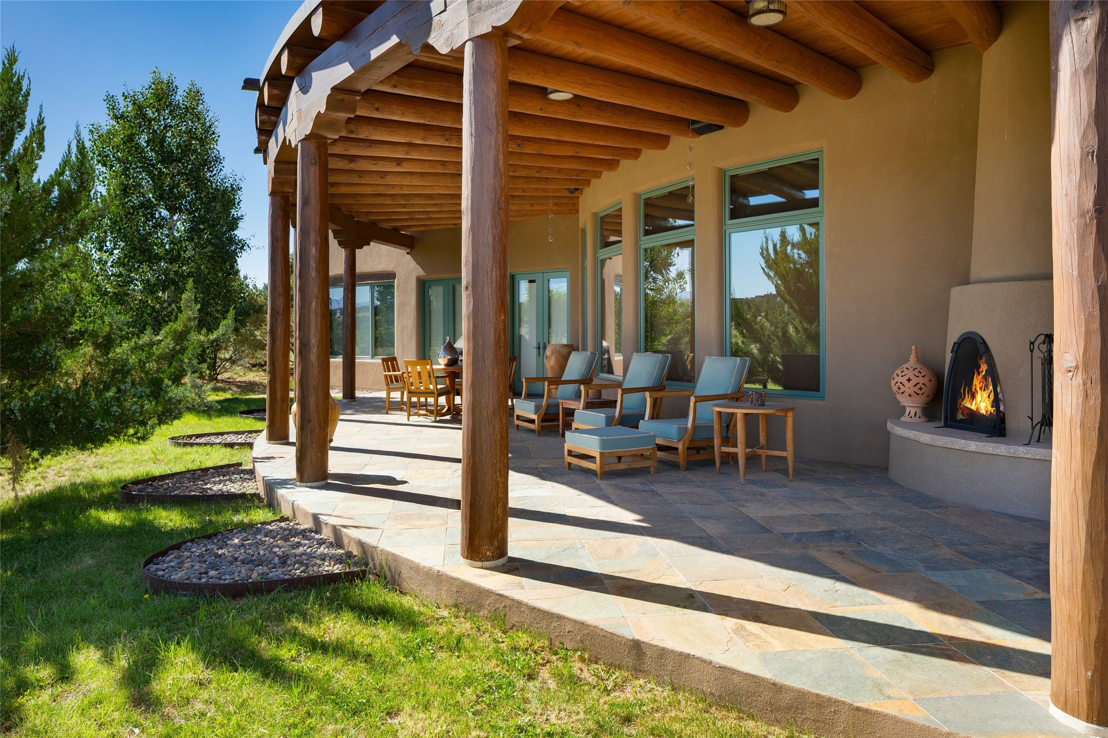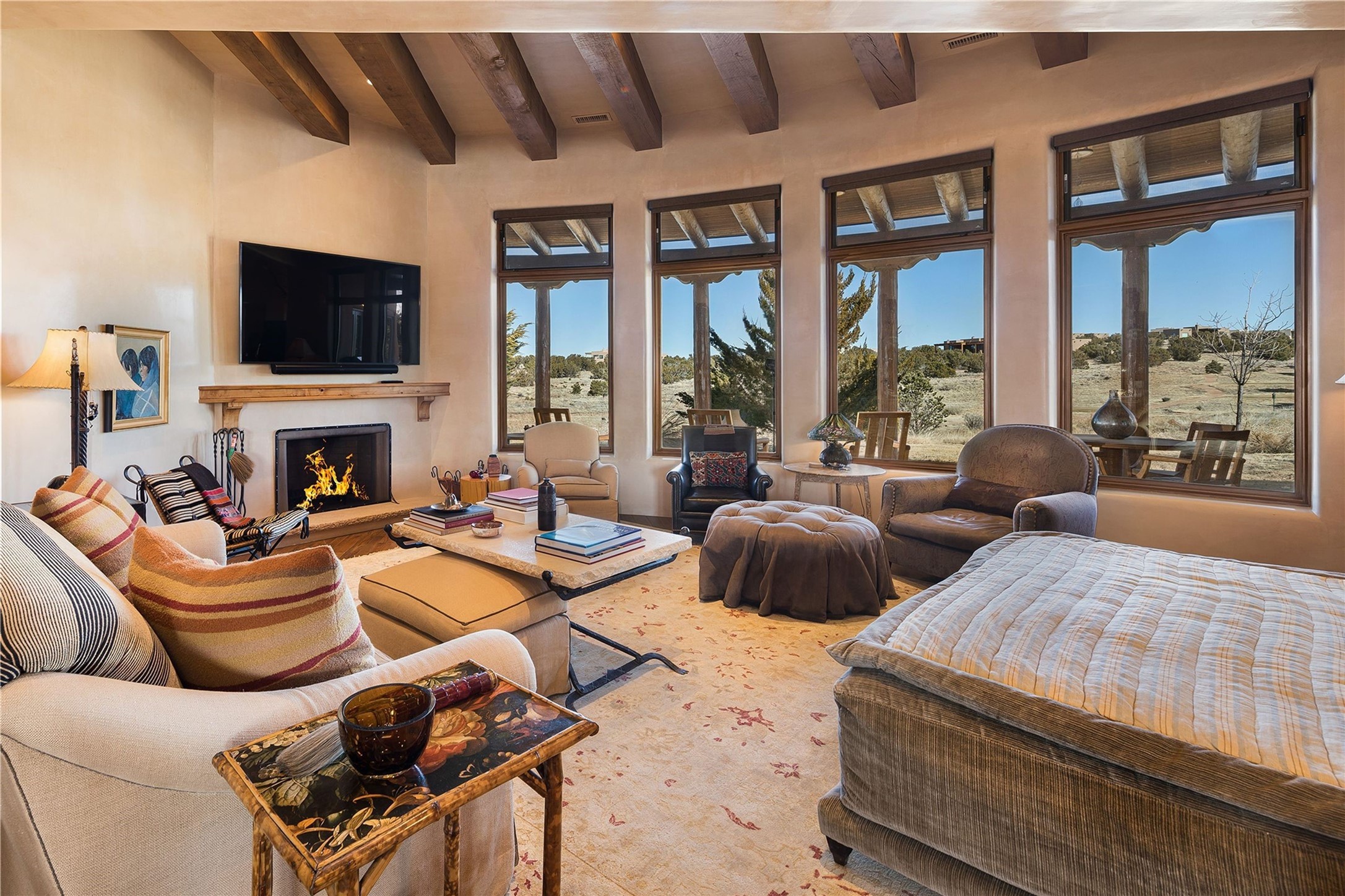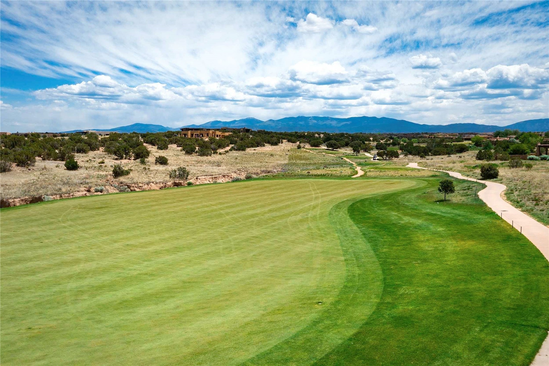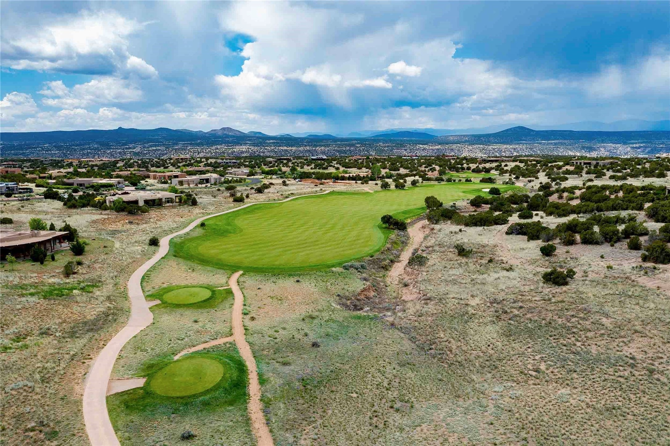 Experience the ultimate Santa Fe and Las Campanas lifestyle. Welcome to 5 N. Brisa Fresca, an extraordinary single-level residence by the award-winning builder Sharon Woods. Located within the master planned community of Las Campanas and sited on a premiere, 1 acre view lot, on the 2nd fairway of the Sunset Golf Course in Las Campanas, this exceptional home captivates with stunning views of the fairway, Jemez and Sangre de Cristo Mountains. Ideal for entertaining, this home was designed with an open concept living experience, with framed views of the golf course and mountain views from nearly every room. Privately accessed through a private entry courtyard with a tranquil water fountain, this exquisite home impresses with a grand living room complete with vast seating areas, a custom curved wall of view windows, a spacious dining room, fireplace and front and back portal access. Directly off the living room is the chef's kitchen with dual breakfast bars, walk-in pantry, luxury appliances, custom cabinetry with extra storage and an adjoining casual dining area or media room. The generous, private owner's suite delights with views, a fireplace, portal access and a spacious spa-like bath with natural stone throughout, a soaking tub, a newly customized walk-in closet, and an expansive vanity with dual sinks. Adjacent to the owner's suite is an office area or library. Guests enjoy true luxury and privacy with two large, ensuite bedrooms, each views and walk-in closets. The home's exceptional finishes include rich hardwood and natural stone flooring, vigas and beams, creamy white plaster walls, superior-quality craftsmanship, custom doors, a large laundry room and mudroom with a utility sink, a newly updated Lutron lighting system, (4) fireplaces, superior outdoor living areas with expansive covered portals with an outdoor fireplace and a private driveway with pavers. The owner's Equity Golf Membership to the Club at Las Campanas is available for purchase separately.