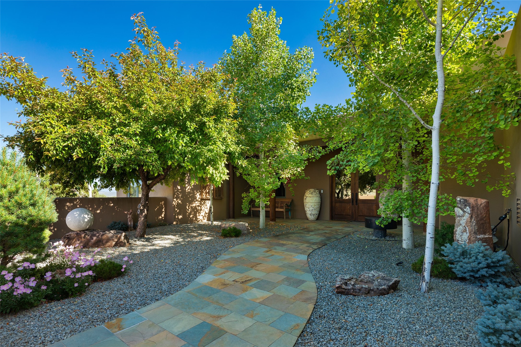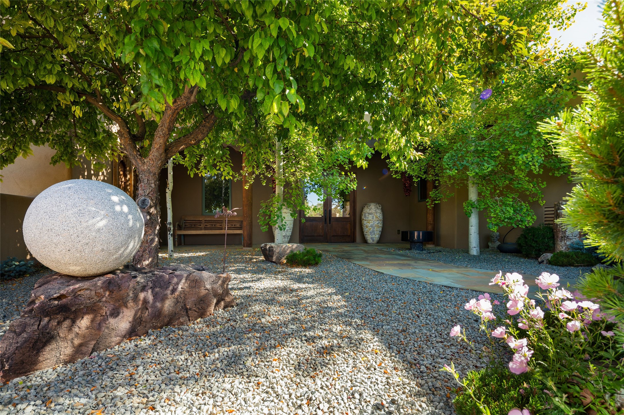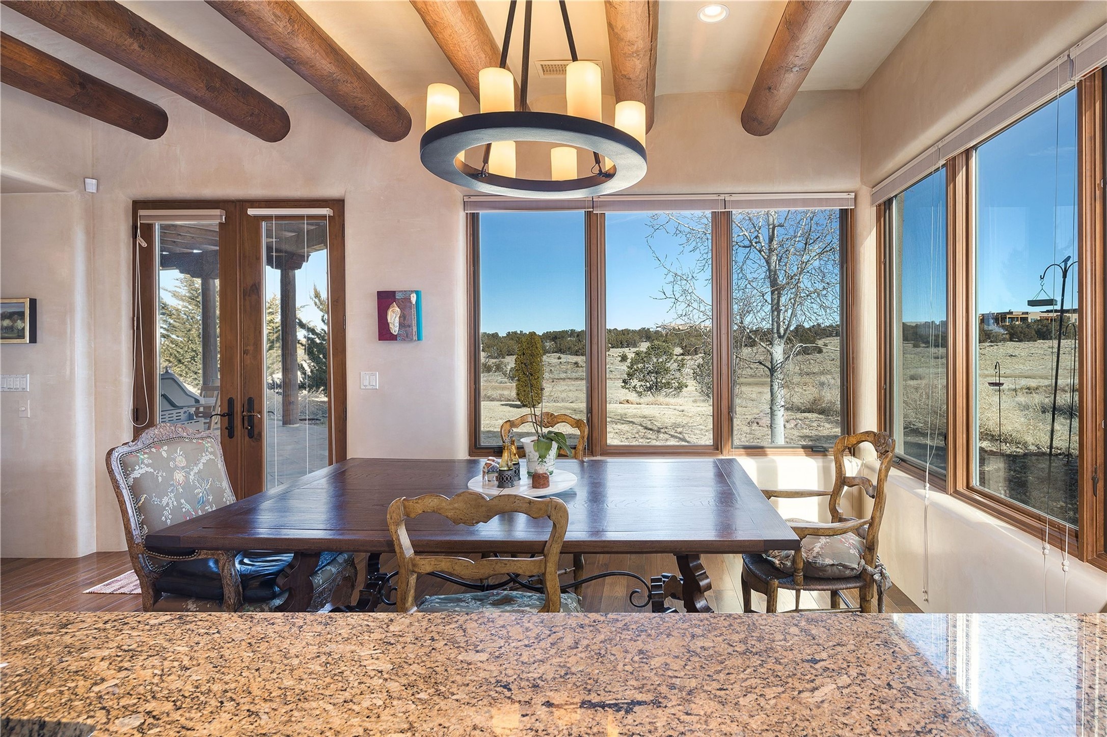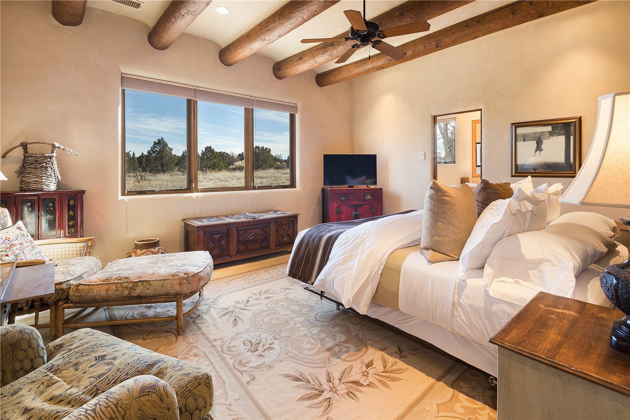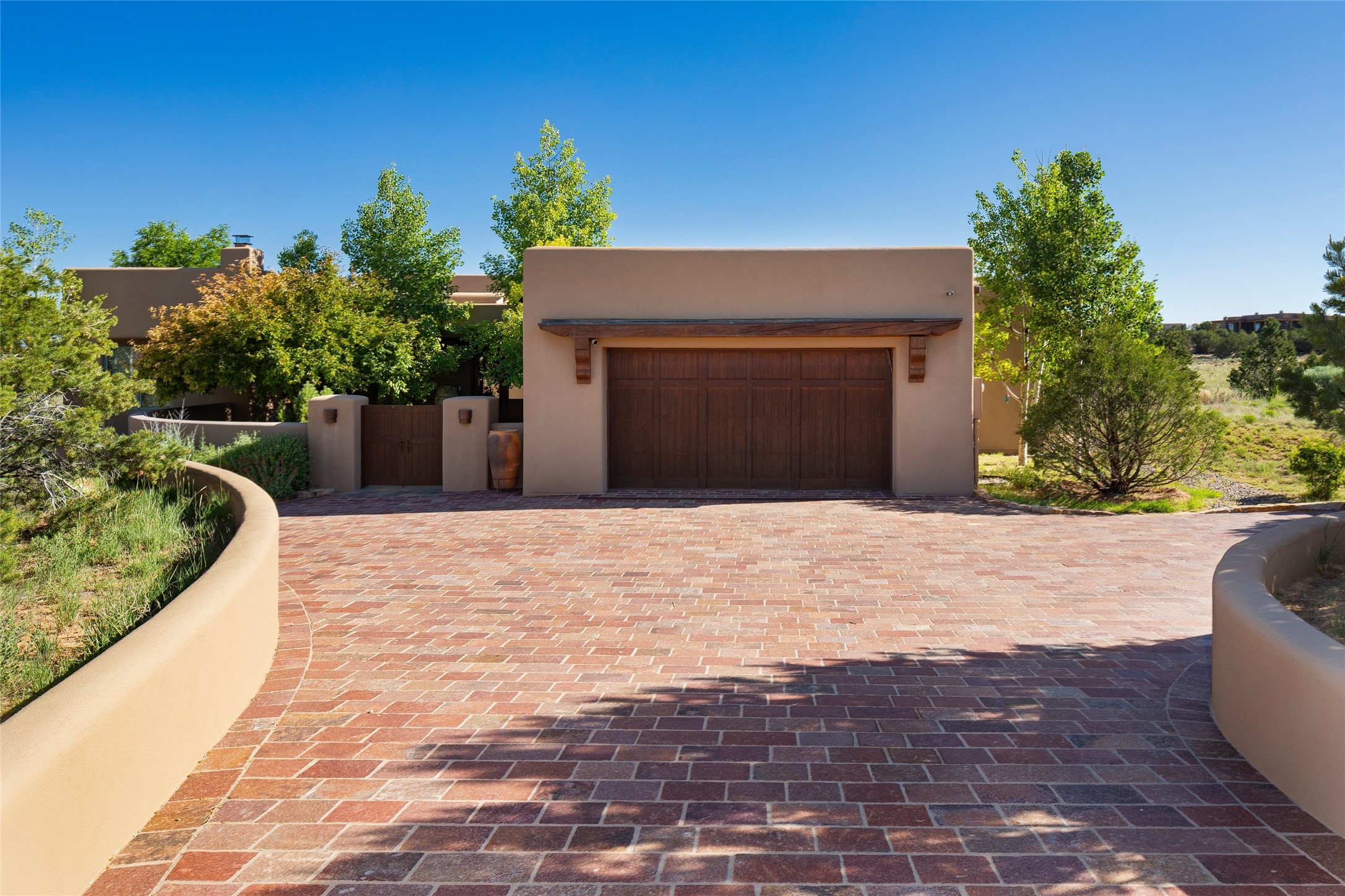 Experience the ultimate Santa Fe and Las Campanas lifestyle. Welcome to 5 N. Brisa Fresca, an extraordinary single-level residence by the award-winning builder Sharon Woods. Located within the master planned community of Las Campanas and sited on a premiere, 1 acre view lot, on the 2nd fairway of the Sunset Golf Course in Las Campanas, this exceptional home captivates with stunning views of the fairway, Jemez and Sangre de Cristo Mountains. Ideal for entertaining, this home was designed with an open concept living experience, with framed views of the golf course and mountain views from nearly every room. Privately accessed through a private entry courtyard with a tranquil water fountain, this exquisite home impresses with a grand living room complete with vast seating areas, a custom curved wall of view windows, a spacious dining room, fireplace and front and back portal access. Directly off the living room is the chef's kitchen with dual breakfast bars, walk-in pantry, luxury appliances, custom cabinetry with extra storage and an adjoining casual dining area or media room. The generous, private owner's suite delights with views, a fireplace, portal access and a spacious spa-like bath with natural stone throughout, a soaking tub, a newly customized walk-in closet, and an expansive vanity with dual sinks. Adjacent to the owner's suite is an office area or library. Guests enjoy true luxury and privacy with two large, ensuite bedrooms, each views and walk-in closets. The home's exceptional finishes include rich hardwood and natural stone flooring, vigas and beams, creamy white plaster walls, superior-quality craftsmanship, custom doors, a large laundry room and mudroom with a utility sink, a newly updated Lutron lighting system, (4) fireplaces, superior outdoor living areas with expansive covered portals with an outdoor fireplace and a private driveway with pavers. The owner's Equity Golf Membership to the Club at Las Campanas is available for purchase separately.