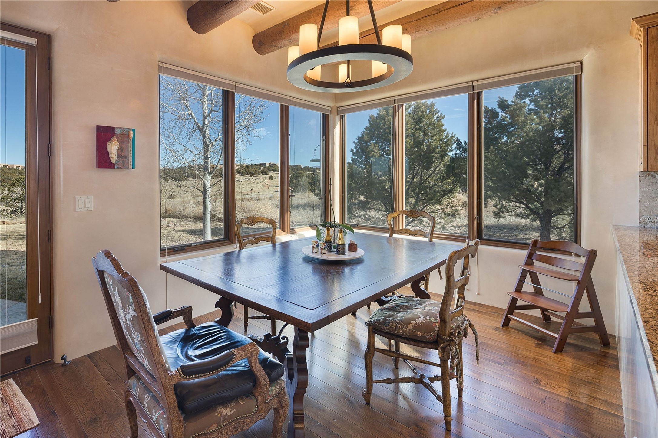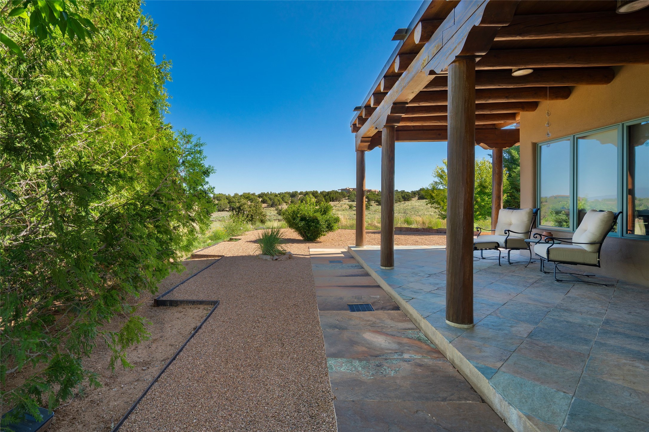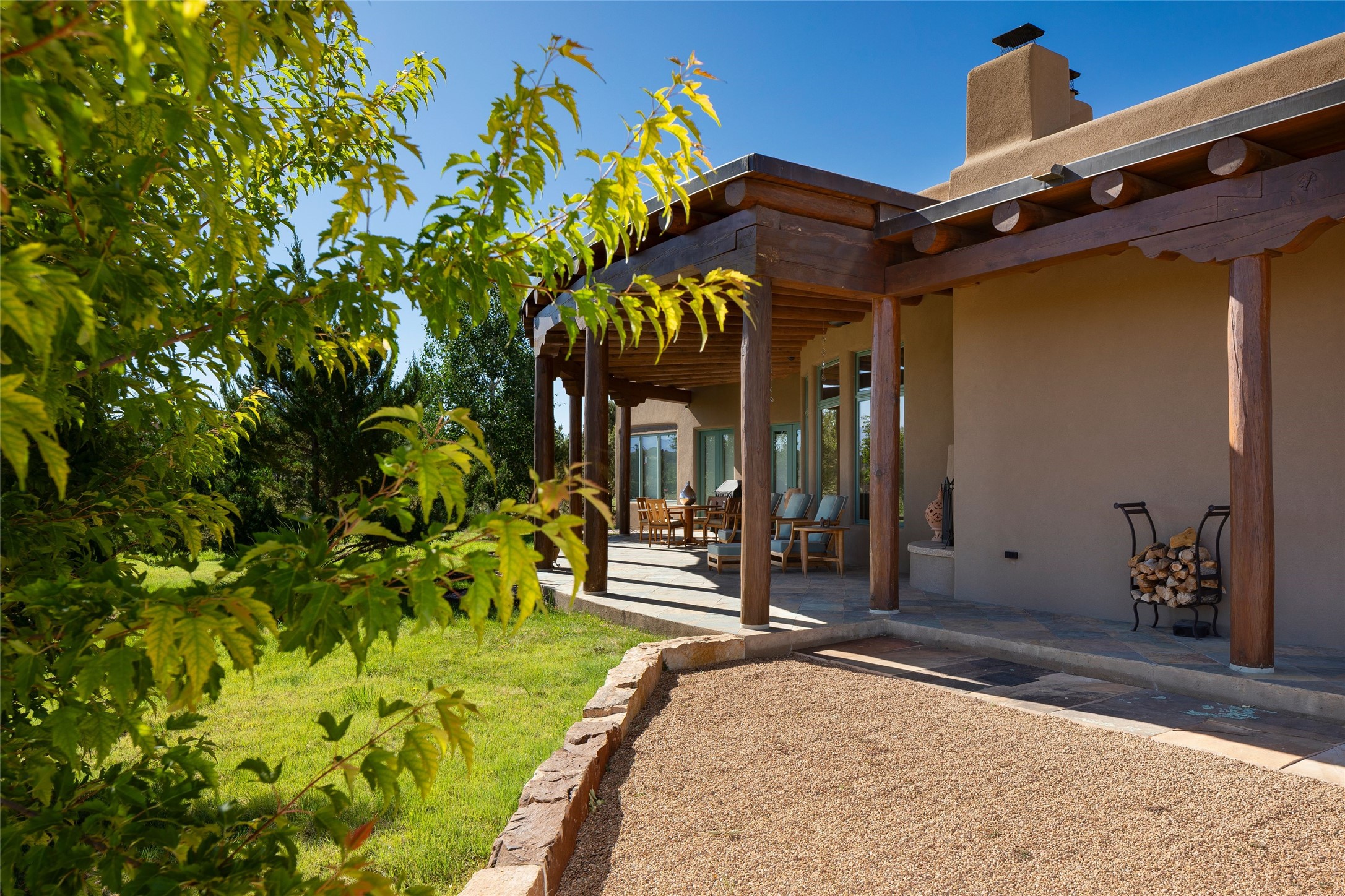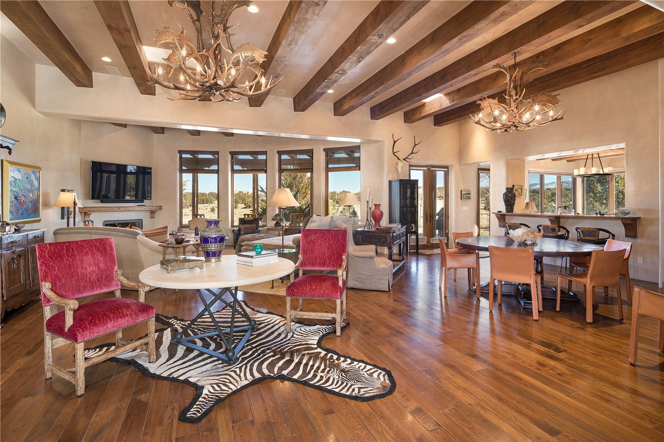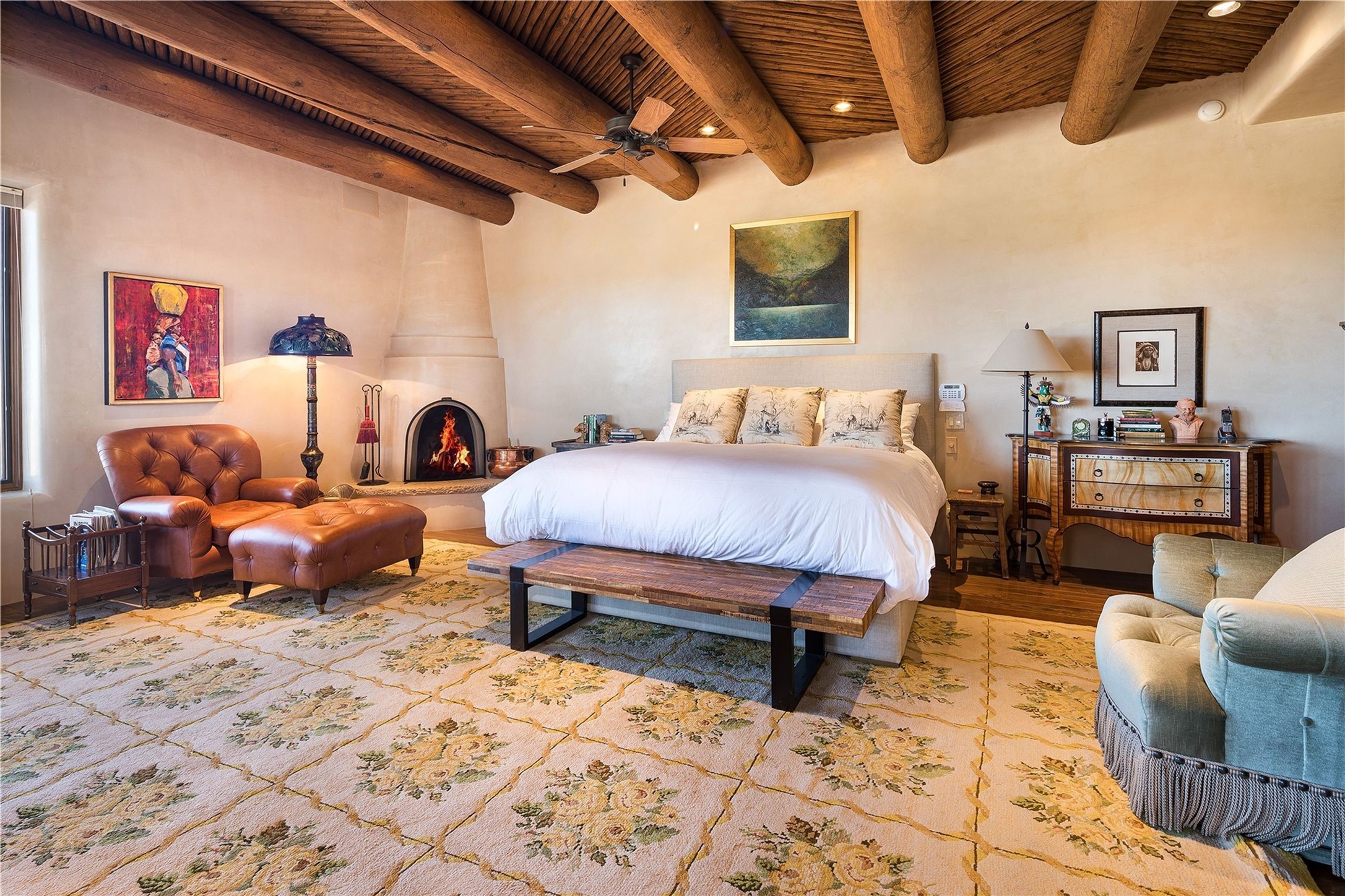 Experience the ultimate Santa Fe and Las Campanas lifestyle. Welcome to 5 N. Brisa Fresca, an extraordinary single-level residence by the award-winning builder Sharon Woods. Located within the master planned community of Las Campanas and sited on a premiere, 1 acre view lot, on the 2nd fairway of the Sunset Golf Course in Las Campanas, this exceptional home captivates with stunning views of the fairway, Jemez and Sangre de Cristo Mountains. Ideal for entertaining, this home was designed with an open concept living experience, with framed views of the golf course and mountain views from nearly every room. Privately accessed through a private entry courtyard with a tranquil water fountain, this exquisite home impresses with a grand living room complete with vast seating areas, a custom curved wall of view windows, a spacious dining room, fireplace and front and back portal access. Directly off the living room is the chef's kitchen with dual breakfast bars, walk-in pantry, luxury appliances, custom cabinetry with extra storage and an adjoining casual dining area or media room. The generous, private owner's suite delights with views, a fireplace, portal access and a spacious spa-like bath with natural stone throughout, a soaking tub, a newly customized walk-in closet, and an expansive vanity with dual sinks. Adjacent to the owner's suite is an office area or library. Guests enjoy true luxury and privacy with two large, ensuite bedrooms, each views and walk-in closets. The home's exceptional finishes include rich hardwood and natural stone flooring, vigas and beams, creamy white plaster walls, superior-quality craftsmanship, custom doors, a large laundry room and mudroom with a utility sink, a newly updated Lutron lighting system, (4) fireplaces, superior outdoor living areas with expansive covered portals with an outdoor fireplace and a private driveway with pavers. The owner's Equity Golf Membership to the Club at Las Campanas is available for purchase separately.