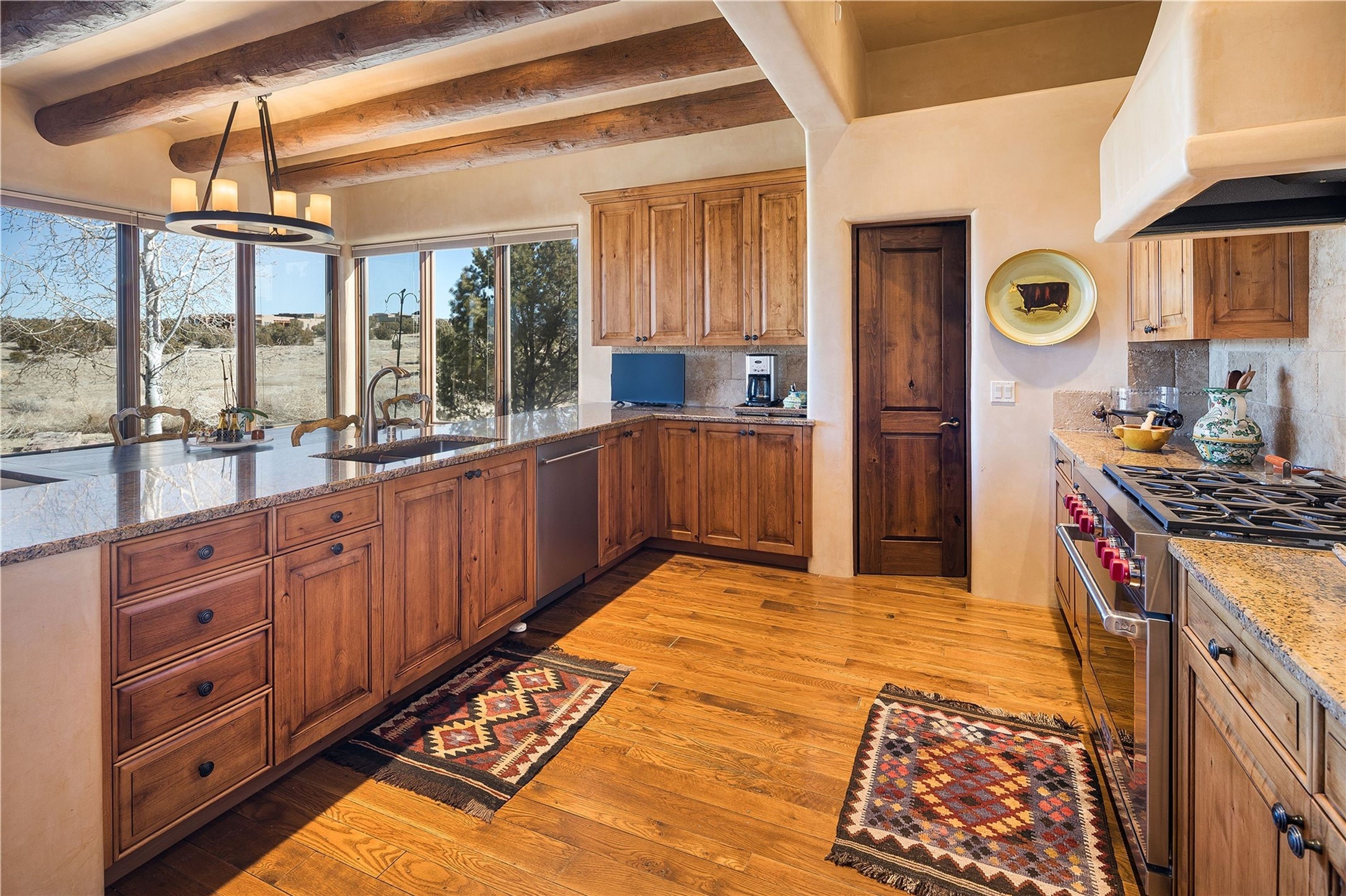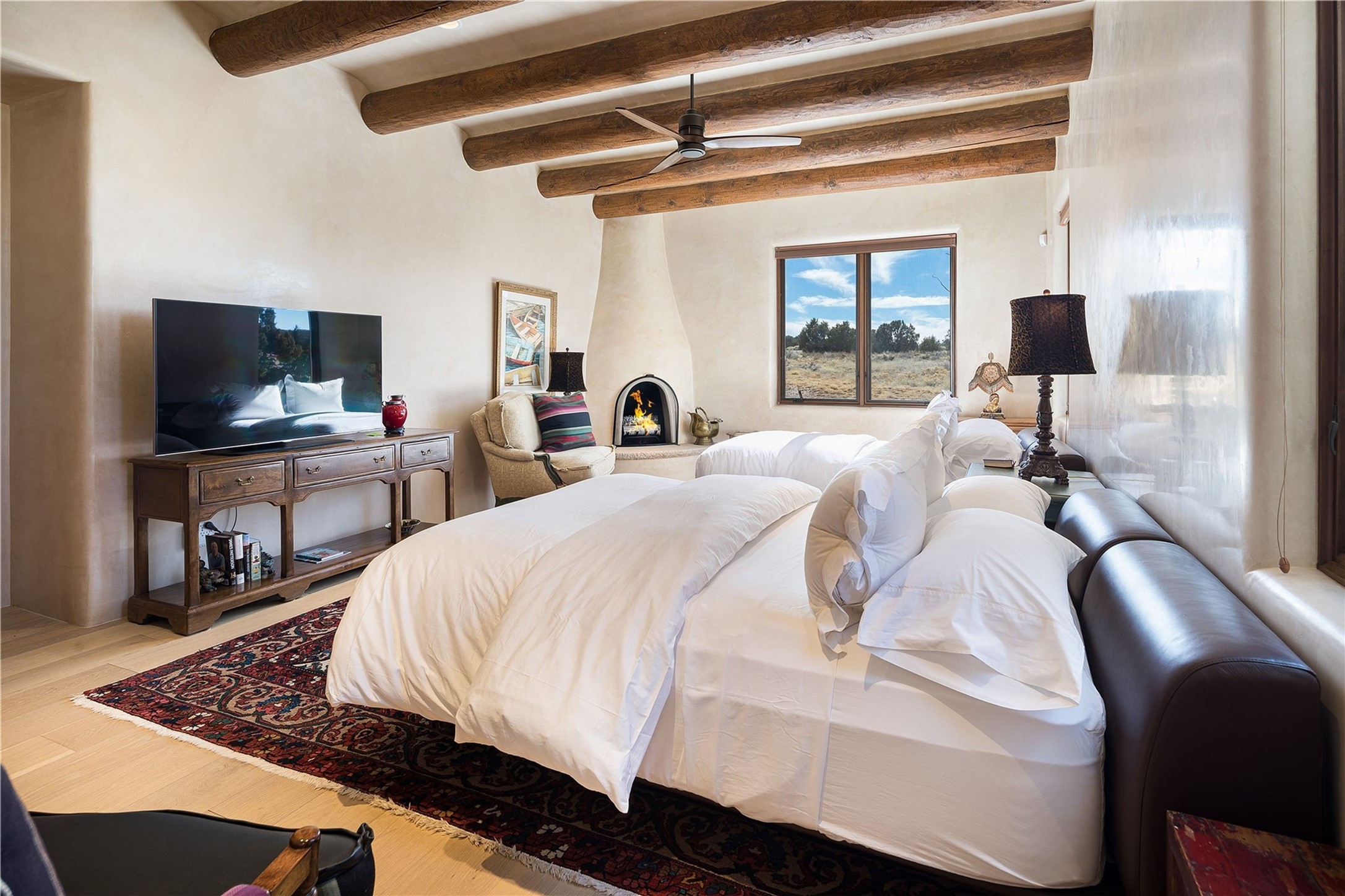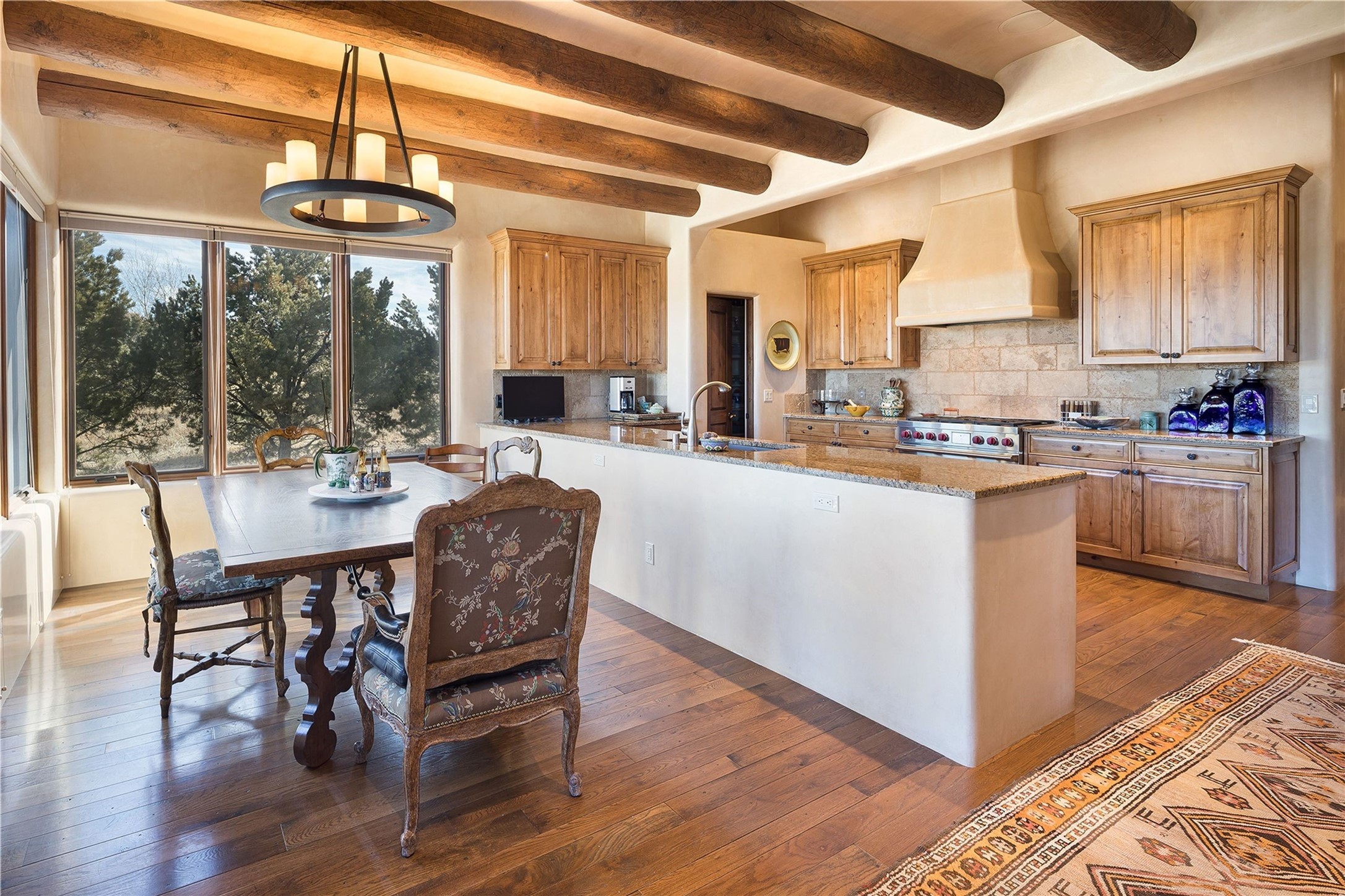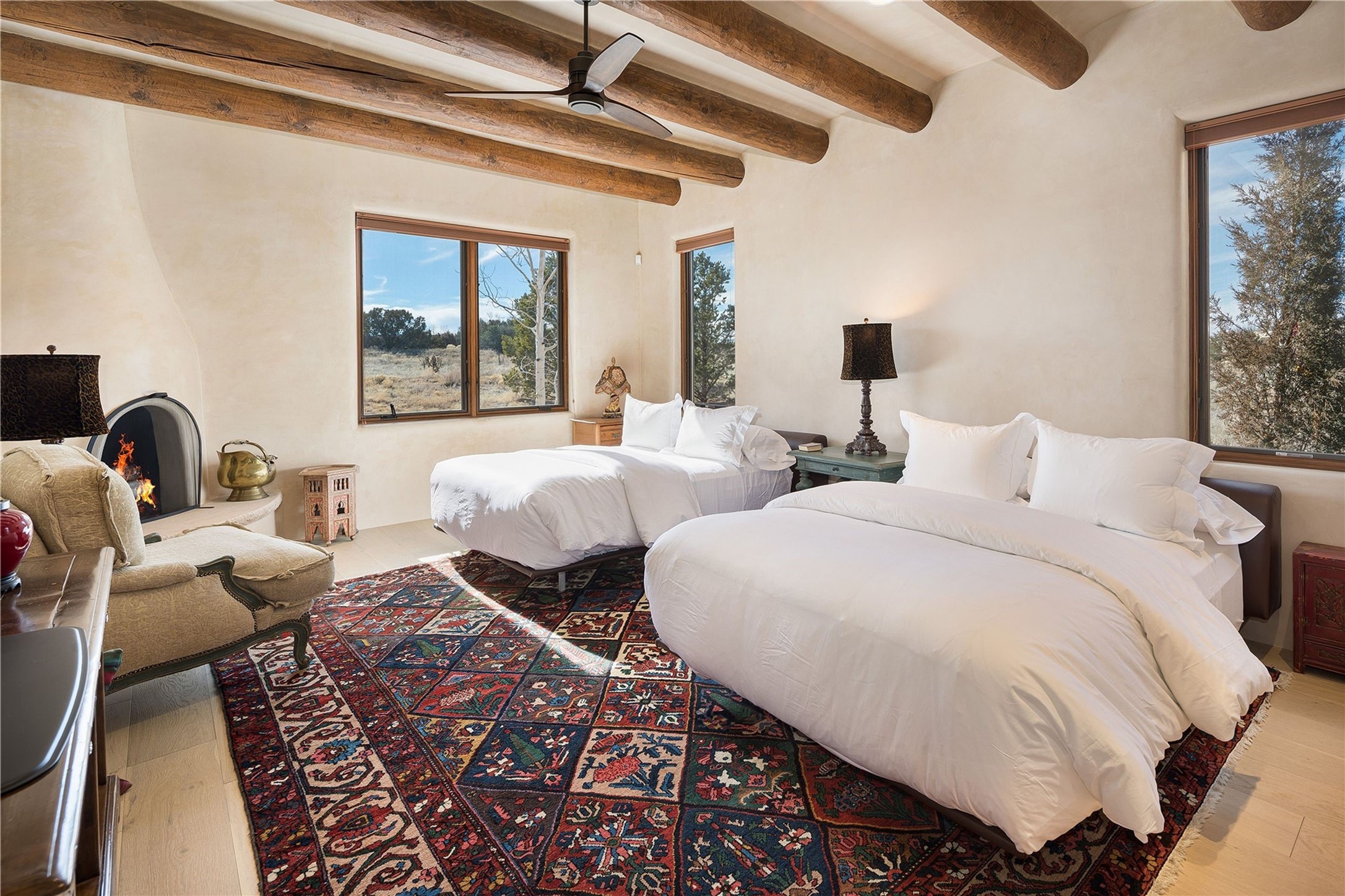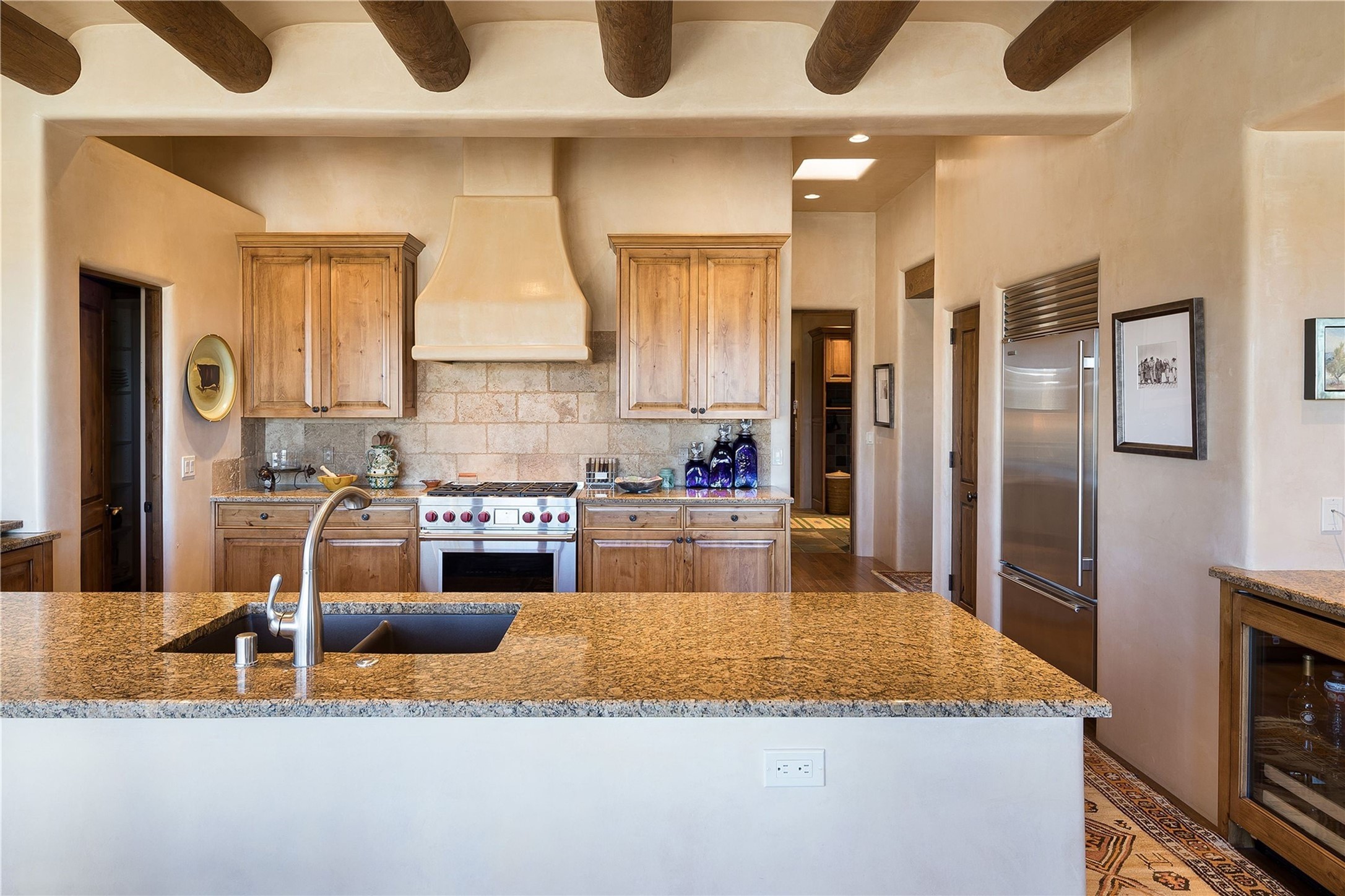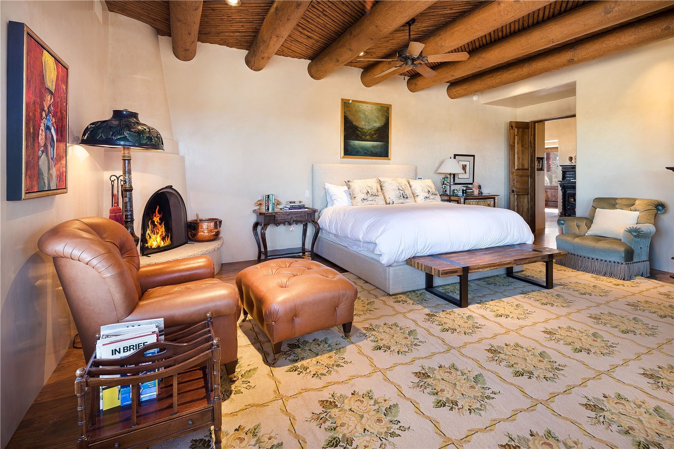 Experience the ultimate Santa Fe and Las Campanas lifestyle. Welcome to 5 N. Brisa Fresca, an extraordinary single-level residence by the award-winning builder Sharon Woods. Located within the master planned community of Las Campanas and sited on a premiere, 1 acre view lot, on the 2nd fairway of the Sunset Golf Course in Las Campanas, this exceptional home captivates with stunning views of the fairway, Jemez and Sangre de Cristo Mountains. Ideal for entertaining, this home was designed with an open concept living experience, with framed views of the golf course and mountain views from nearly every room. Privately accessed through a private entry courtyard with a tranquil water fountain, this exquisite home impresses with a grand living room complete with vast seating areas, a custom curved wall of view windows, a spacious dining room, fireplace and front and back portal access. Directly off the living room is the chef's kitchen with dual breakfast bars, walk-in pantry, luxury appliances, custom cabinetry with extra storage and an adjoining casual dining area or media room. The generous, private owner's suite delights with views, a fireplace, portal access and a spacious spa-like bath with natural stone throughout, a soaking tub, a newly customized walk-in closet, and an expansive vanity with dual sinks. Adjacent to the owner's suite is an office area or library. Guests enjoy true luxury and privacy with two large, ensuite bedrooms, each views and walk-in closets. The home's exceptional finishes include rich hardwood and natural stone flooring, vigas and beams, creamy white plaster walls, superior-quality craftsmanship, custom doors, a large laundry room and mudroom with a utility sink, a newly updated Lutron lighting system, (4) fireplaces, superior outdoor living areas with expansive covered portals with an outdoor fireplace and a private driveway with pavers. The owner's Equity Golf Membership to the Club at Las Campanas is available for purchase separately.