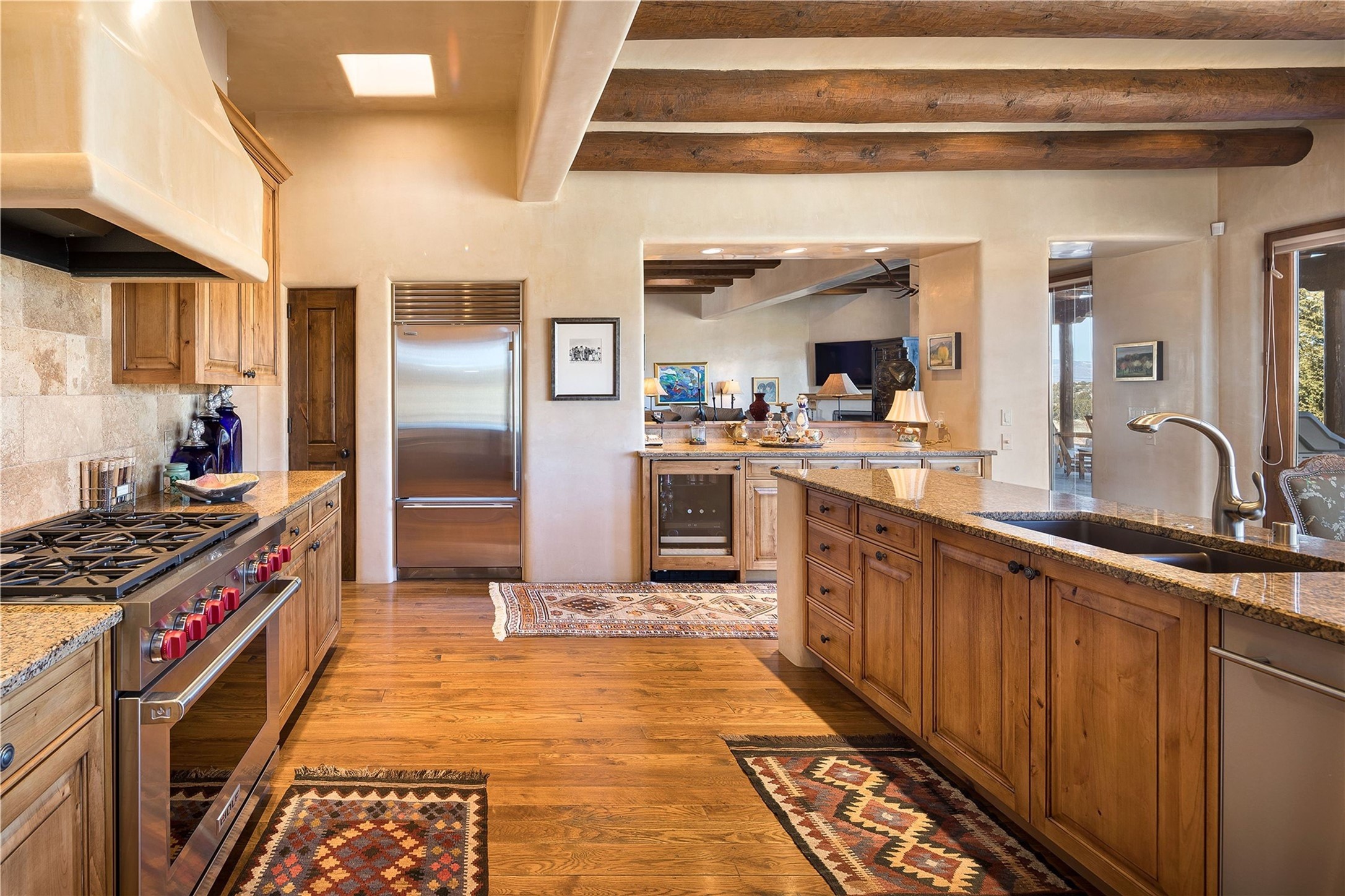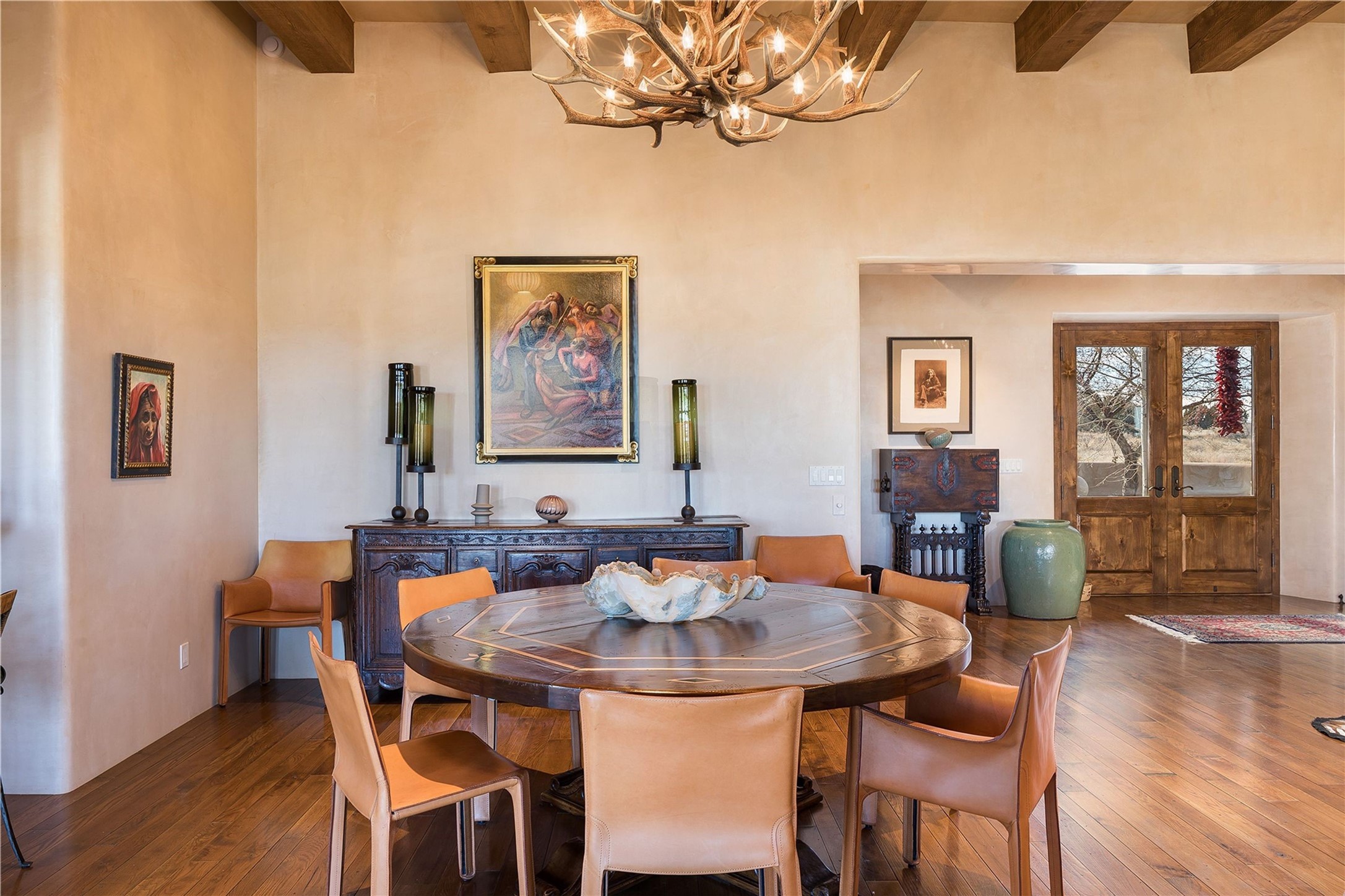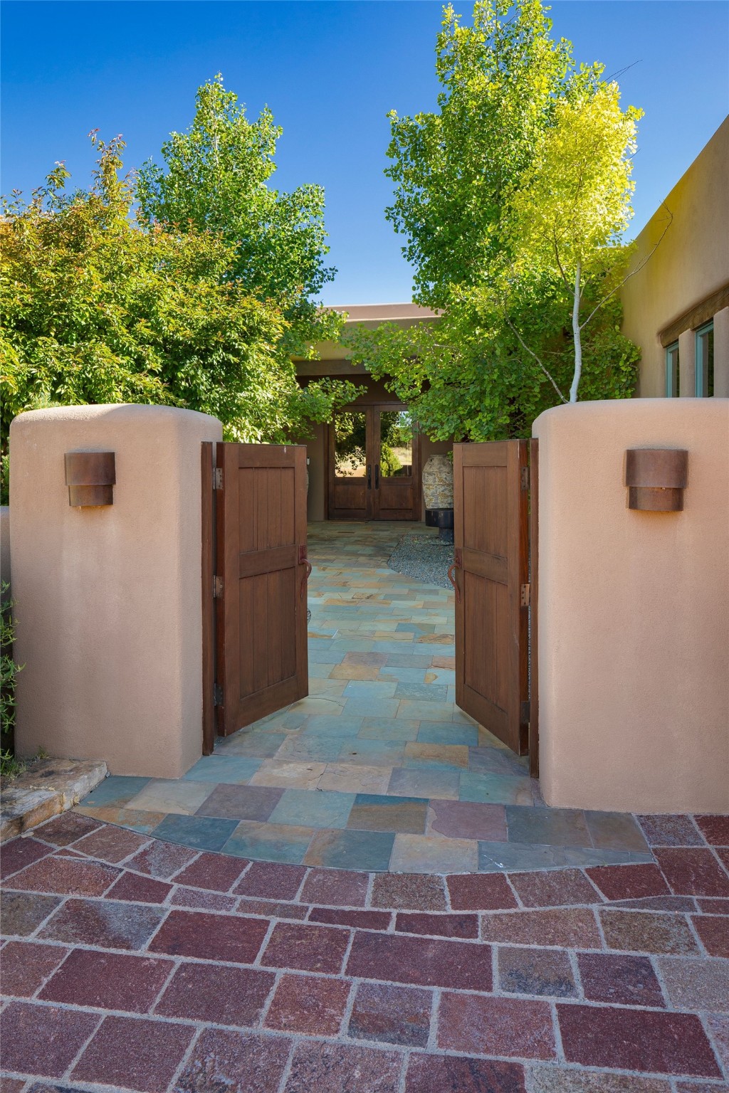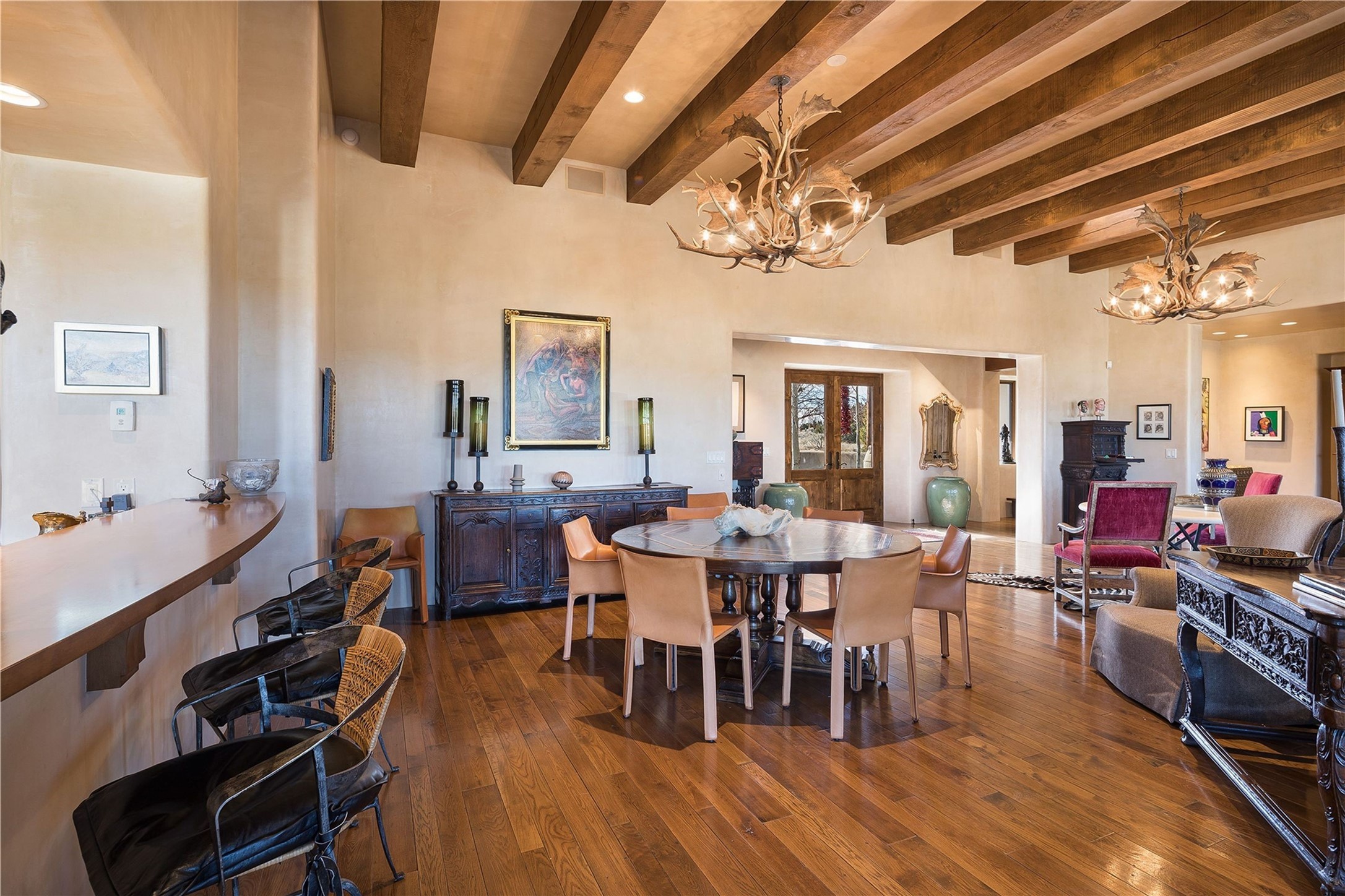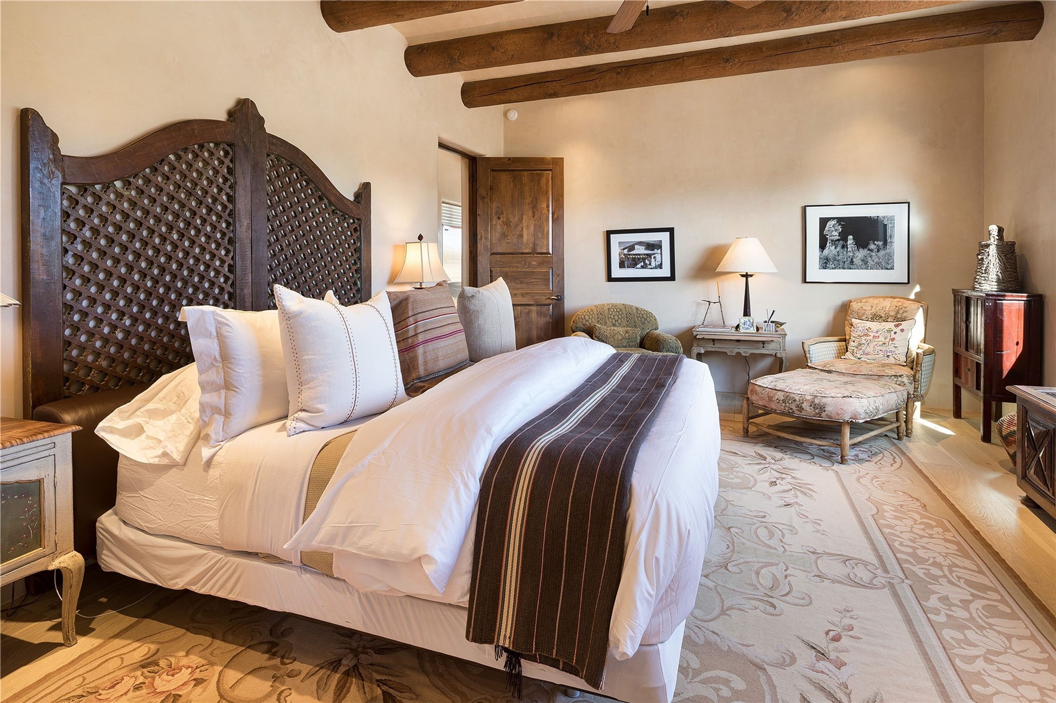Experience the ultimate Santa Fe and Las Campanas lifestyle. Welcome to 5 N. Brisa Fresca, an extraordinary single-level residence by the award-winning builder Sharon Woods. Located within the master planned community of Las Campanas and sited on a premiere, 1 acre view lot, on the 2nd fairway of the Sunset Golf Course in Las Campanas, this exceptional home captivates with stunning views of the fairway, Jemez and Sangre de Cristo Mountains. Ideal for entertaining, this home was designed with an open concept living experience, with framed views of the golf course and mountain views from nearly every room. Privately accessed through a private entry courtyard with a tranquil water fountain, this exquisite home impresses with a grand living room complete with vast seating areas, a custom curved wall of view windows, a spacious dining room, fireplace and front and back portal access. Directly off the living room is the chef's kitchen with dual breakfast bars, walk-in pantry, luxury appliances, custom cabinetry with extra storage and an adjoining casual dining area or media room. The generous, private owner's suite delights with views, a fireplace, portal access and a spacious spa-like bath with natural stone throughout, a soaking tub, a newly customized walk-in closet, and an expansive vanity with dual sinks. Adjacent to the owner's suite is an office area or library. Guests enjoy true luxury and privacy with two large, ensuite bedrooms, each views and walk-in closets. The home's exceptional finishes include rich hardwood and natural stone flooring, vigas and beams, creamy white plaster walls, superior-quality craftsmanship, custom doors, a large laundry room and mudroom with a utility sink, a newly updated Lutron lighting system, (4) fireplaces, superior outdoor living areas with expansive covered portals with an outdoor fireplace and a private driveway with pavers. The owner's Equity Golf Membership to the Club at Las Campanas is available for purchase separately.