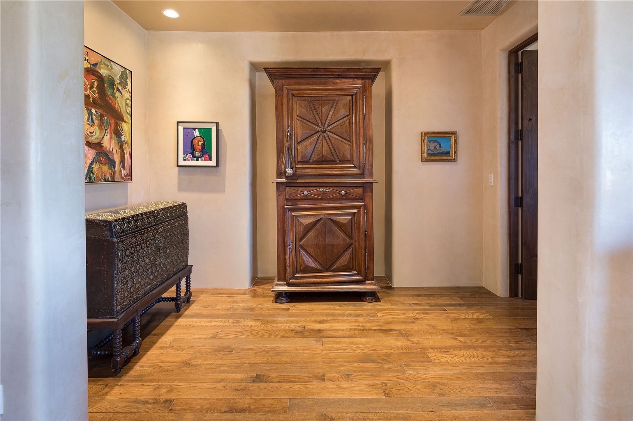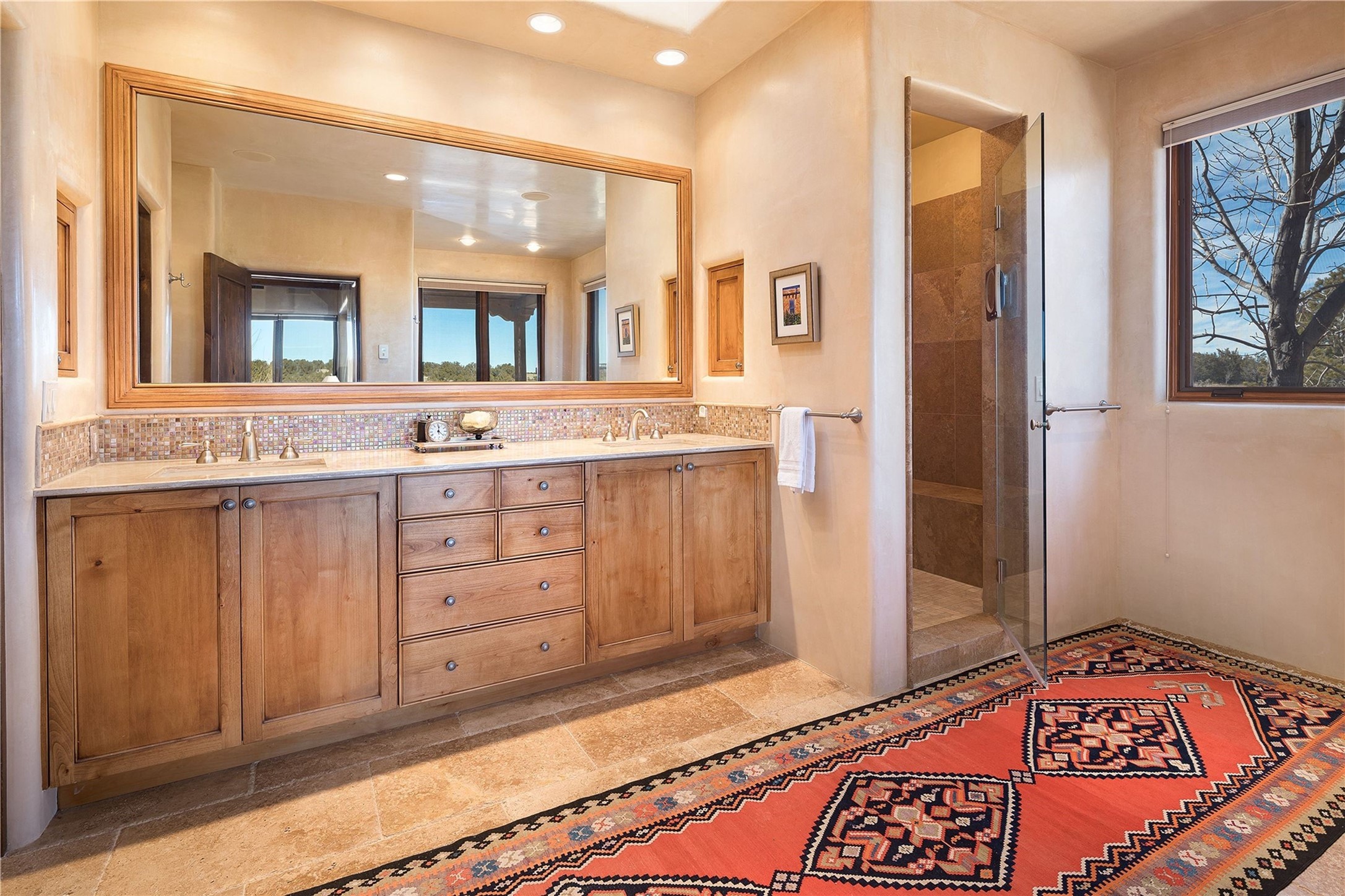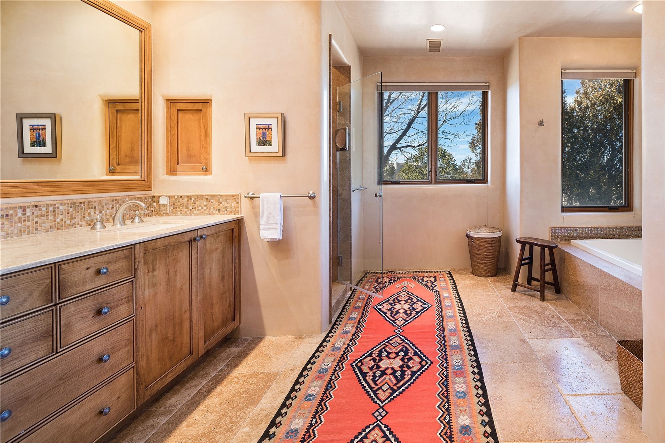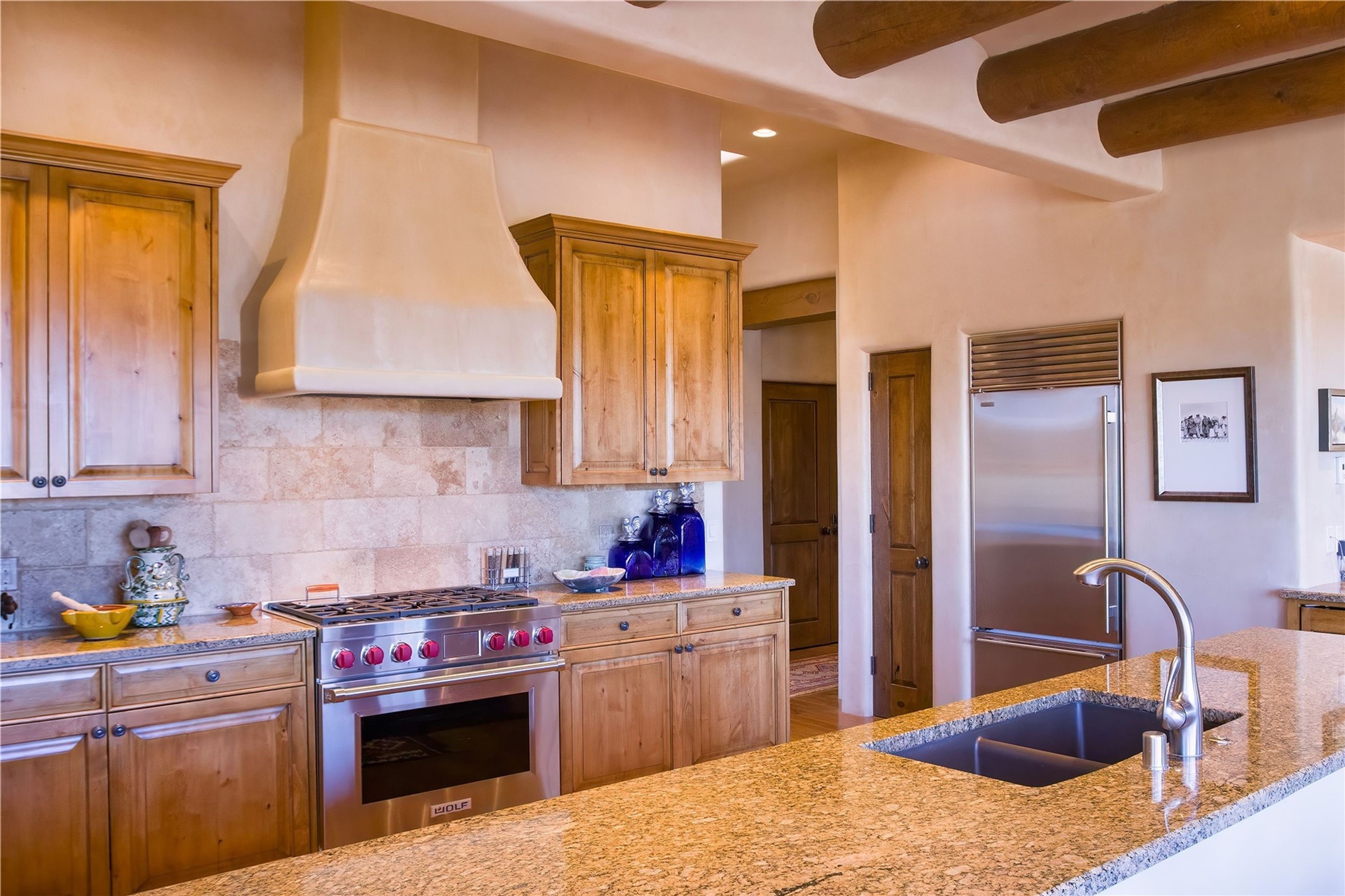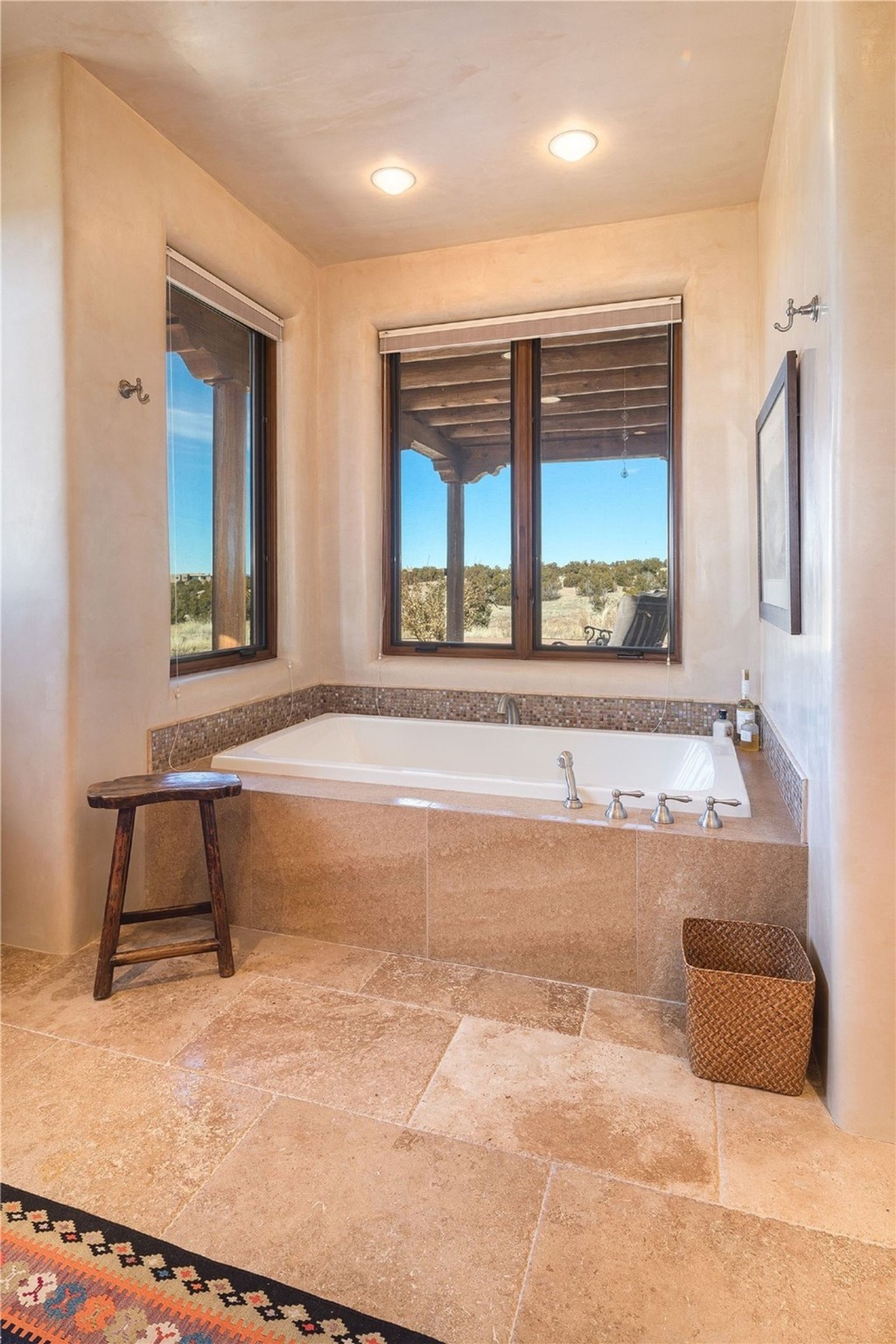 Experience the ultimate Santa Fe and Las Campanas lifestyle. Welcome to 5 N. Brisa Fresca, an extraordinary single-level residence by the award-winning builder Sharon Woods. Located within the master planned community of Las Campanas and sited on a premiere, 1 acre view lot, on the 2nd fairway of the Sunset Golf Course in Las Campanas, this exceptional home captivates with stunning views of the fairway, Jemez and Sangre de Cristo Mountains. Ideal for entertaining, this home was designed with an open concept living experience, with framed views of the golf course and mountain views from nearly every room. Privately accessed through a private entry courtyard with a tranquil water fountain, this exquisite home impresses with a grand living room complete with vast seating areas, a custom curved wall of view windows, a spacious dining room, fireplace and front and back portal access. Directly off the living room is the chef's kitchen with dual breakfast bars, walk-in pantry, luxury appliances, custom cabinetry with extra storage and an adjoining casual dining area or media room. The generous, private owner's suite delights with views, a fireplace, portal access and a spacious spa-like bath with natural stone throughout, a soaking tub, a newly customized walk-in closet, and an expansive vanity with dual sinks. Adjacent to the owner's suite is an office area or library. Guests enjoy true luxury and privacy with two large, ensuite bedrooms, each views and walk-in closets. The home's exceptional finishes include rich hardwood and natural stone flooring, vigas and beams, creamy white plaster walls, superior-quality craftsmanship, custom doors, a large laundry room and mudroom with a utility sink, a newly updated Lutron lighting system, (4) fireplaces, superior outdoor living areas with expansive covered portals with an outdoor fireplace and a private driveway with pavers. The owner's Equity Golf Membership to the Club at Las Campanas is available for purchase separately.