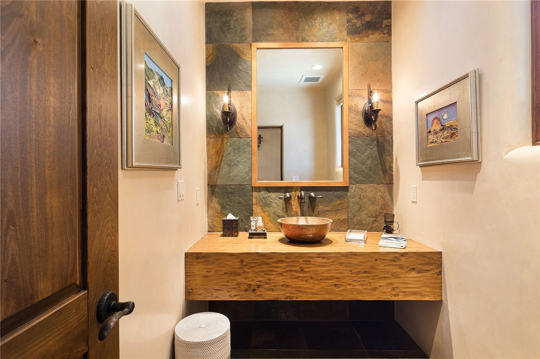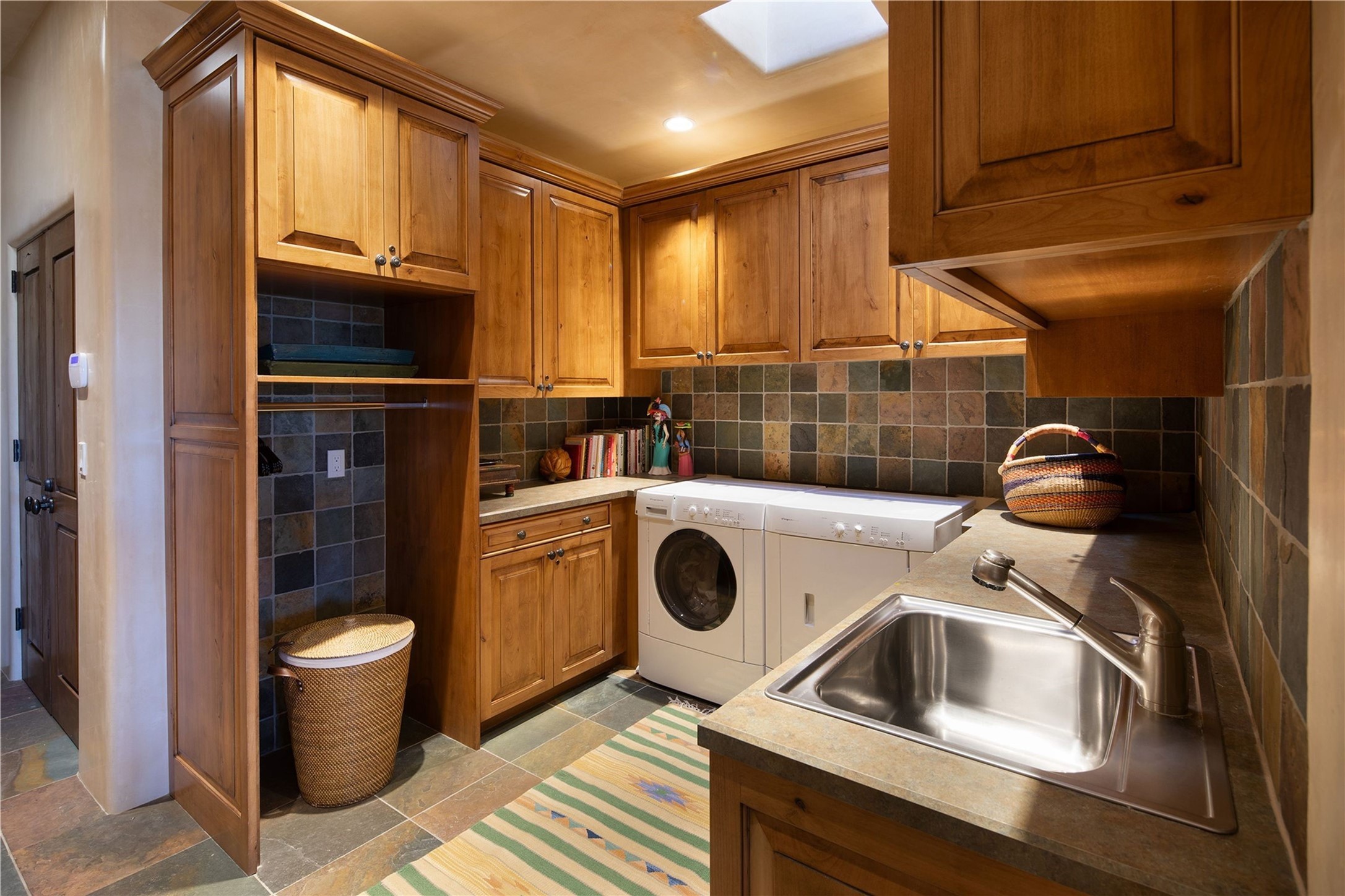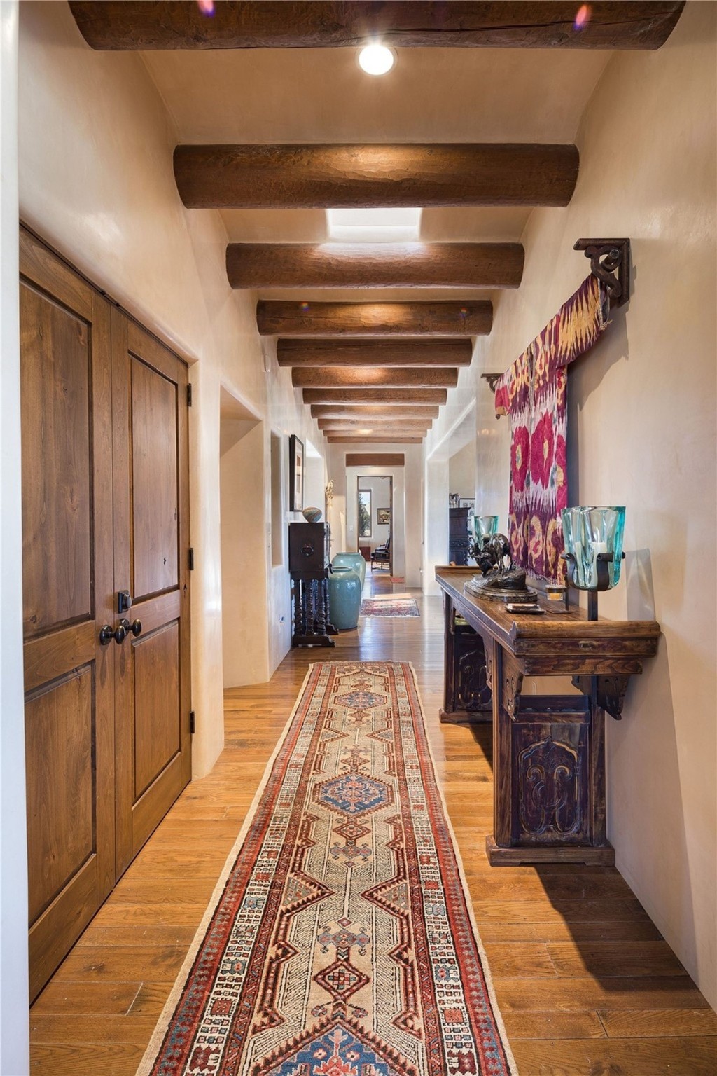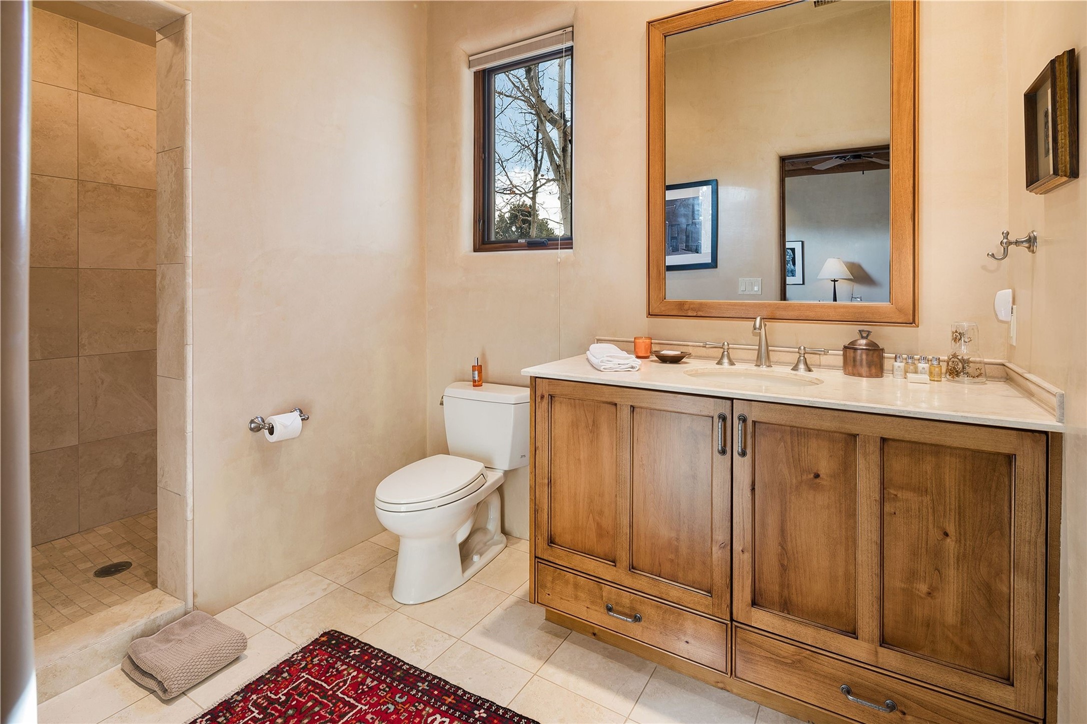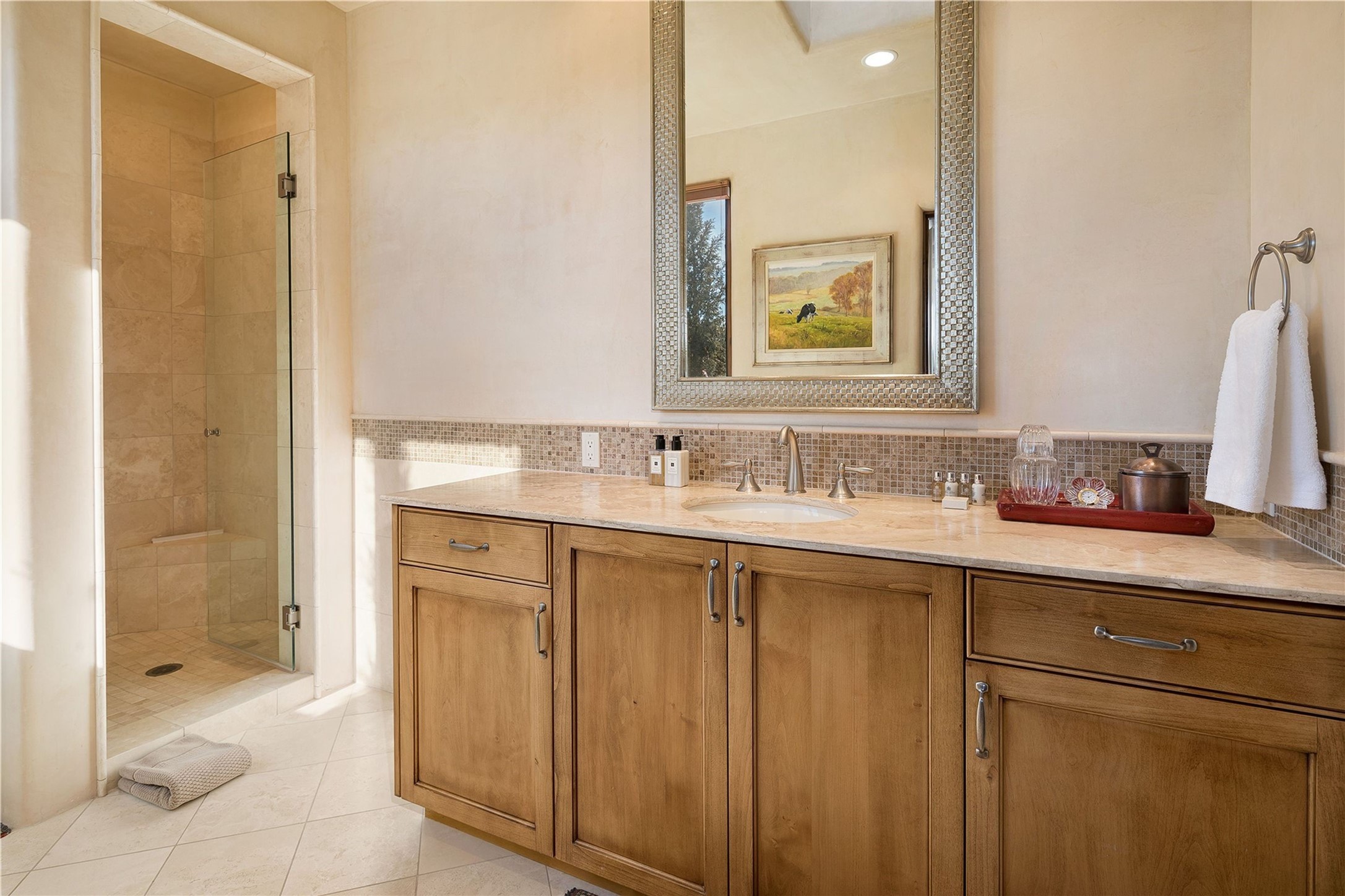 Experience the ultimate Santa Fe and Las Campanas lifestyle. Welcome to 5 N. Brisa Fresca, an extraordinary single-level residence by the award-winning builder Sharon Woods. Located within the master planned community of Las Campanas and sited on a premiere, 1 acre view lot, on the 2nd fairway of the Sunset Golf Course in Las Campanas, this exceptional home captivates with stunning views of the fairway, Jemez and Sangre de Cristo Mountains. Ideal for entertaining, this home was designed with an open concept living experience, with framed views of the golf course and mountain views from nearly every room. Privately accessed through a private entry courtyard with a tranquil water fountain, this exquisite home impresses with a grand living room complete with vast seating areas, a custom curved wall of view windows, a spacious dining room, fireplace and front and back portal access. Directly off the living room is the chef's kitchen with dual breakfast bars, walk-in pantry, luxury appliances, custom cabinetry with extra storage and an adjoining casual dining area or media room. The generous, private owner's suite delights with views, a fireplace, portal access and a spacious spa-like bath with natural stone throughout, a soaking tub, a newly customized walk-in closet, and an expansive vanity with dual sinks. Adjacent to the owner's suite is an office area or library. Guests enjoy true luxury and privacy with two large, ensuite bedrooms, each views and walk-in closets. The home's exceptional finishes include rich hardwood and natural stone flooring, vigas and beams, creamy white plaster walls, superior-quality craftsmanship, custom doors, a large laundry room and mudroom with a utility sink, a newly updated Lutron lighting system, (4) fireplaces, superior outdoor living areas with expansive covered portals with an outdoor fireplace and a private driveway with pavers. The owner's Equity Golf Membership to the Club at Las Campanas is available for purchase separately.
